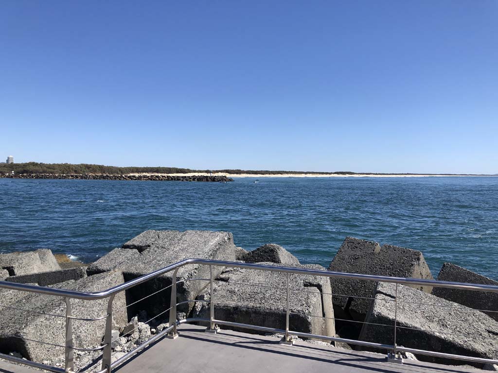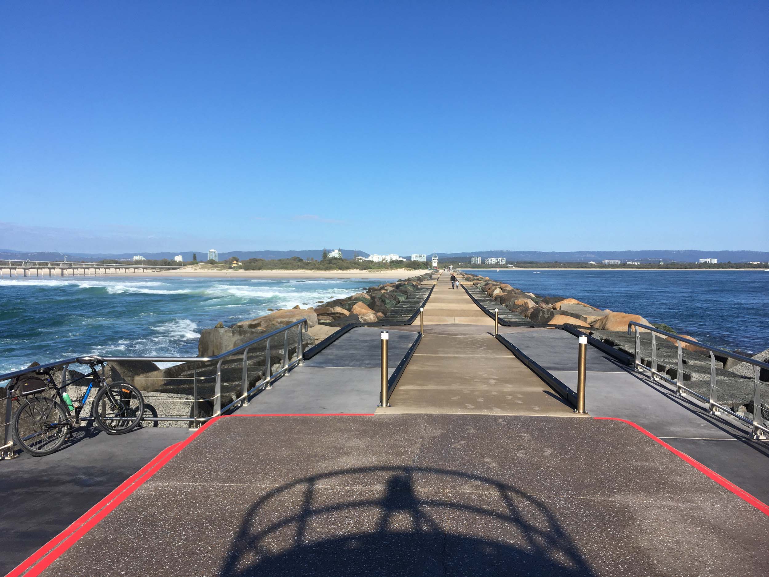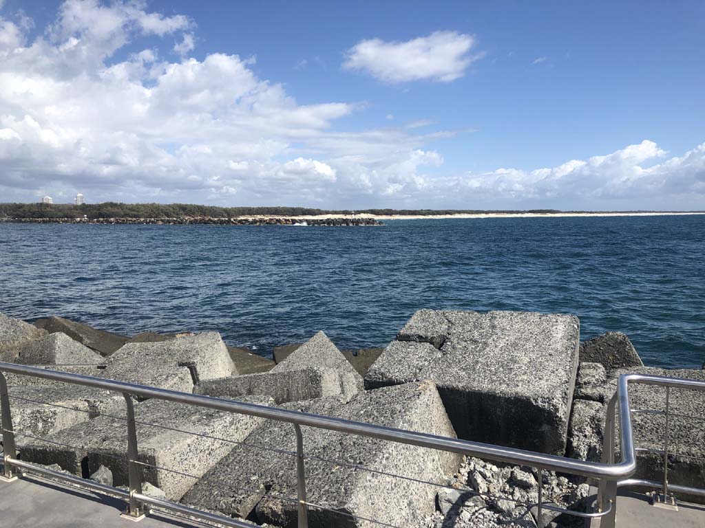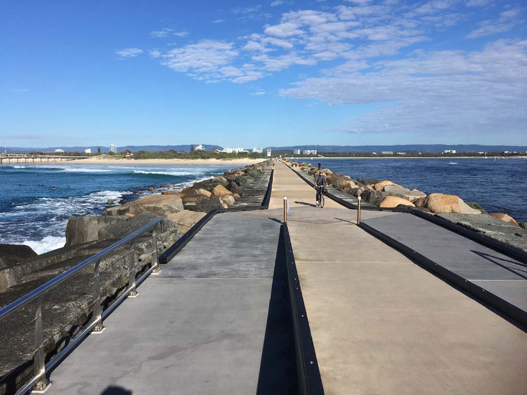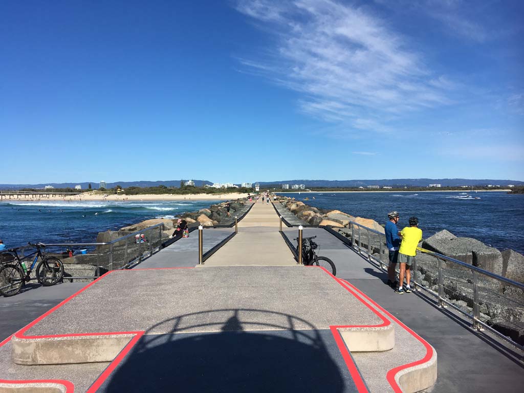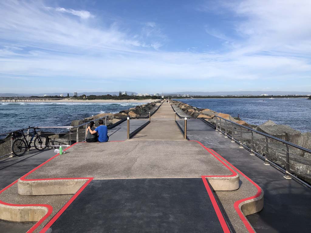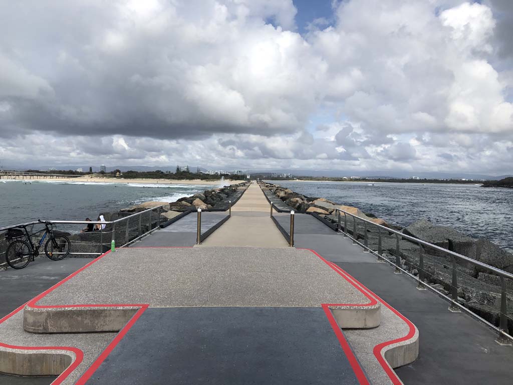 I continued to the Seaway via the Federation Walk. Rode to the tip of the Moondarewa Spit, then out to the tip of the Seawall/Spit. I noticed the Seaworld Resue boat motoring in the mouth of the Seaway but didn't appear to be doing anything. Noone was in the water etc. Then rode back to the tip of the Moondarewa Spit then back to the tip of the Seawall/Spit. Took a few photos at the end of both Spits, sat and ate my banana.