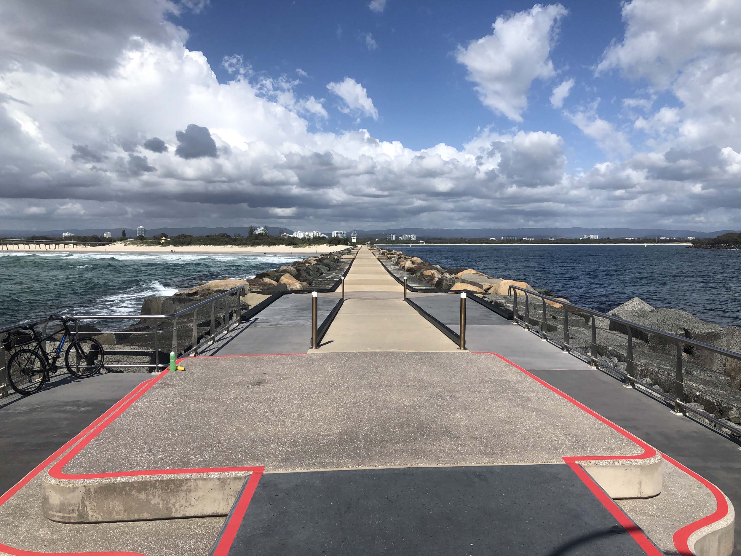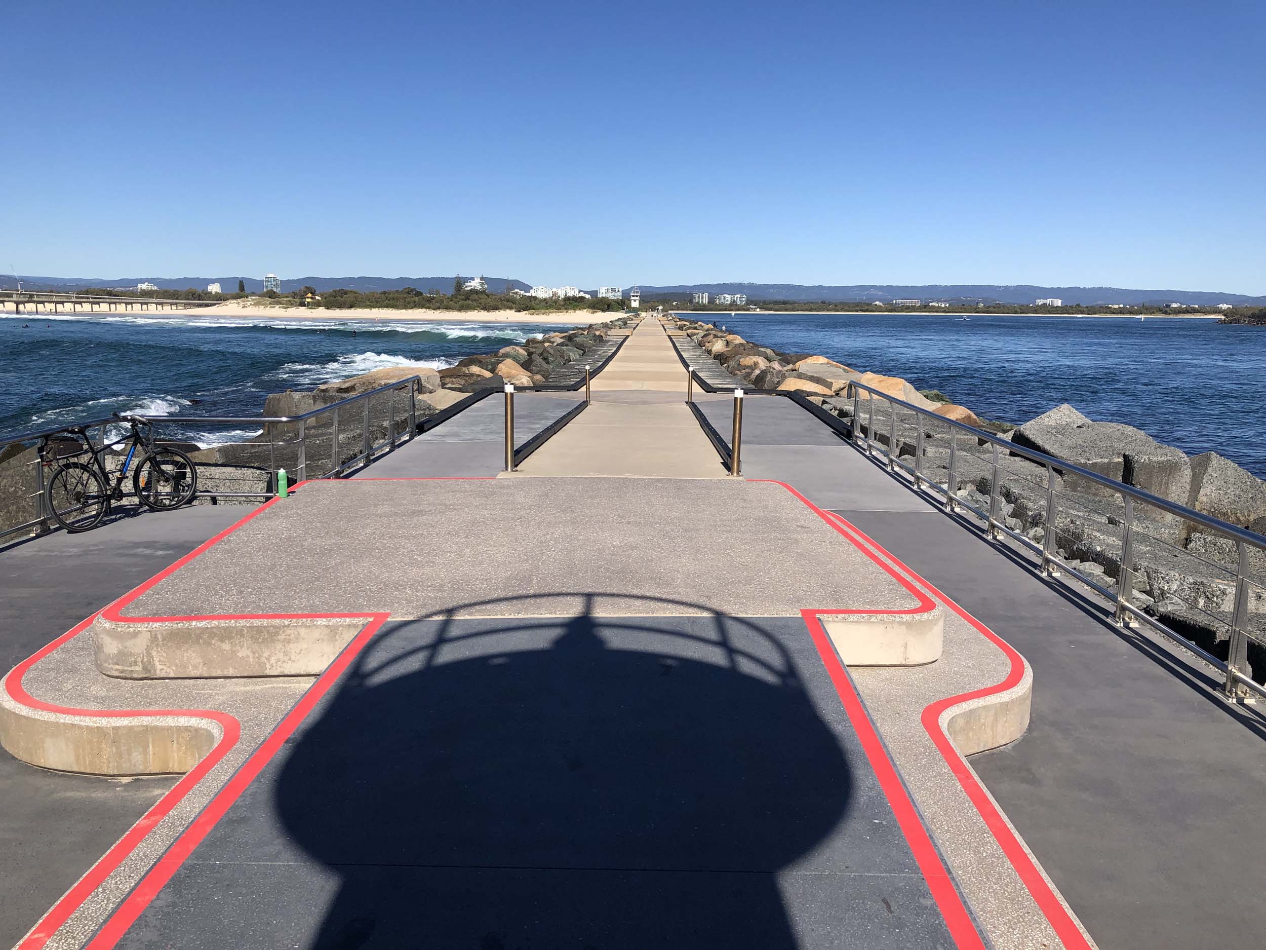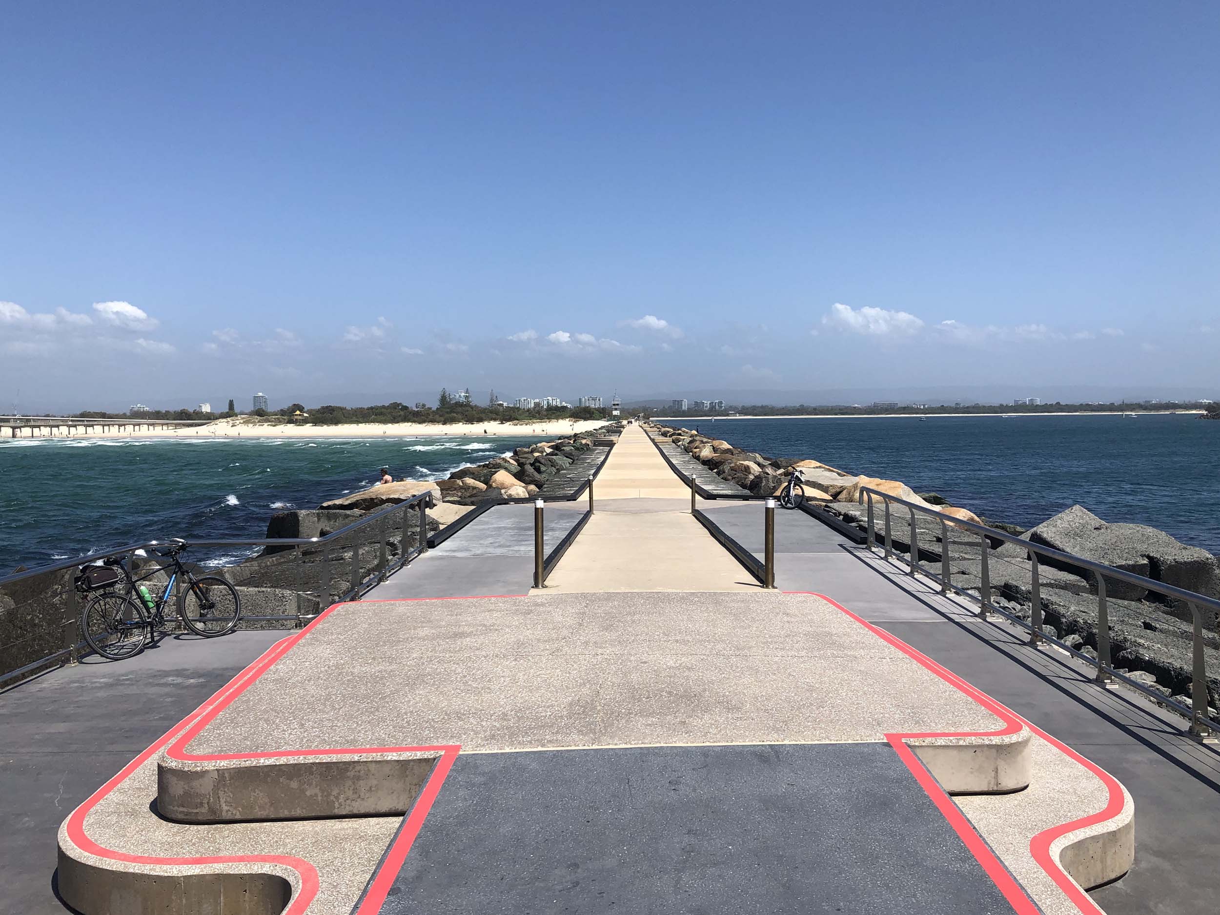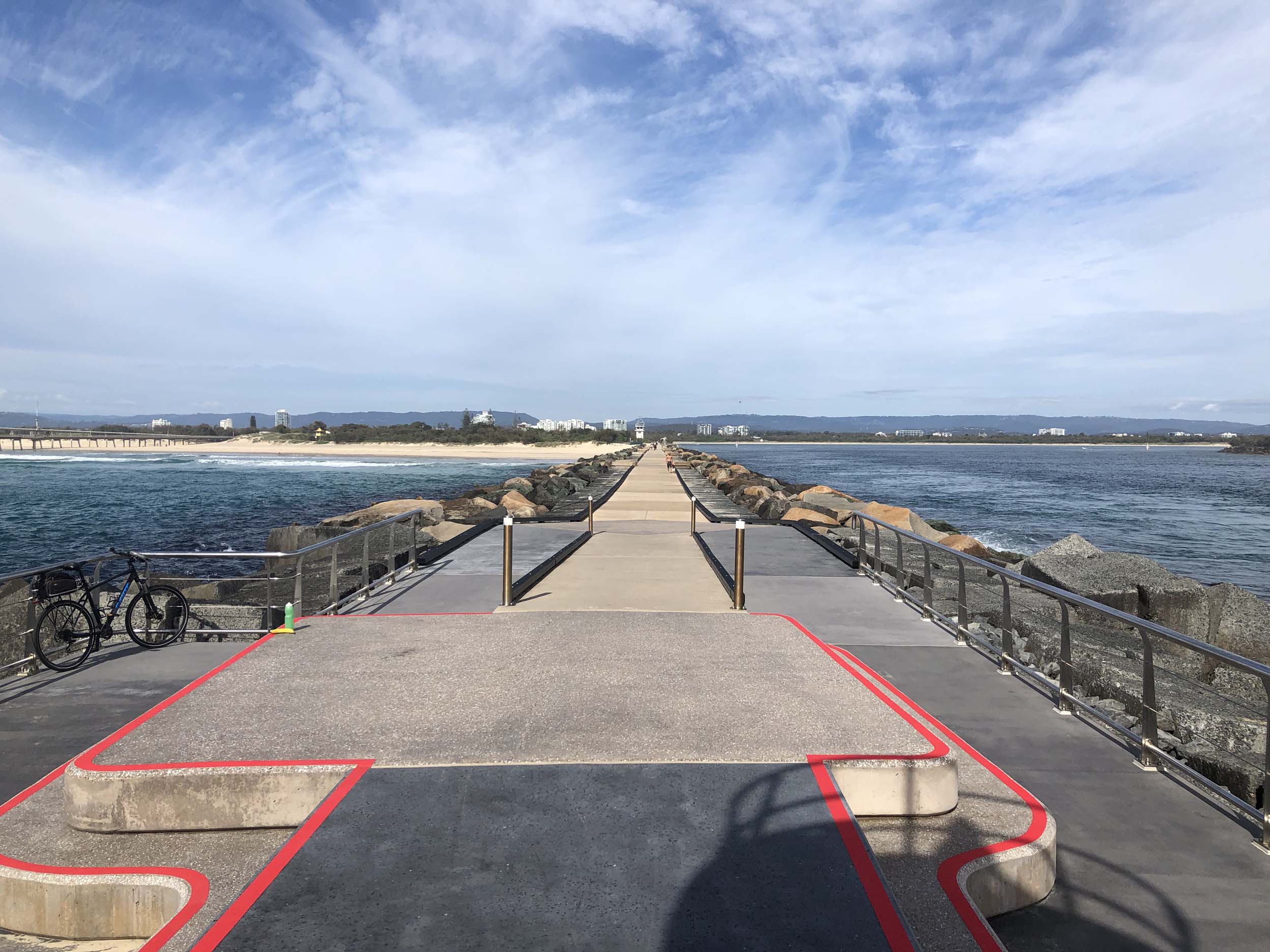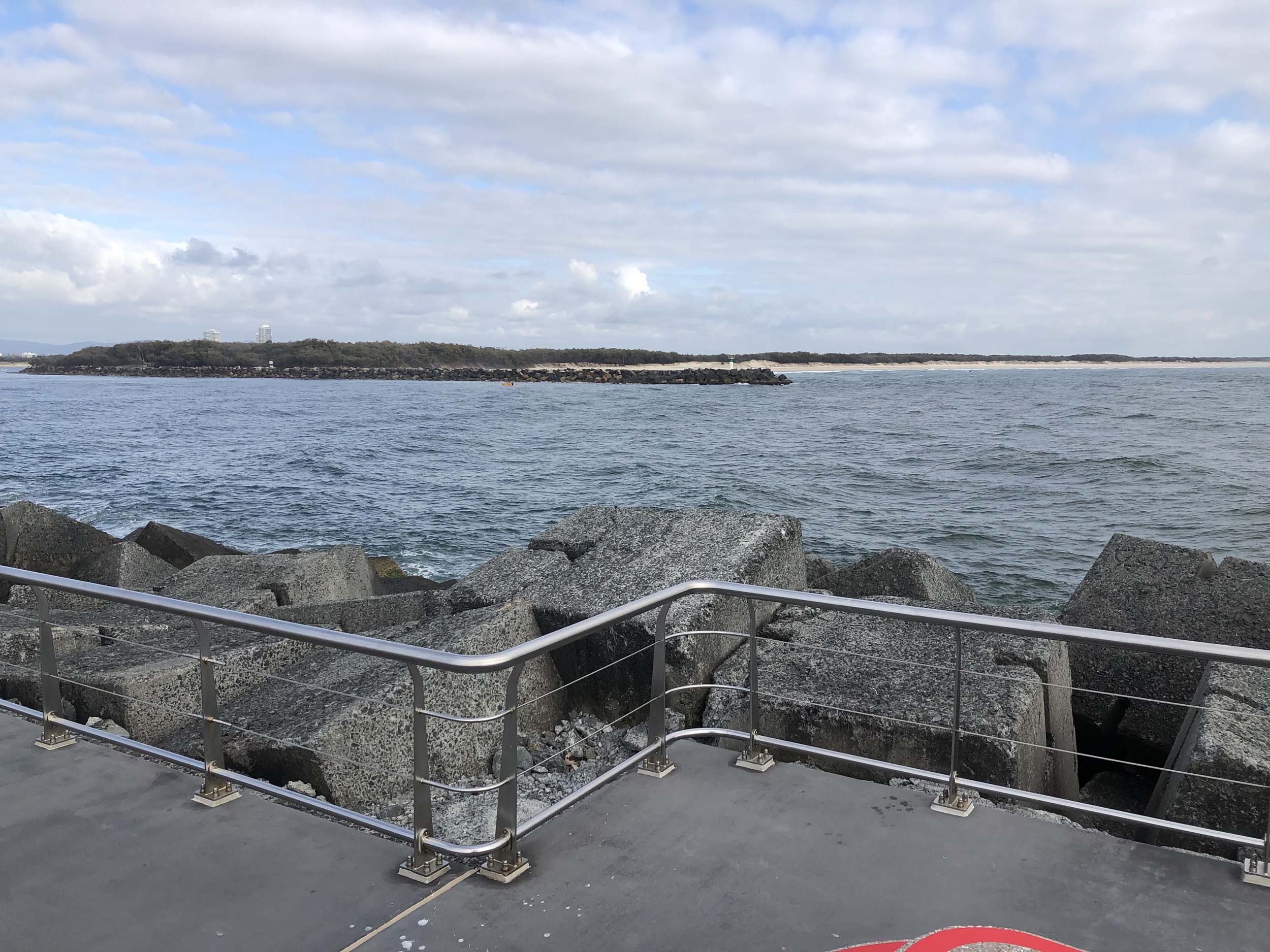 I continued to the Seaway via the Federation Walk. Rode to the tip of the Moondarewa Spit, then out to the tip of the Seawall/Spit. I noticed the Seaworld Resue boat motoring in the mouth of the Seaway but didn't appear to be doing anything. Noone was in the water etc. Then rode back to the tip of the Moondarewa Spit then back to the tip of the Seawall/Spit. Took a few photos at the end of both Spits, sat and ate my banana.