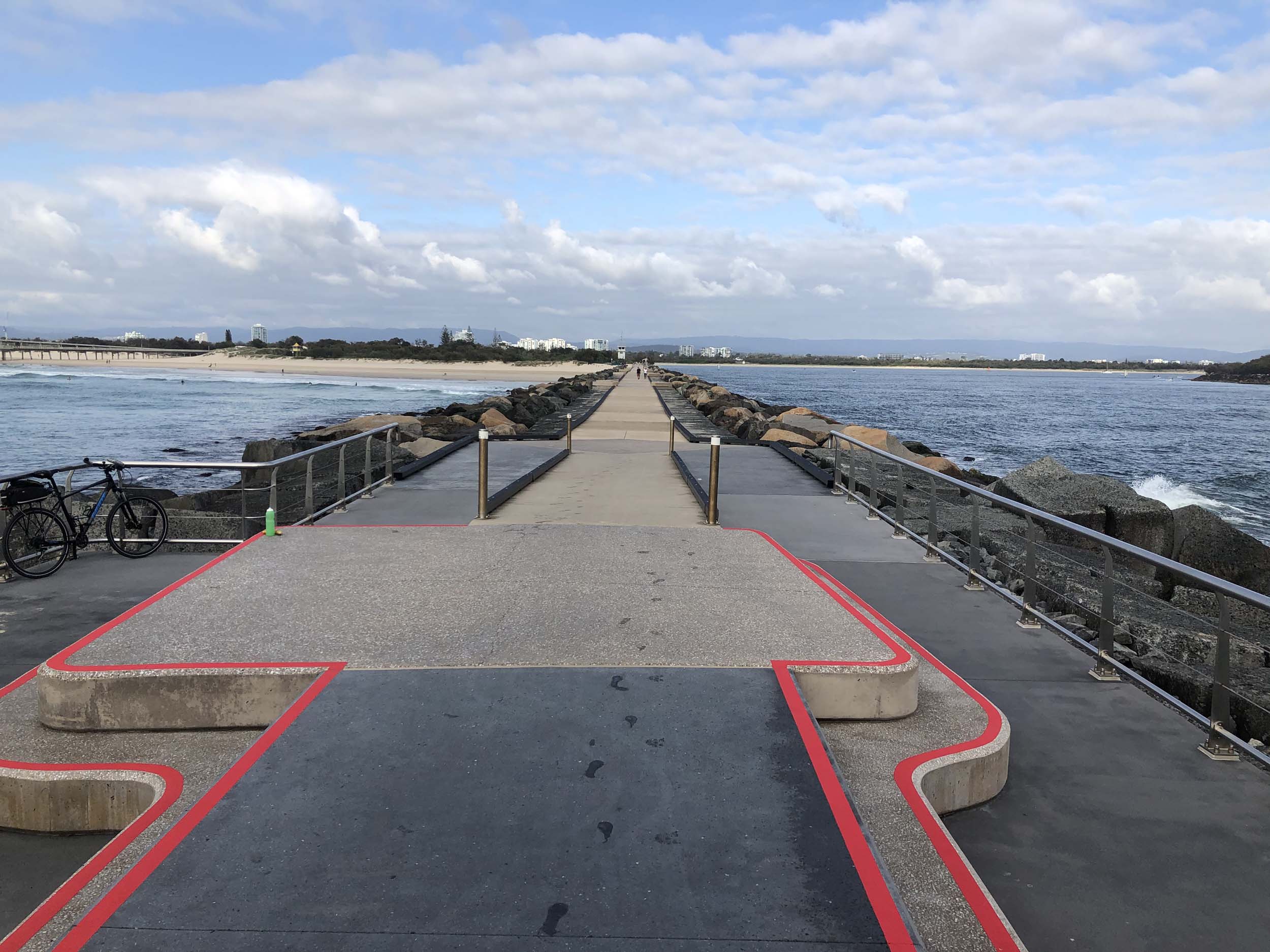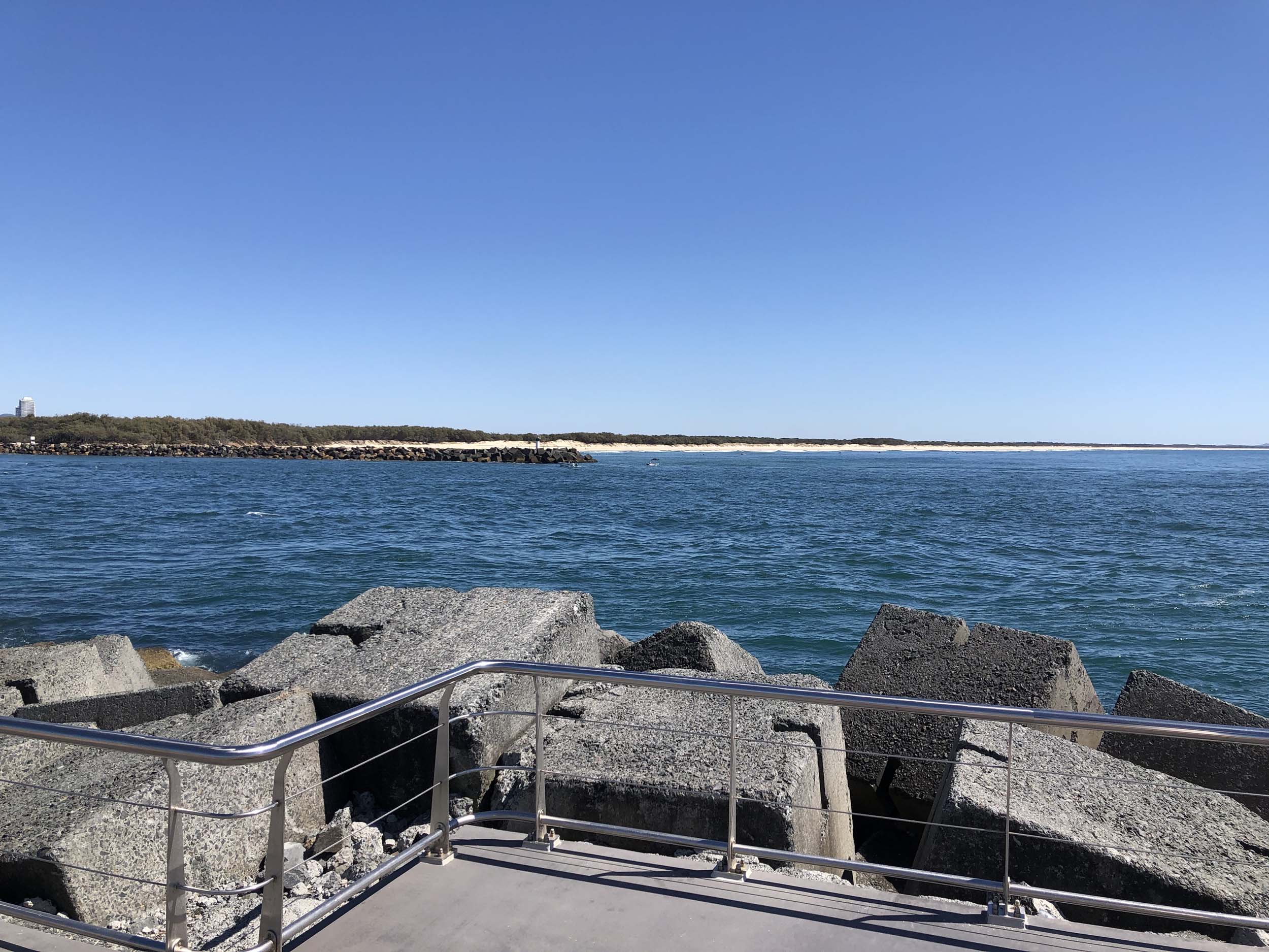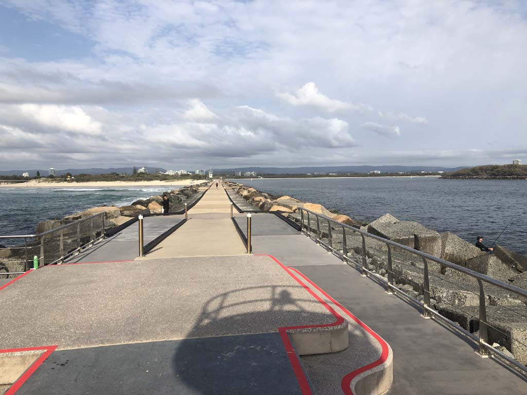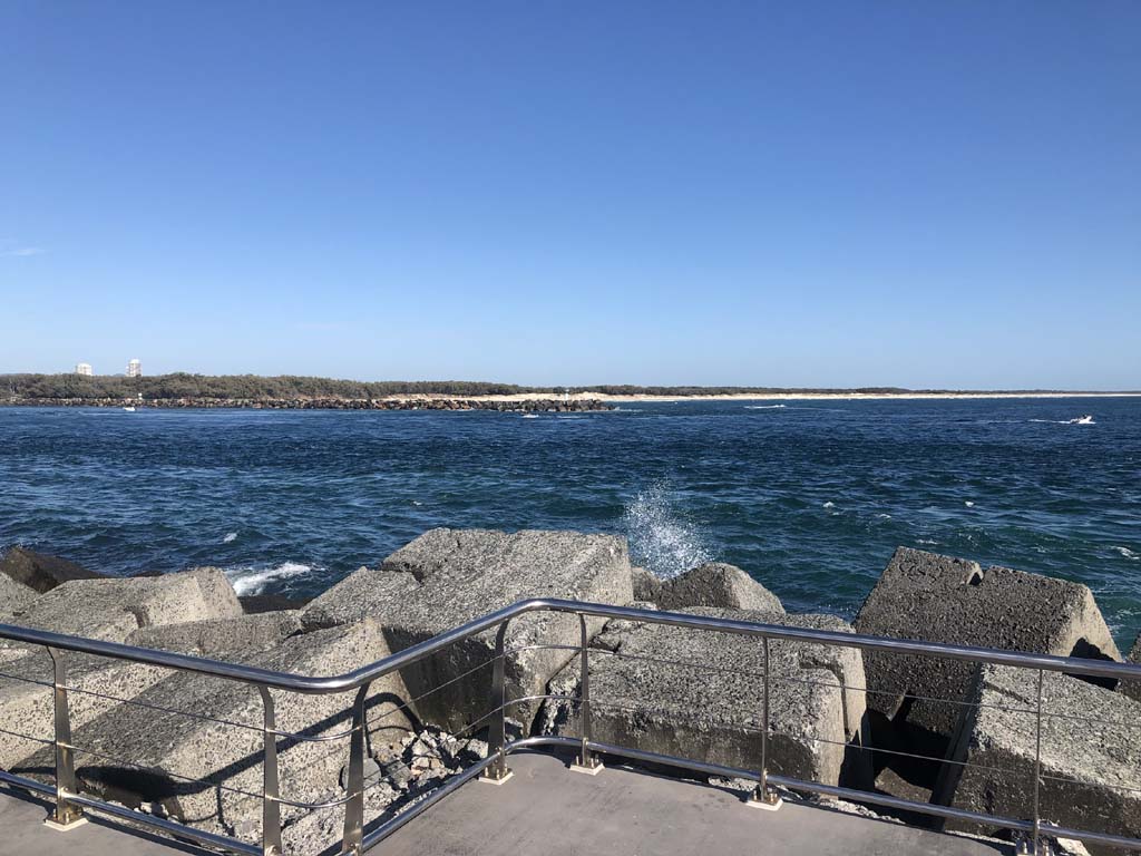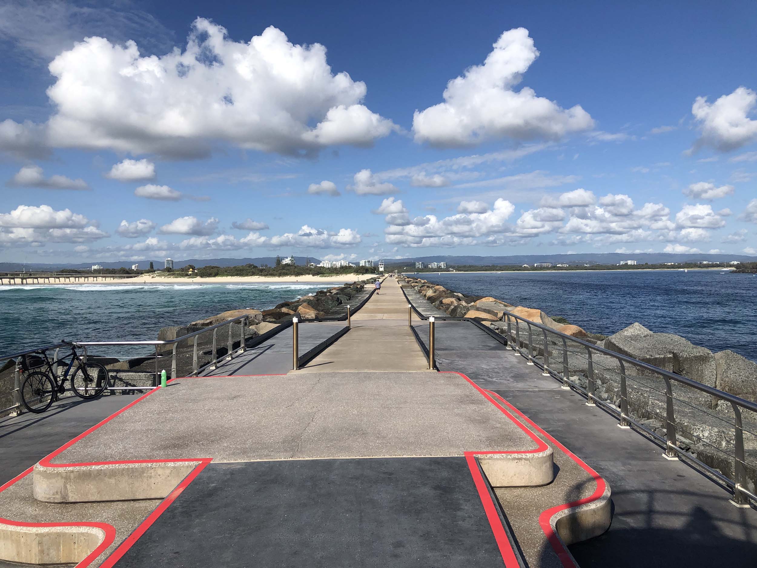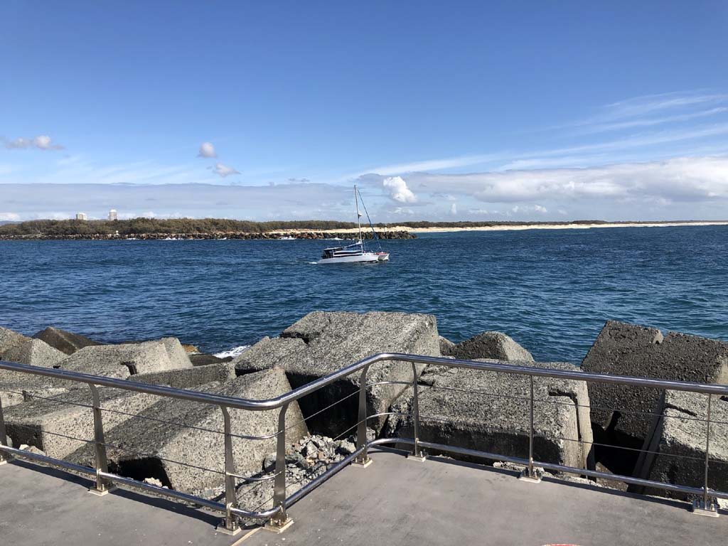 I continued to the Seaway via the Federation Walk. Rode to the tip of the Moondarewa Spit, then out to the tip of the Seawall/Spit. I noticed the Seaworld Resue boat motoring in the mouth of the Seaway but didn't appear to be doing anything. Noone was in the water etc. Then rode back to the tip of the Moondarewa Spit then back to the tip of the Seawall/Spit. Took a few photos at the end of both Spits, sat and ate my banana.