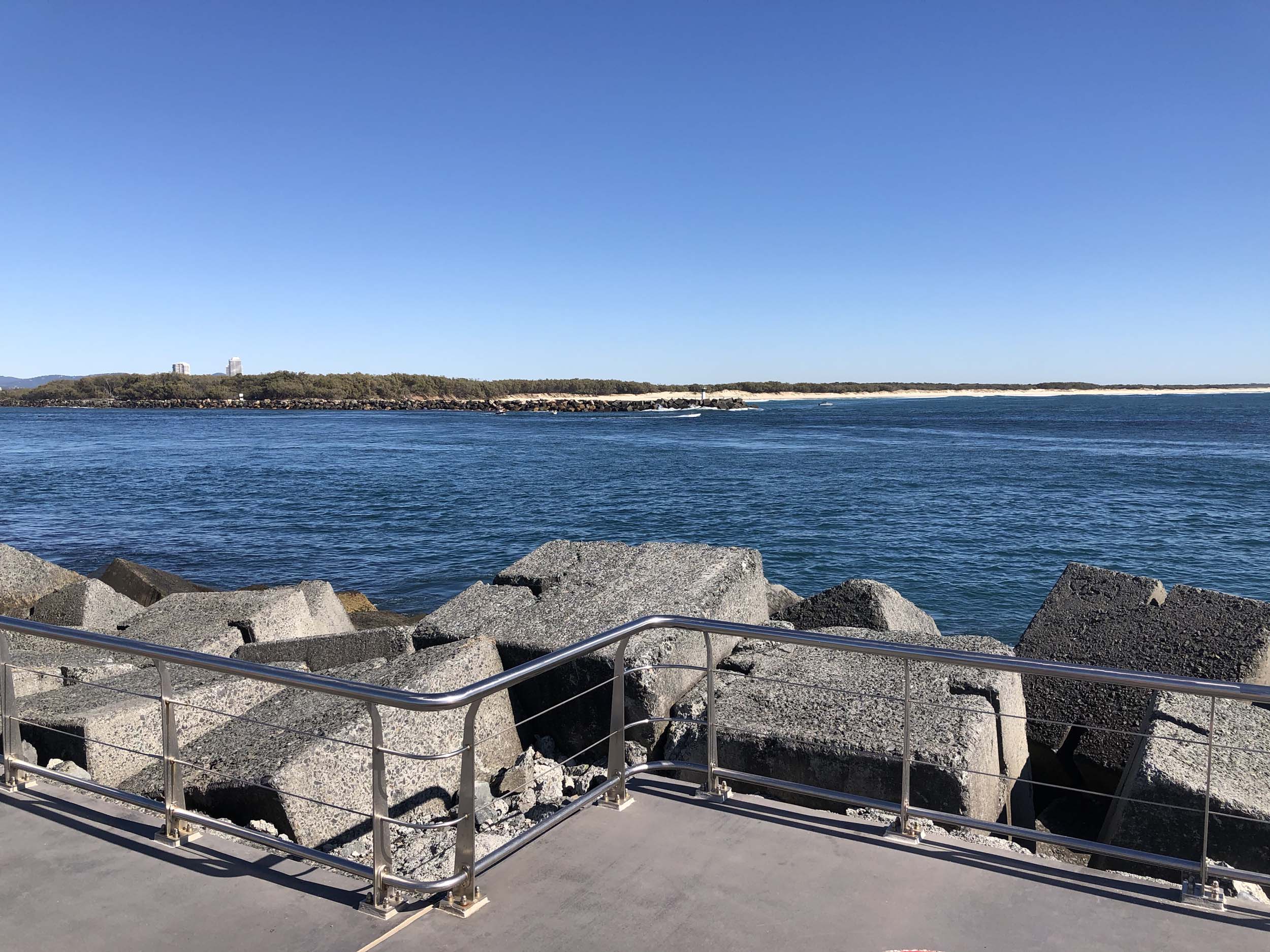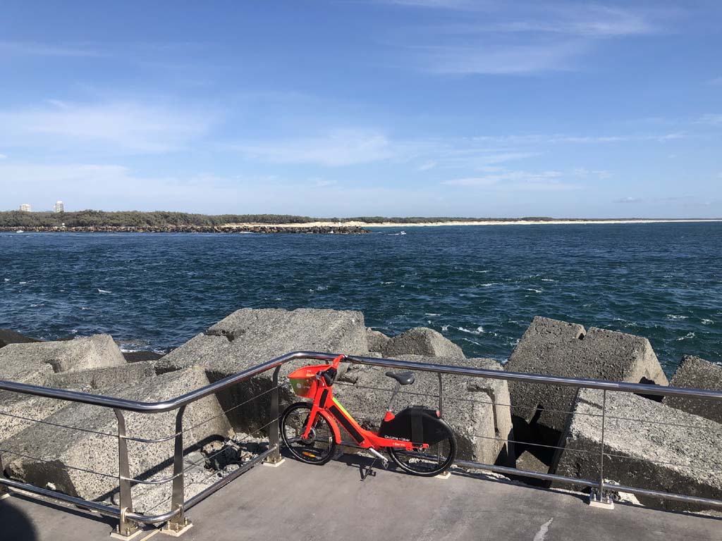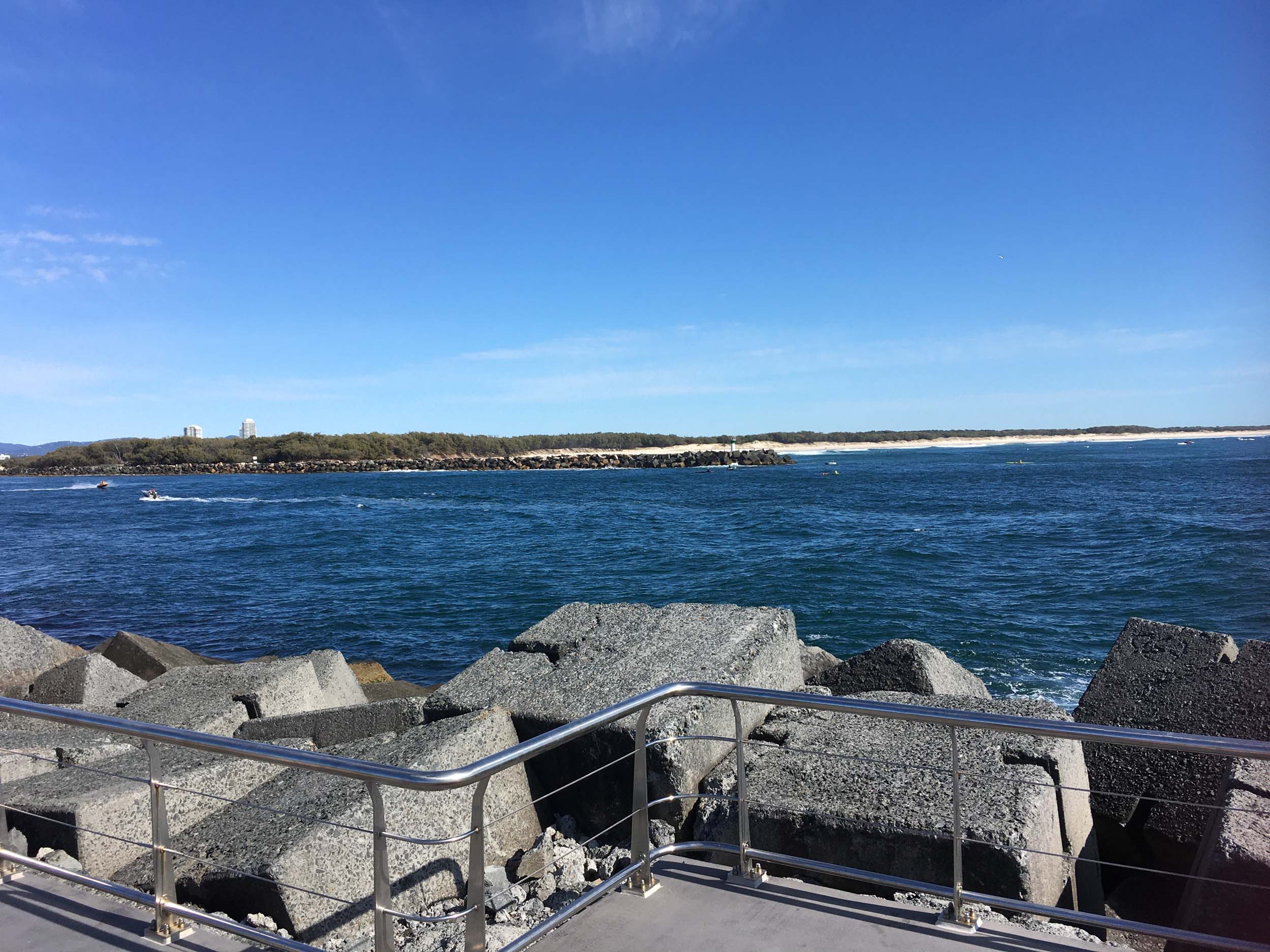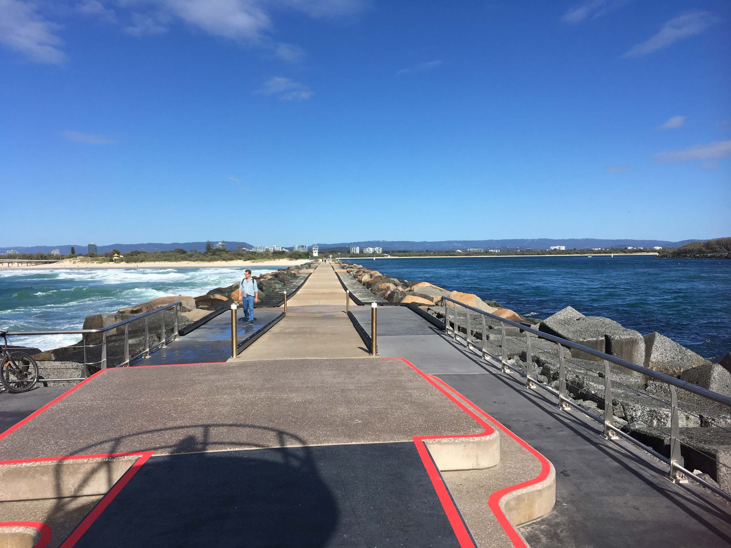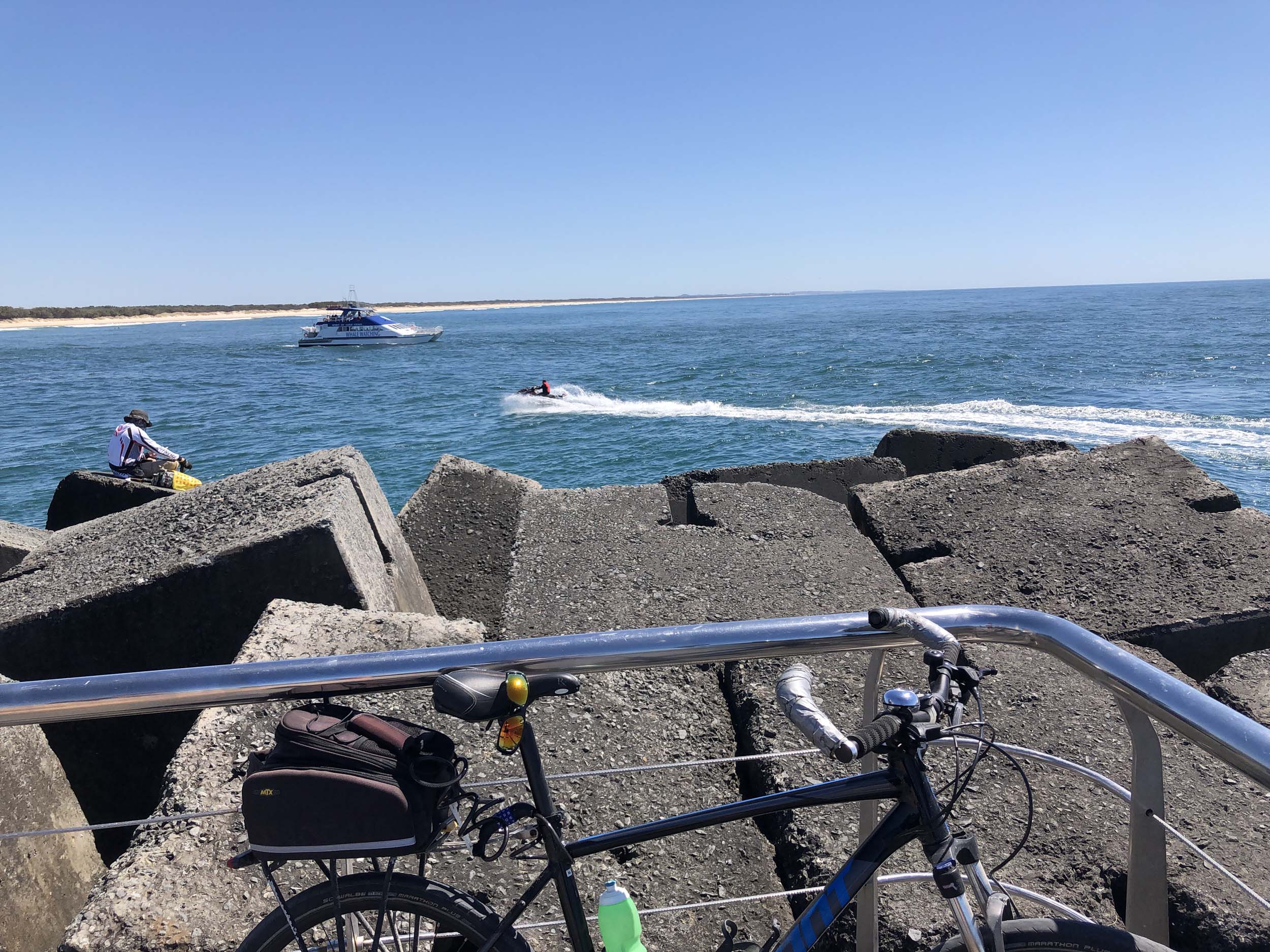 I continued to the Seaway via the Federation Walk. Rode to the tip of the Moondarewa Spit, then out to the tip of the Seawall/Spit. I noticed the Seaworld Resue boat motoring in the mouth of the Seaway but didn't appear to be doing anything. Noone was in the water etc. Then rode back to the tip of the Moondarewa Spit then back to the tip of the Seawall/Spit. Took a few photos at the end of both Spits, sat and ate my banana.