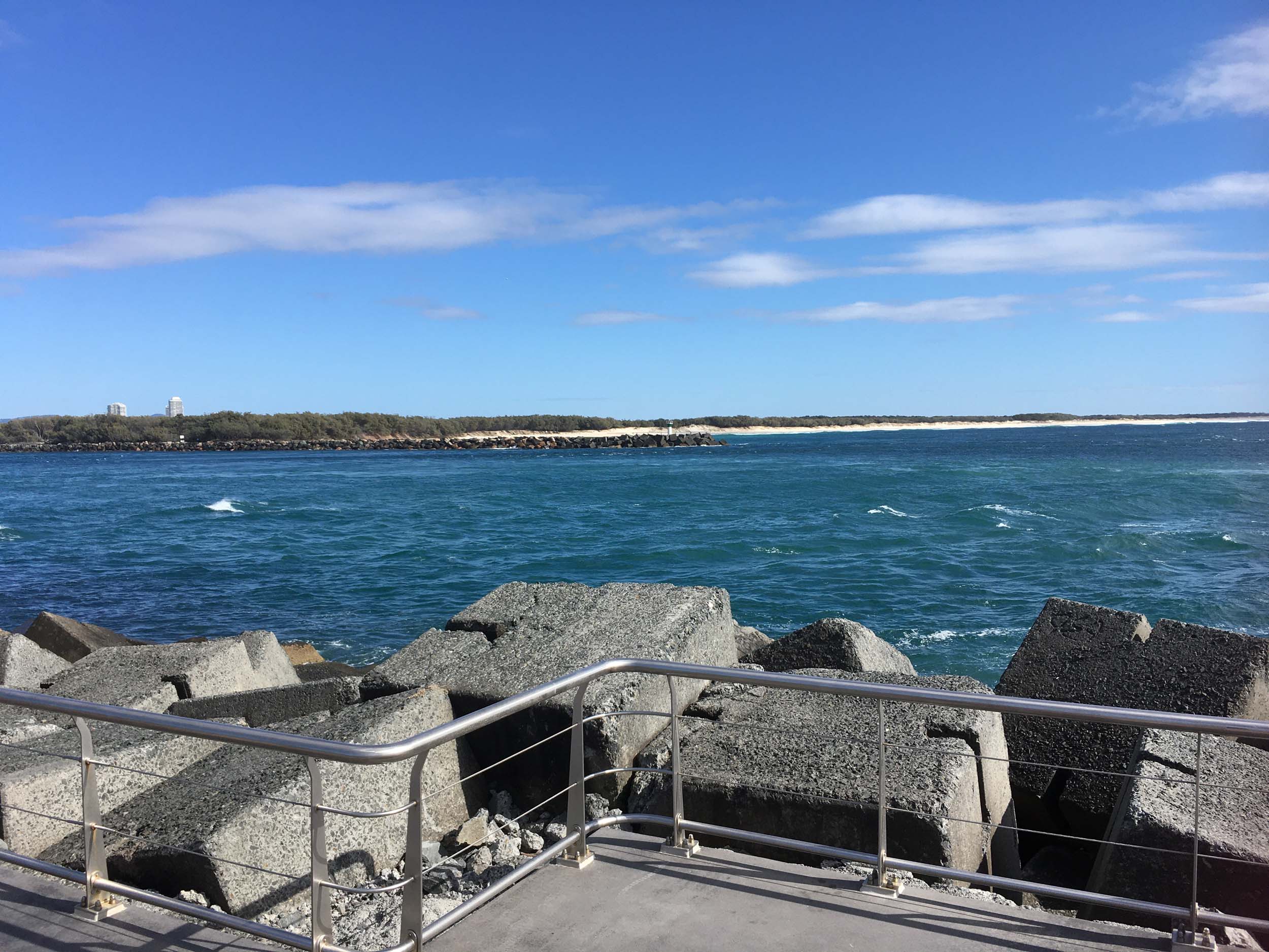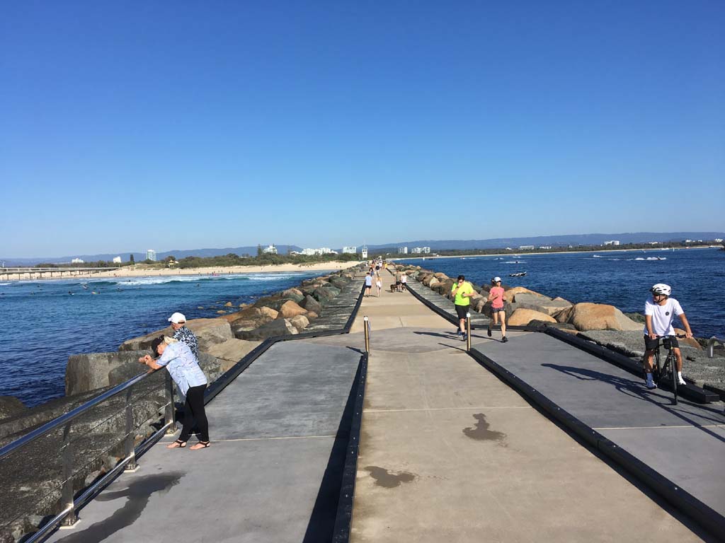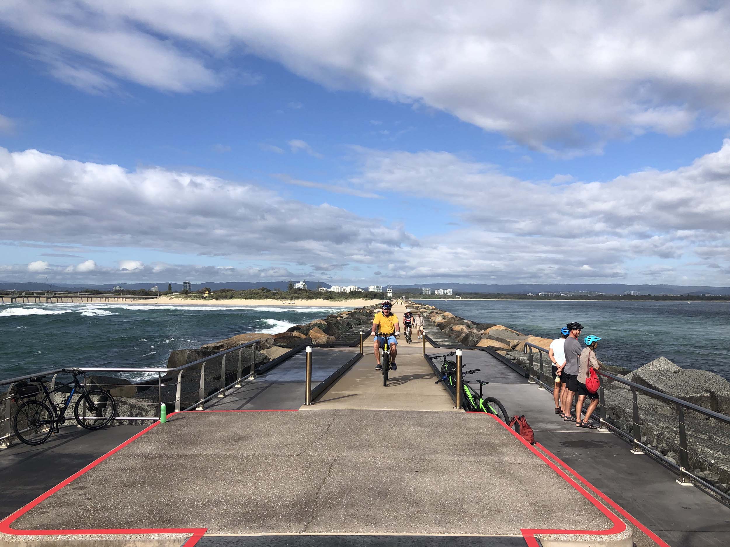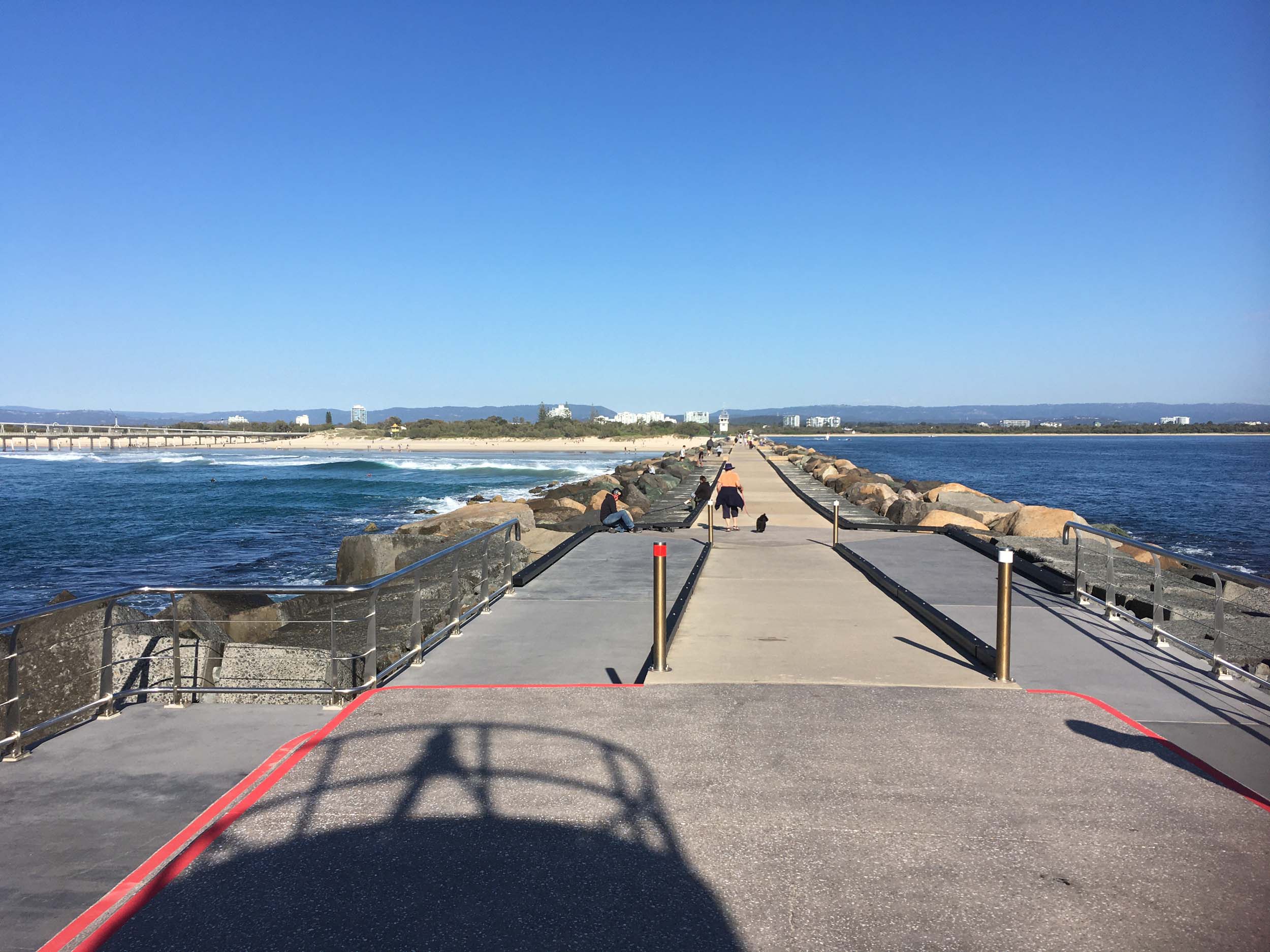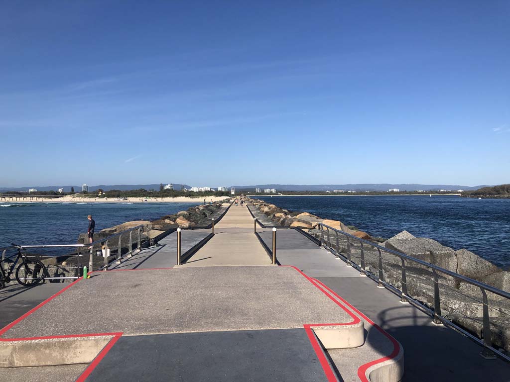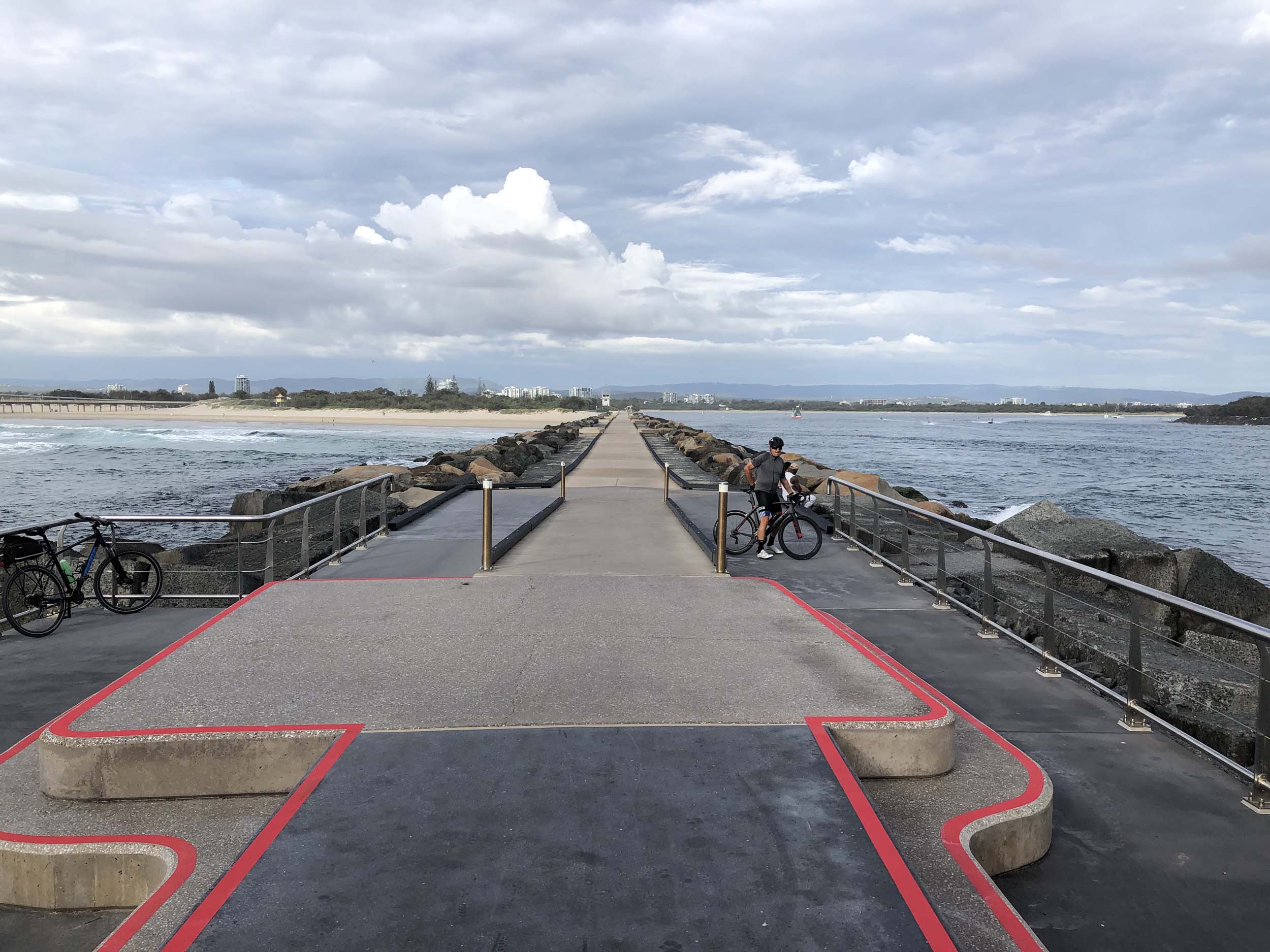 I continued to the Seaway via the Federation Walk. Rode to the tip of the Moondarewa Spit, then out to the tip of the Seawall/Spit. I noticed the Seaworld Resue boat motoring in the mouth of the Seaway but didn't appear to be doing anything. Noone was in the water etc. Then rode back to the tip of the Moondarewa Spit then back to the tip of the Seawall/Spit. Took a few photos at the end of both Spits, sat and ate my banana.