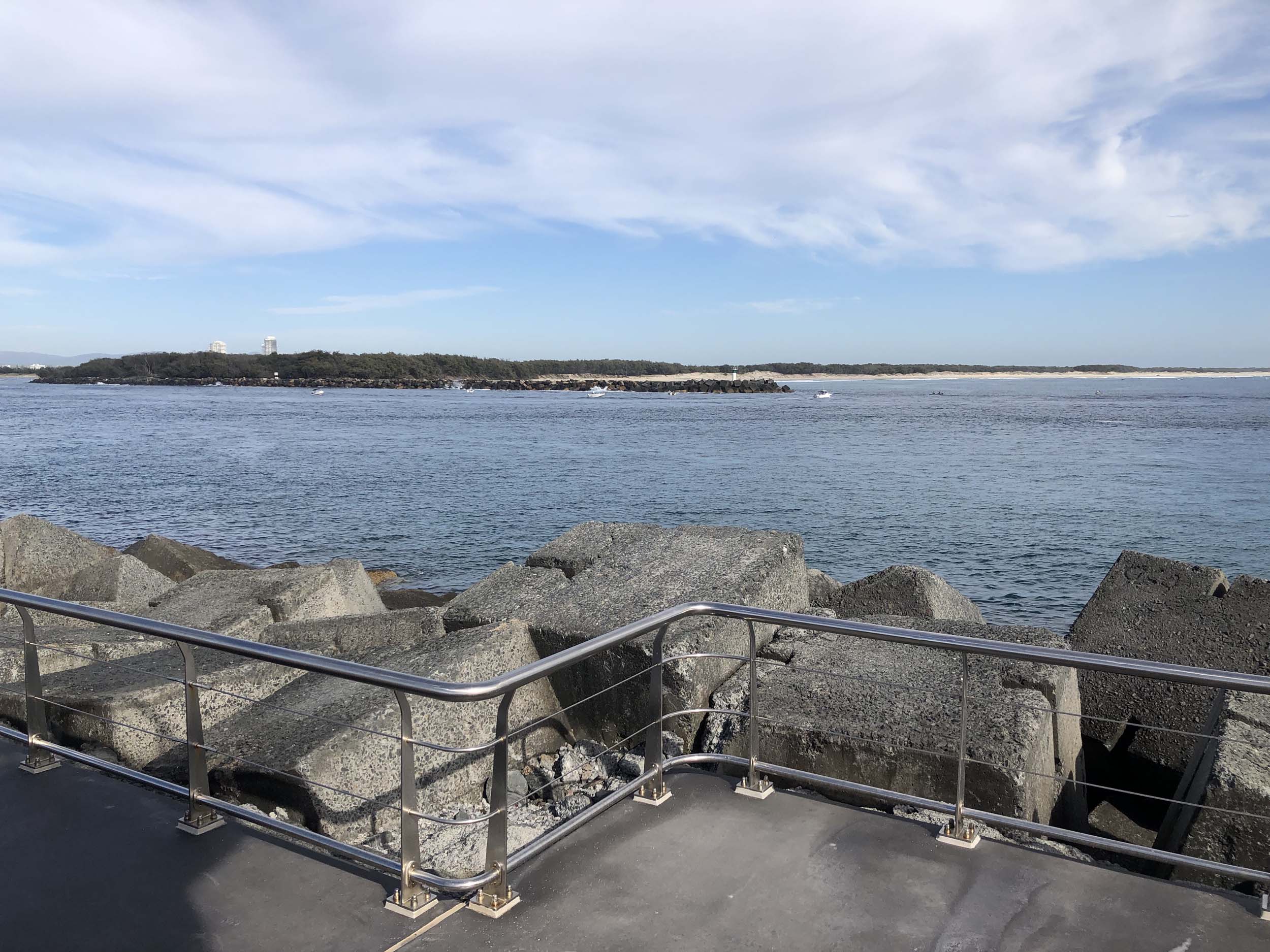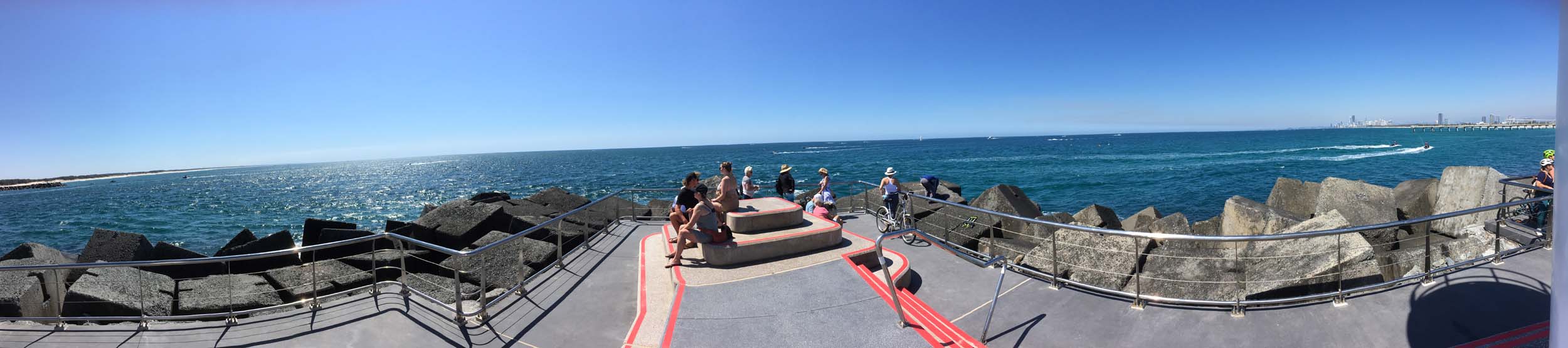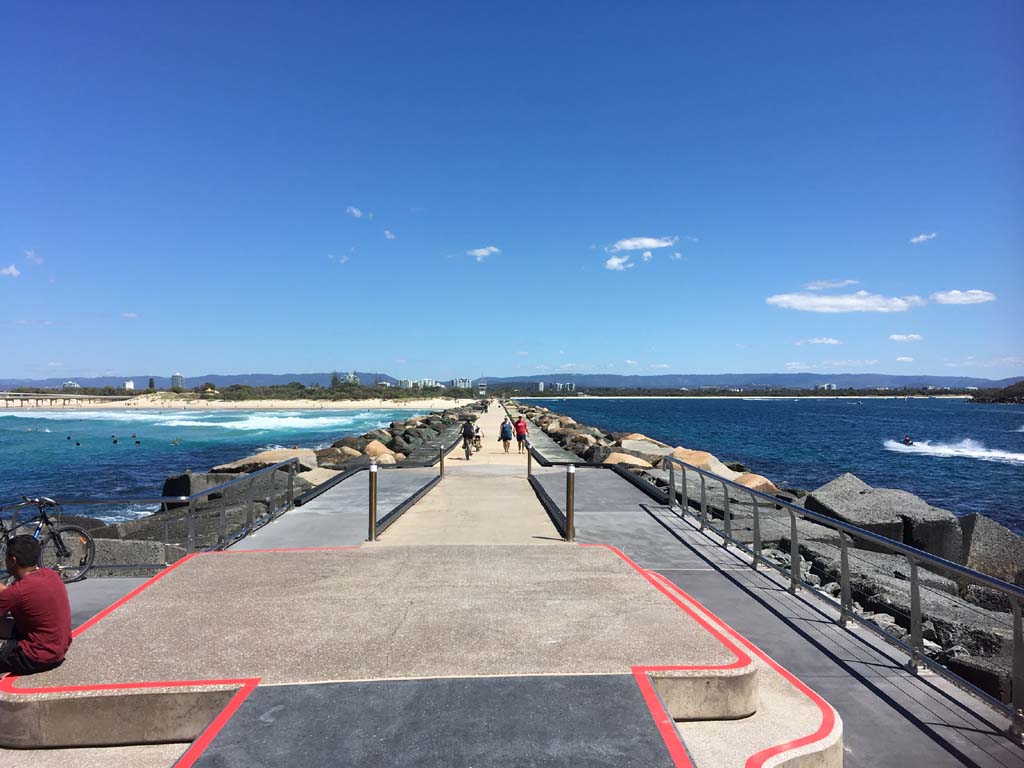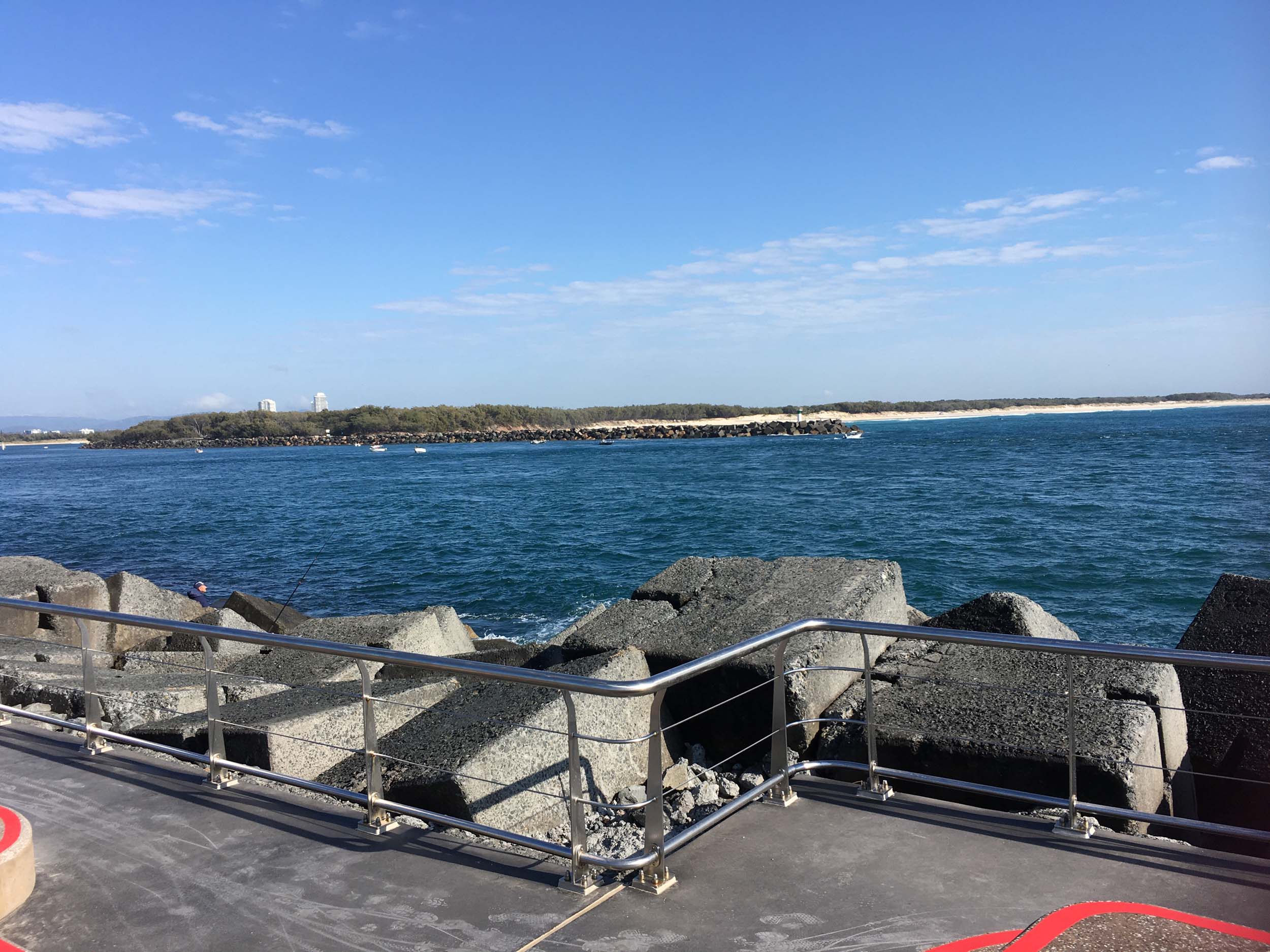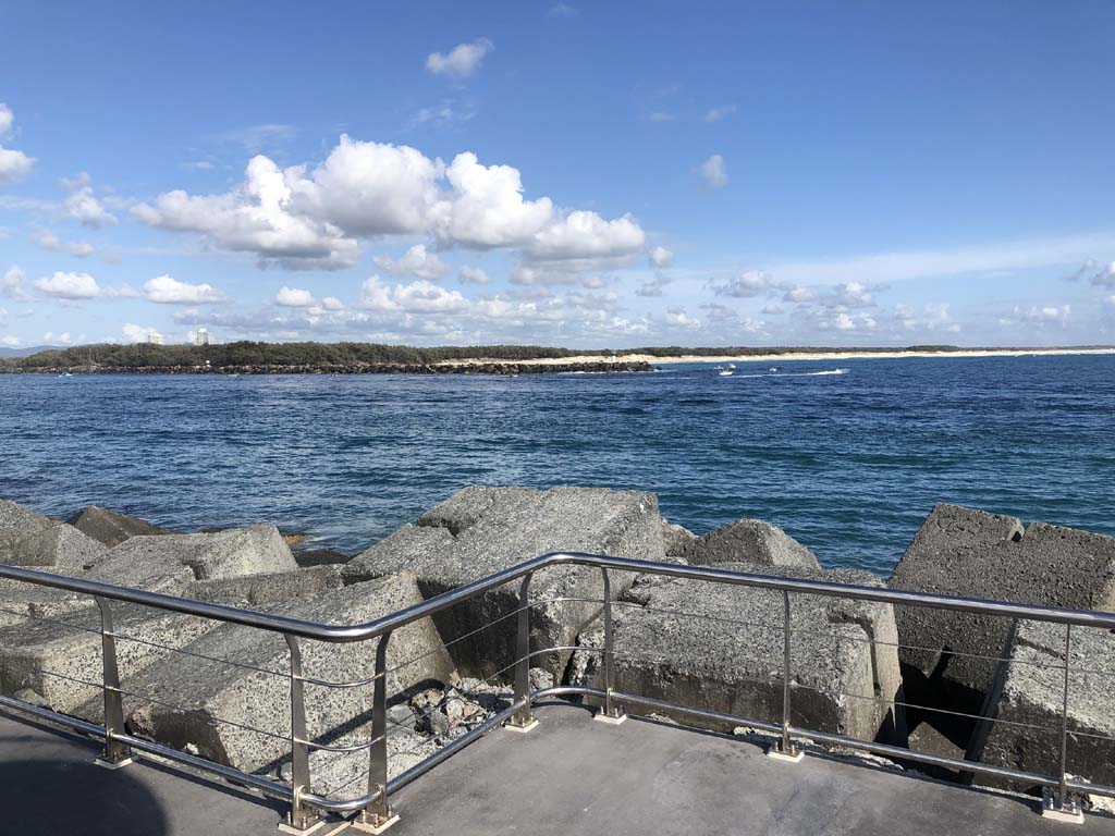 I continued to the Seaway via the Federation Walk. Rode to the tip of the Moondarewa Spit, then out to the tip of the Seawall/Spit. I noticed the Seaworld Resue boat motoring in the mouth of the Seaway but didn't appear to be doing anything. Noone was in the water etc. Then rode back to the tip of the Moondarewa Spit then back to the tip of the Seawall/Spit. Took a few photos at the end of both Spits, sat and ate my banana.