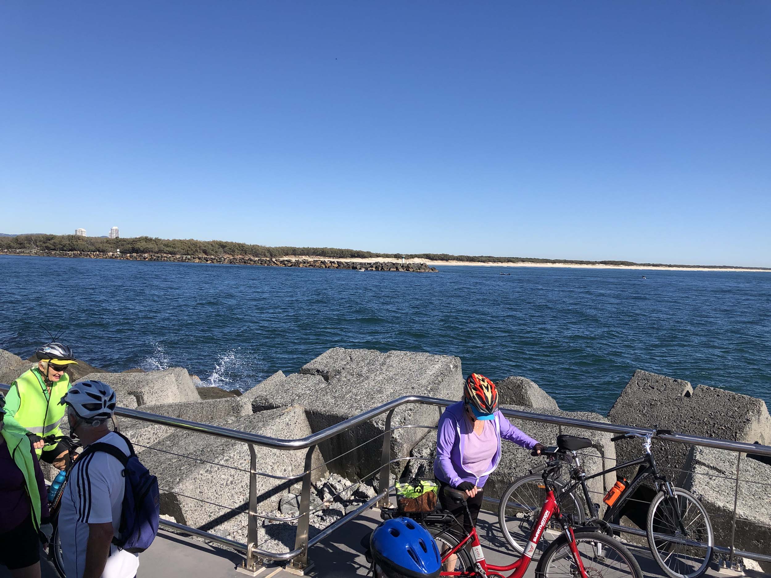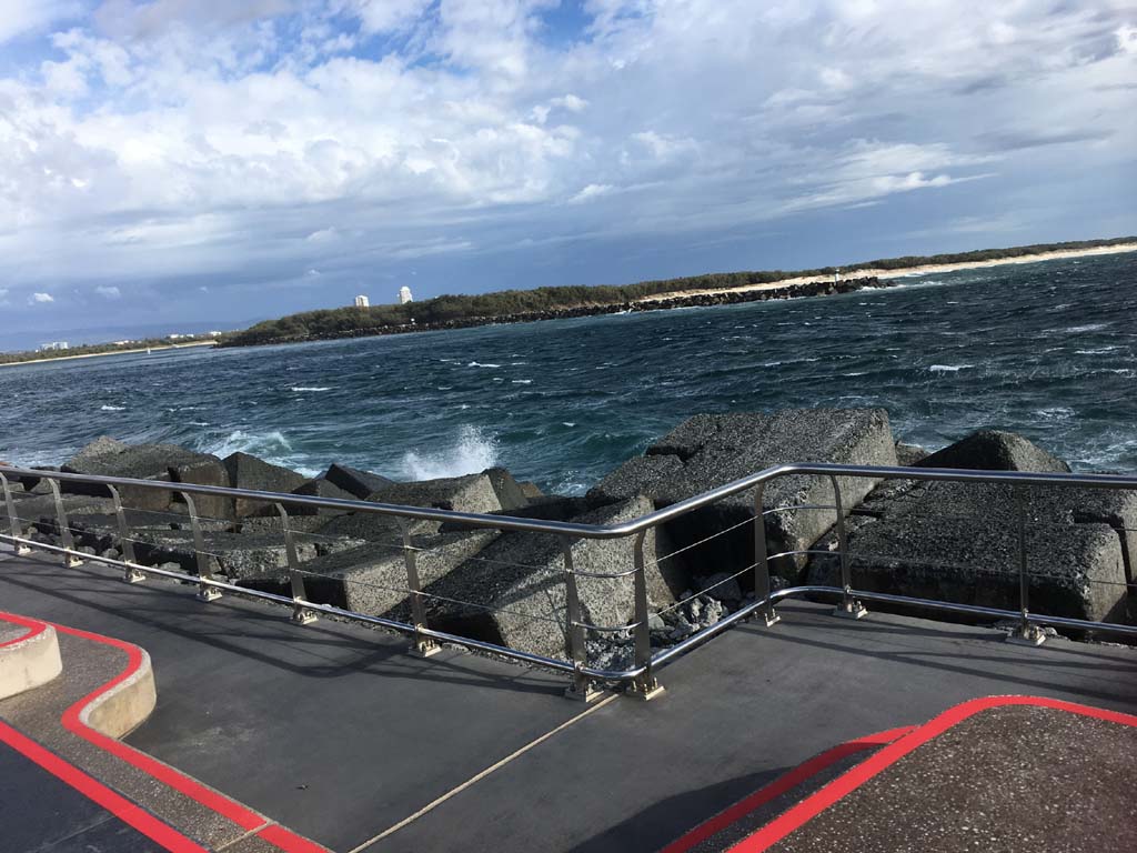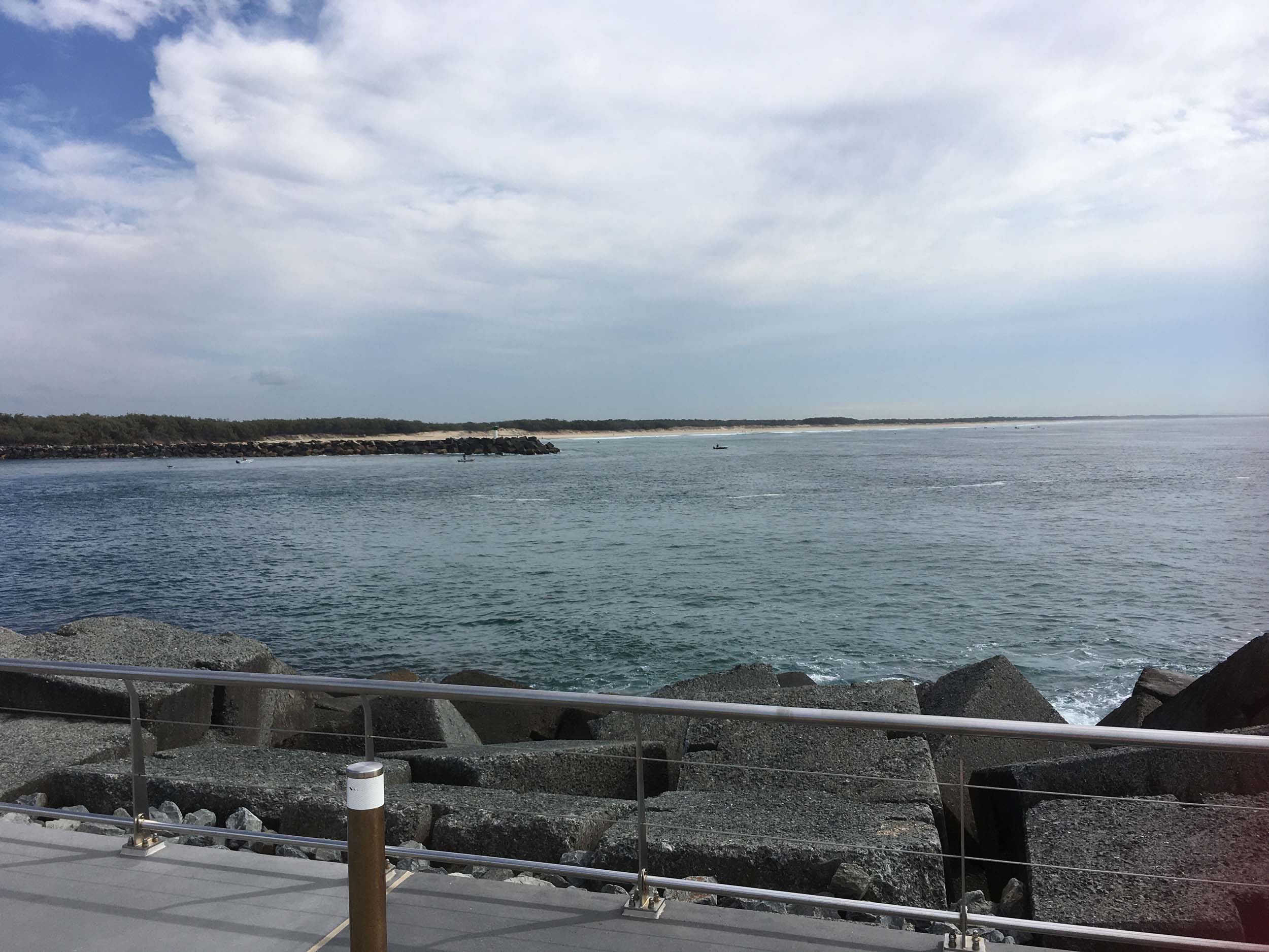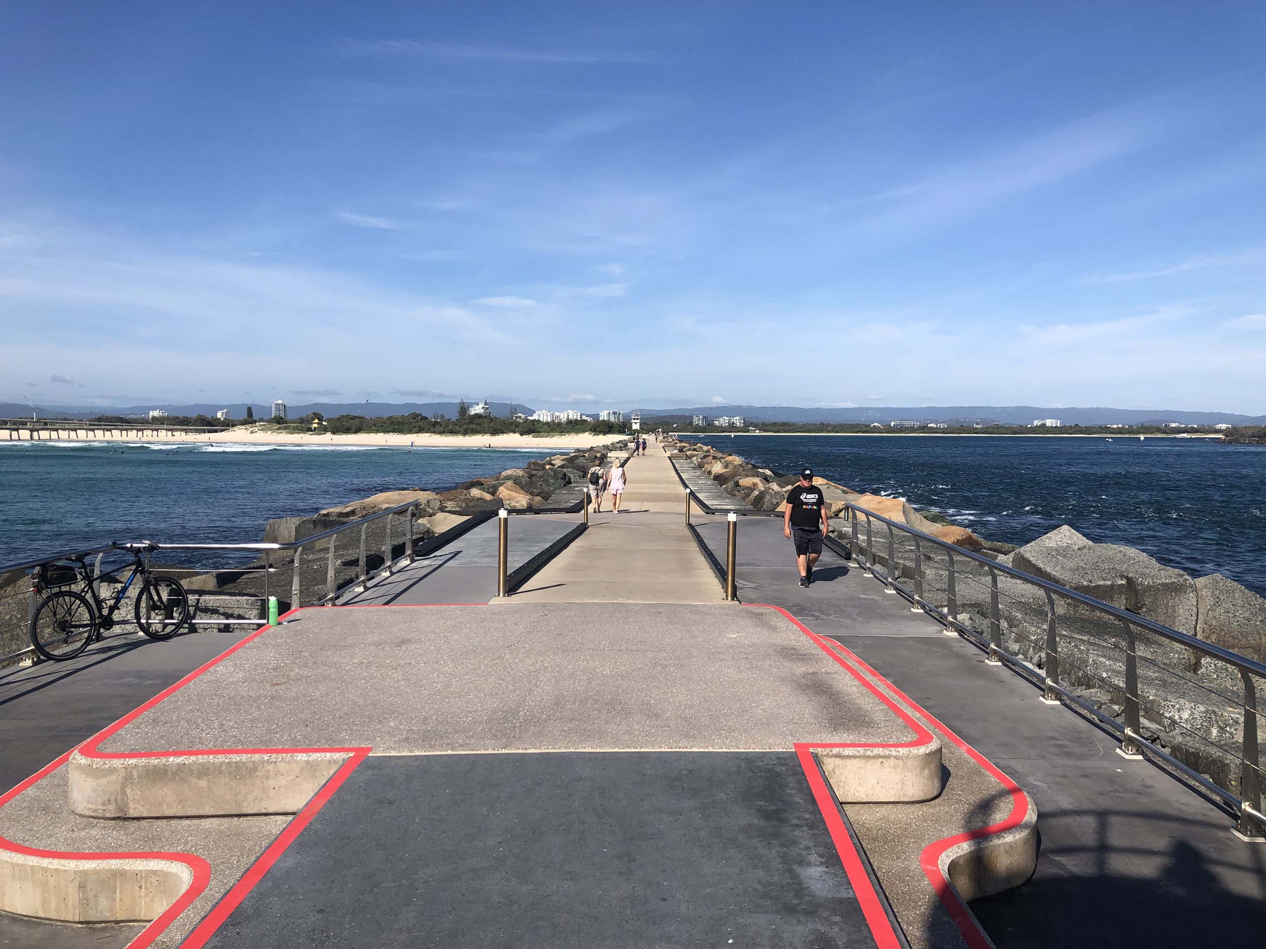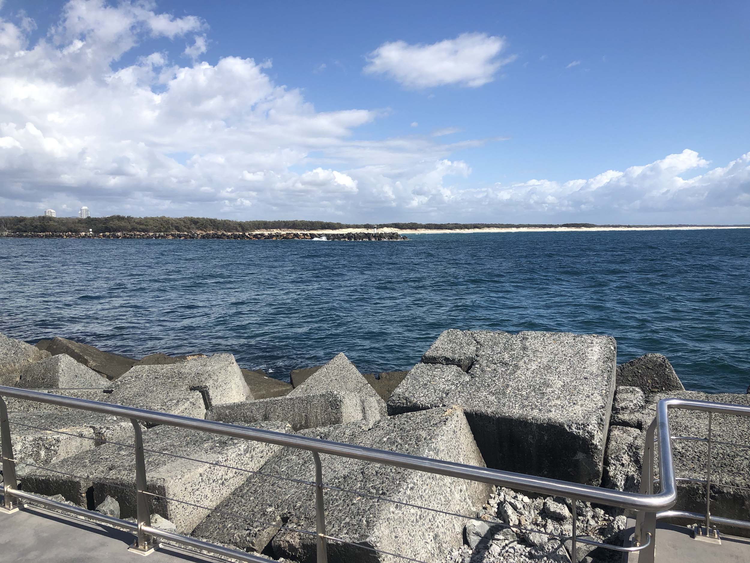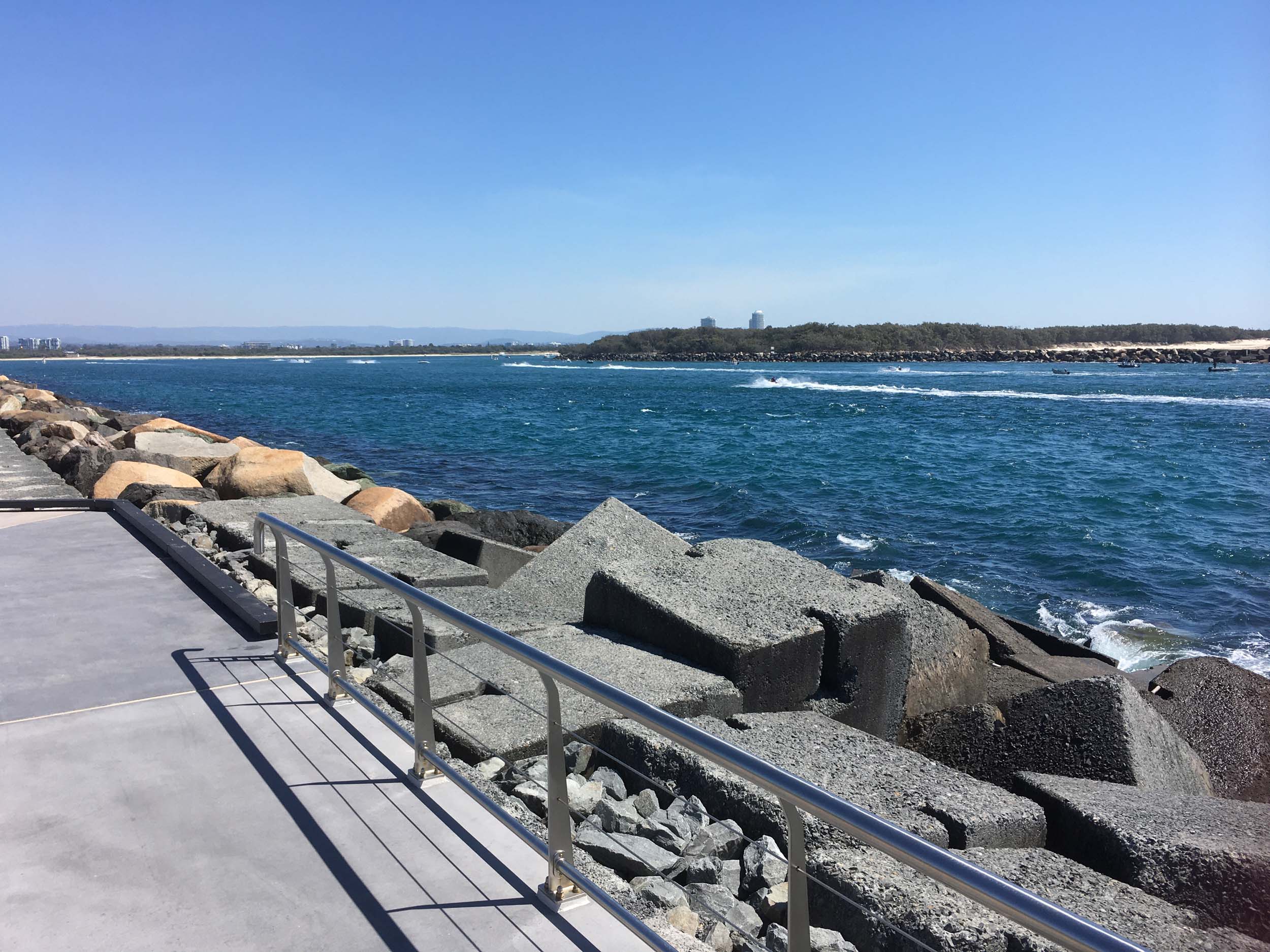 I continued to the Seaway via the Federation Walk. Rode to the tip of the Moondarewa Spit, then out to the tip of the Seawall/Spit. I noticed the Seaworld Resue boat motoring in the mouth of the Seaway but didn't appear to be doing anything. Noone was in the water etc. Then rode back to the tip of the Moondarewa Spit then back to the tip of the Seawall/Spit. Took a few photos at the end of both Spits, sat and ate my banana.