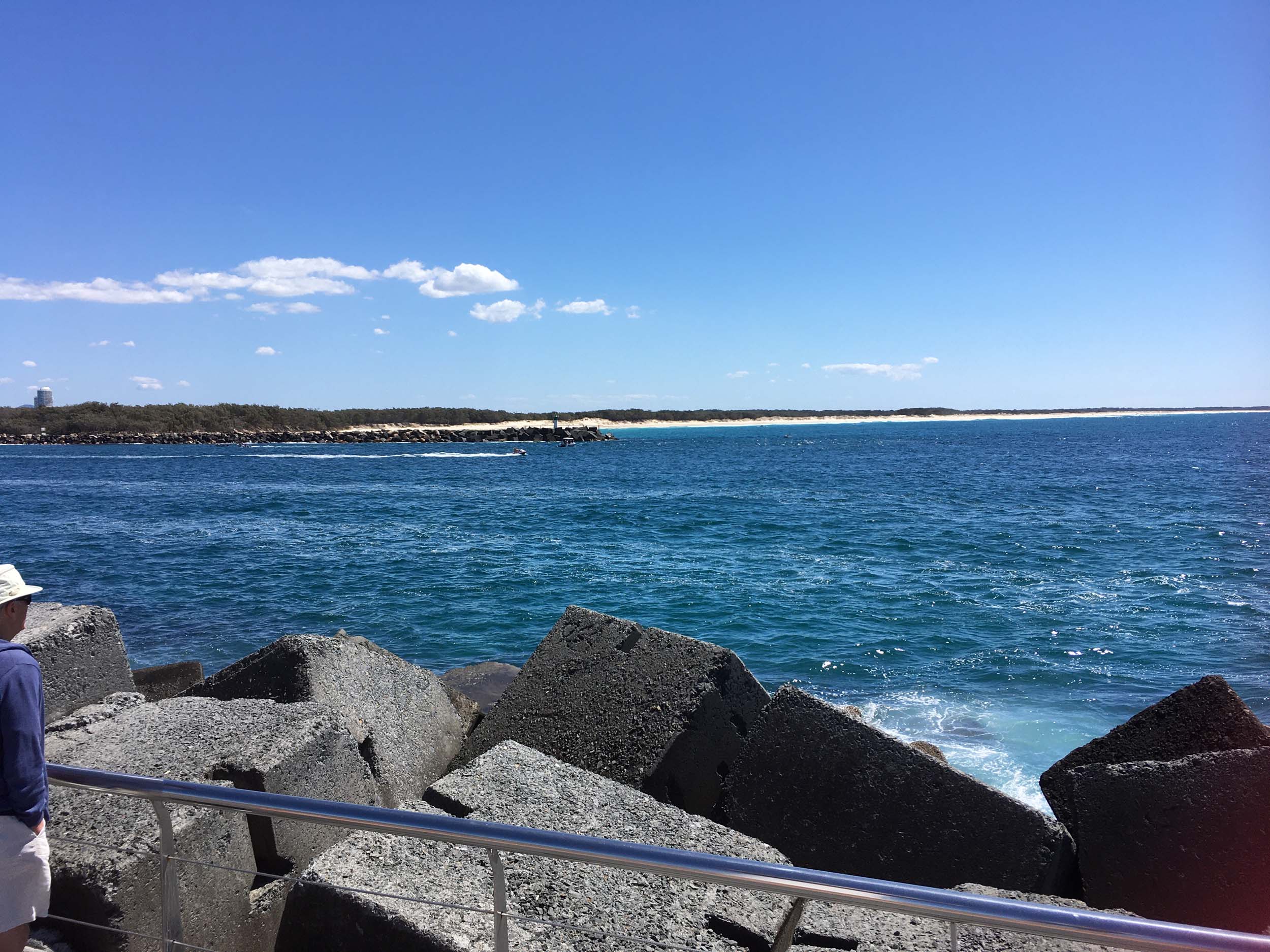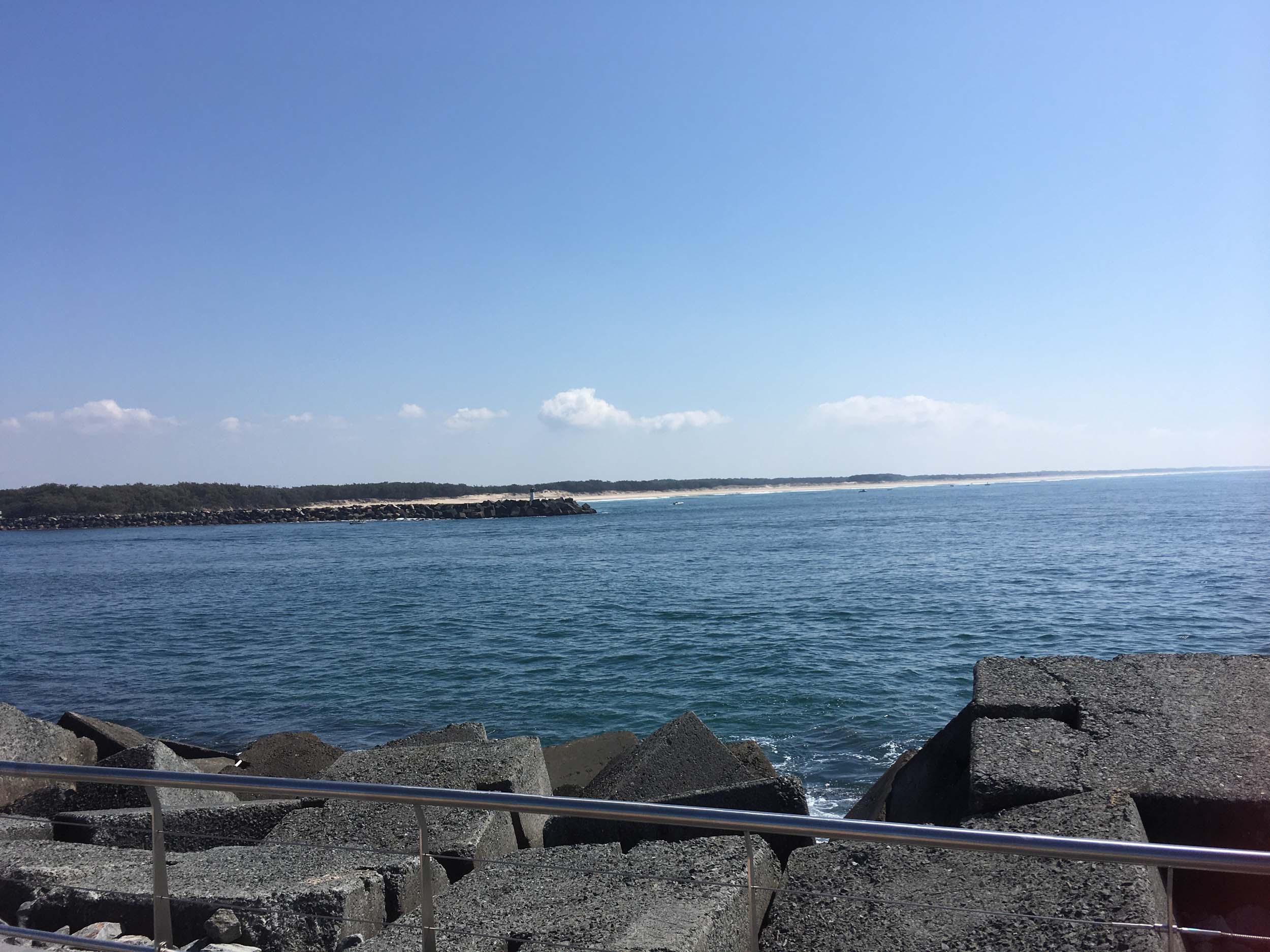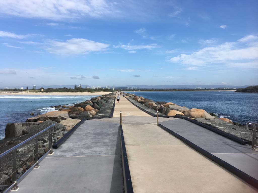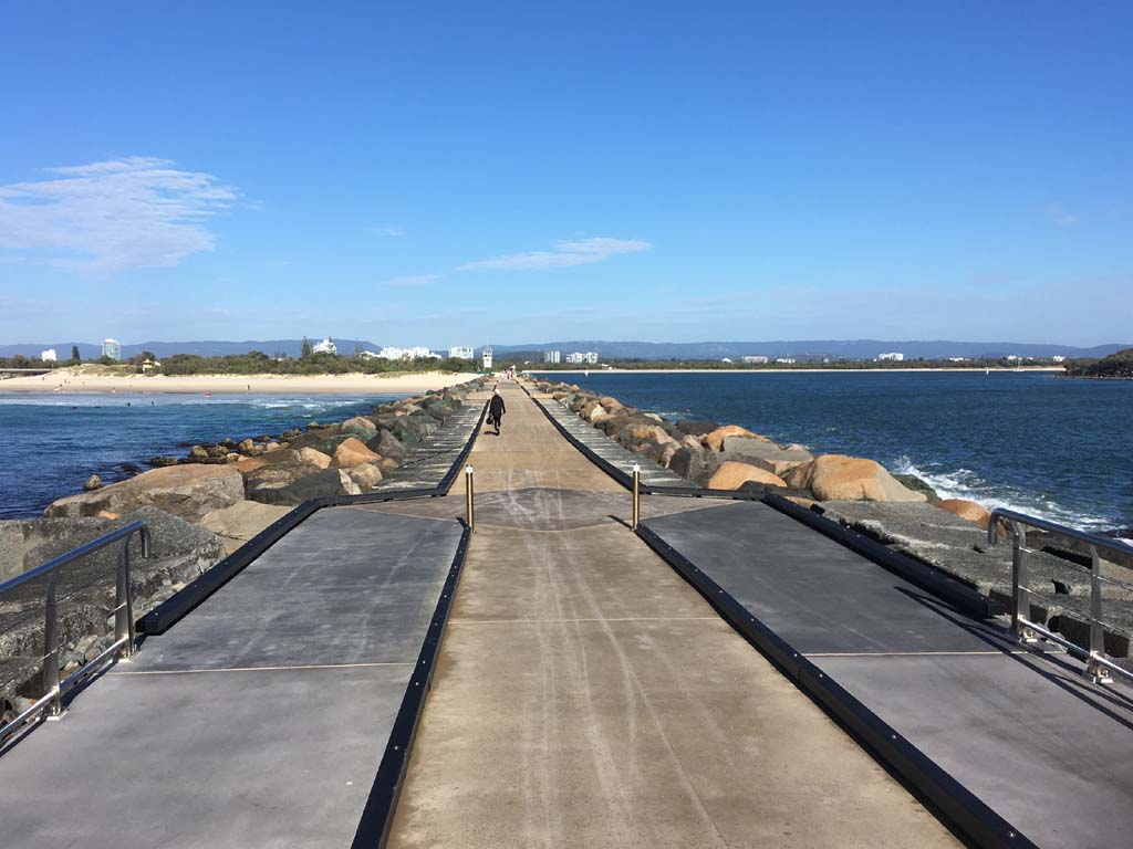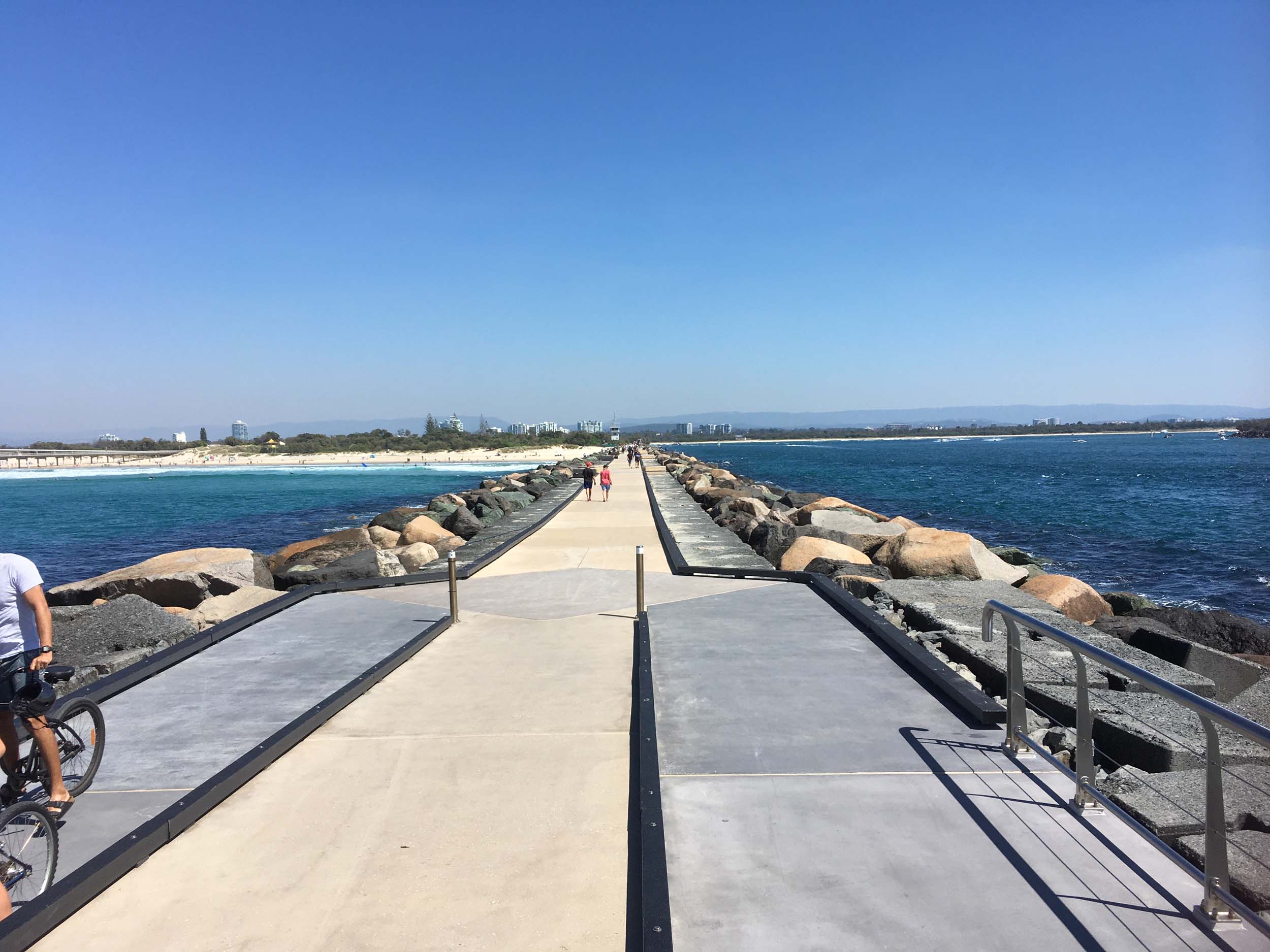 I continued to the Seaway via the Federation Walk. Rode to the tip of the Moondarewa Spit, then out to the tip of the Seawall/Spit. I noticed the Seaworld Resue boat motoring in the mouth of the Seaway but didn't appear to be doing anything. Noone was in the water etc. Then rode back to the tip of the Moondarewa Spit then back to the tip of the Seawall/Spit. Took a few photos at the end of both Spits, sat and ate my banana.