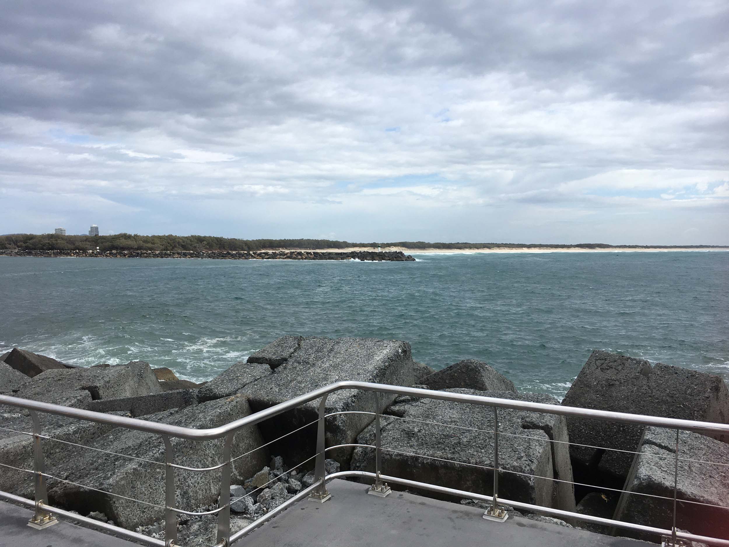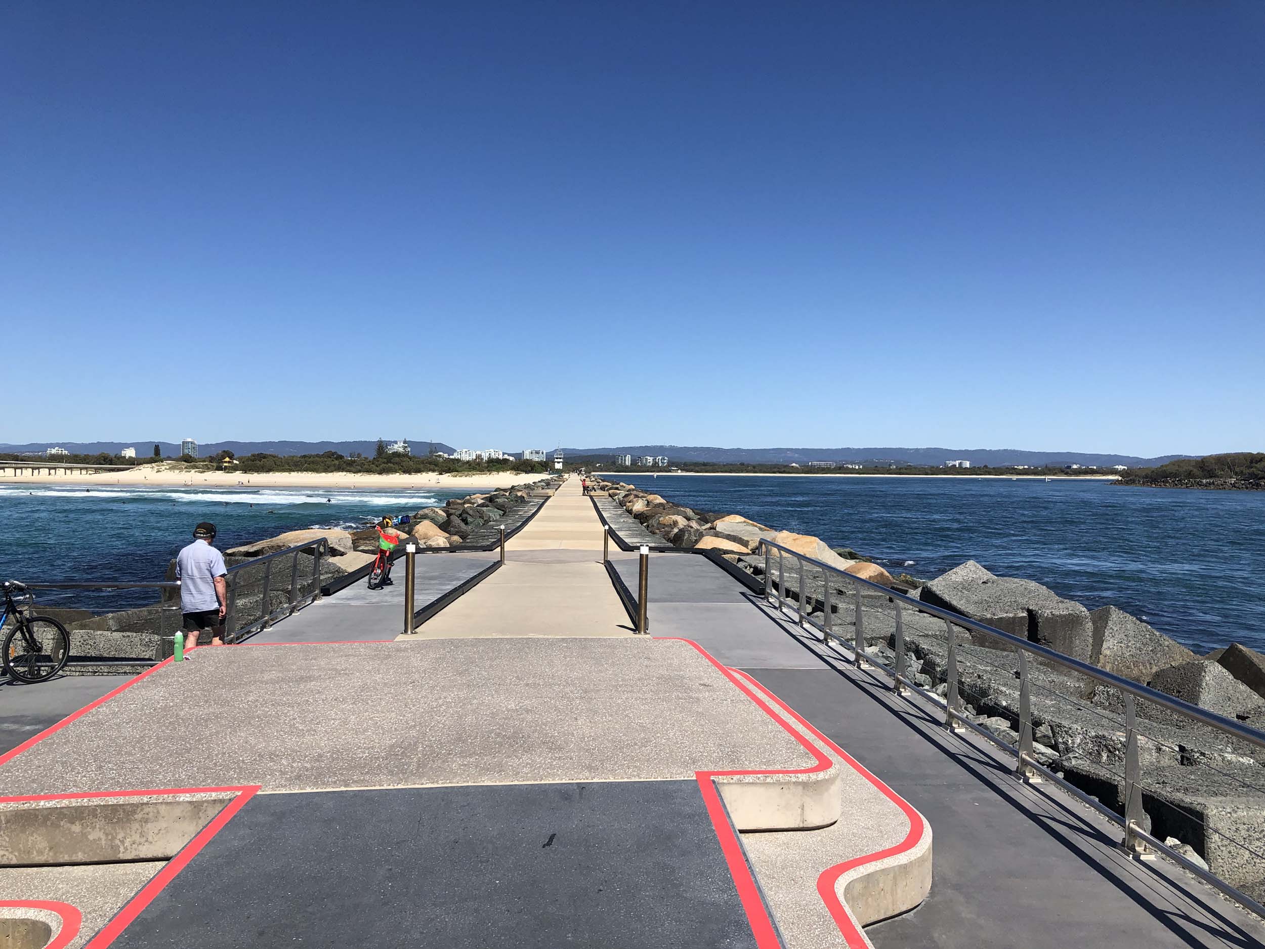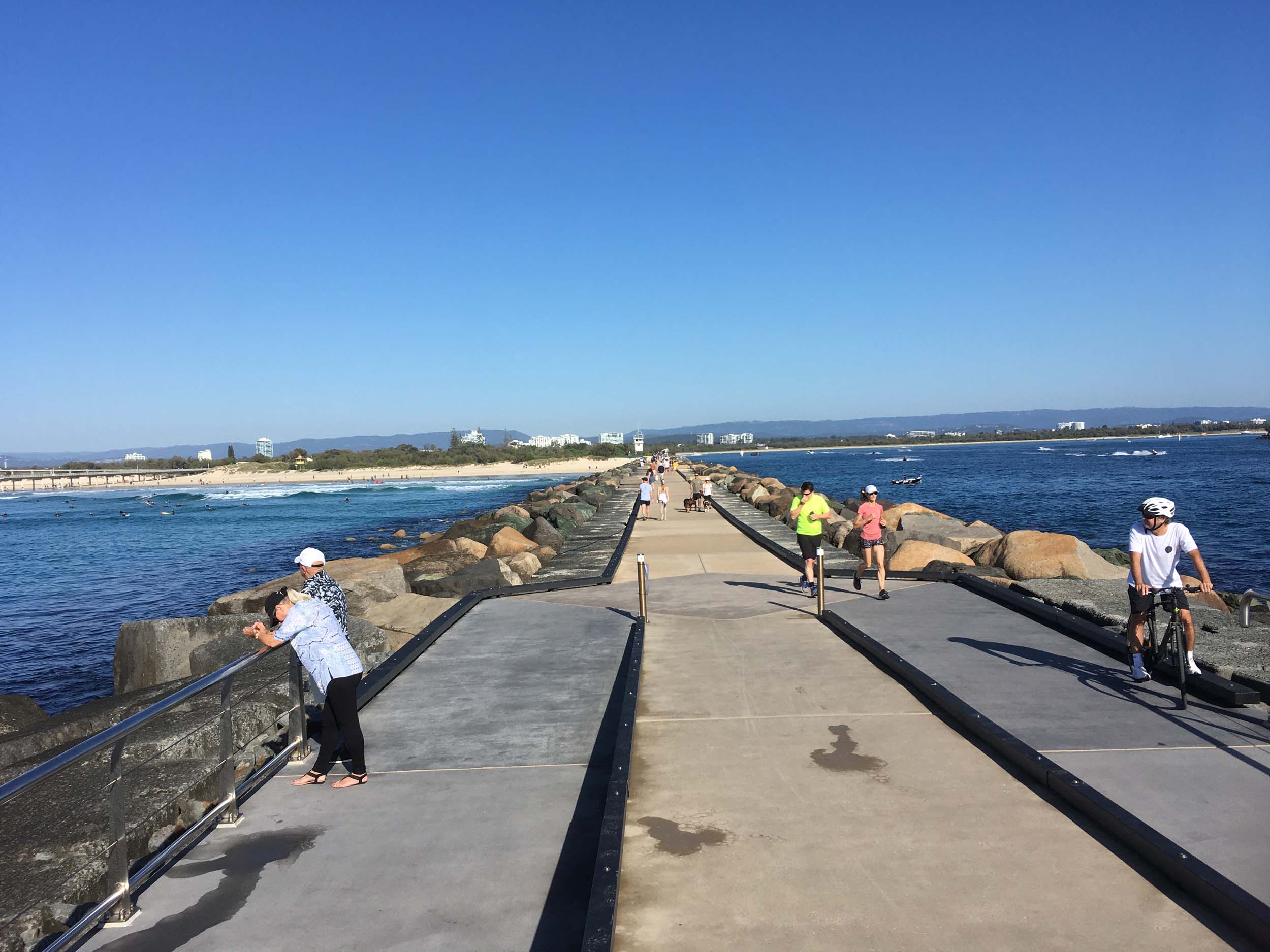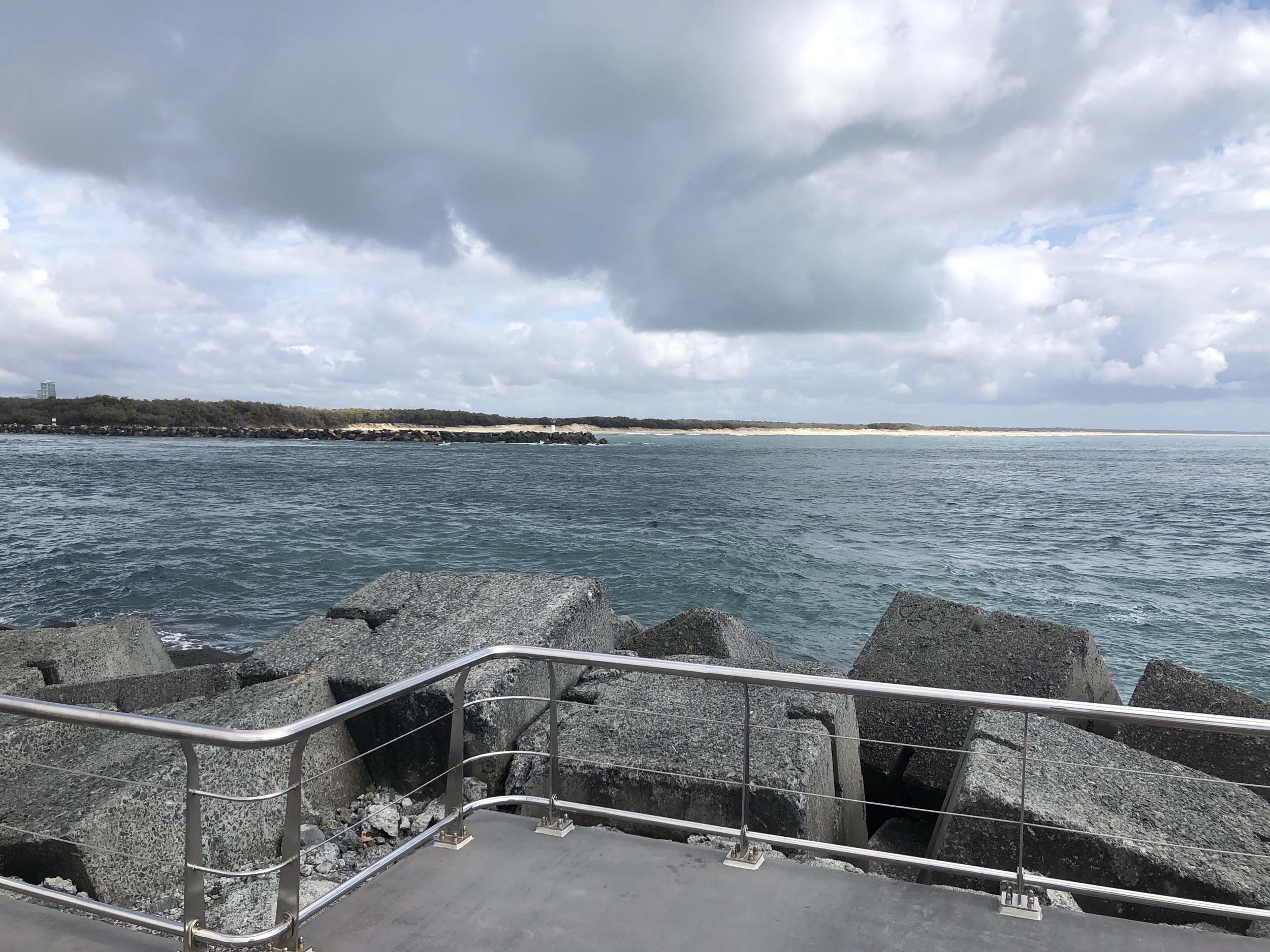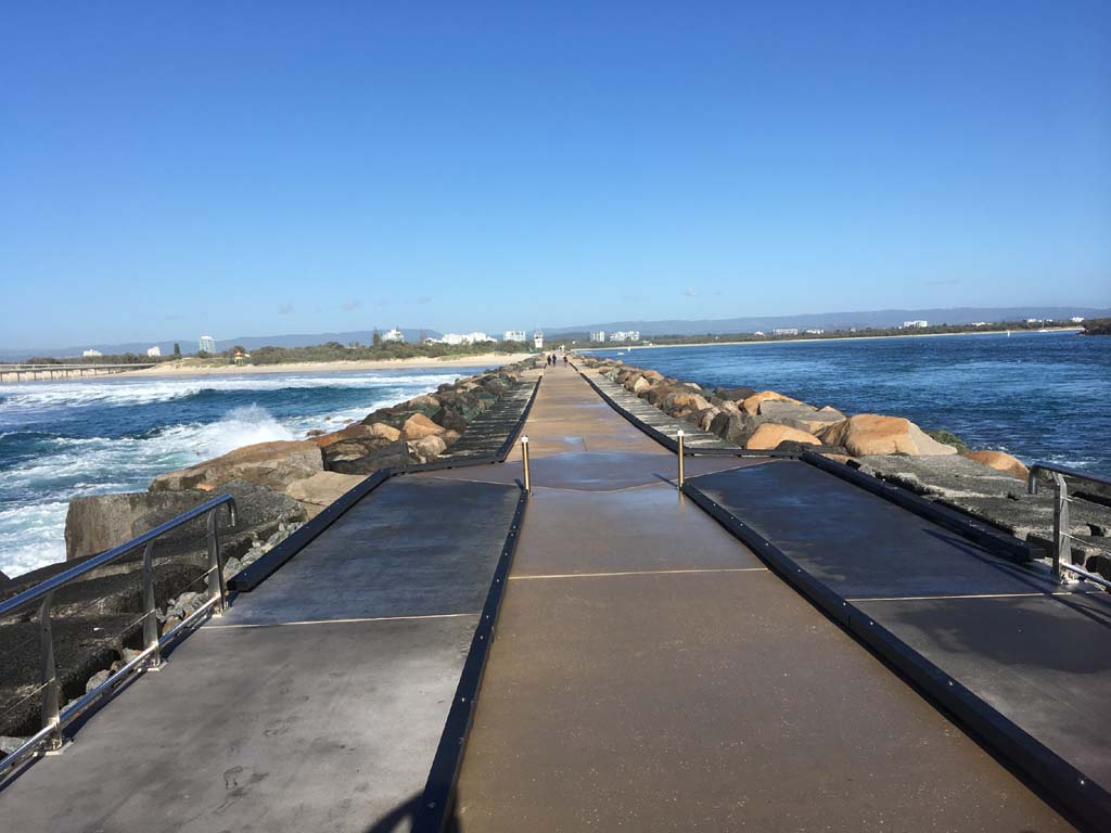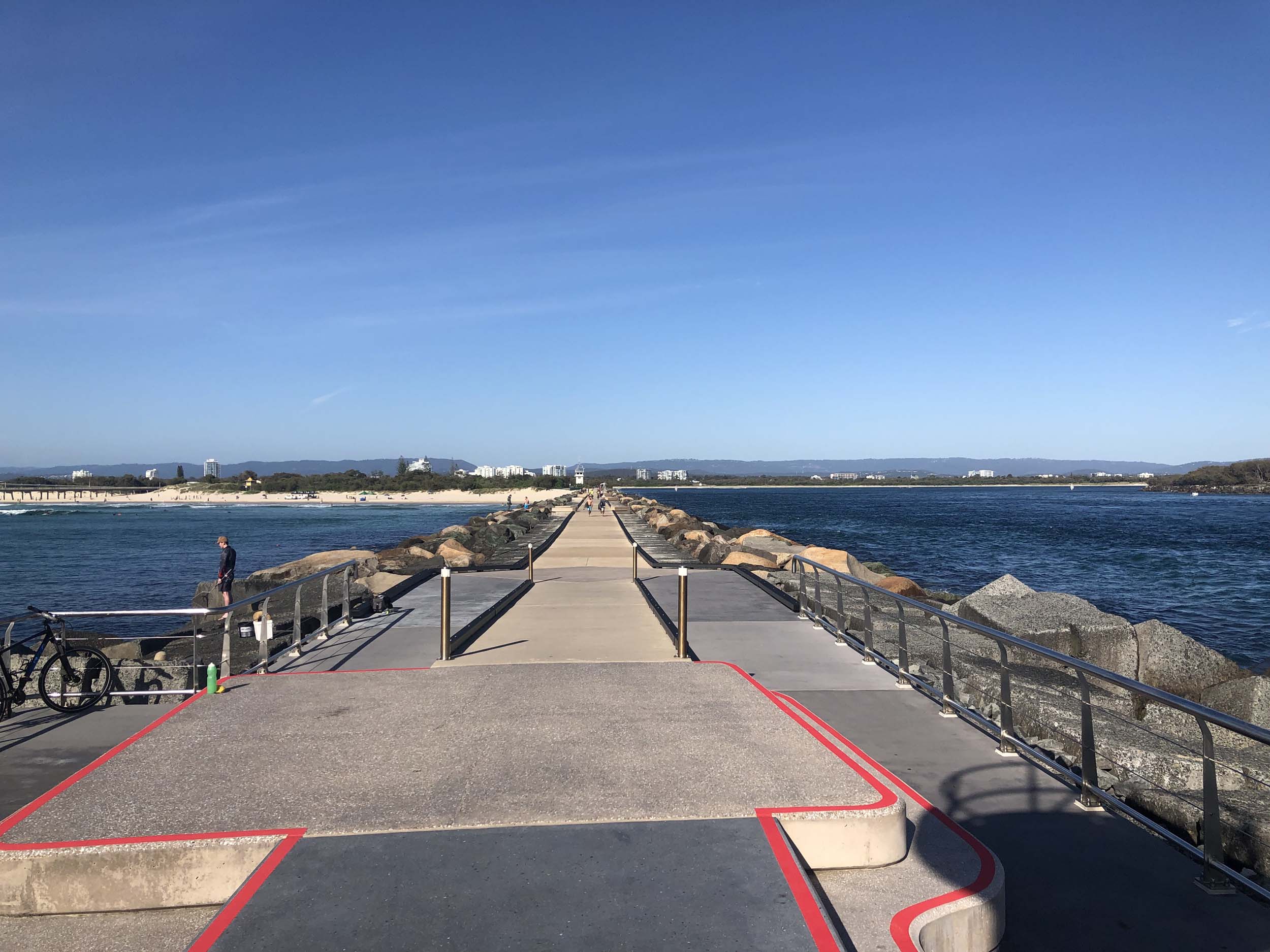 I continued to the Seaway via the Federation Walk. Rode to the tip of the Moondarewa Spit, then out to the tip of the Seawall/Spit. I noticed the Seaworld Resue boat motoring in the mouth of the Seaway but didn't appear to be doing anything. Noone was in the water etc. Then rode back to the tip of the Moondarewa Spit then back to the tip of the Seawall/Spit. Took a few photos at the end of both Spits, sat and ate my banana.