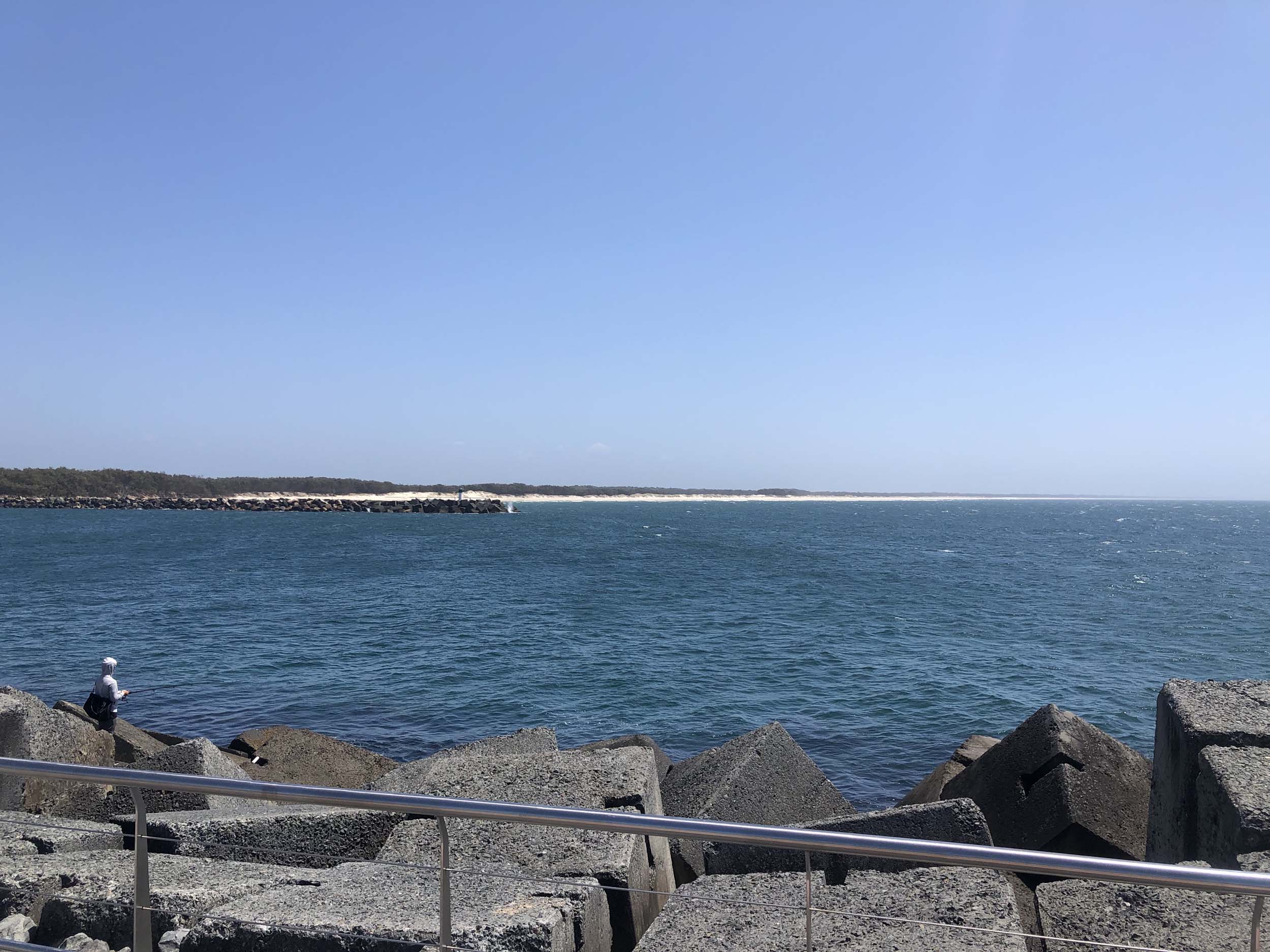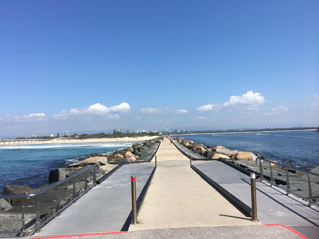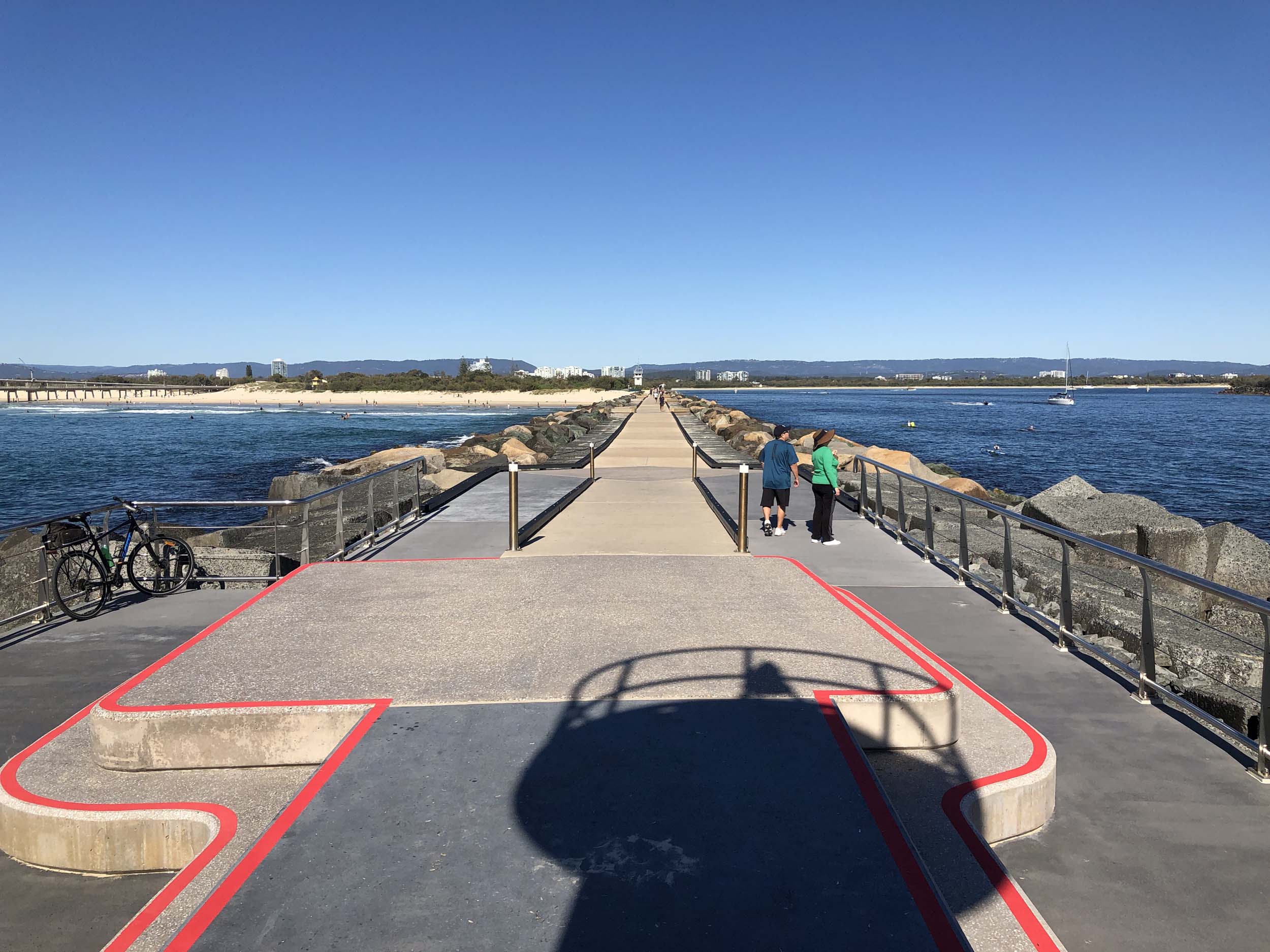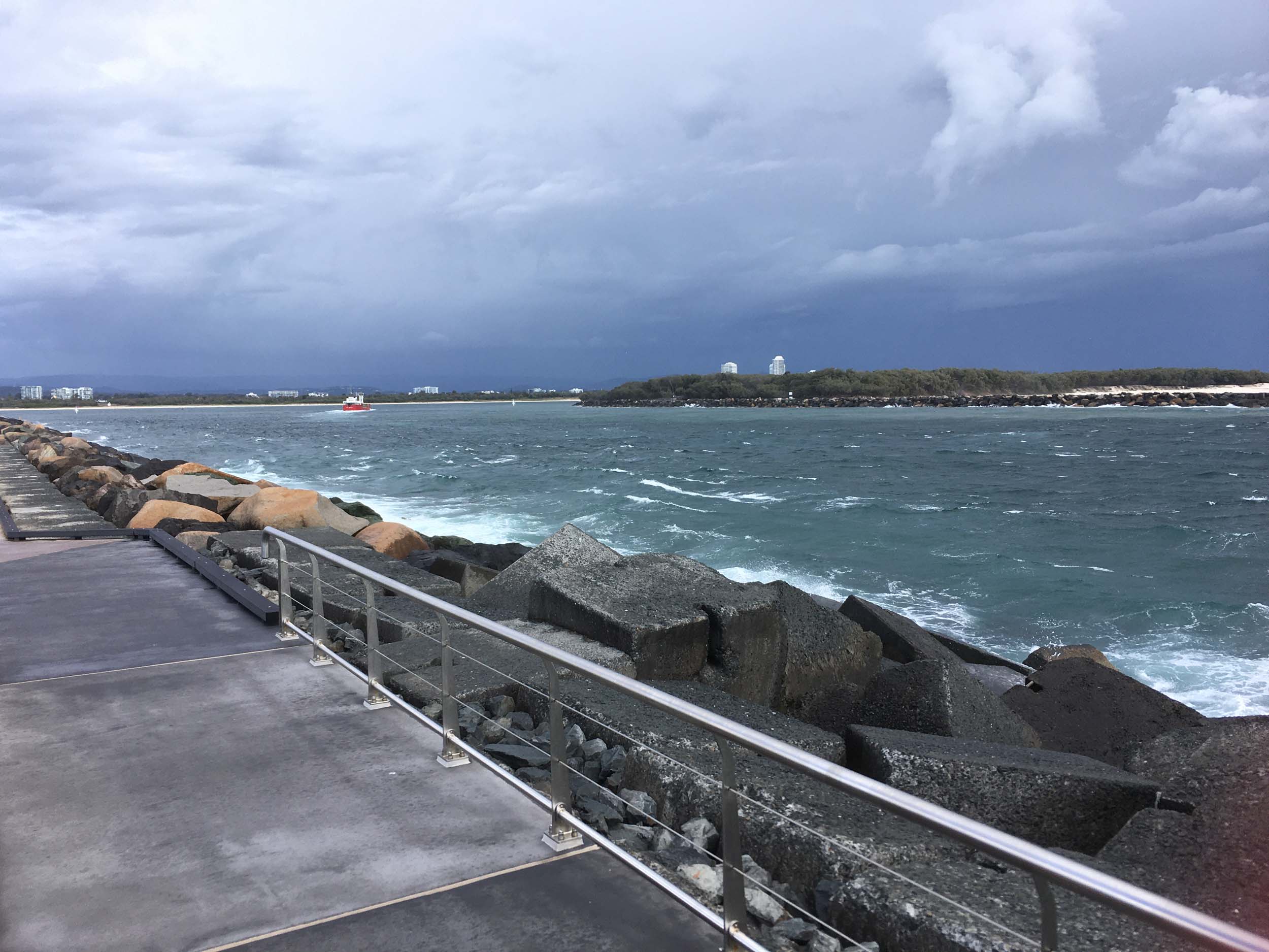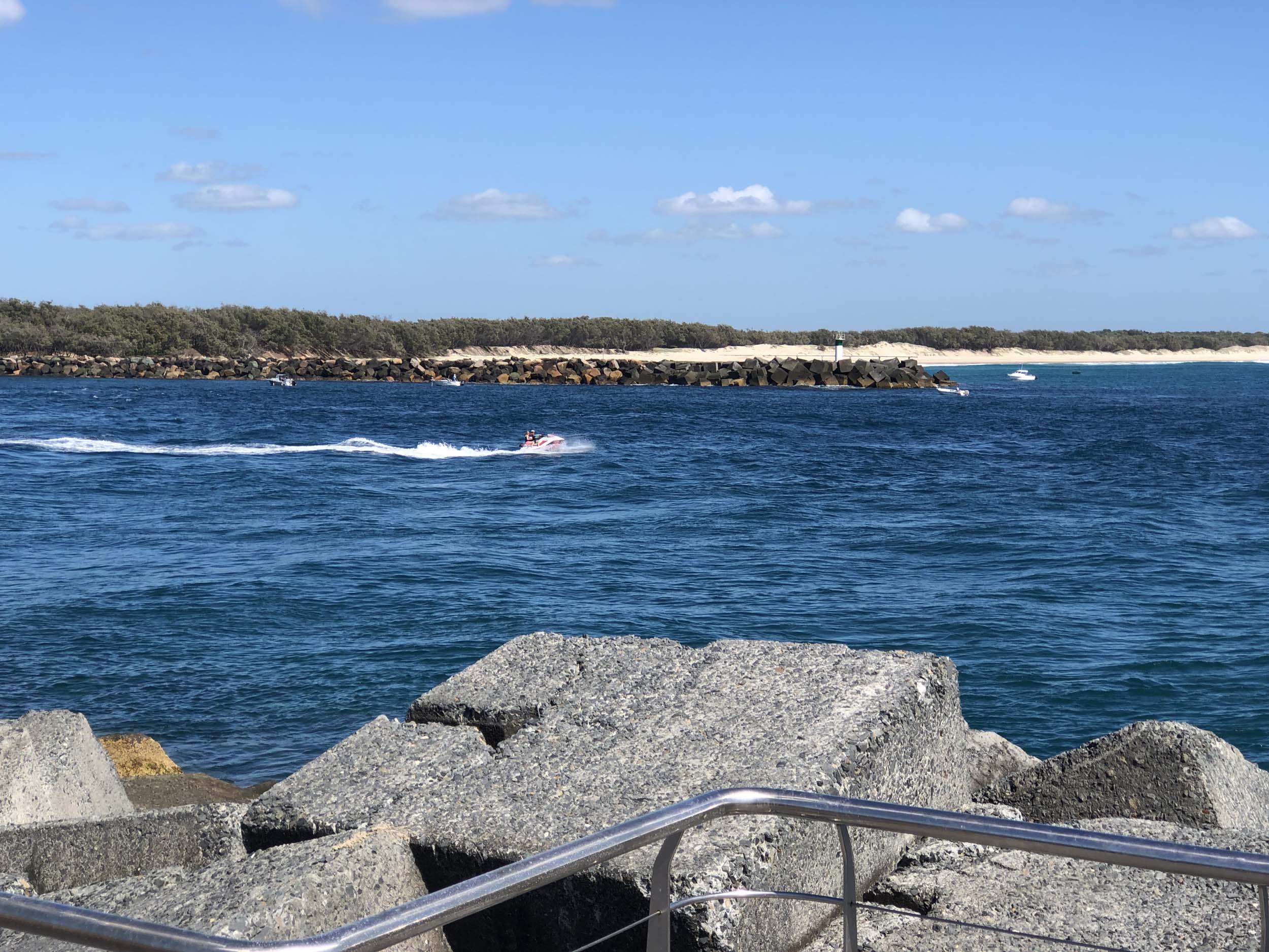 I continued to the Seaway via the Federation Walk. Rode to the tip of the Moondarewa Spit, then out to the tip of the Seawall/Spit. I noticed the Seaworld Resue boat motoring in the mouth of the Seaway but didn't appear to be doing anything. Noone was in the water etc. Then rode back to the tip of the Moondarewa Spit then back to the tip of the Seawall/Spit. Took a few photos at the end of both Spits, sat and ate my banana.