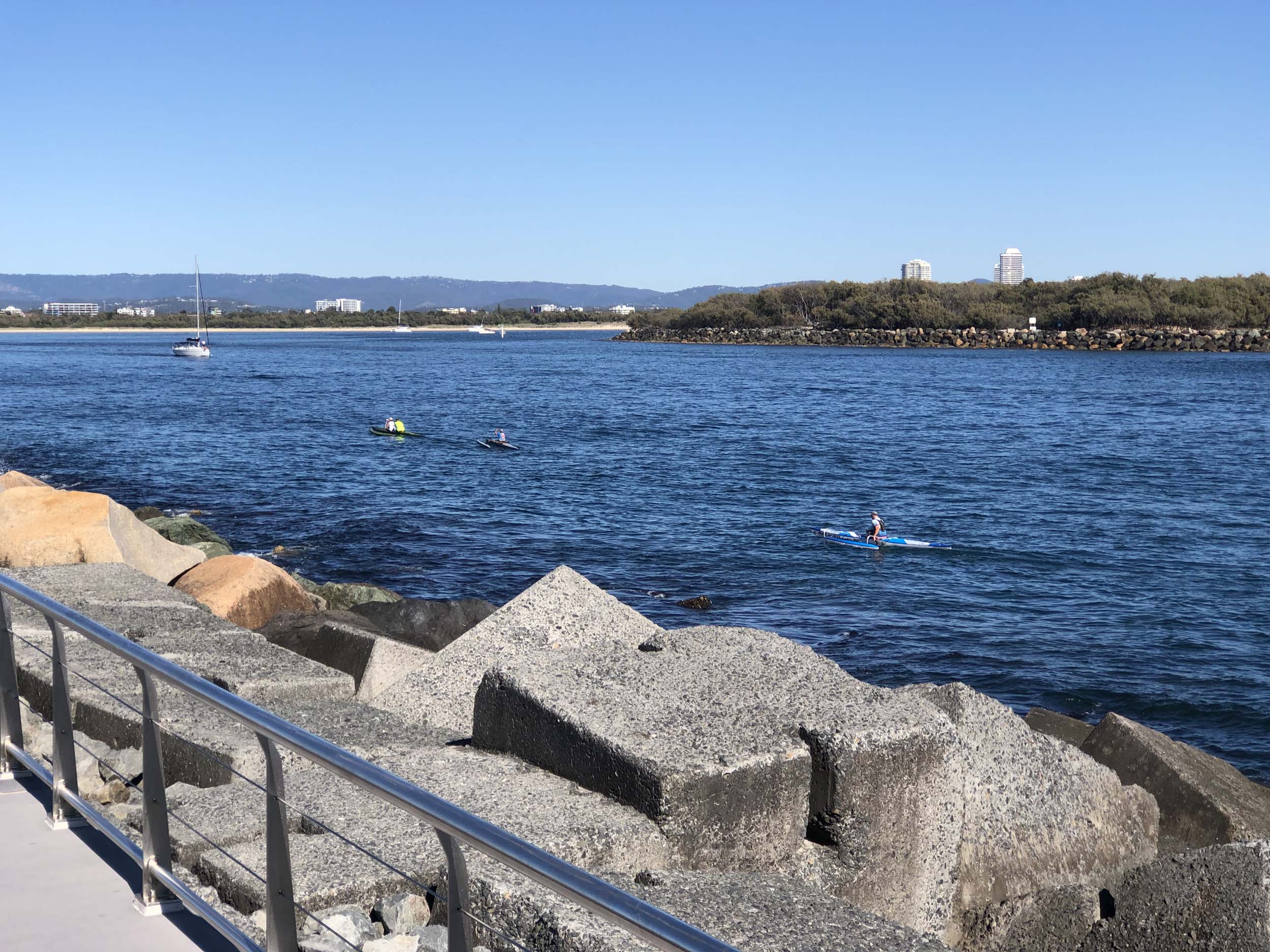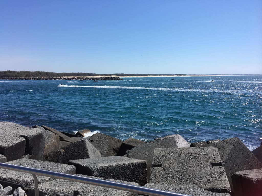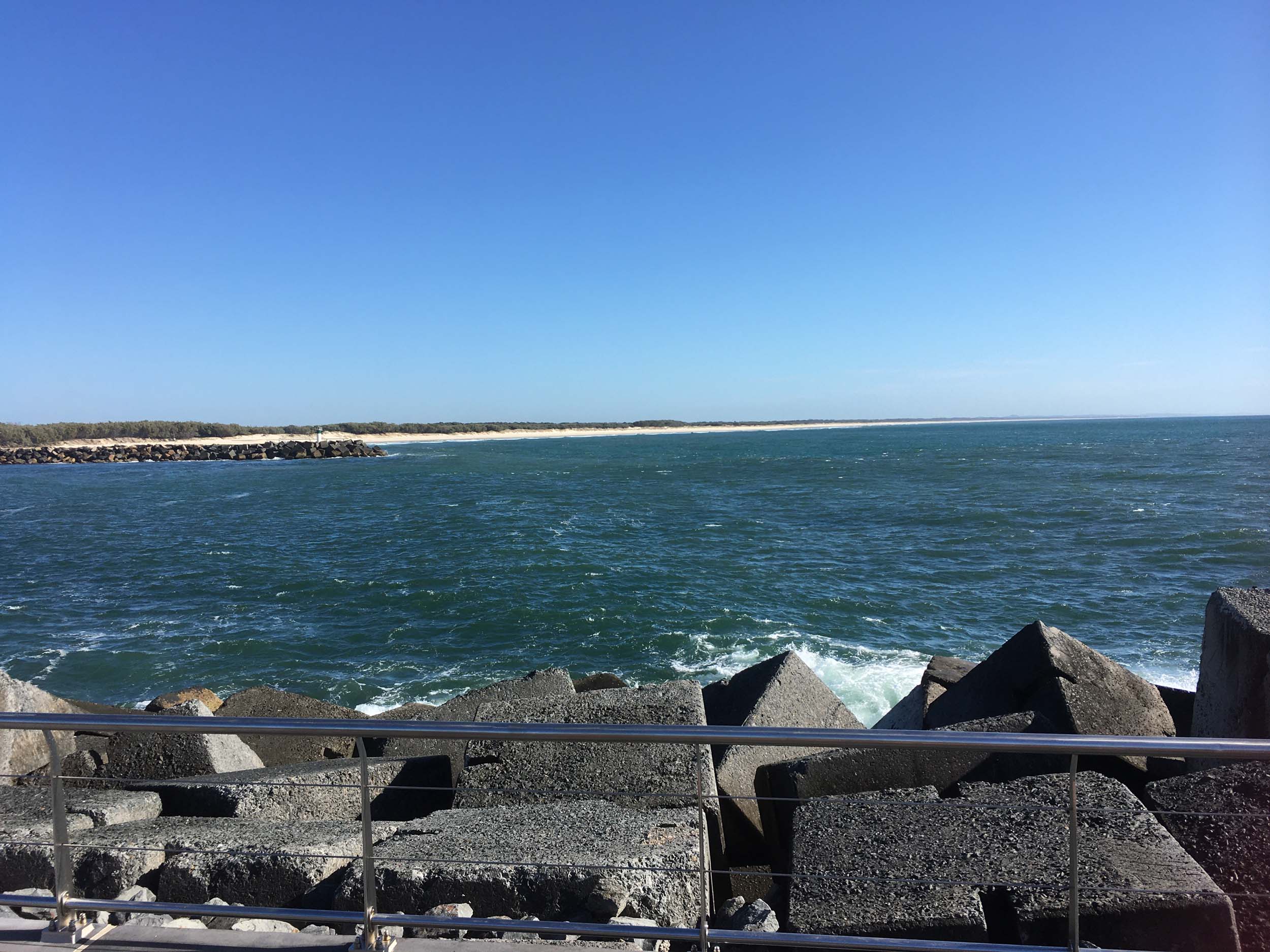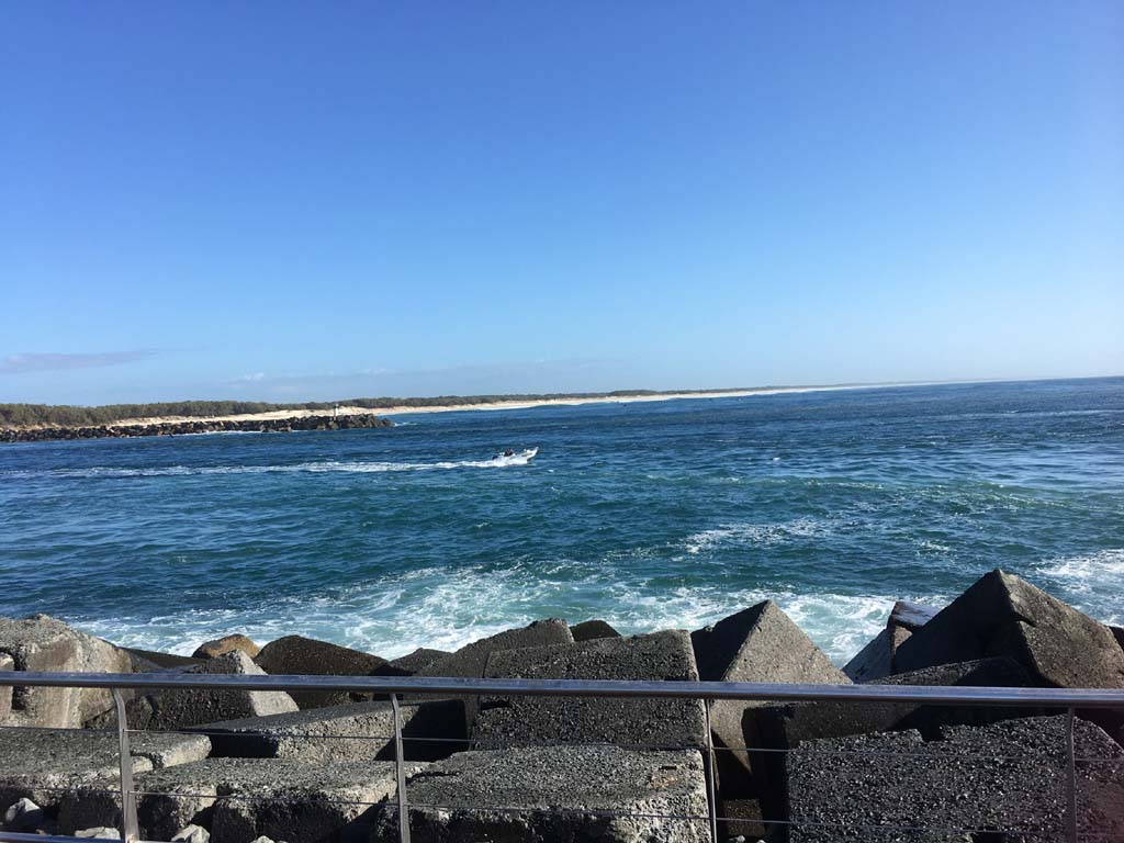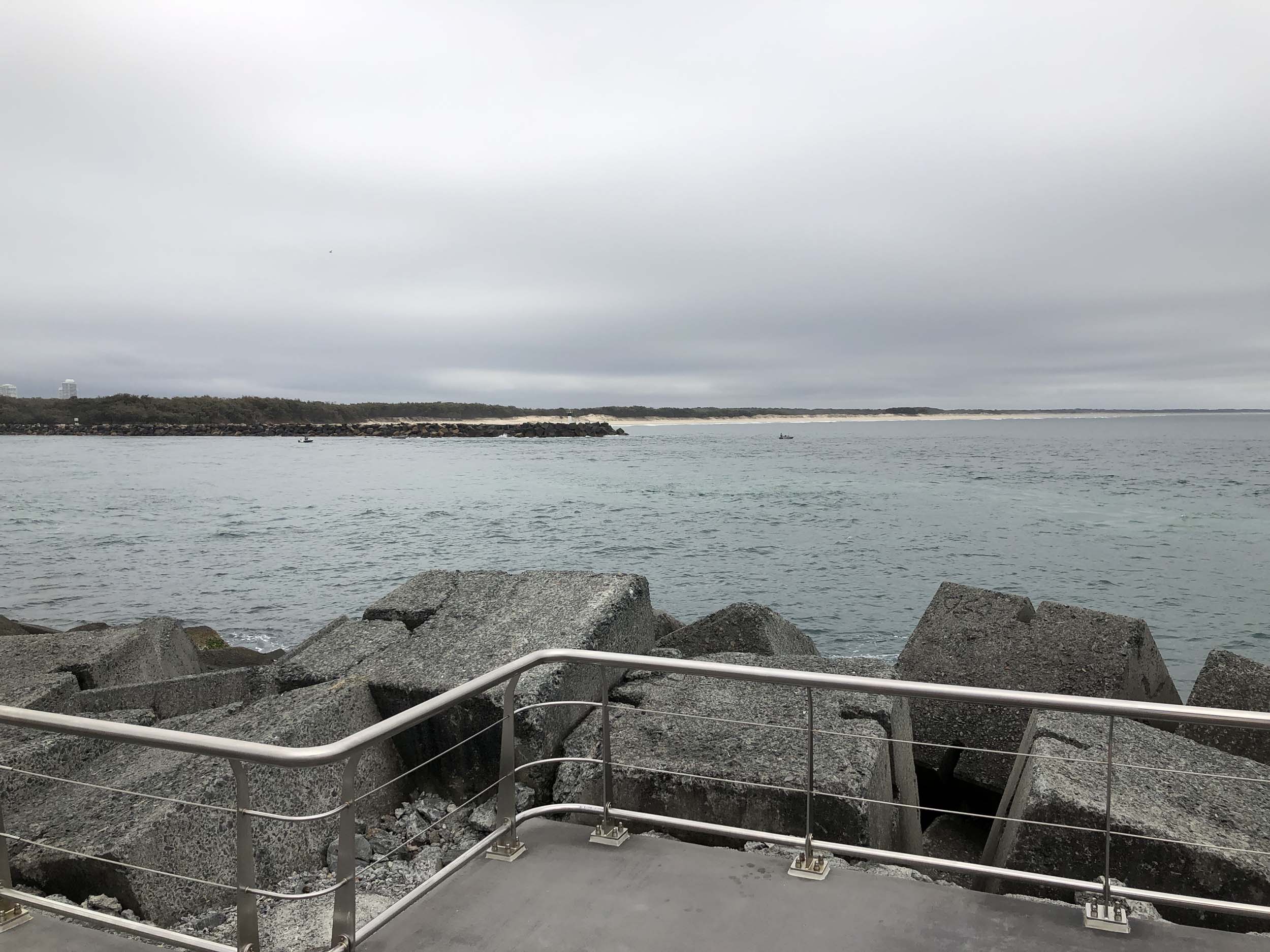 I continued to the Seaway via the Federation Walk. Rode to the tip of the Moondarewa Spit, then out to the tip of the Seawall/Spit. I noticed the Seaworld Resue boat motoring in the mouth of the Seaway but didn't appear to be doing anything. Noone was in the water etc. Then rode back to the tip of the Moondarewa Spit then back to the tip of the Seawall/Spit. Took a few photos at the end of both Spits, sat and ate my banana.