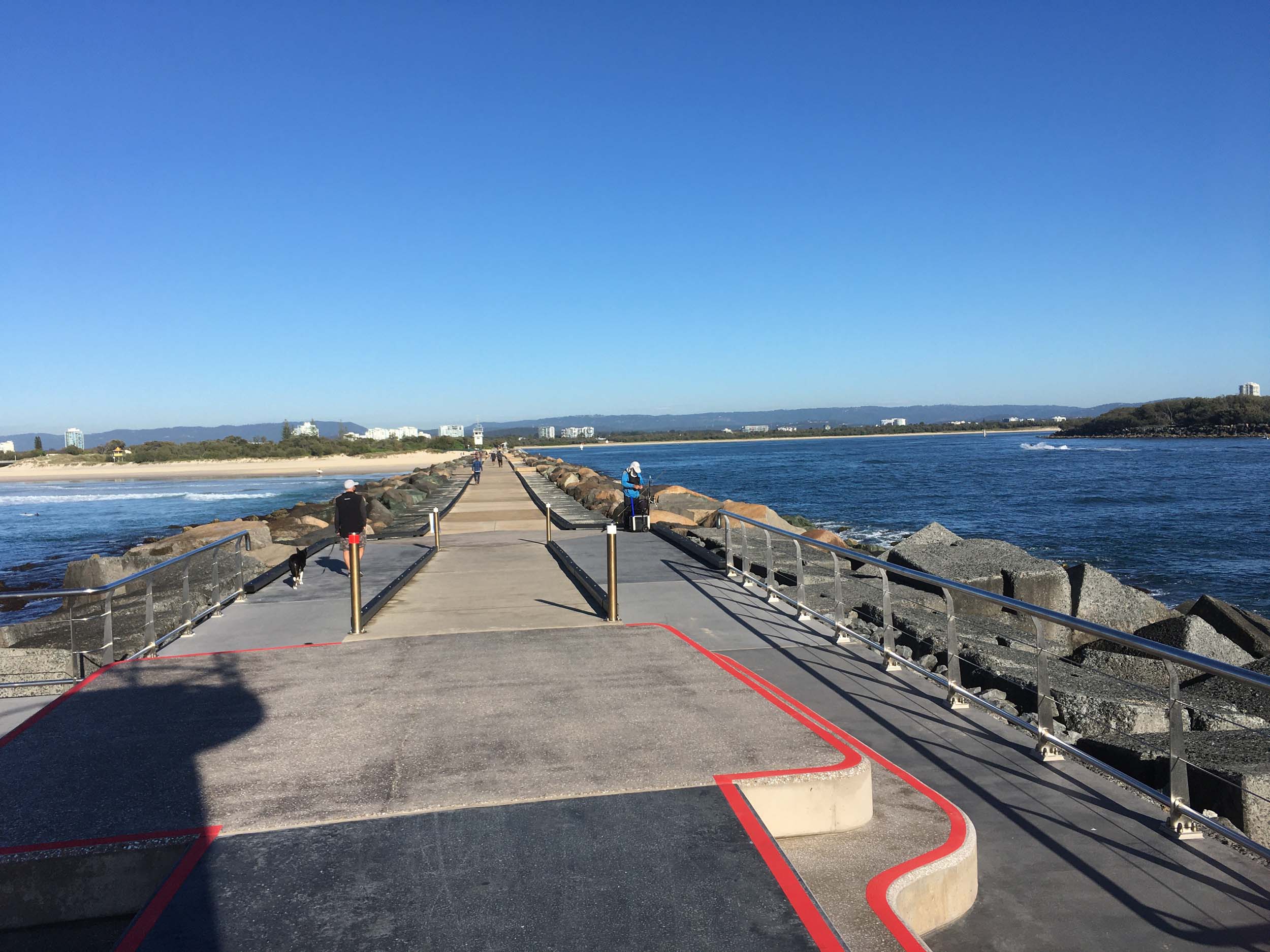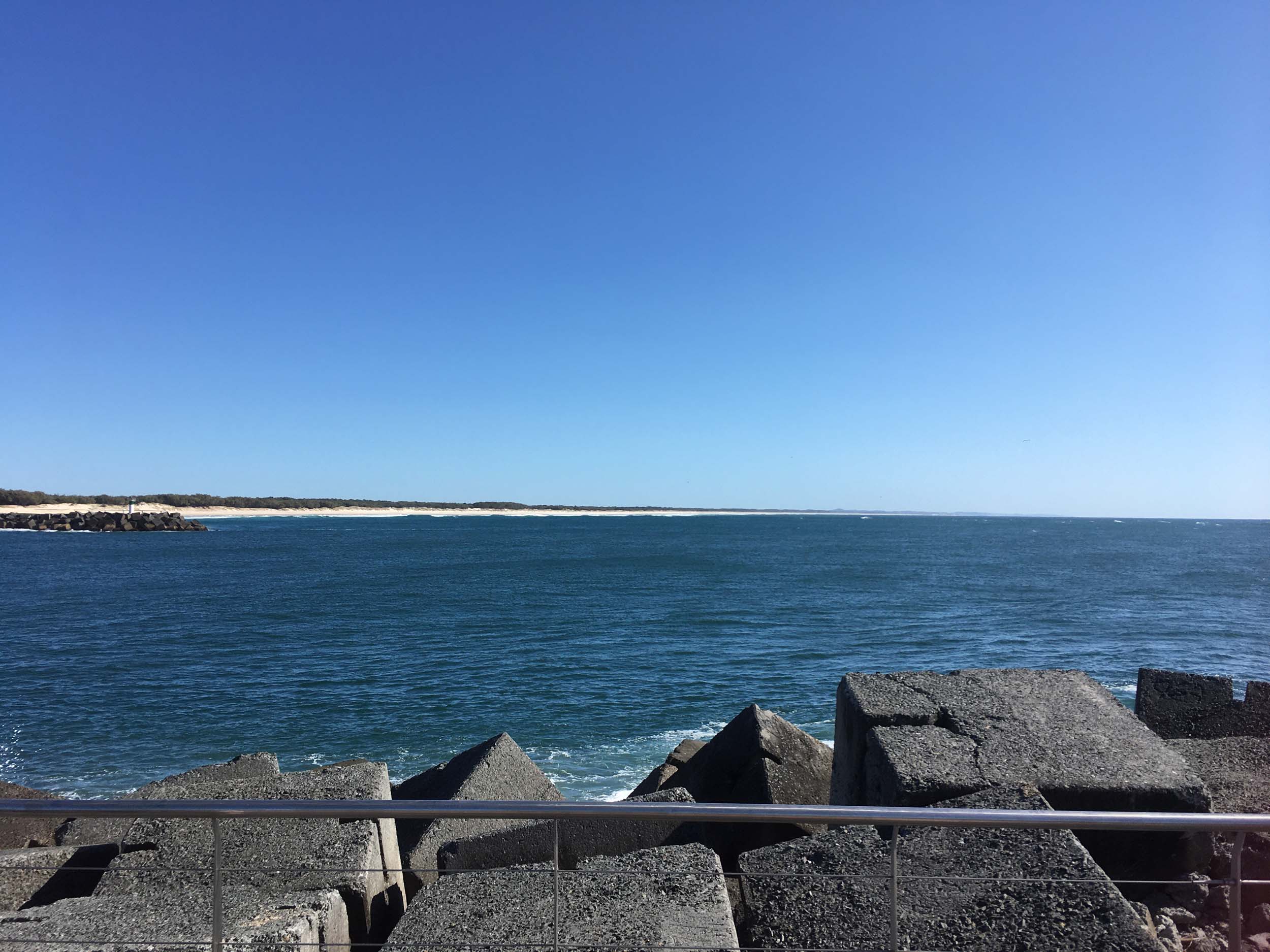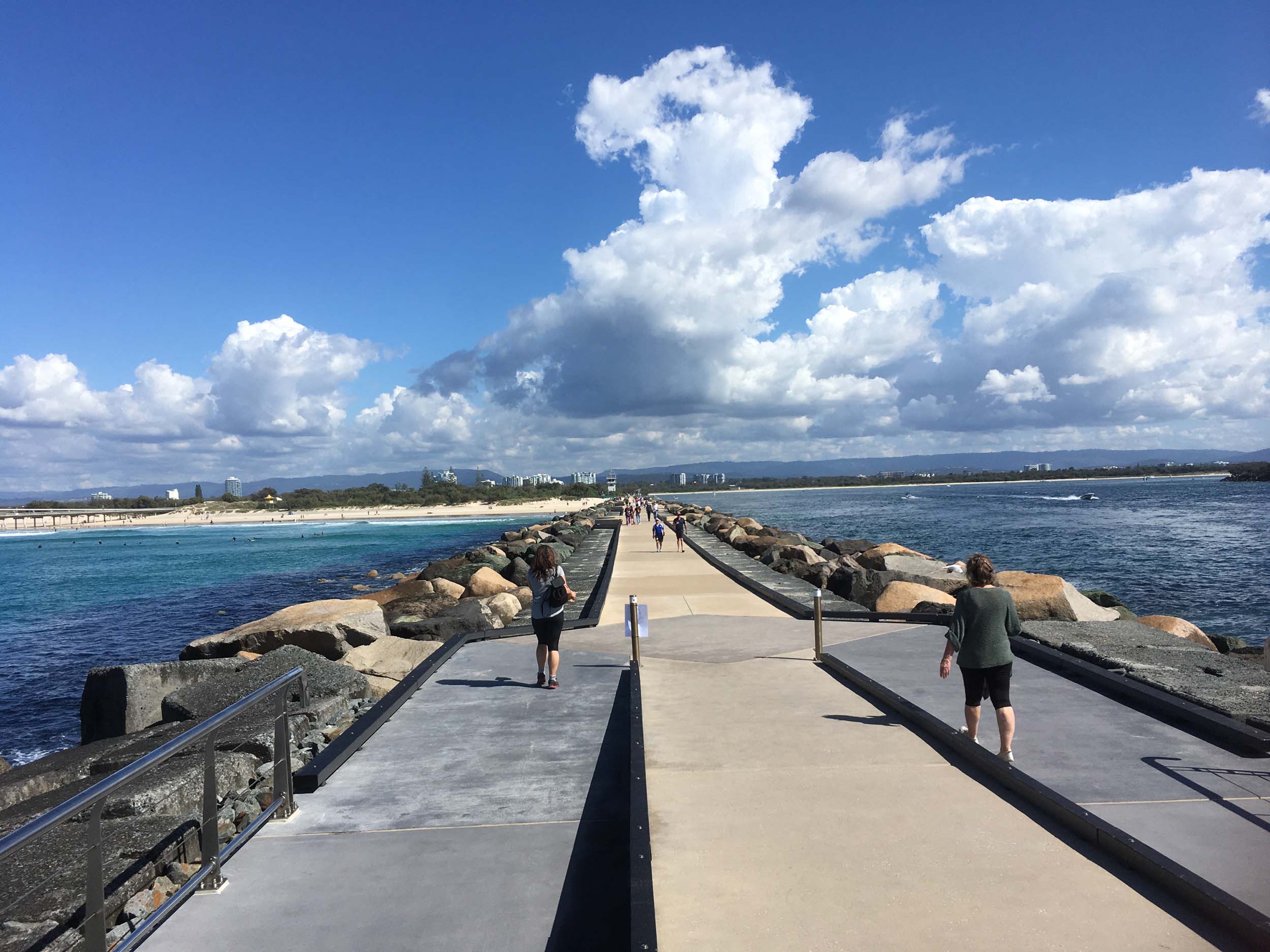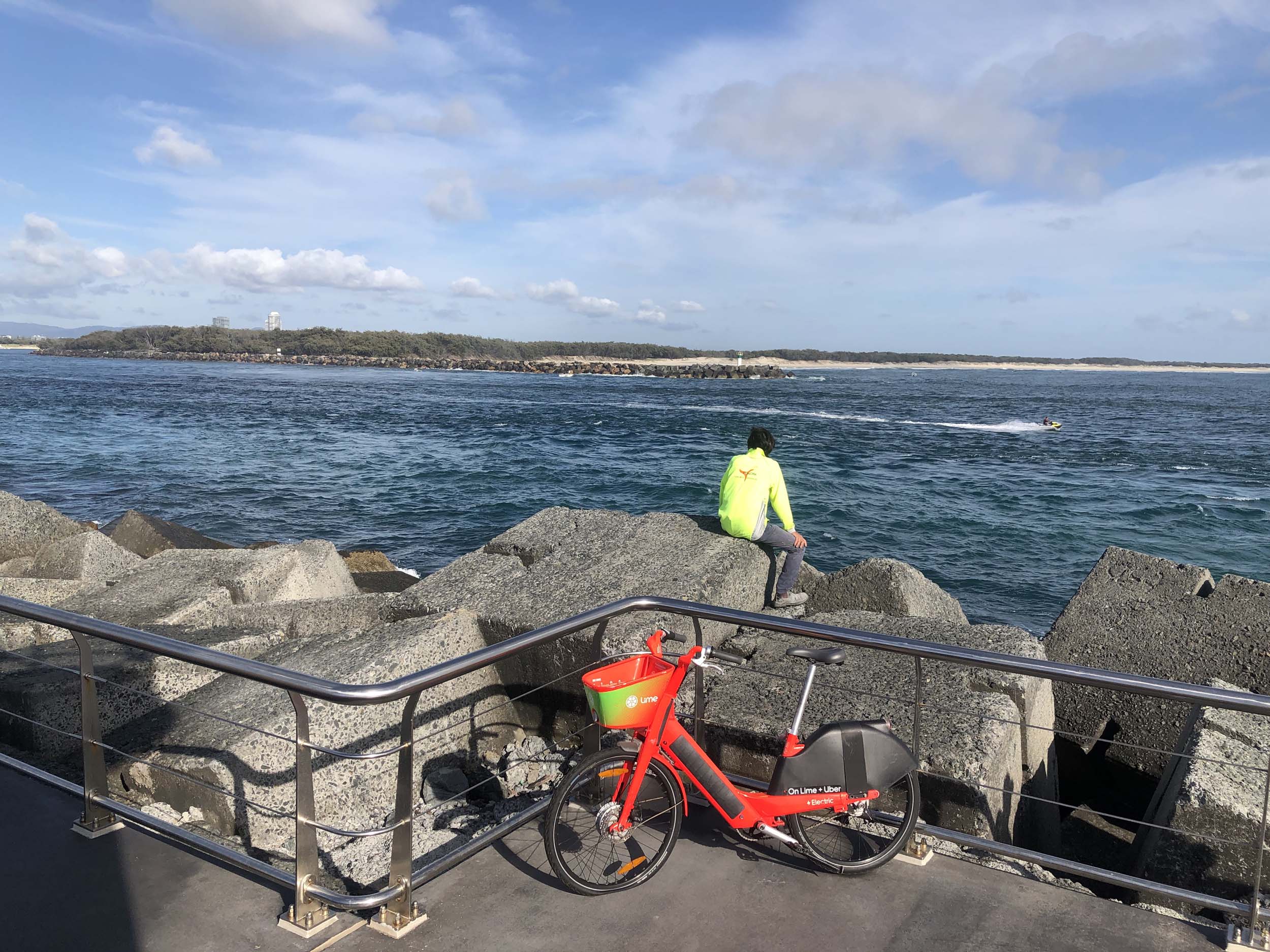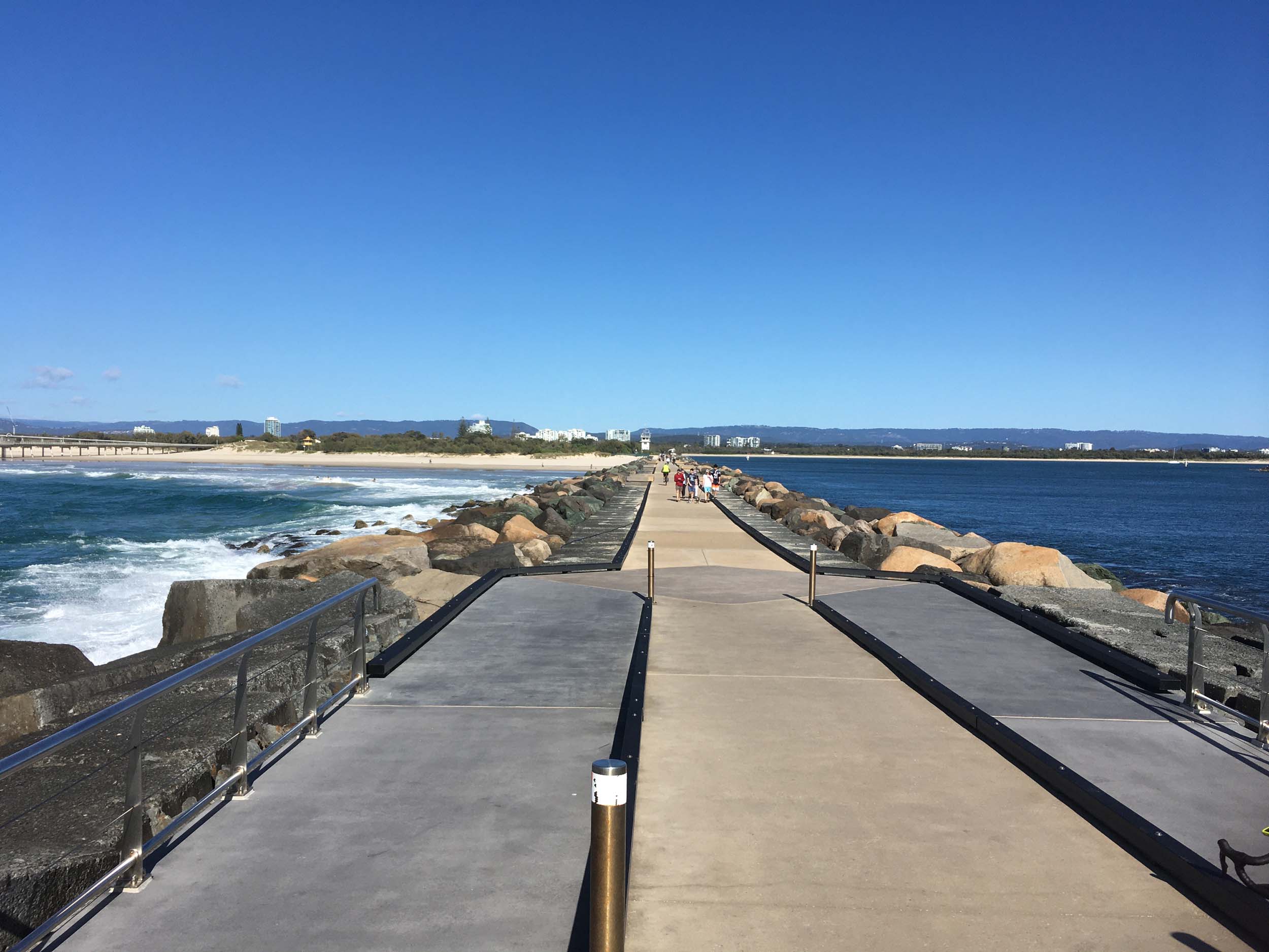 I continued to the Seaway via the Federation Walk. Rode to the tip of the Moondarewa Spit, then out to the tip of the Seawall/Spit. I noticed the Seaworld Resue boat motoring in the mouth of the Seaway but didn't appear to be doing anything. Noone was in the water etc. Then rode back to the tip of the Moondarewa Spit then back to the tip of the Seawall/Spit. Took a few photos at the end of both Spits, sat and ate my banana.