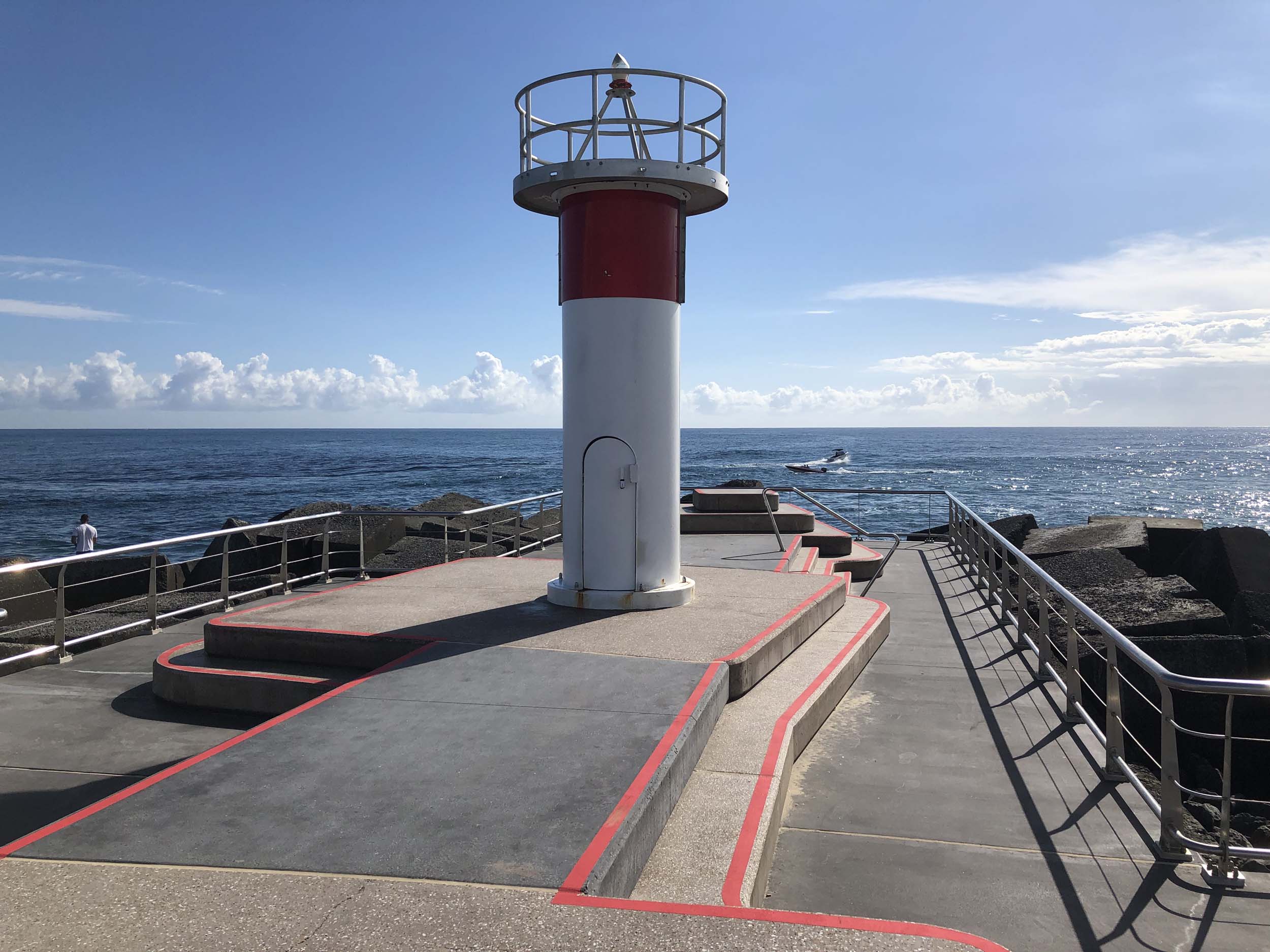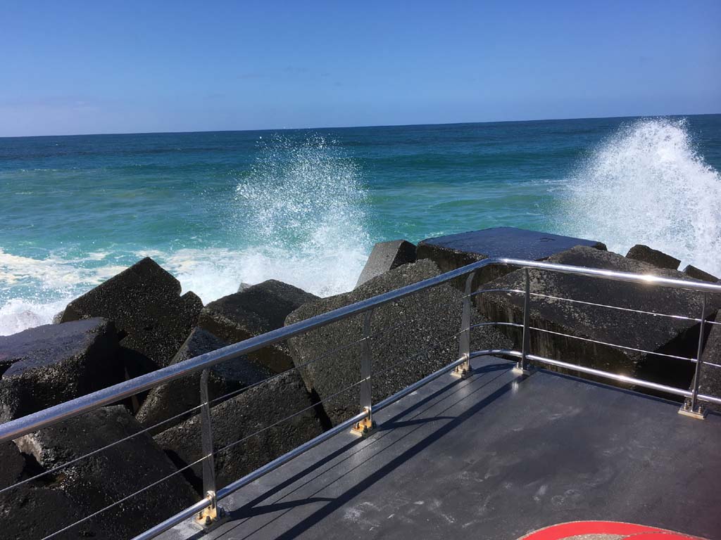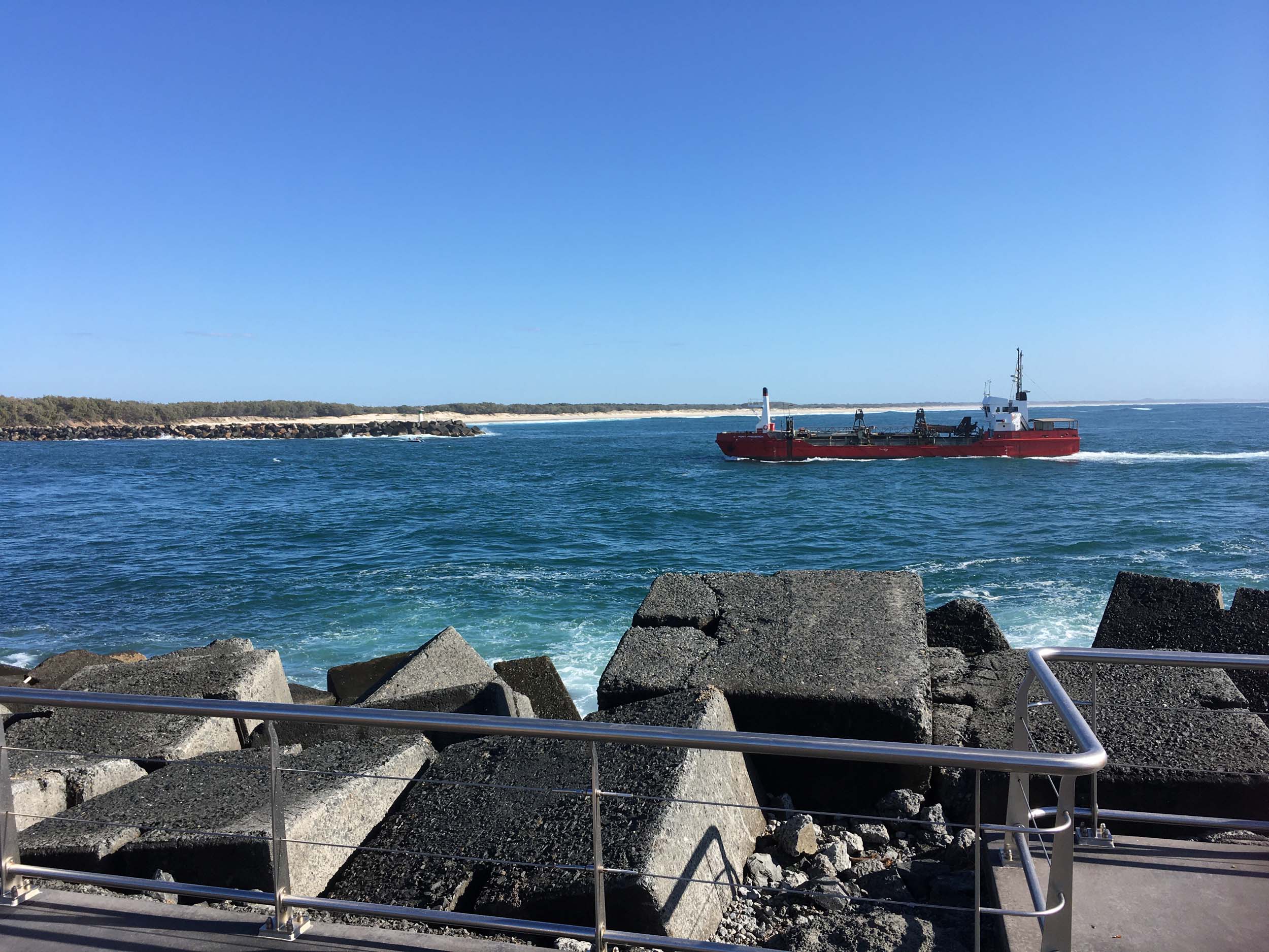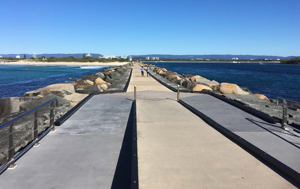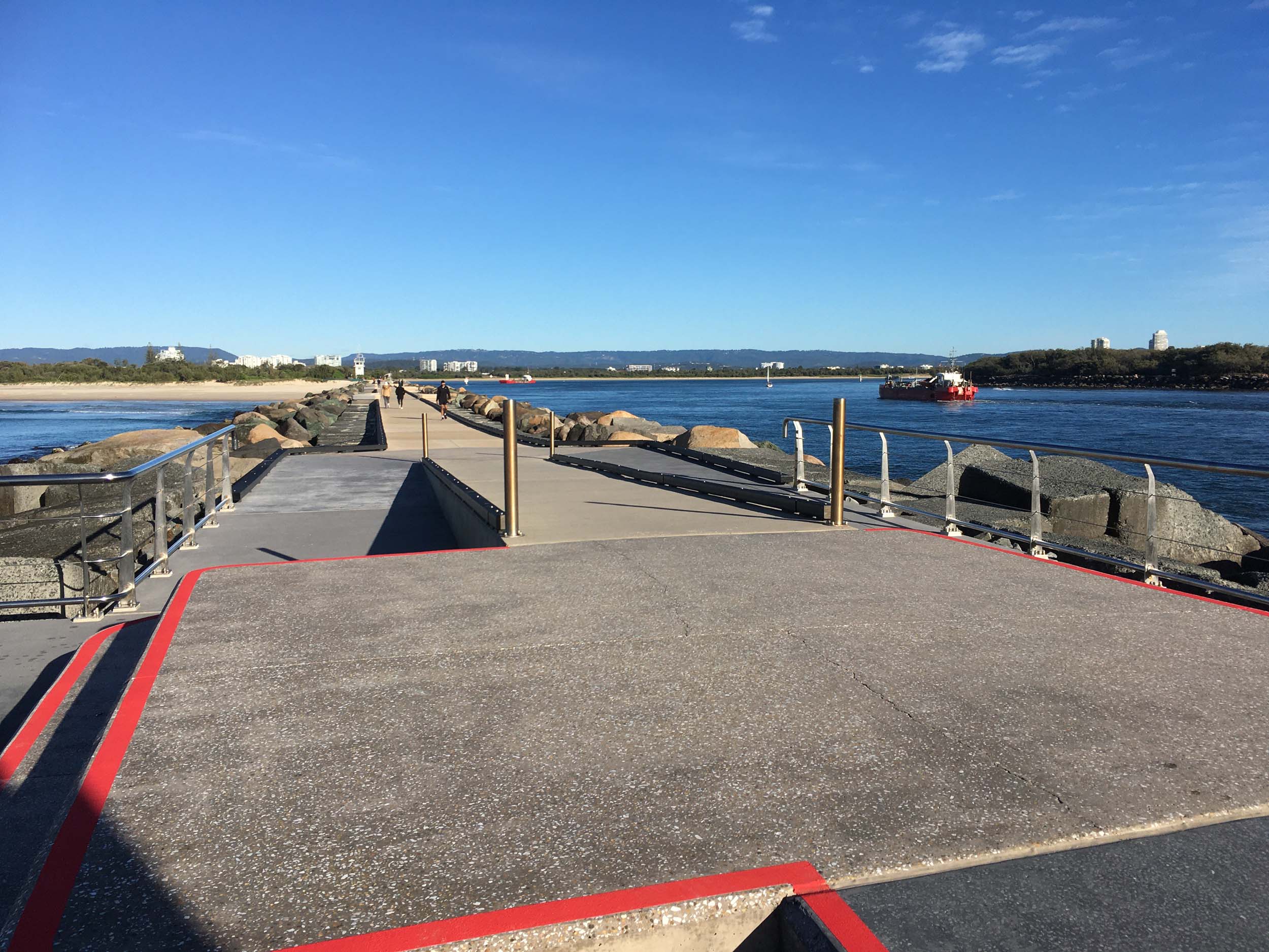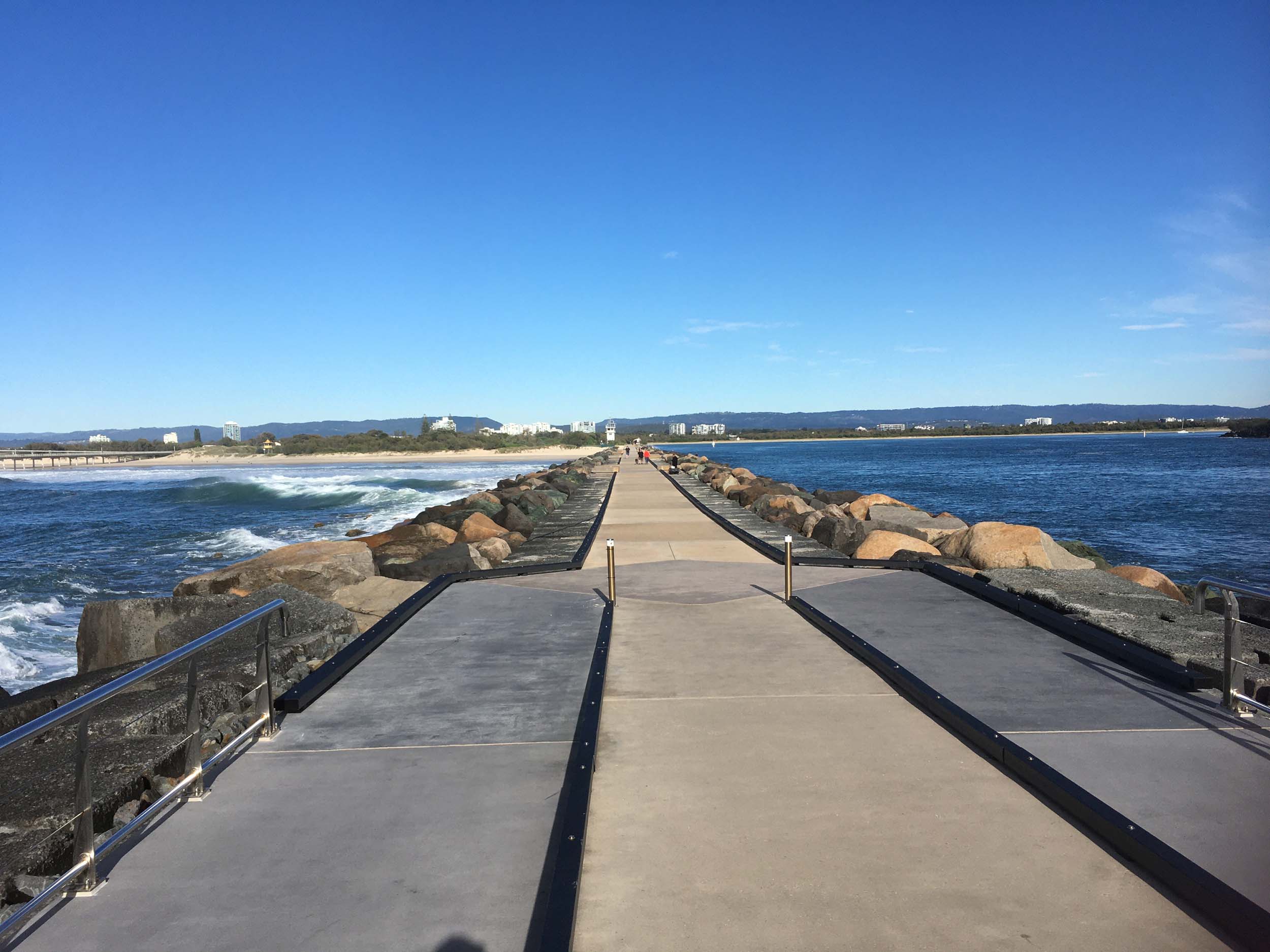 I continued to the Seaway via the Federation Walk. Rode to the tip of the Moondarewa Spit, then out to the tip of the Seawall/Spit. I noticed the Seaworld Resue boat motoring in the mouth of the Seaway but didn't appear to be doing anything. Noone was in the water etc. Then rode back to the tip of the Moondarewa Spit then back to the tip of the Seawall/Spit. Took a few photos at the end of both Spits, sat and ate my banana.