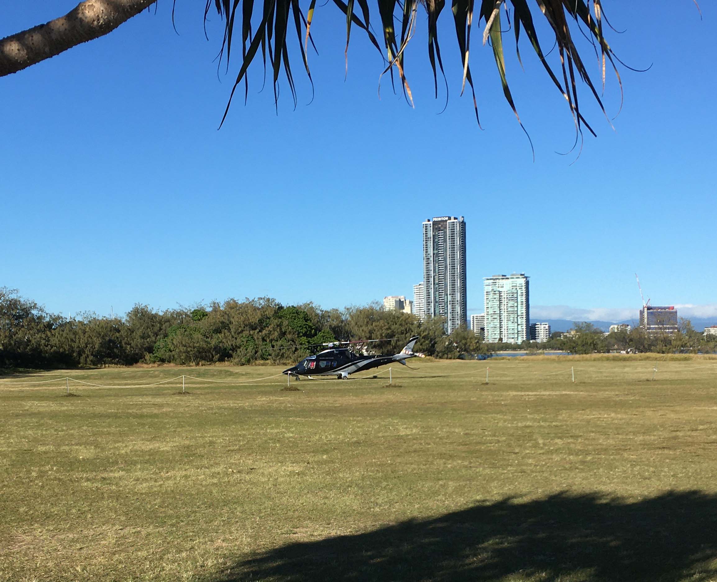 I rode through Muriel Henchman Park, then I rode along the bike path upto and through Seaworld's carpark. Noticed that a helicopter had landed in a paddock beside Seaworld. I assume that it was a privately owned helicopter, there was no advertising or names painted on it.