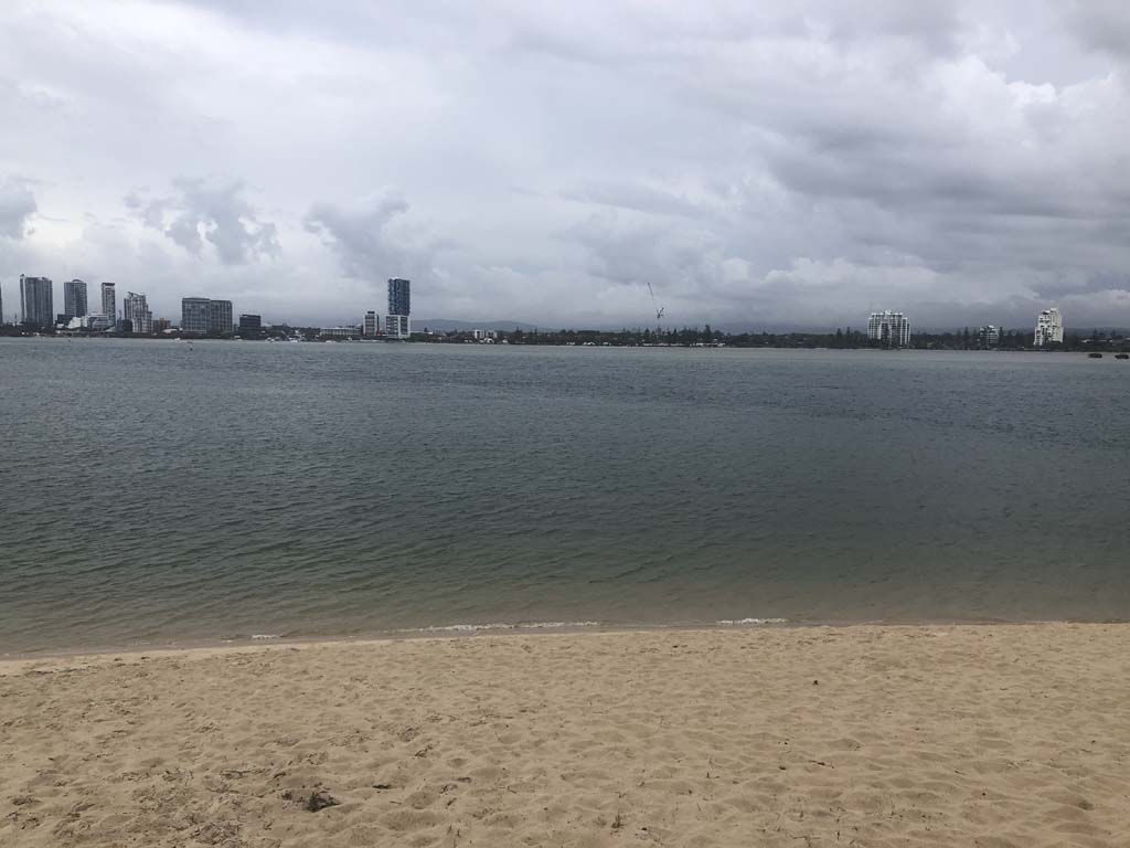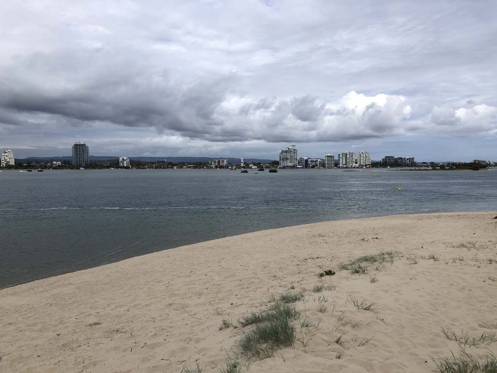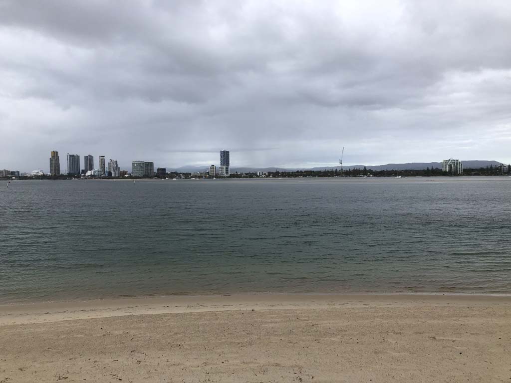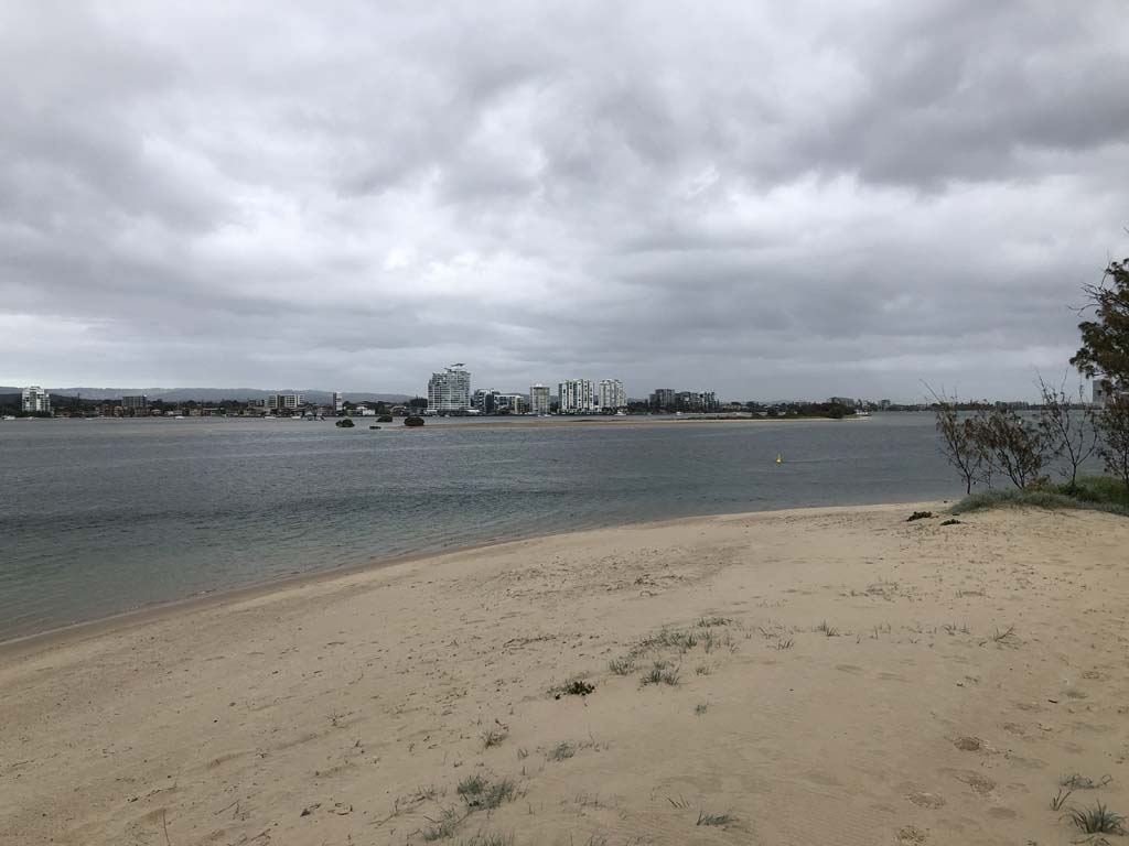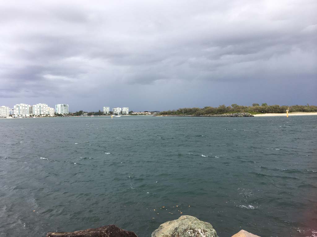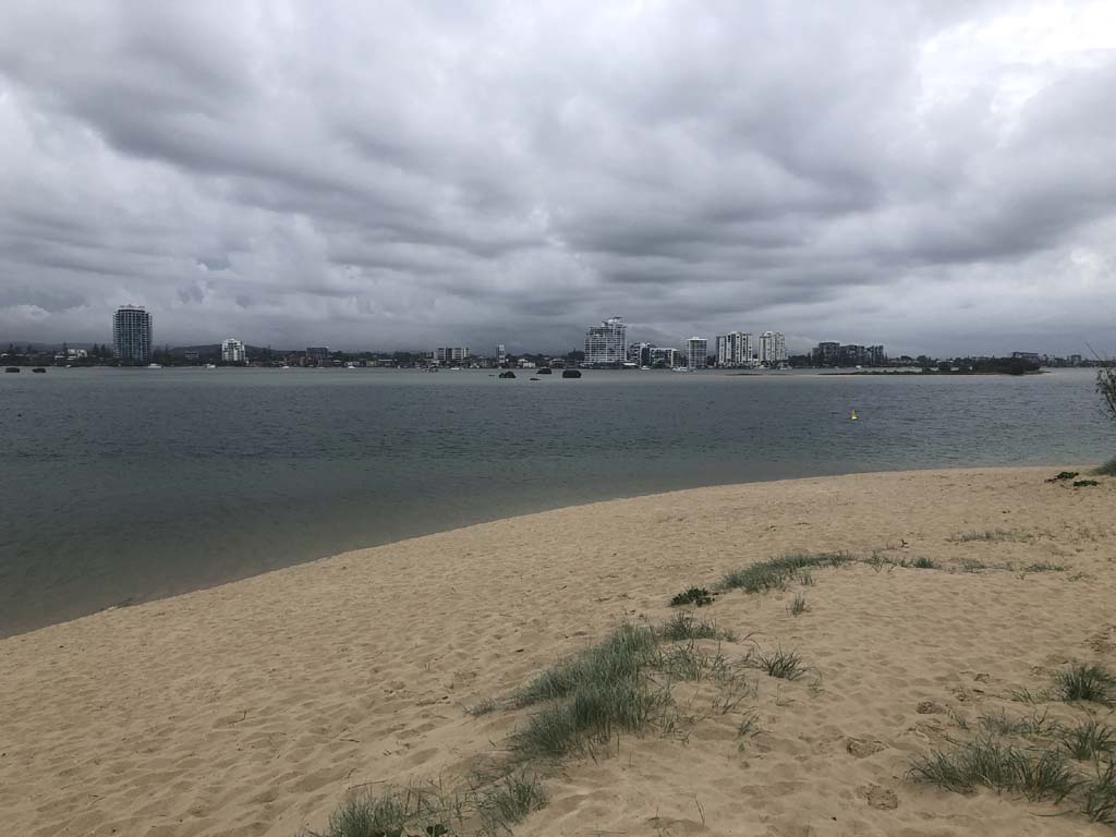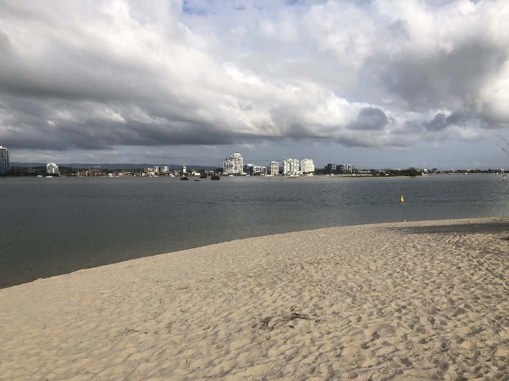 I left at 7:08am, the breeze was light from the South and building, the Broadwater had a light chop and looked like it would rain at any moment.