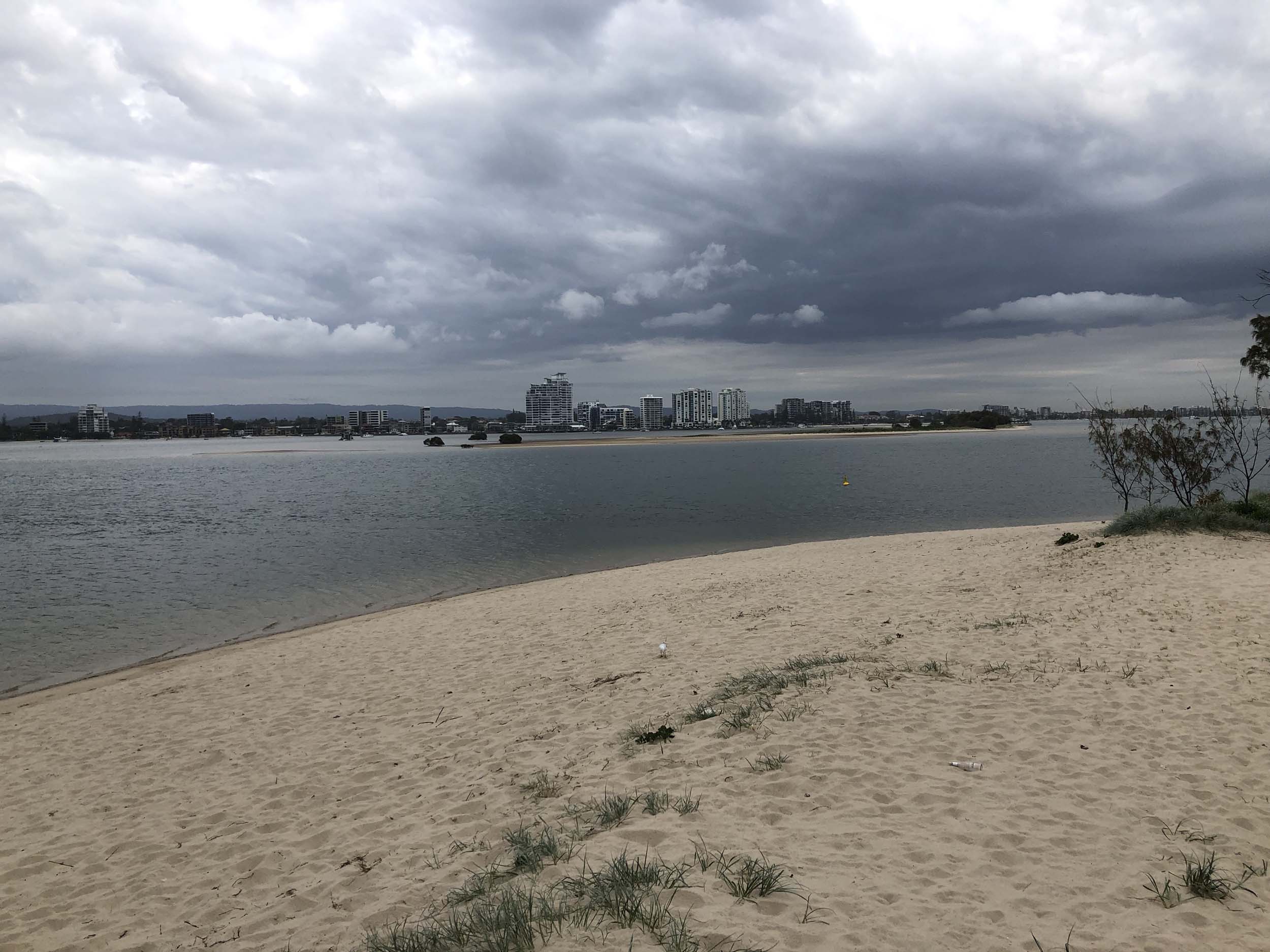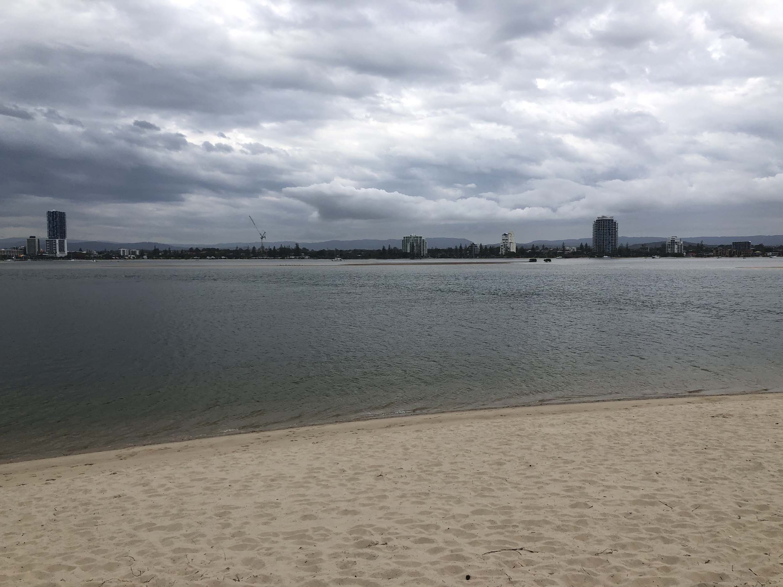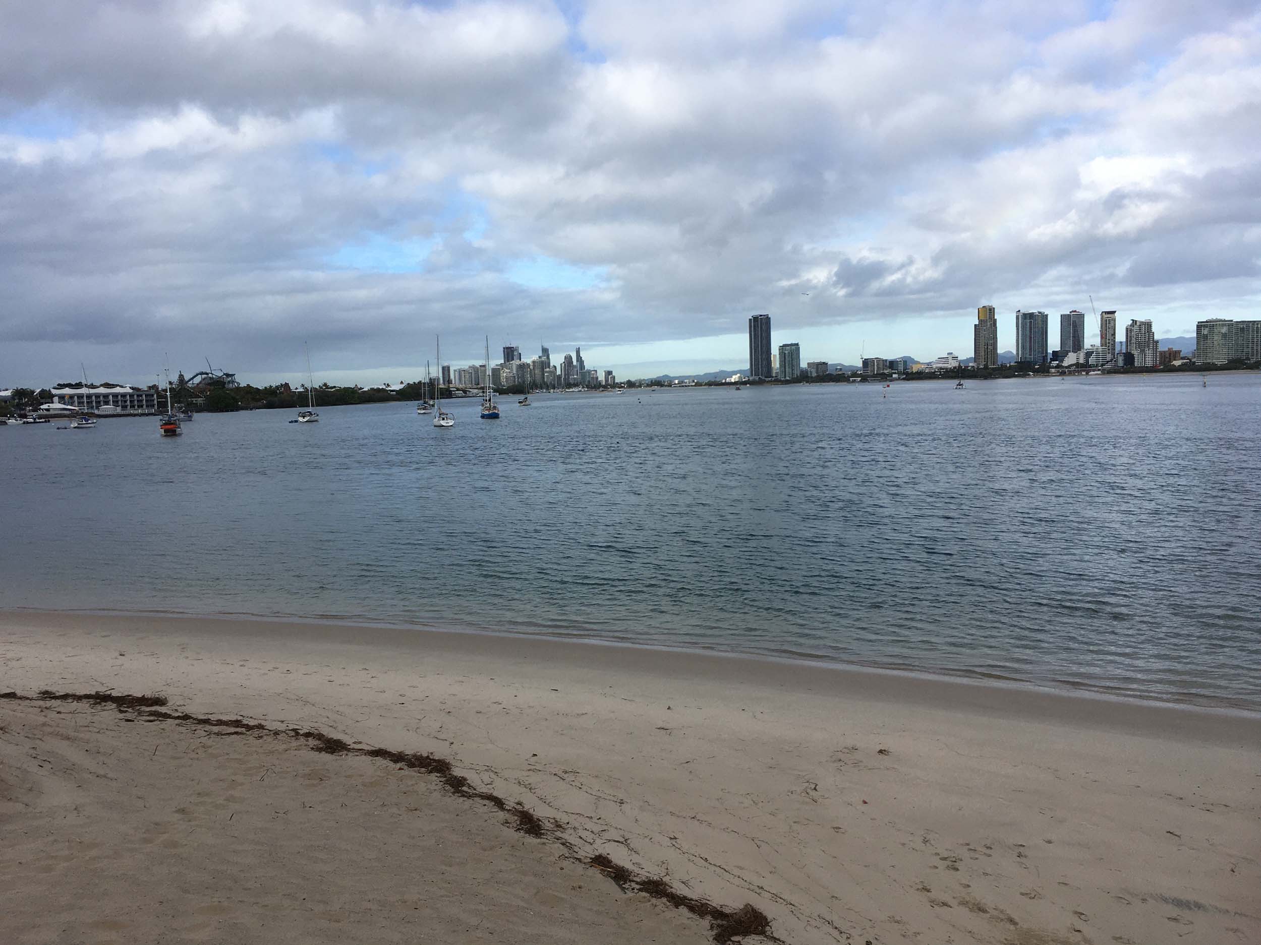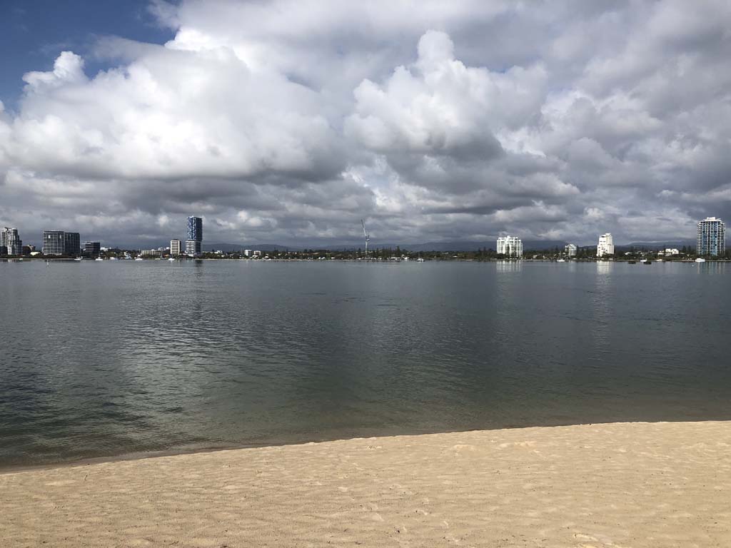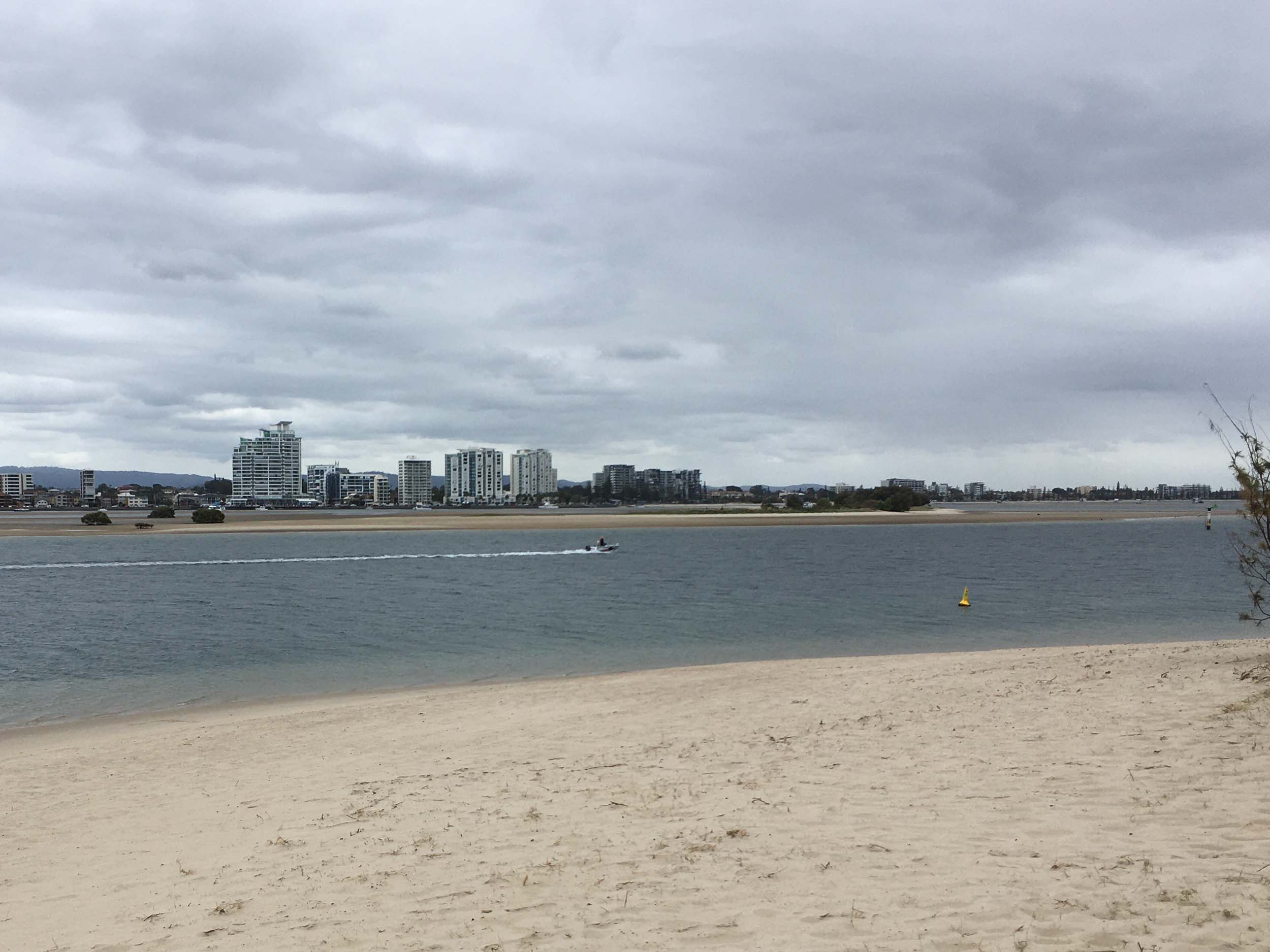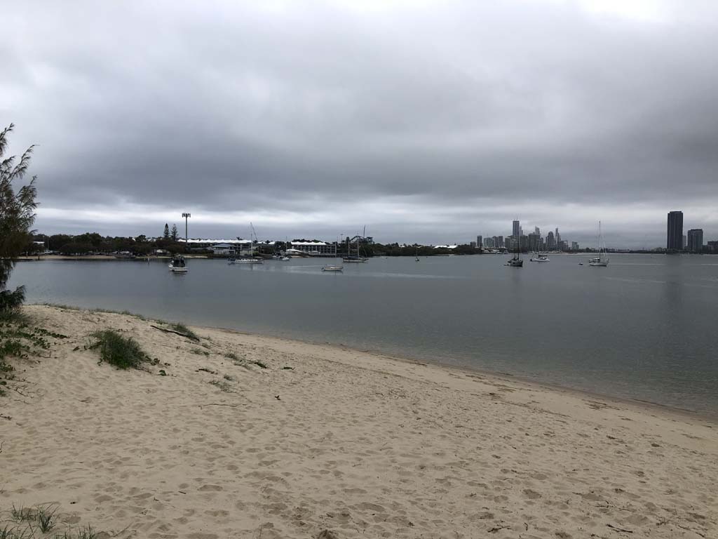 I left at 7:08am, the breeze was light from the South and building, the Broadwater had a light chop and looked like it would rain at any moment.