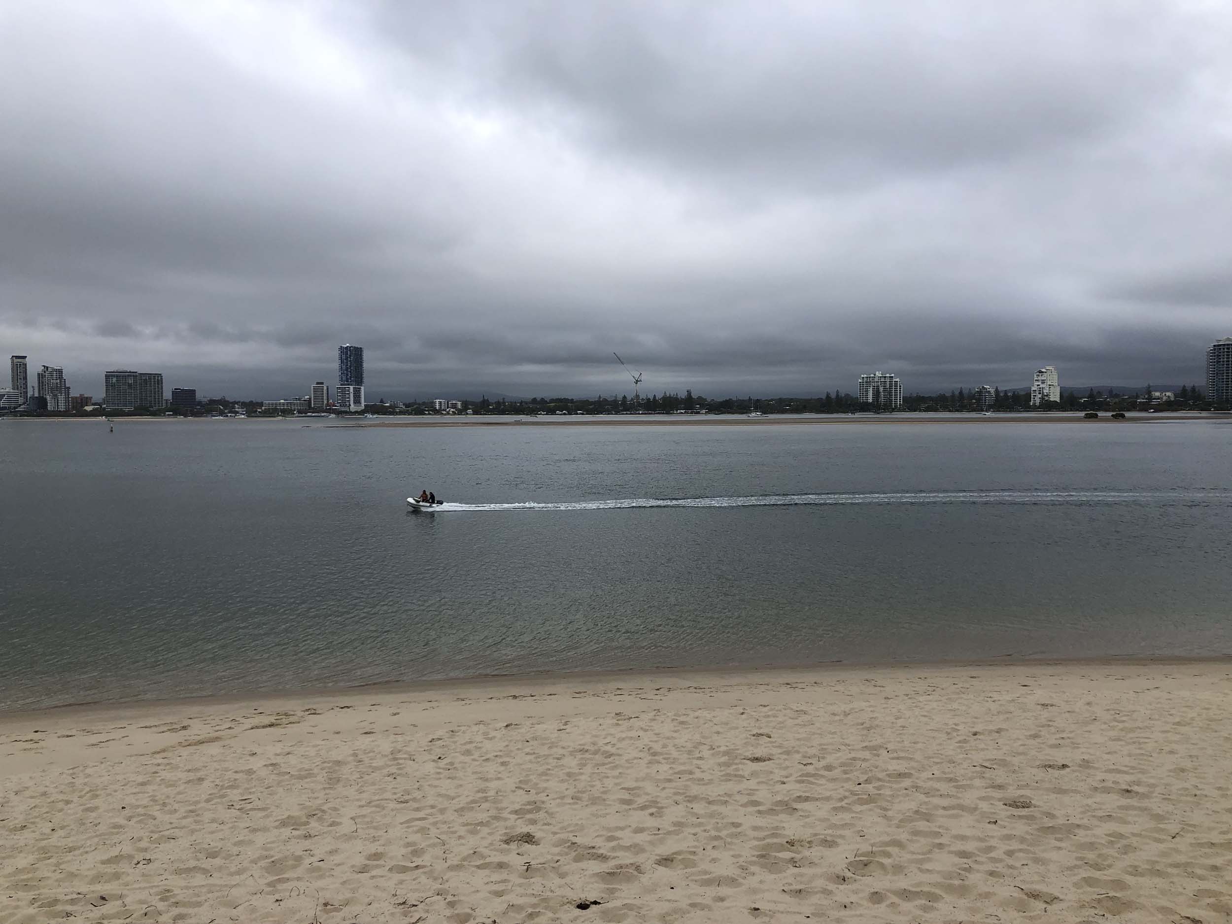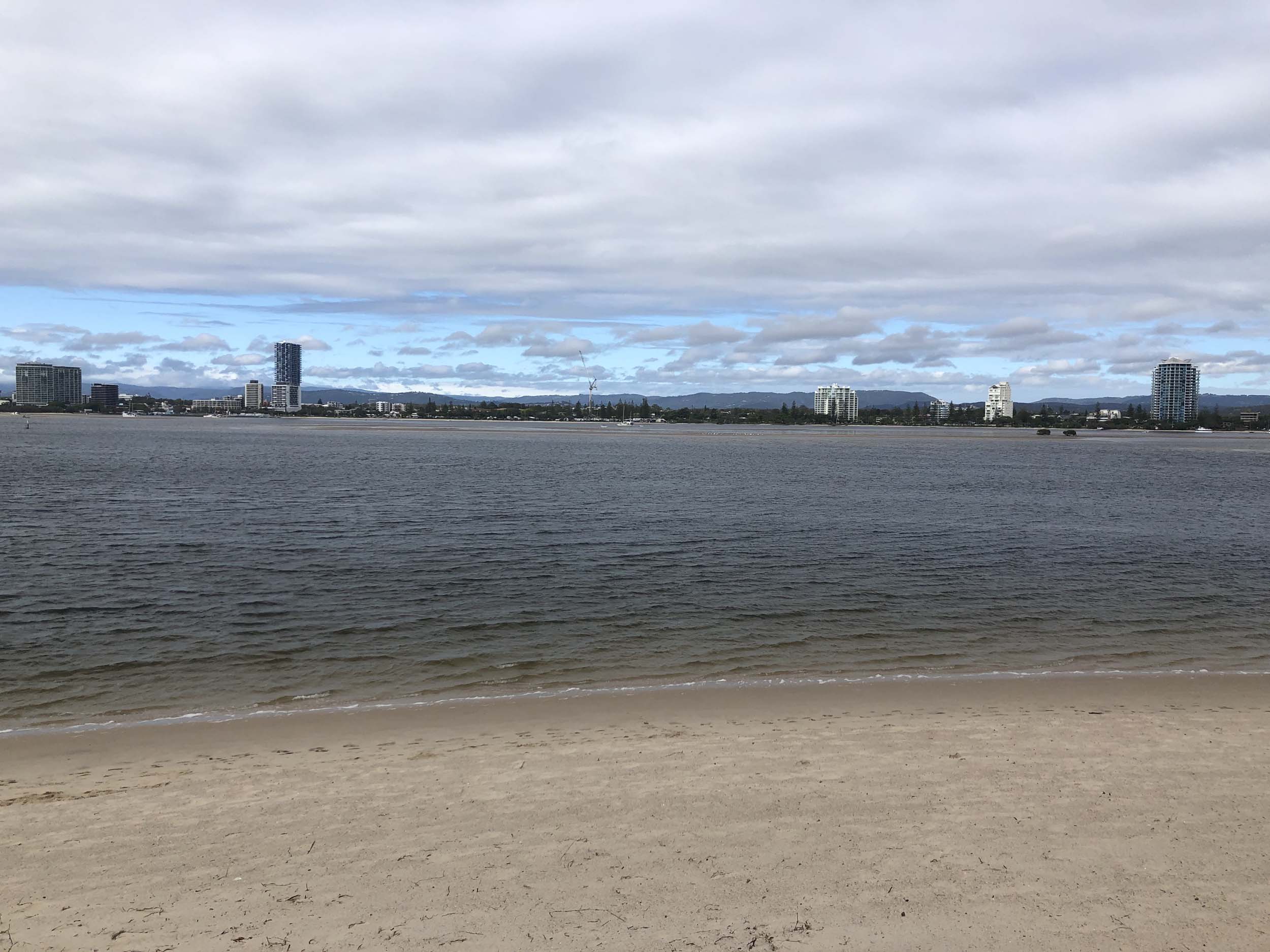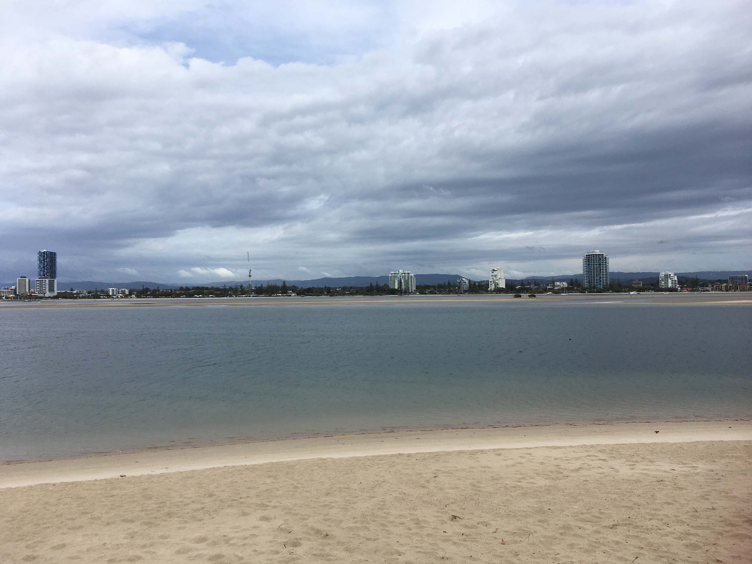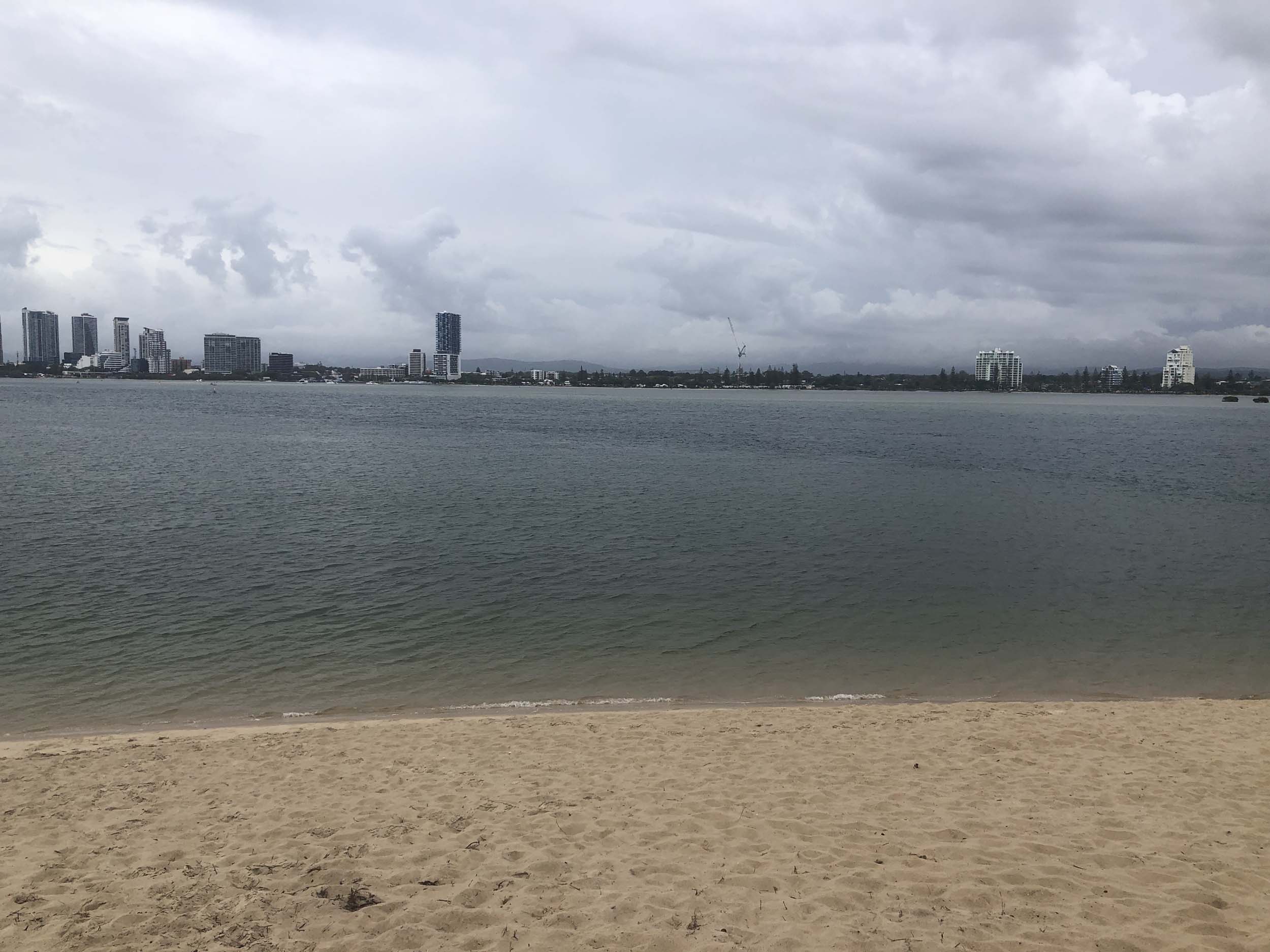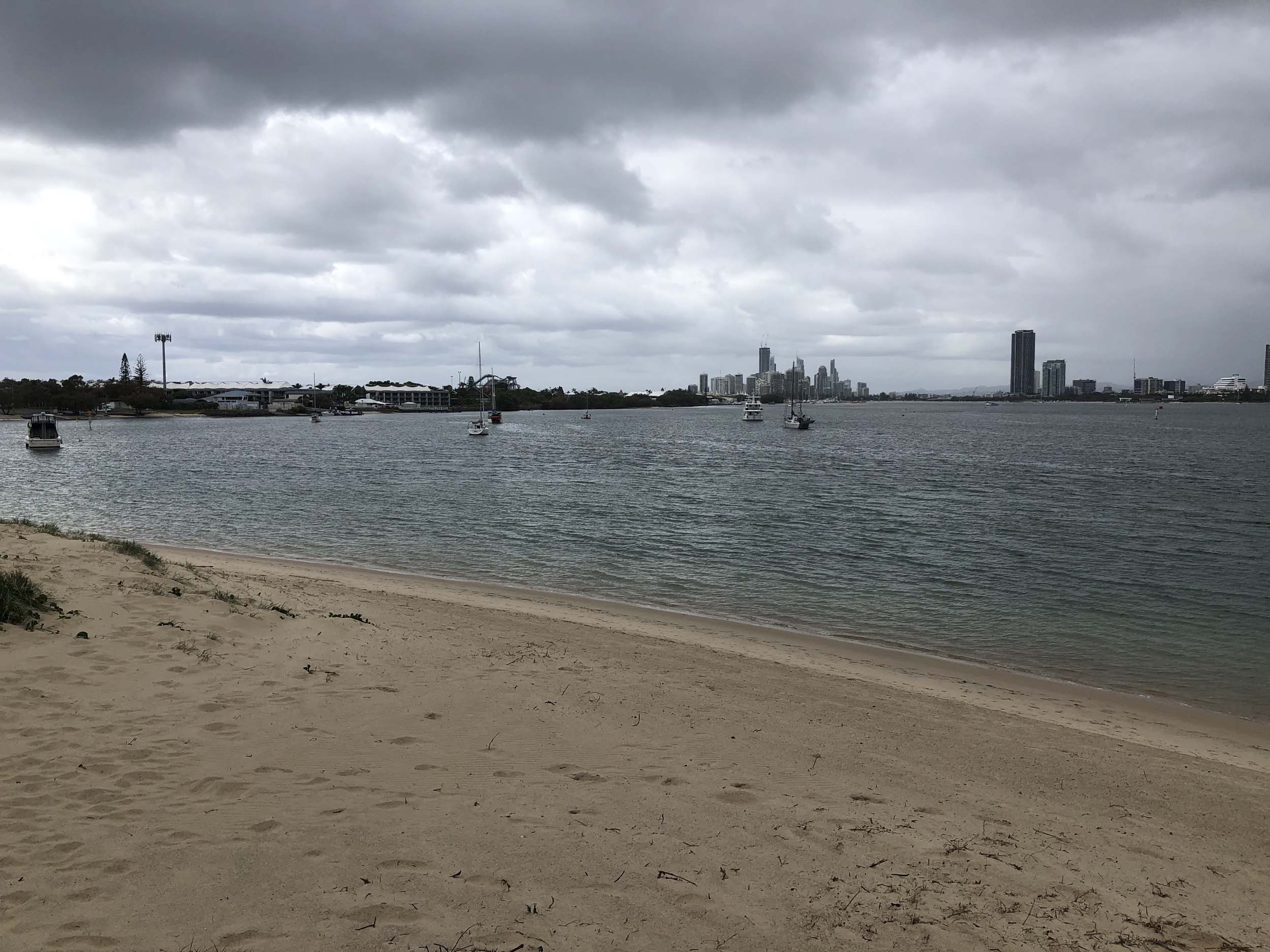 I left at 7:08am, the breeze was light from the South and building, the Broadwater had a light chop and looked like it would rain at any moment.