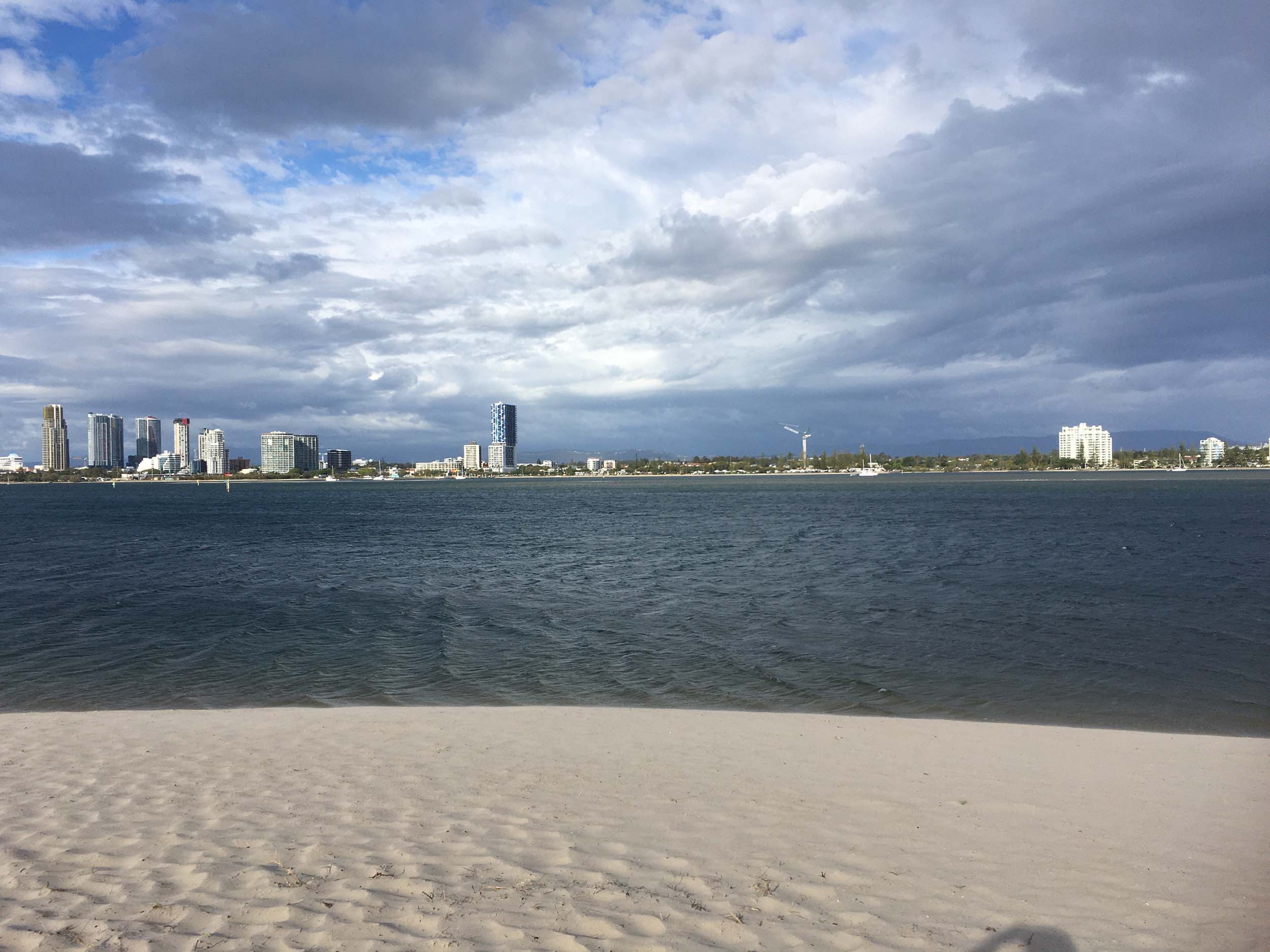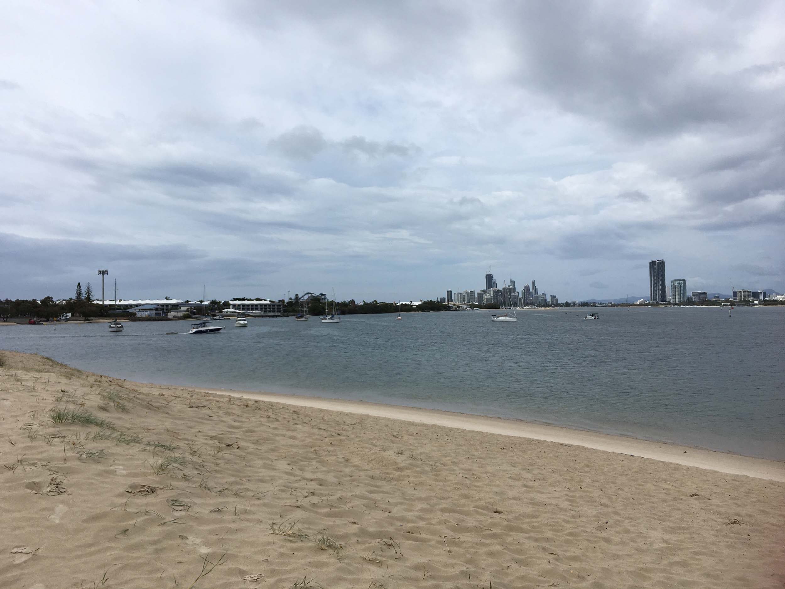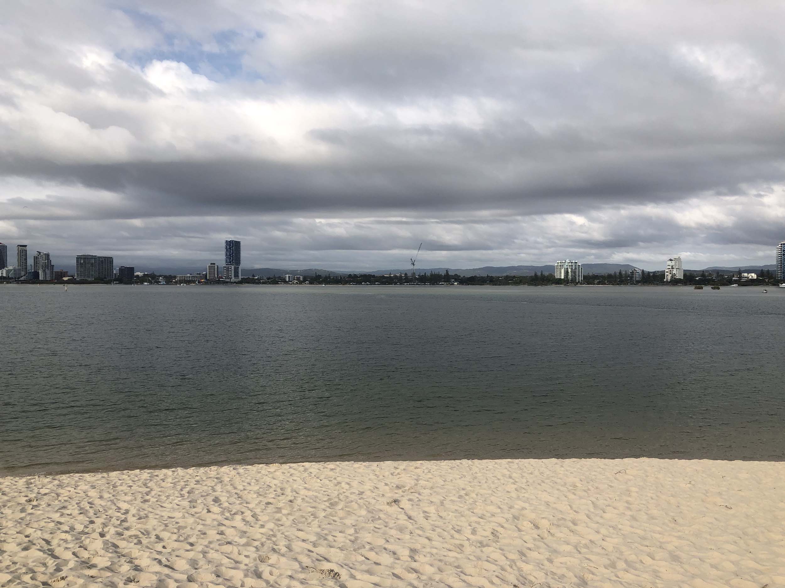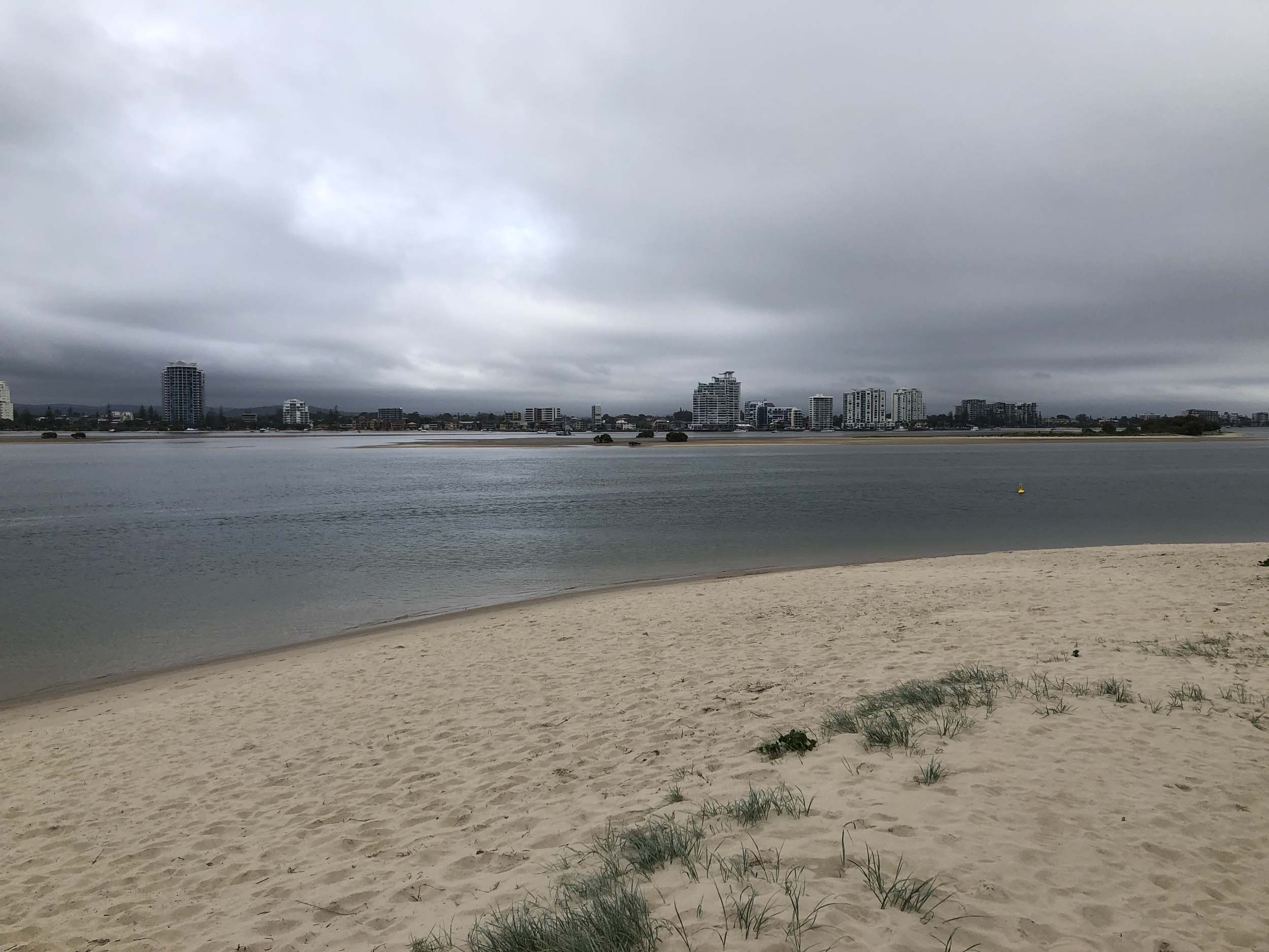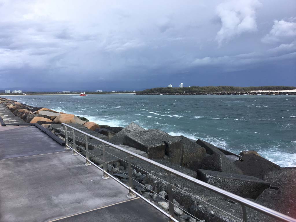 I left at 7:08am, the breeze was light from the South and building, the Broadwater had a light chop and looked like it would rain at any moment.