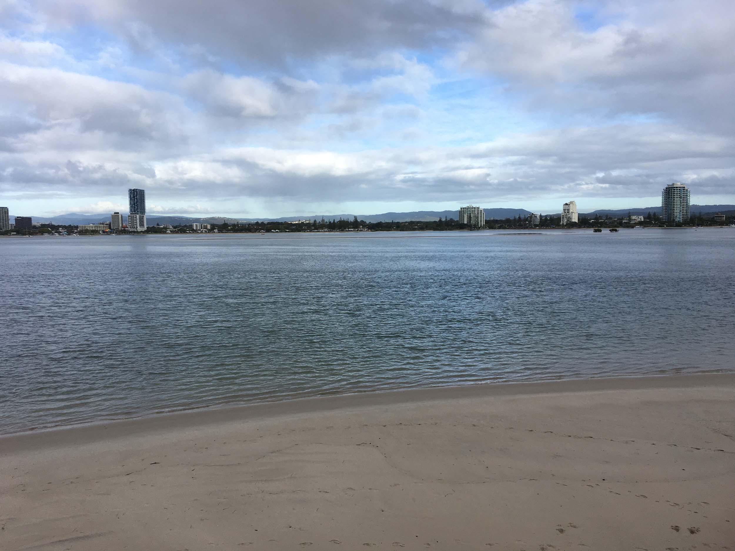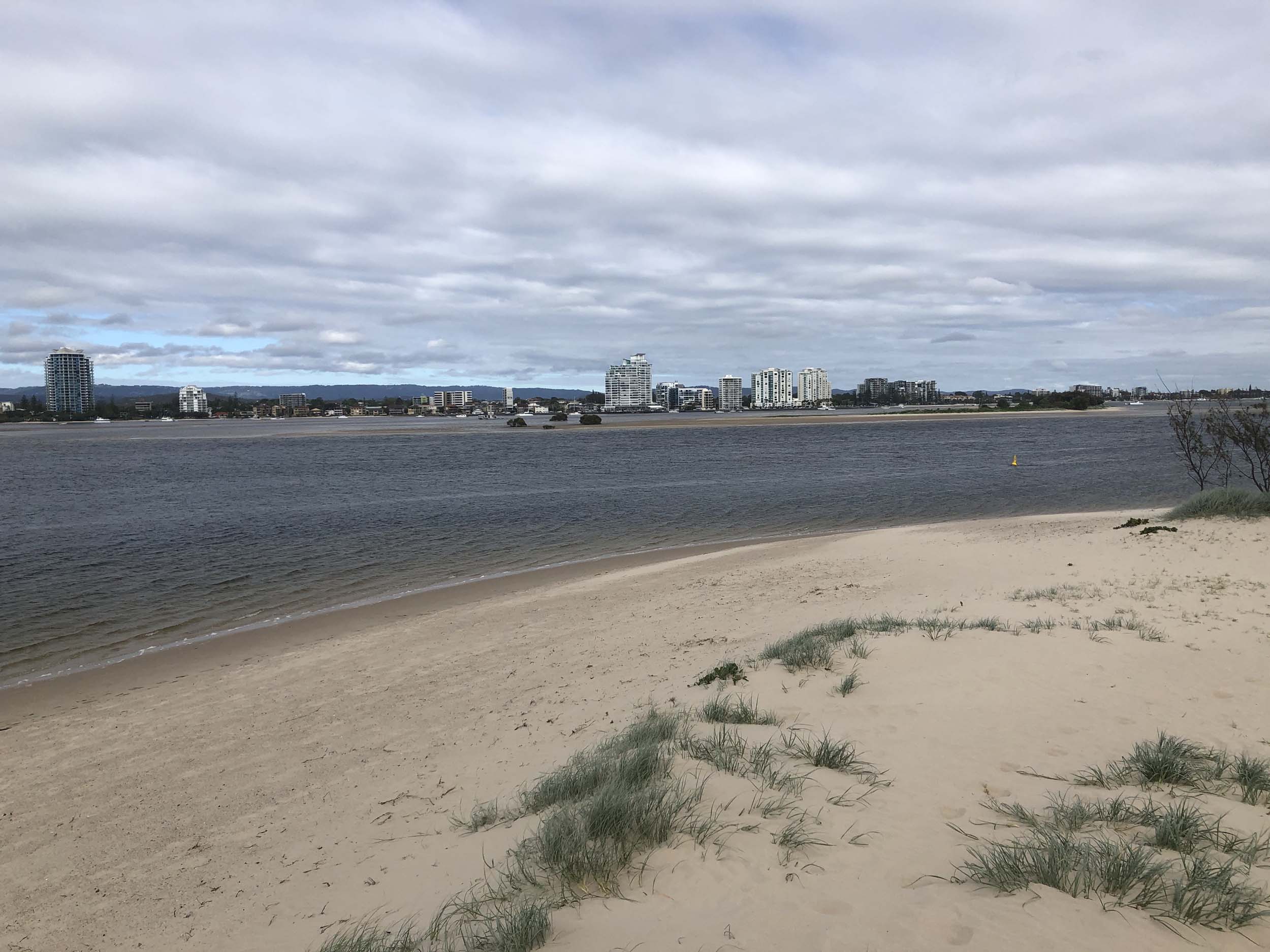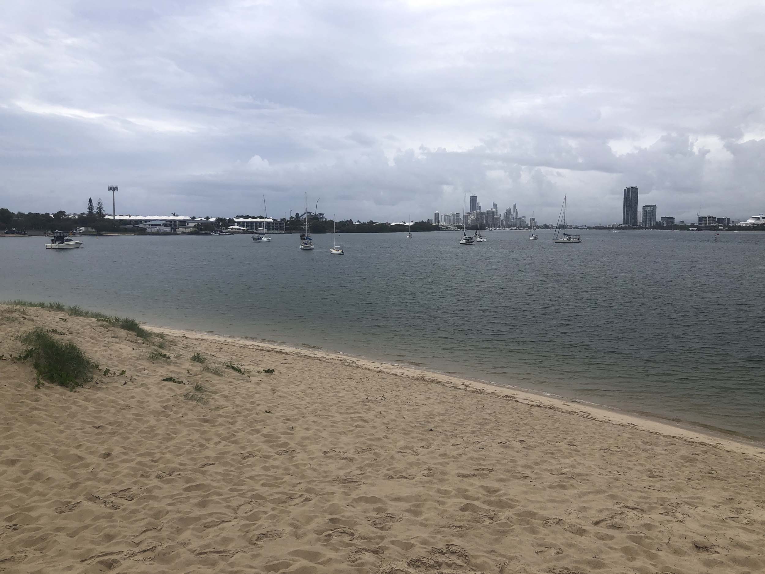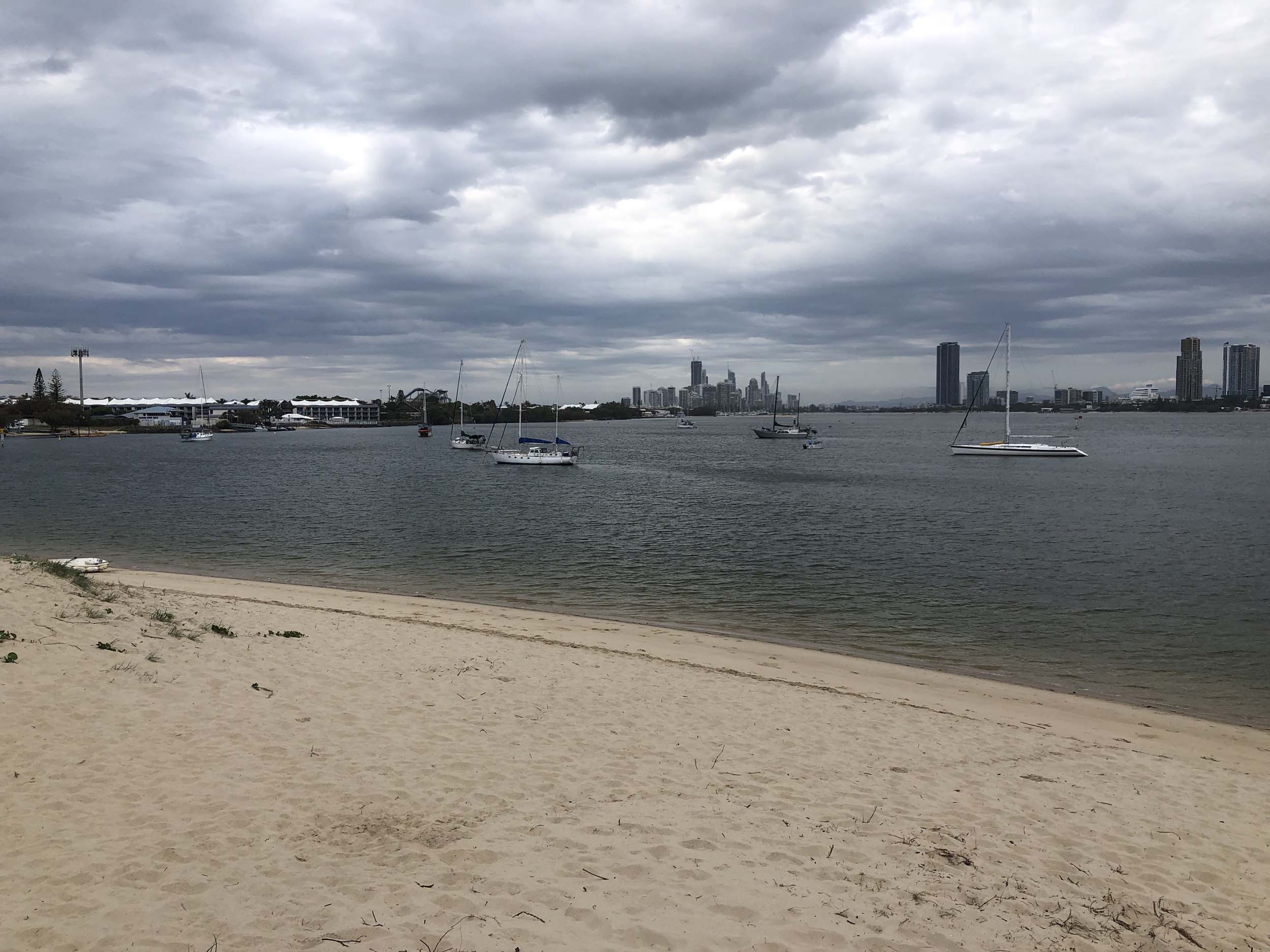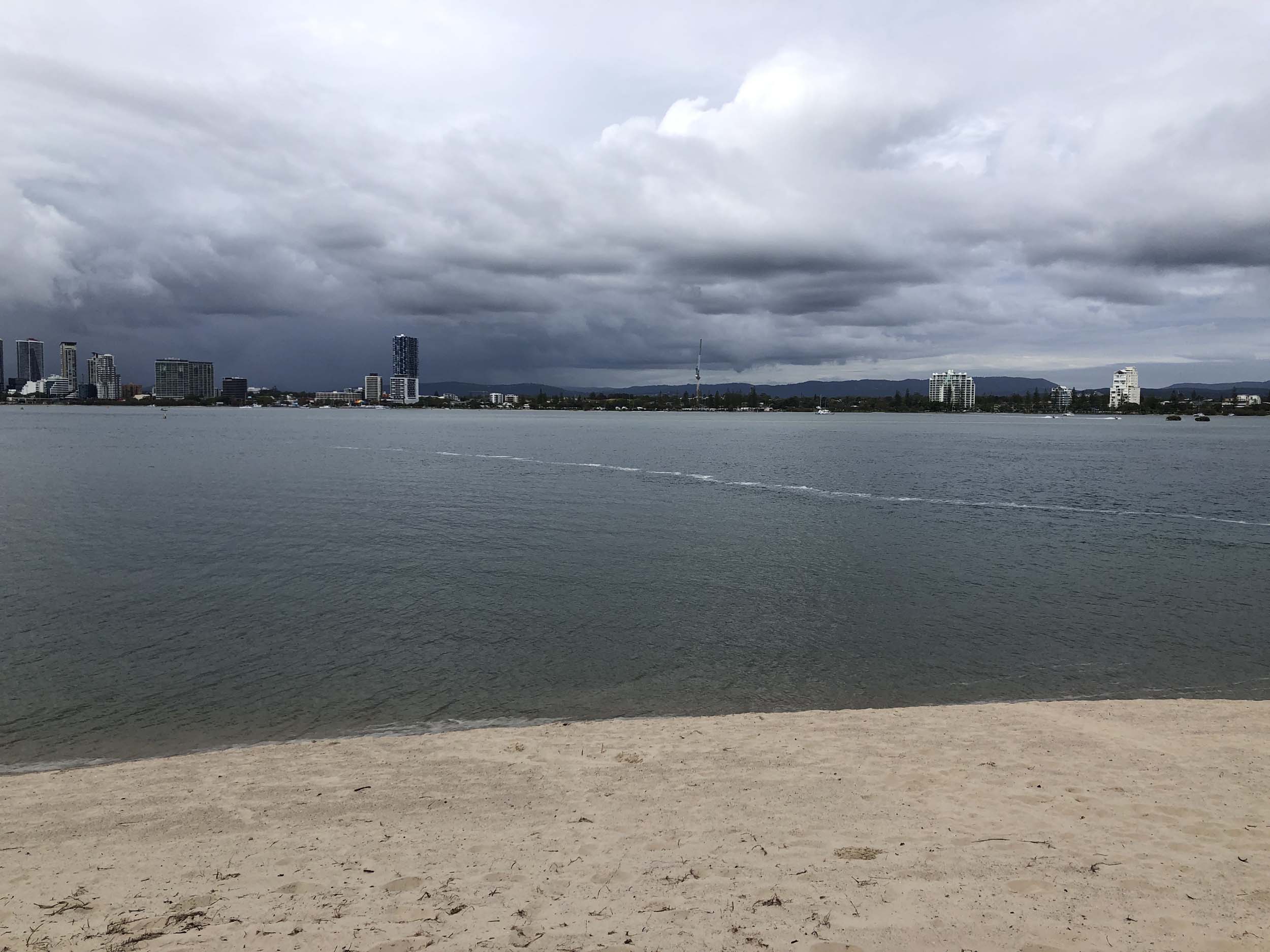 I left at 7:08am, the breeze was light from the South and building, the Broadwater had a light chop and looked like it would rain at any moment.