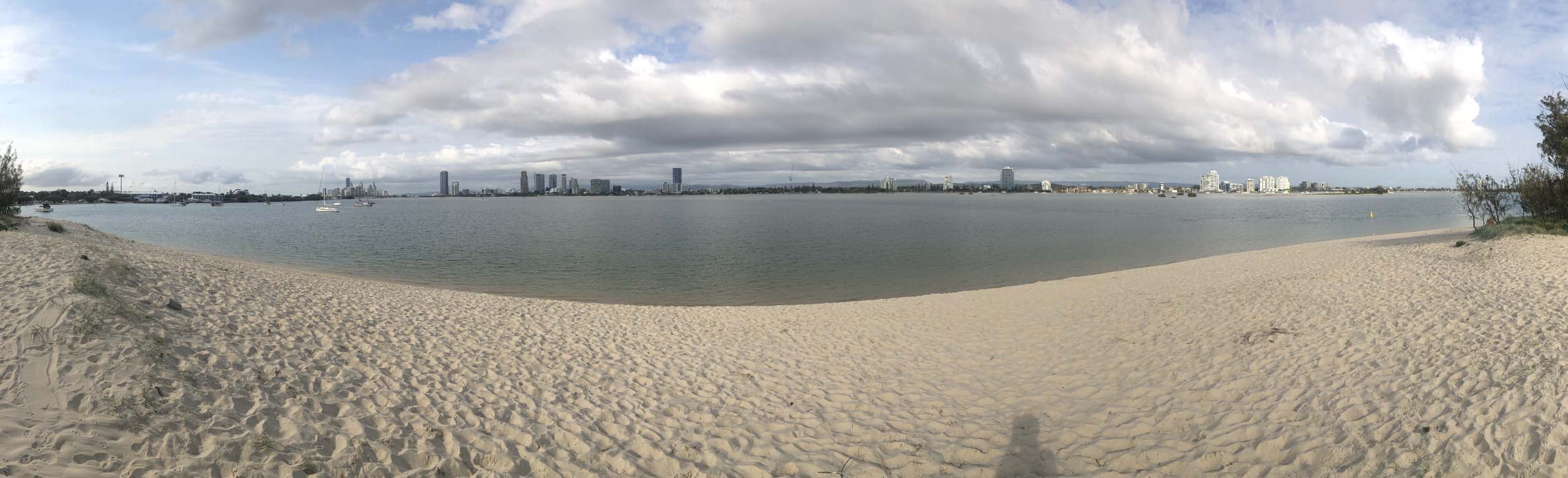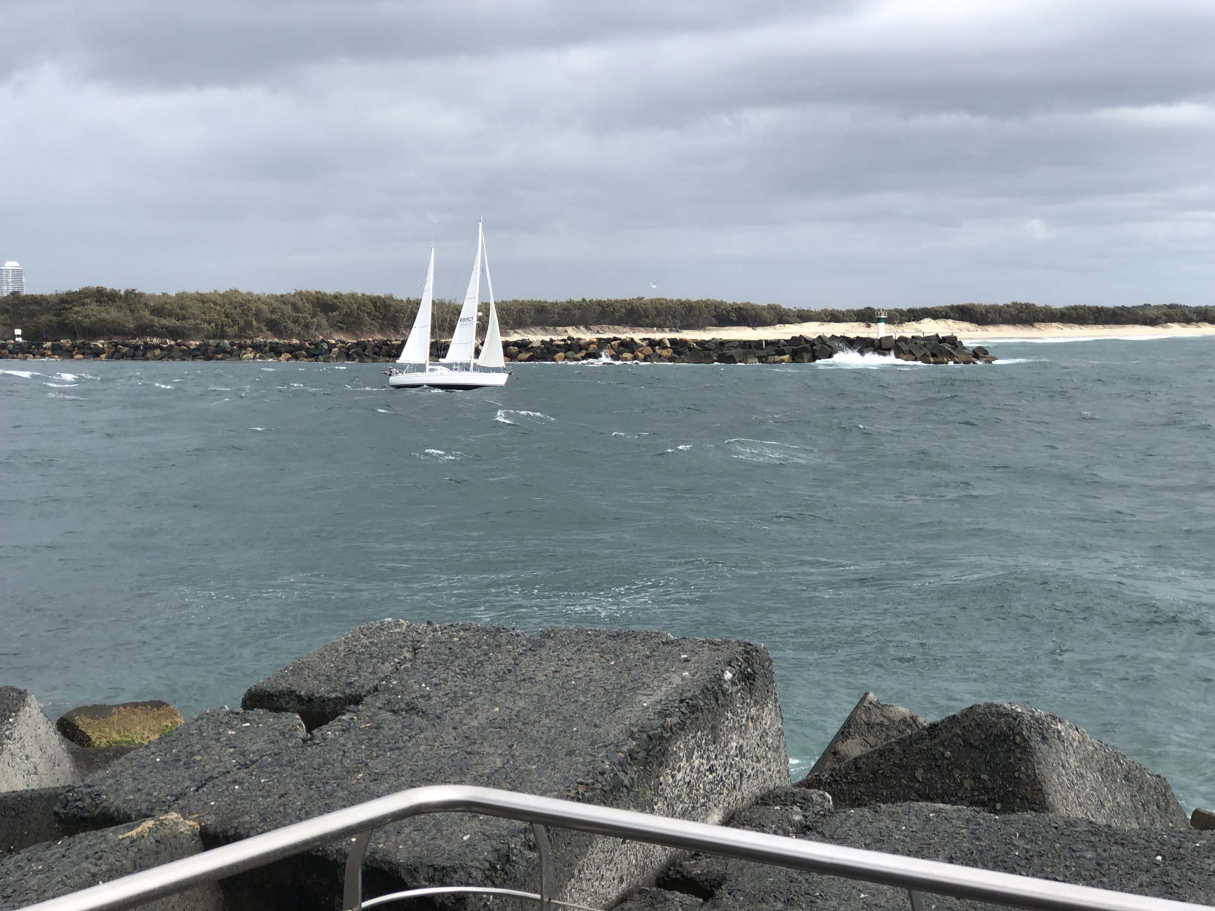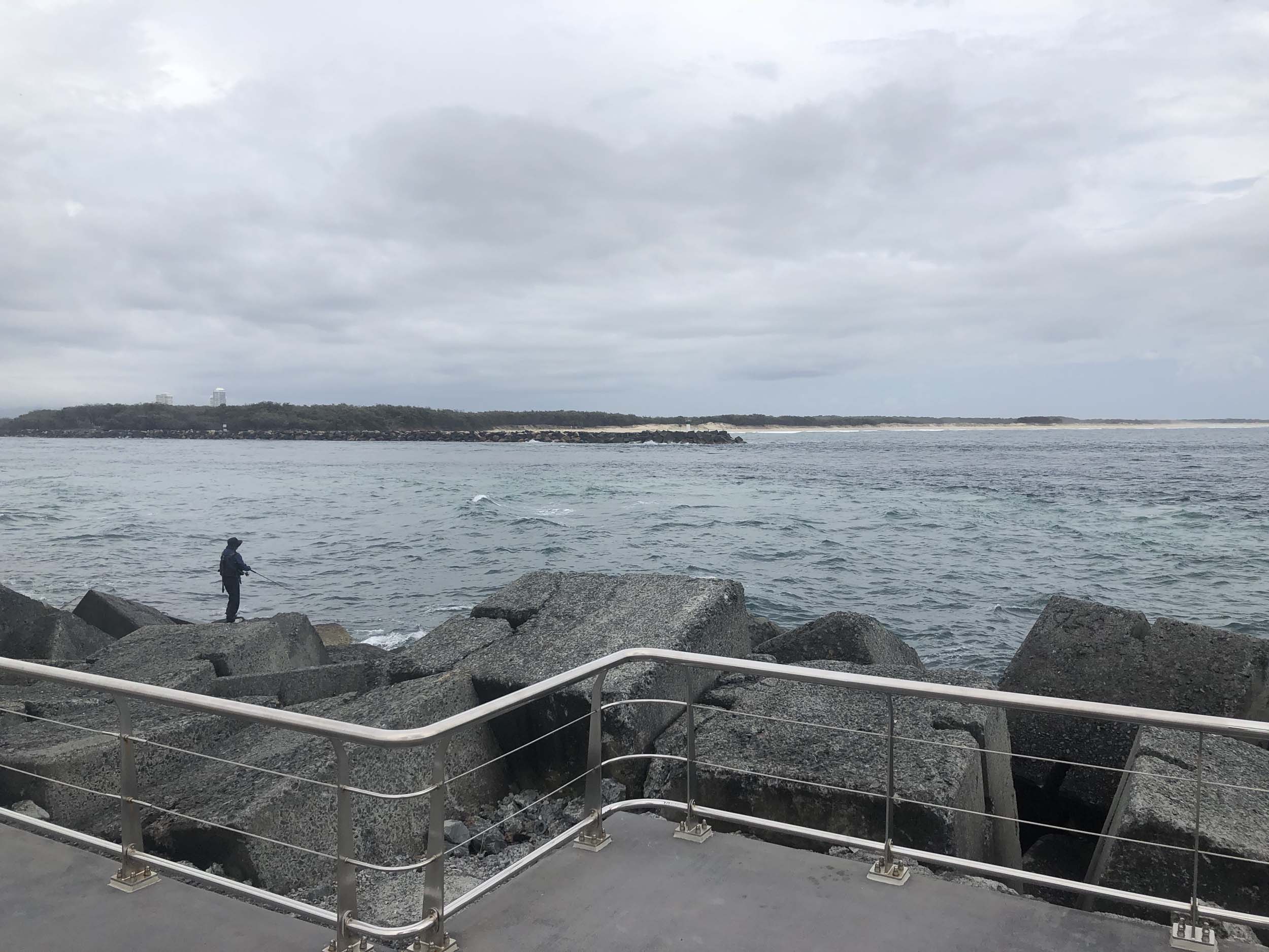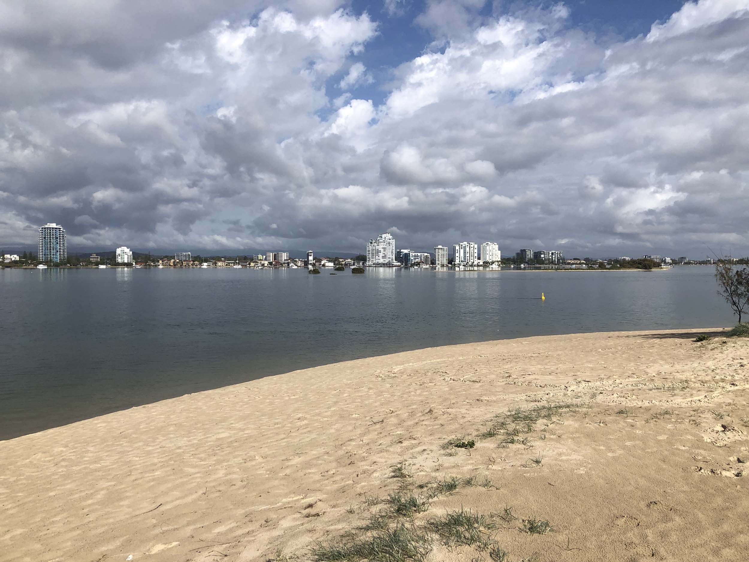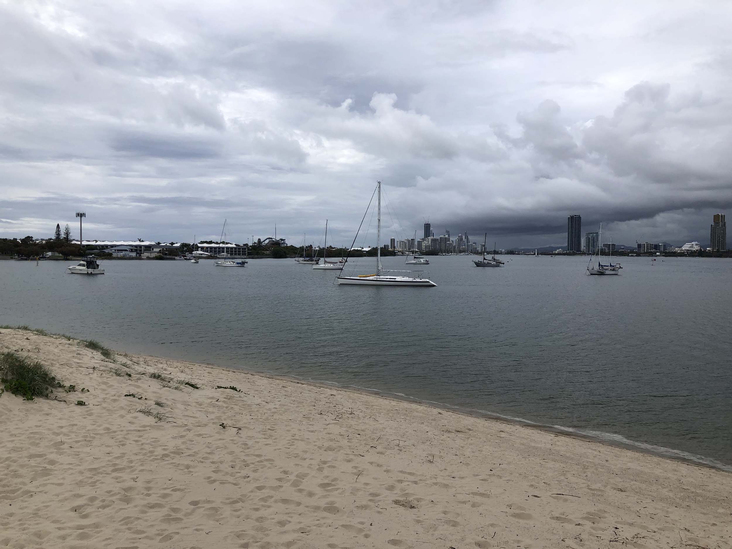 I left at 7:08am, the breeze was light from the South and building, the Broadwater had a light chop and looked like it would rain at any moment.