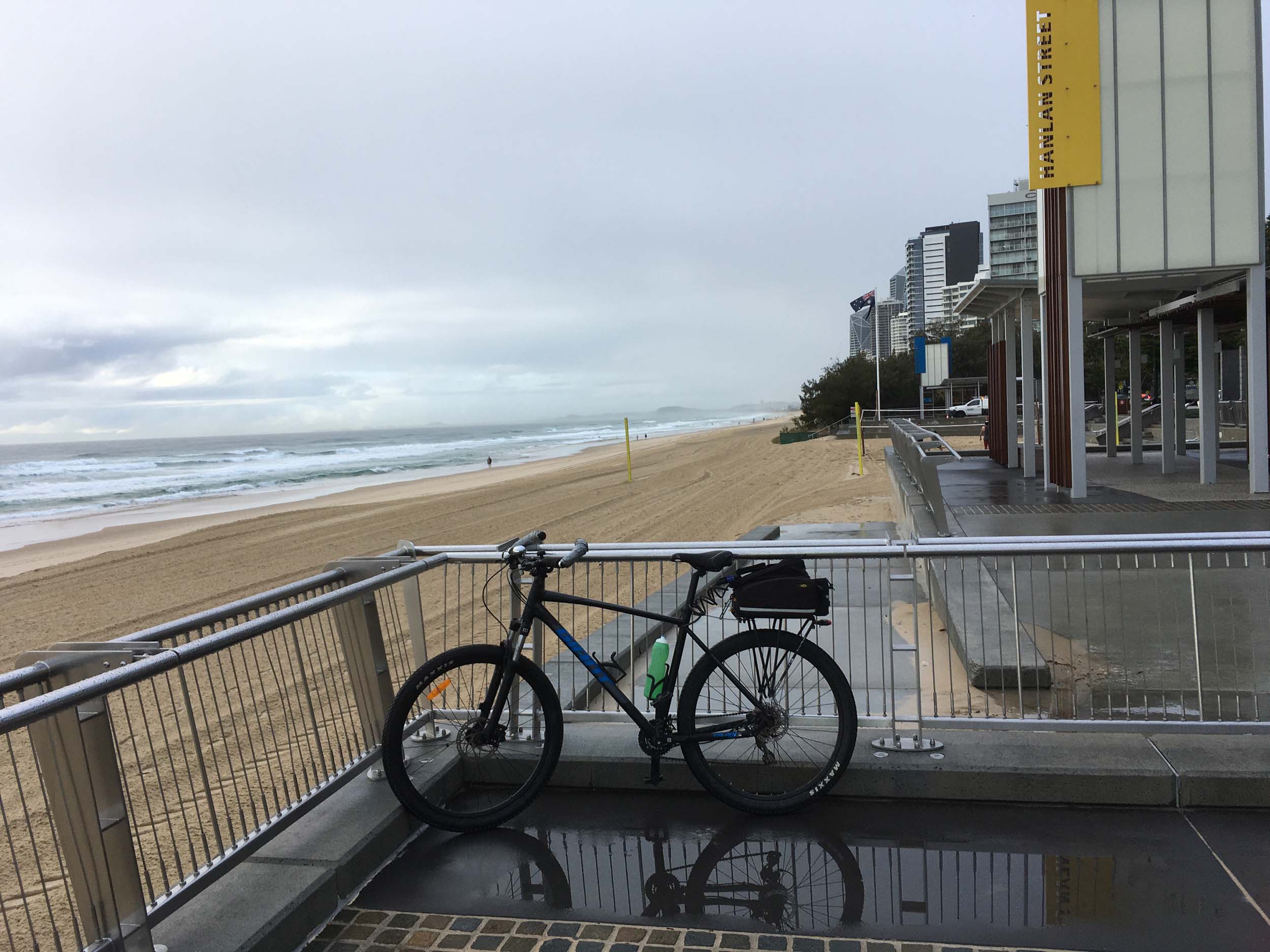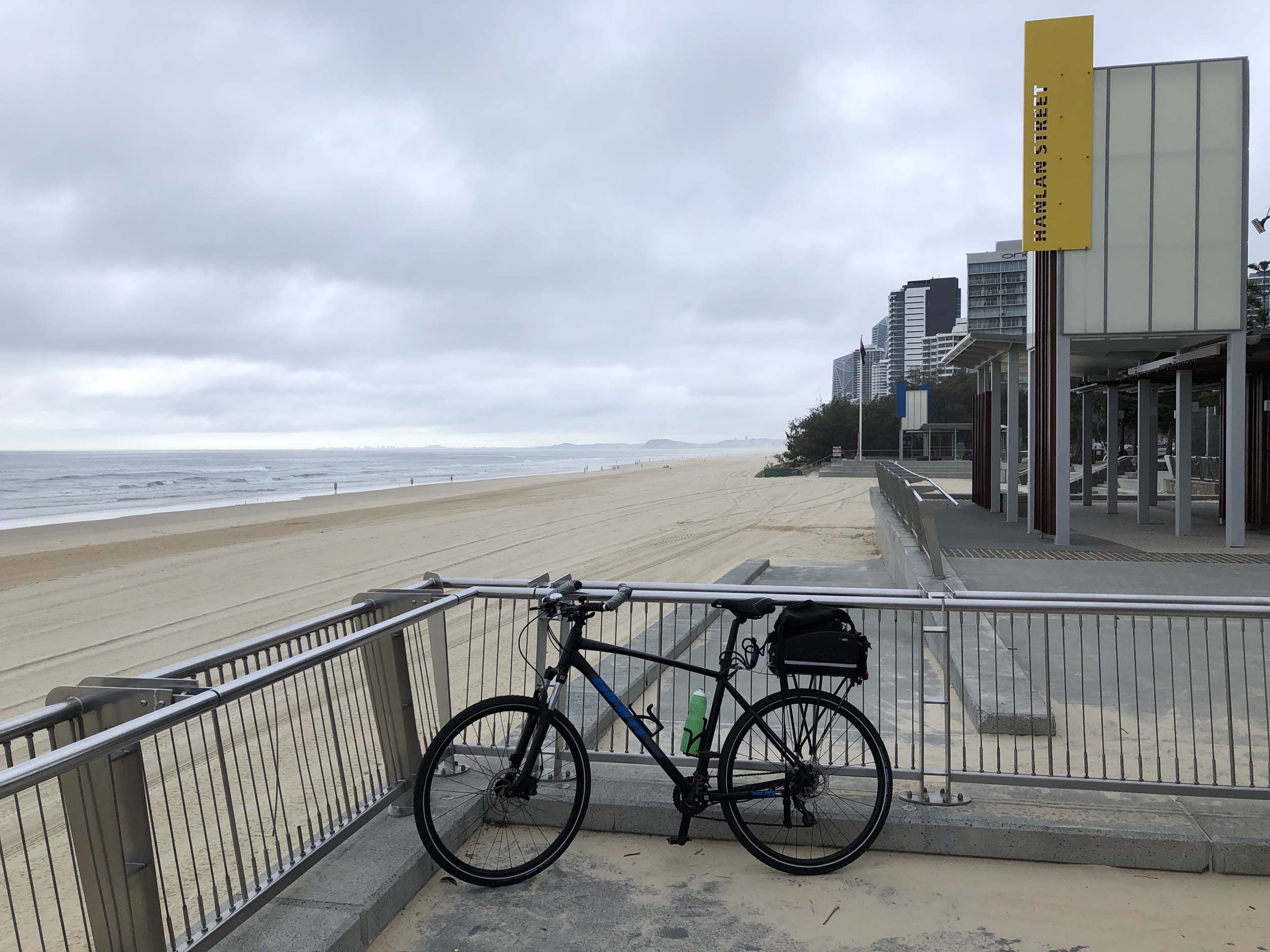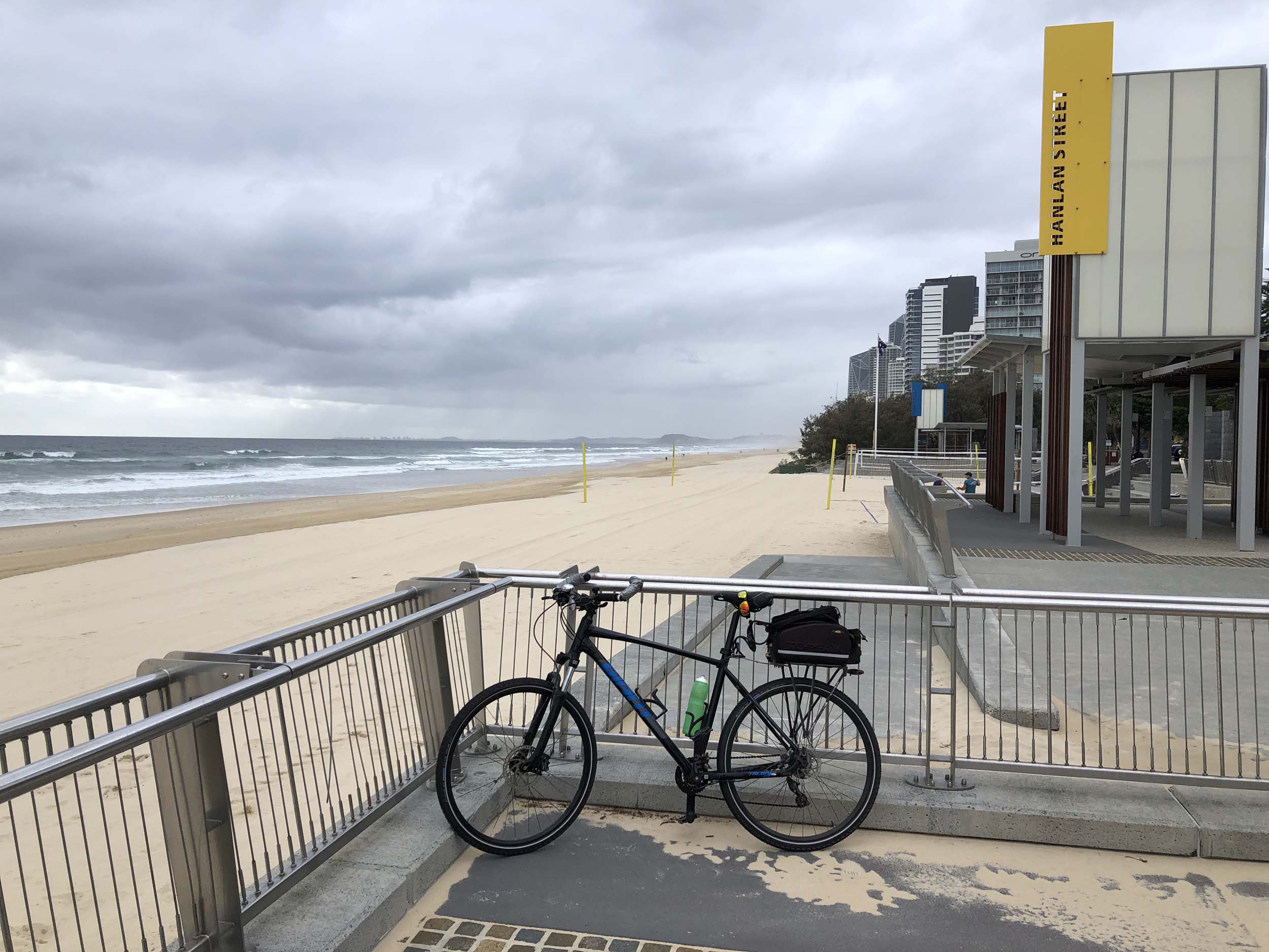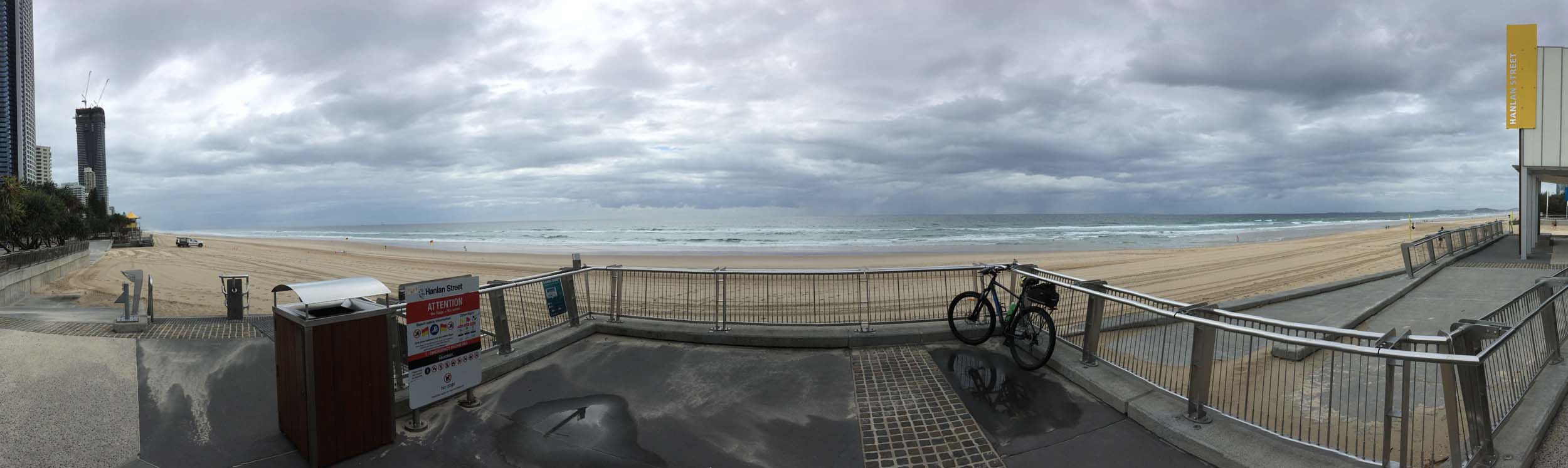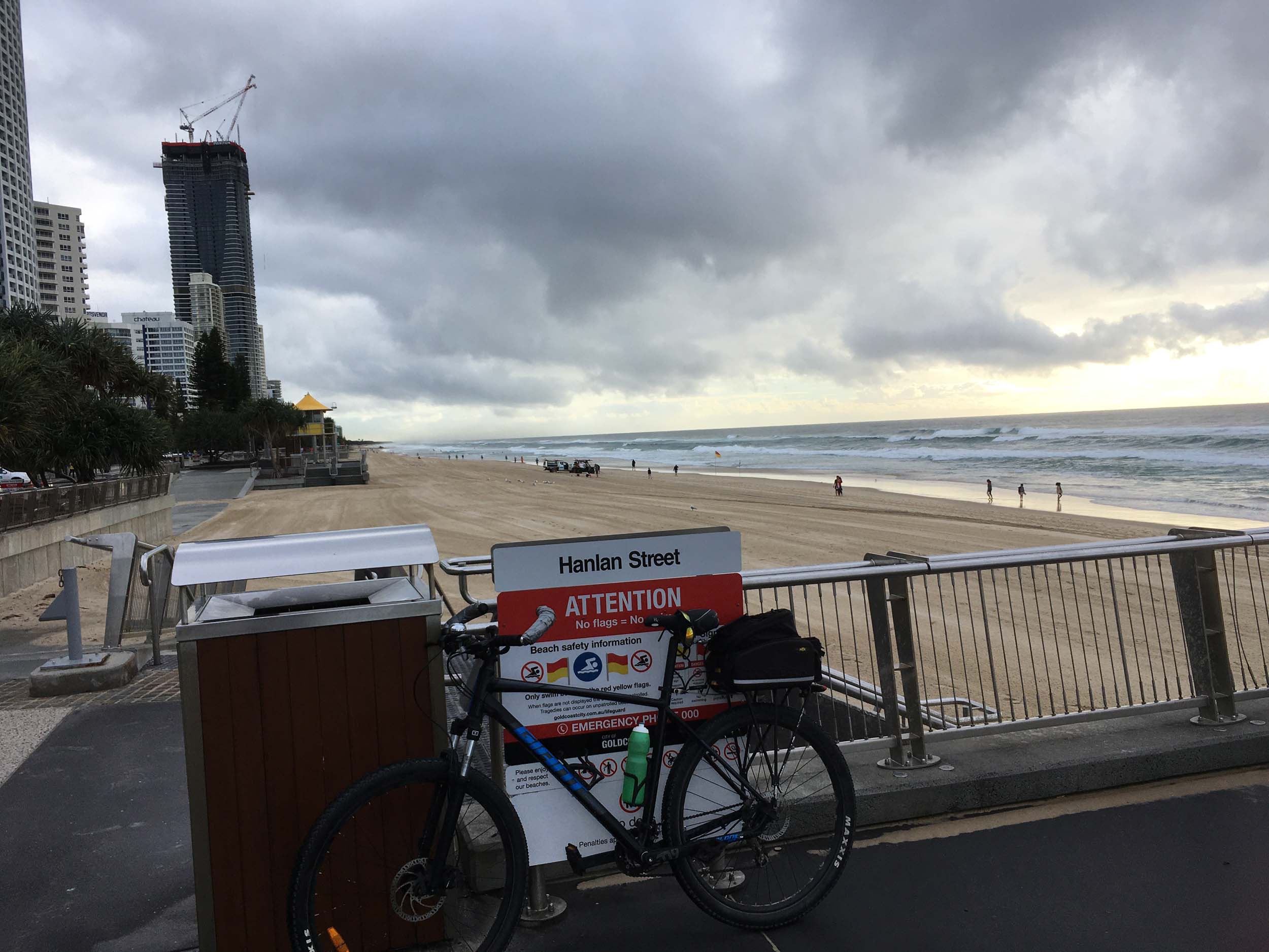 As usual, I rode Northward to my Lands End turnaround point. As it was about to rain, I stopped and put on my wet weather pants. I continued down to MacIntosh Is, did a lap. Over the Bridge at Narrowneck then along the Shared Path to my normal spot at Surfers, still near Hanlan St. I stopped and took my weather photos. I headed off to the Spit along the various shared paths.