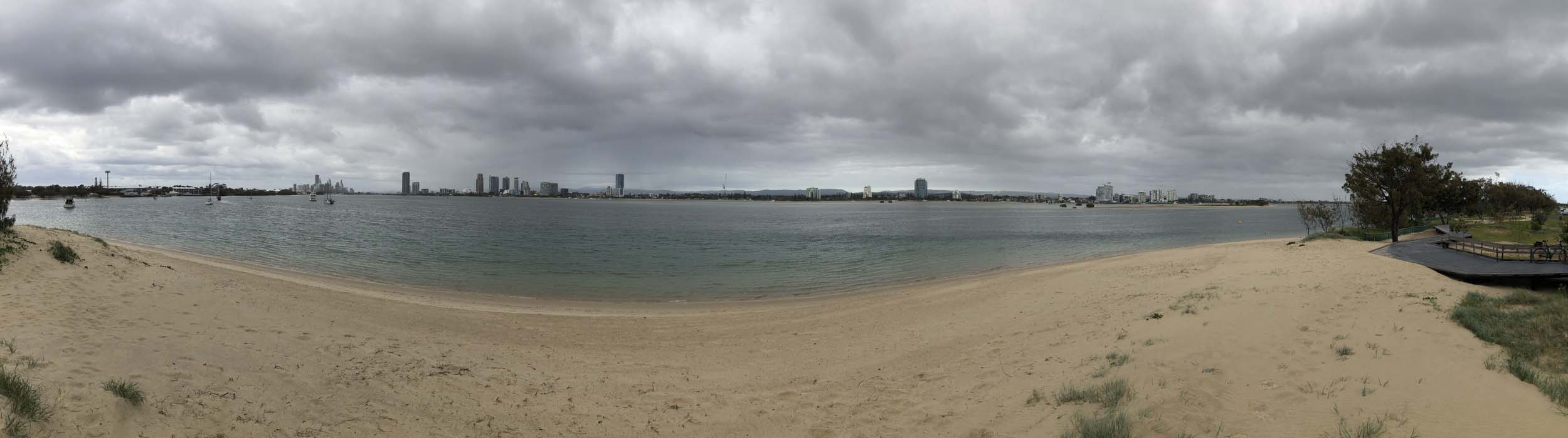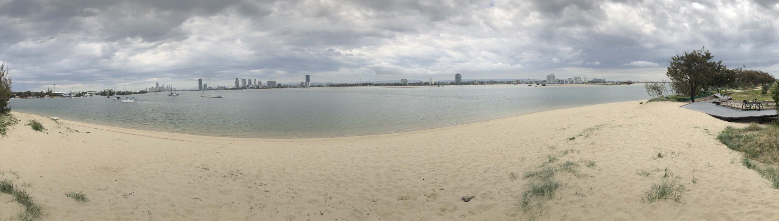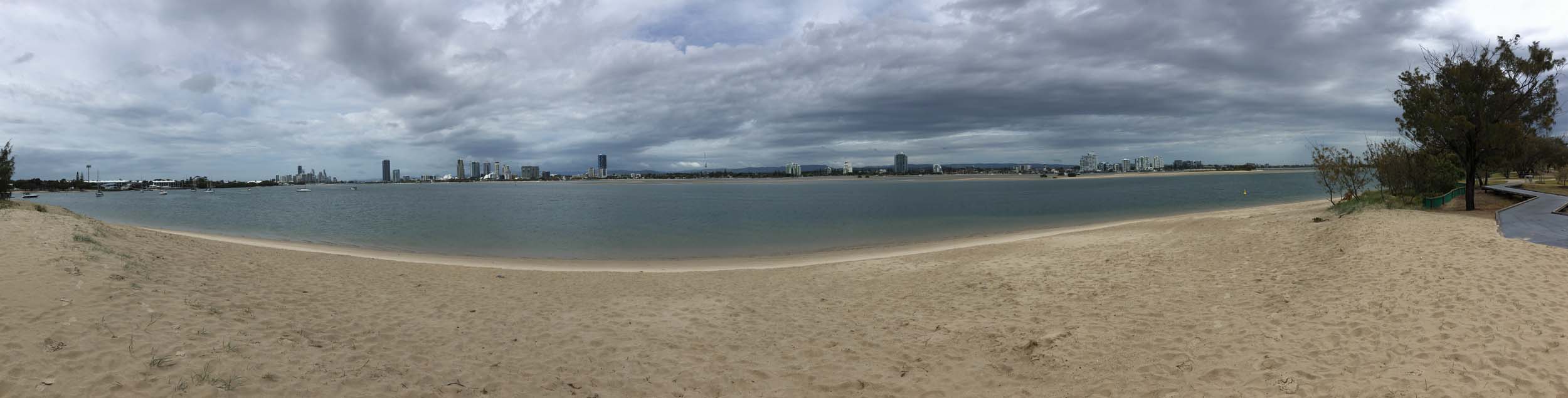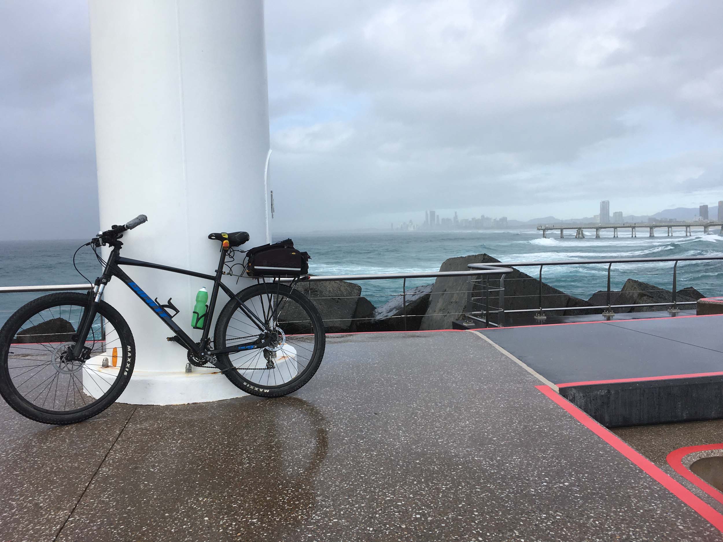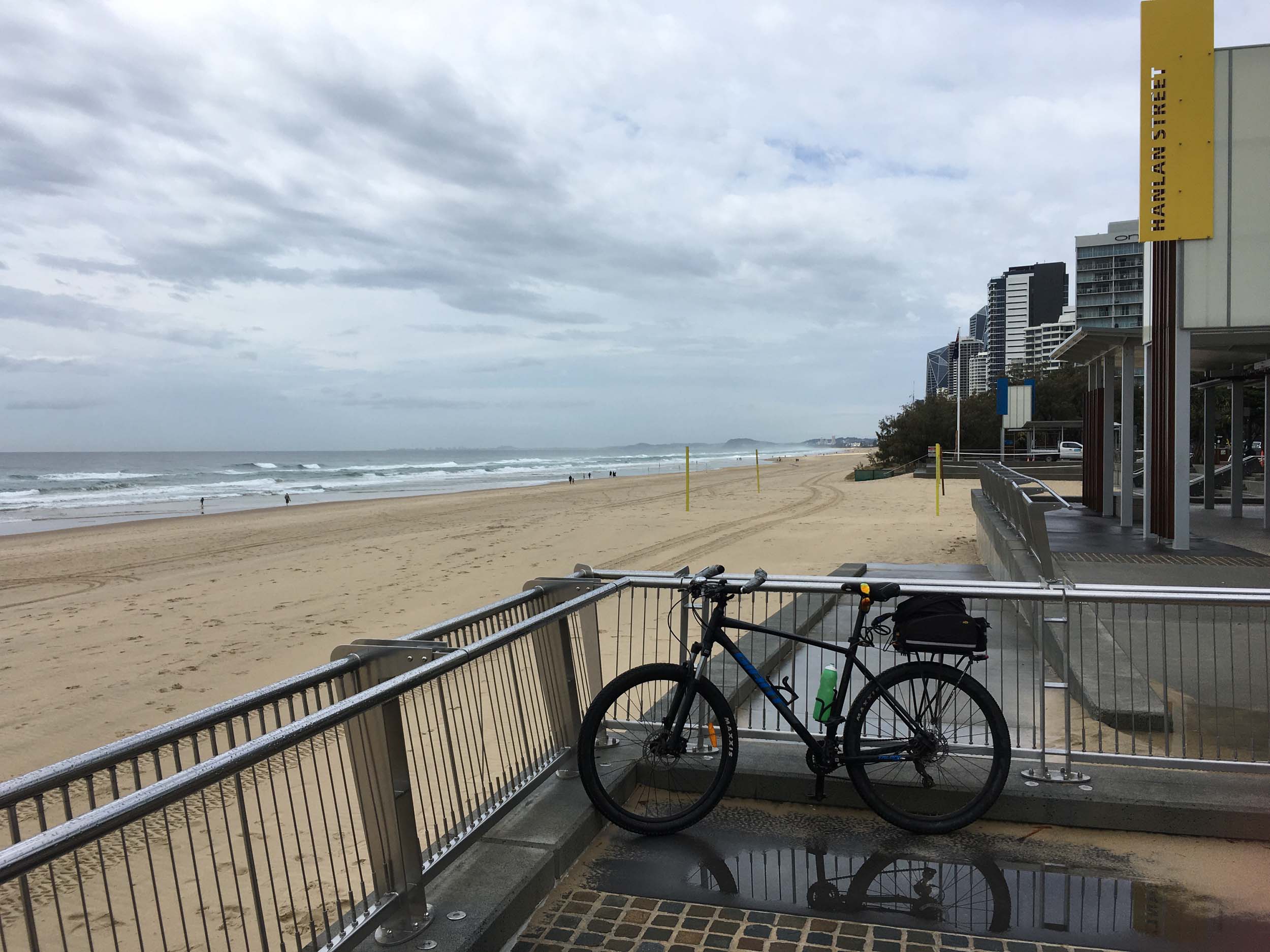As usual, I rode Northward to my Lands End turnaround point. As it was about to rain, I stopped and put on my wet weather pants. I continued down to MacIntosh Is, did a lap. Over the Bridge at Narrowneck then along the Shared Path to my normal spot at Surfers, still near Hanlan St. I stopped and took my weather photos. I headed off to the Spit along the various shared paths.