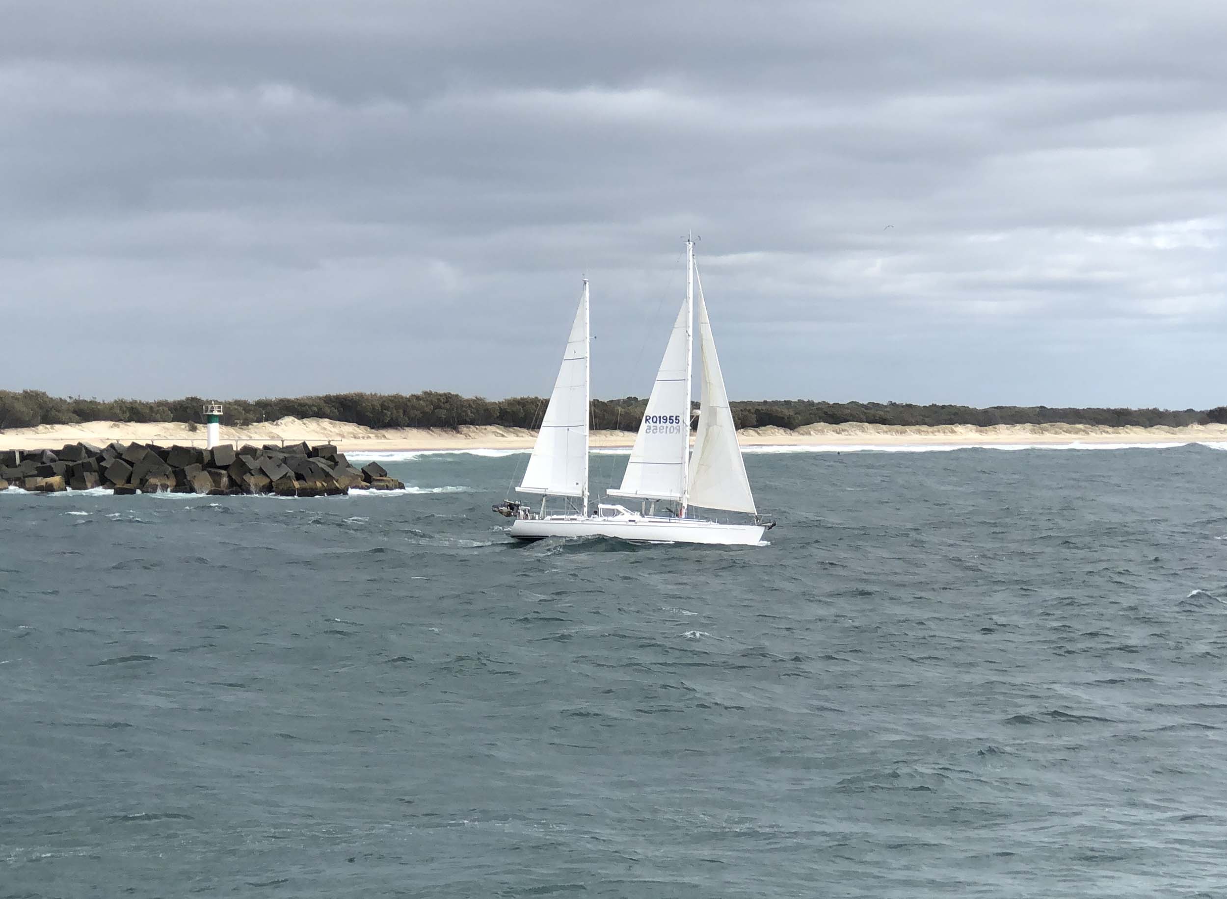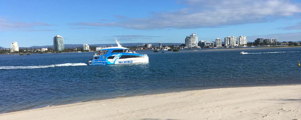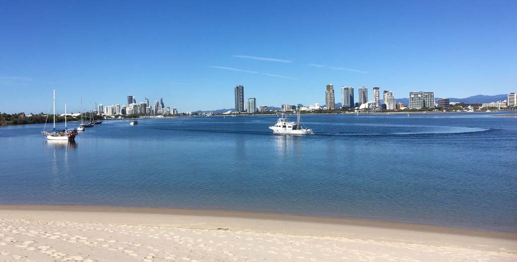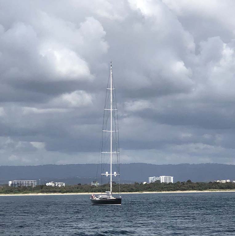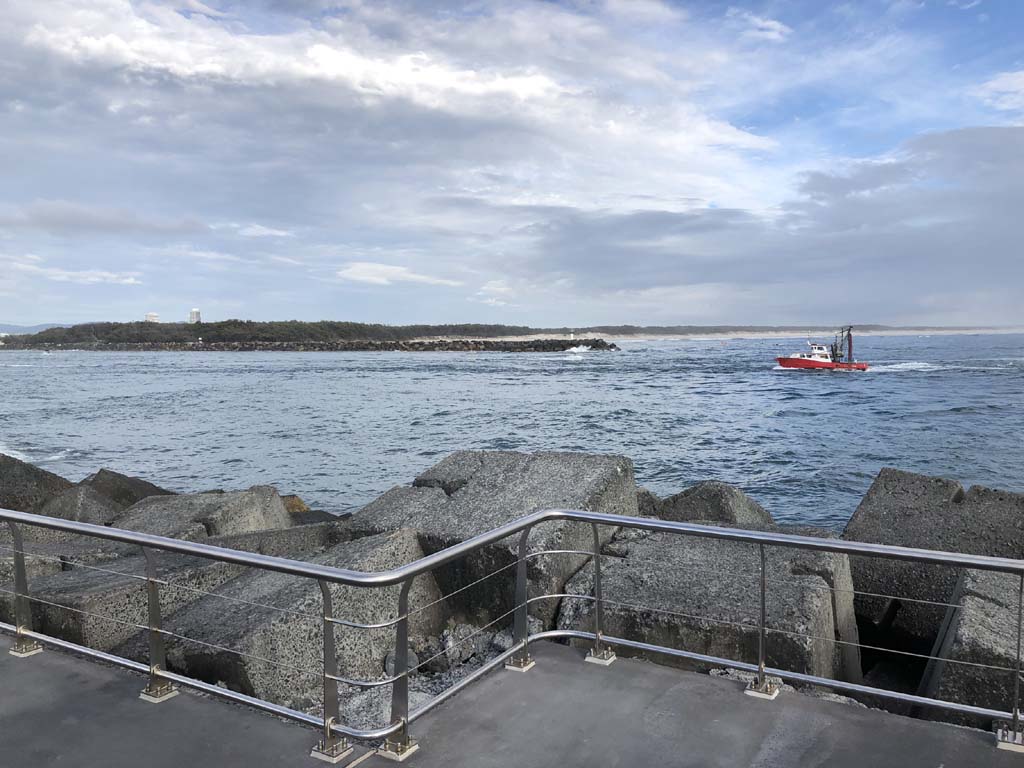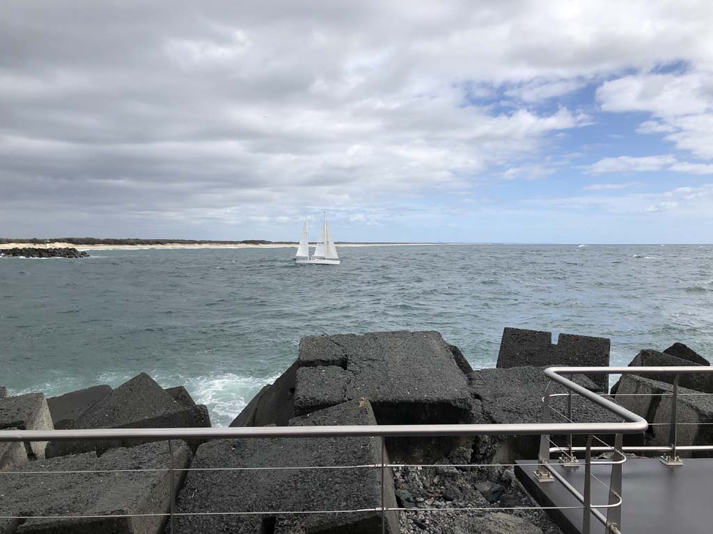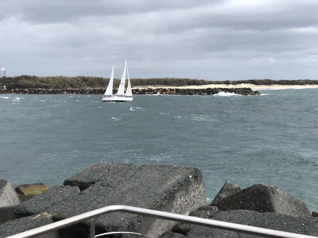 I left at 8:59 am, after shopping at Runaway Bay and having a retirement coffee. The breeze was light and building from the South East and the Broadwater was choppy.