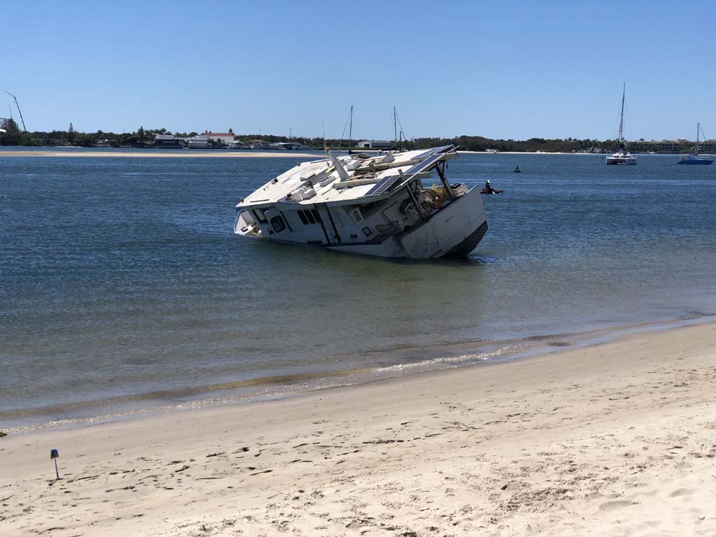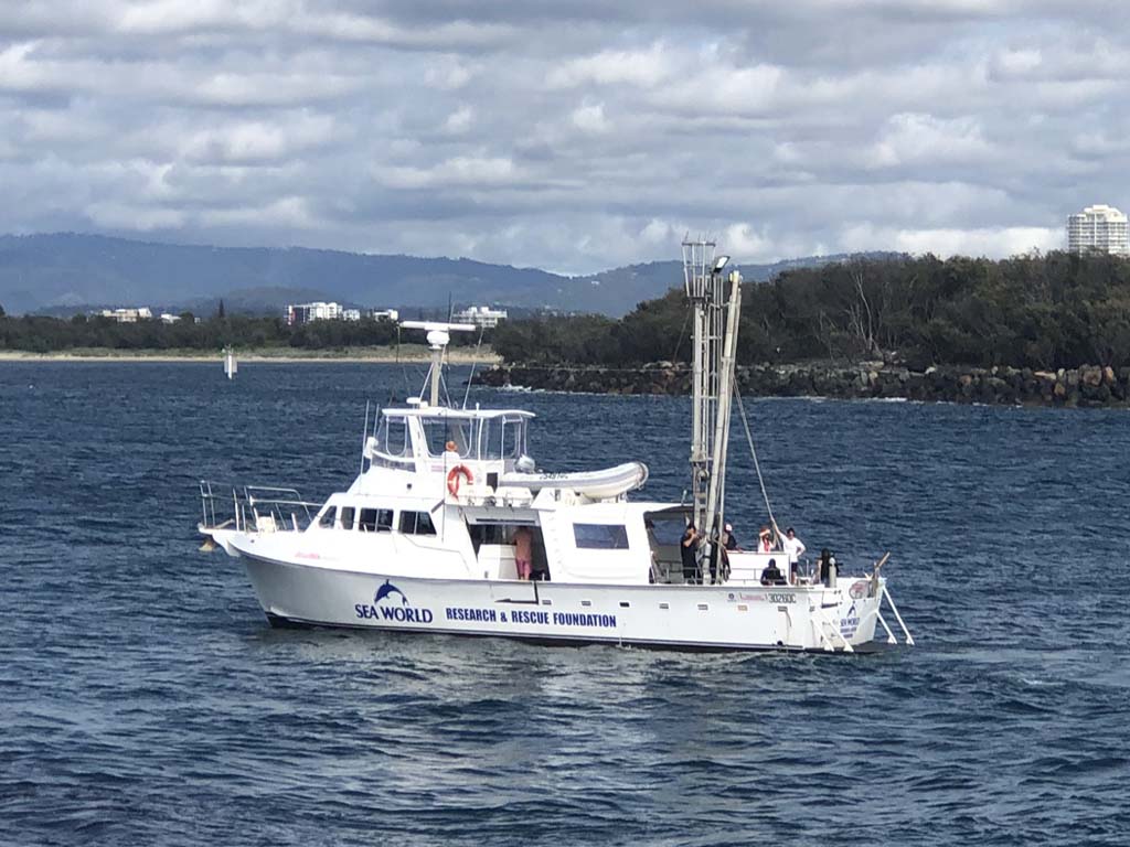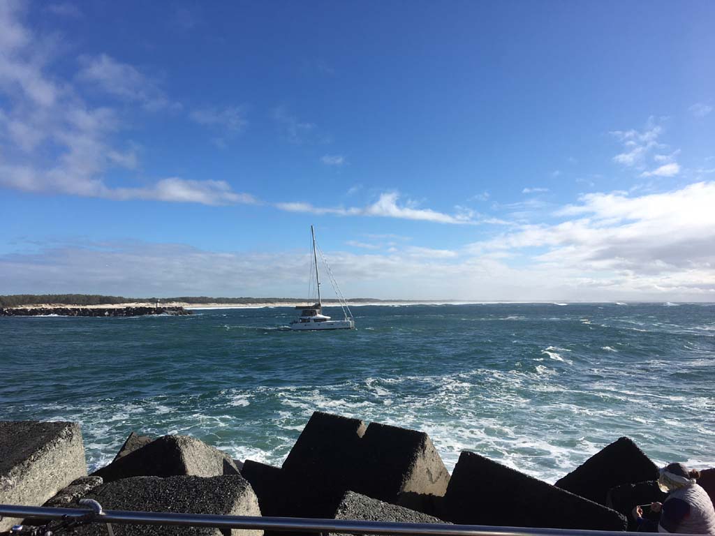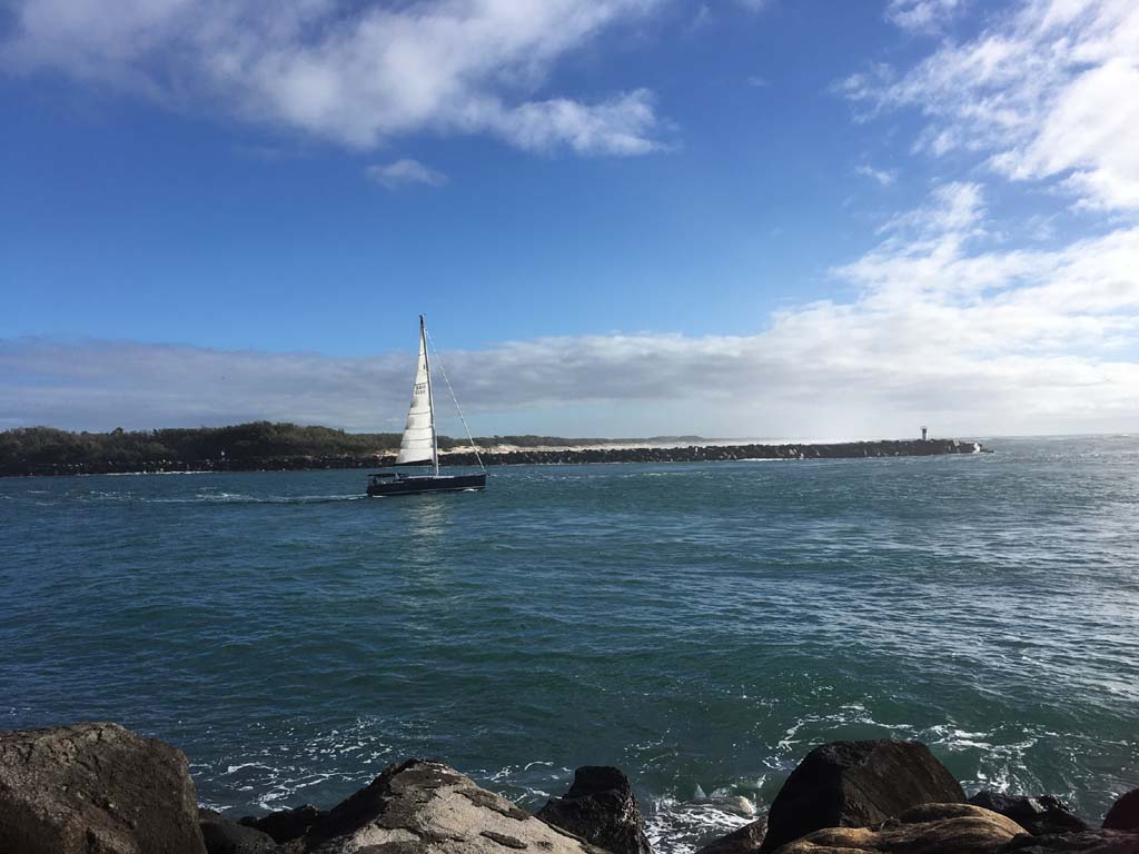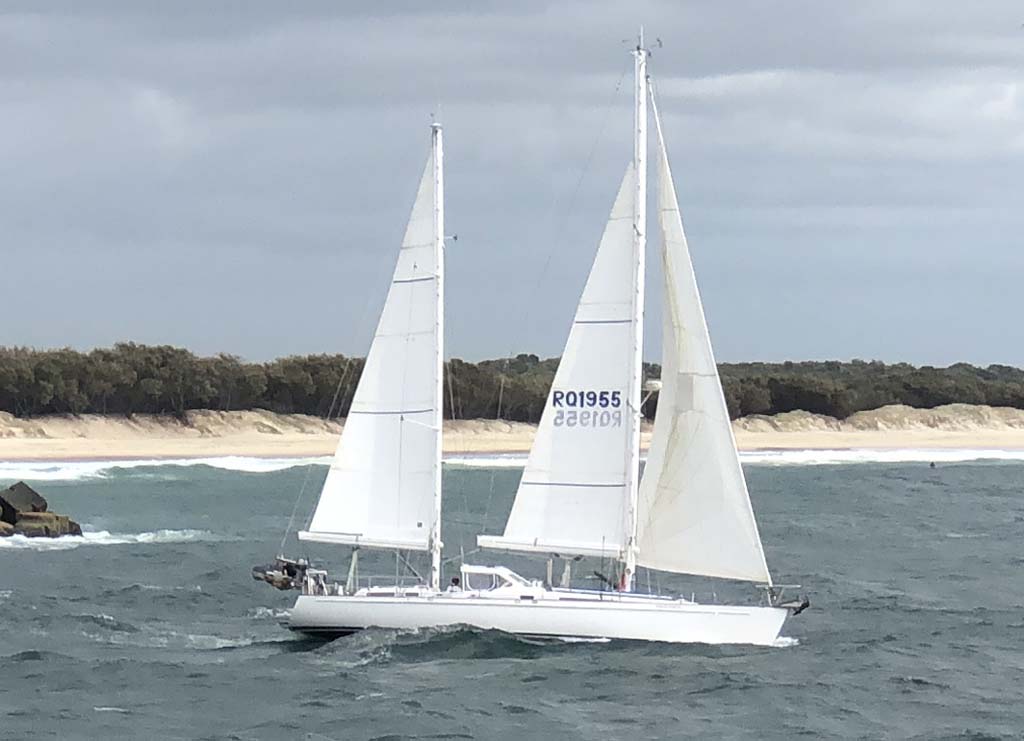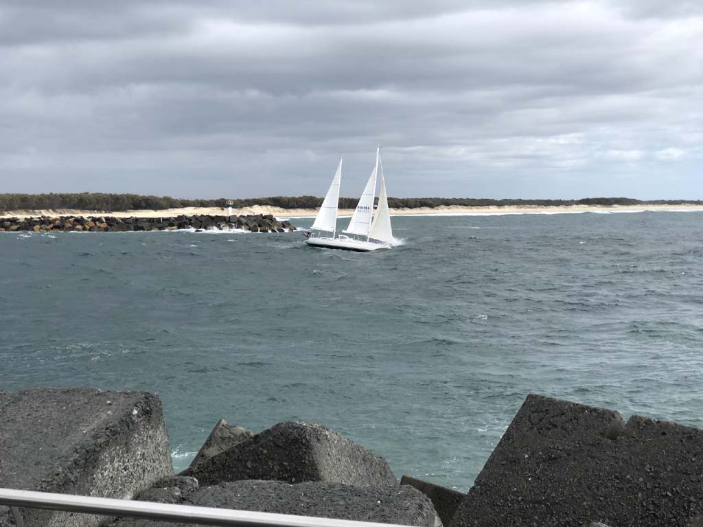 I left at 8:59 am, after shopping at Runaway Bay and having a retirement coffee. The breeze was light and building from the South East and the Broadwater was choppy.