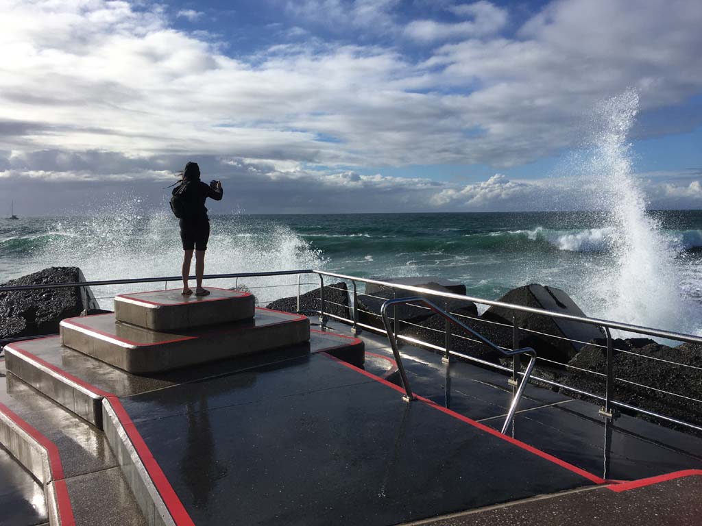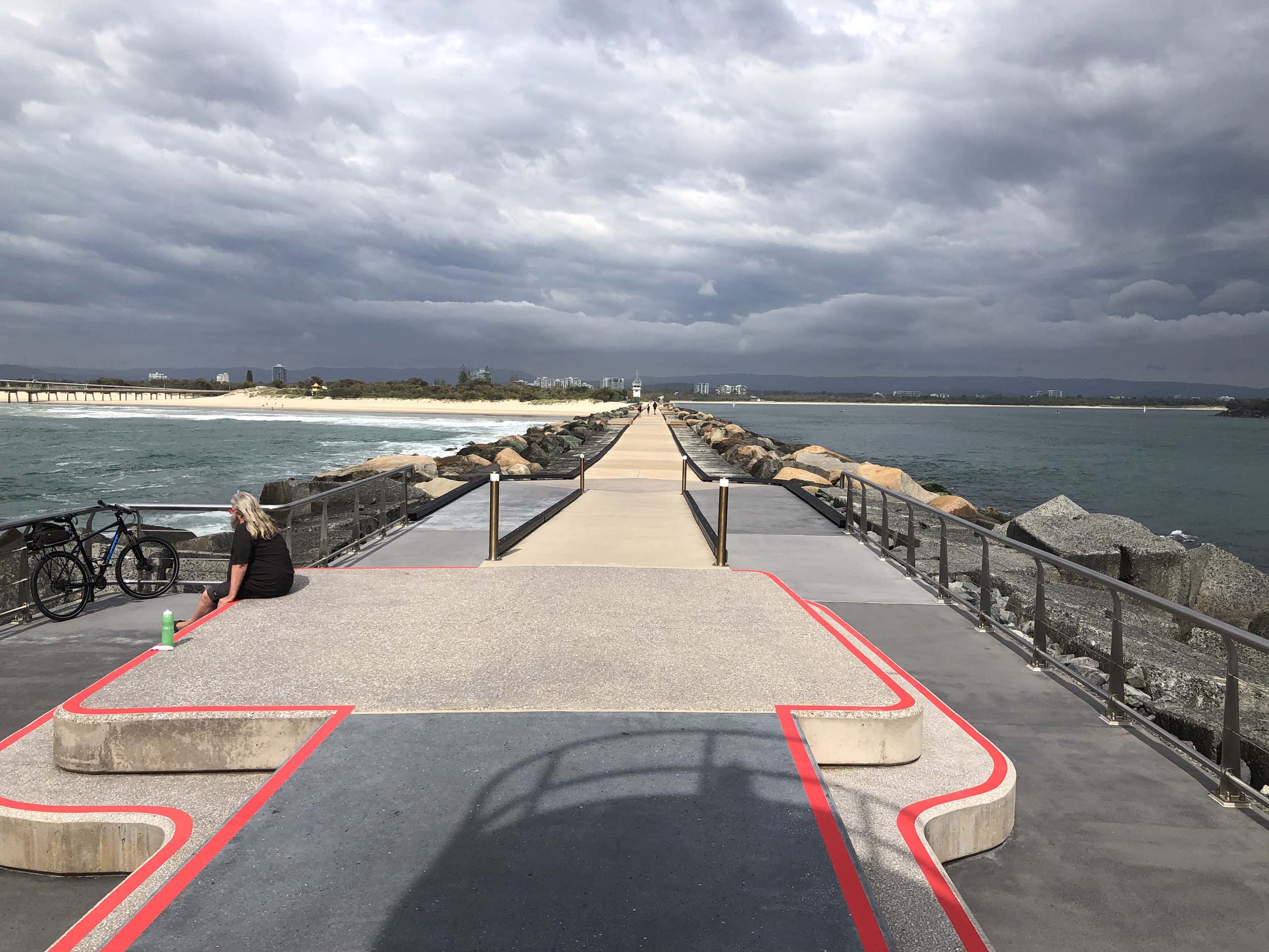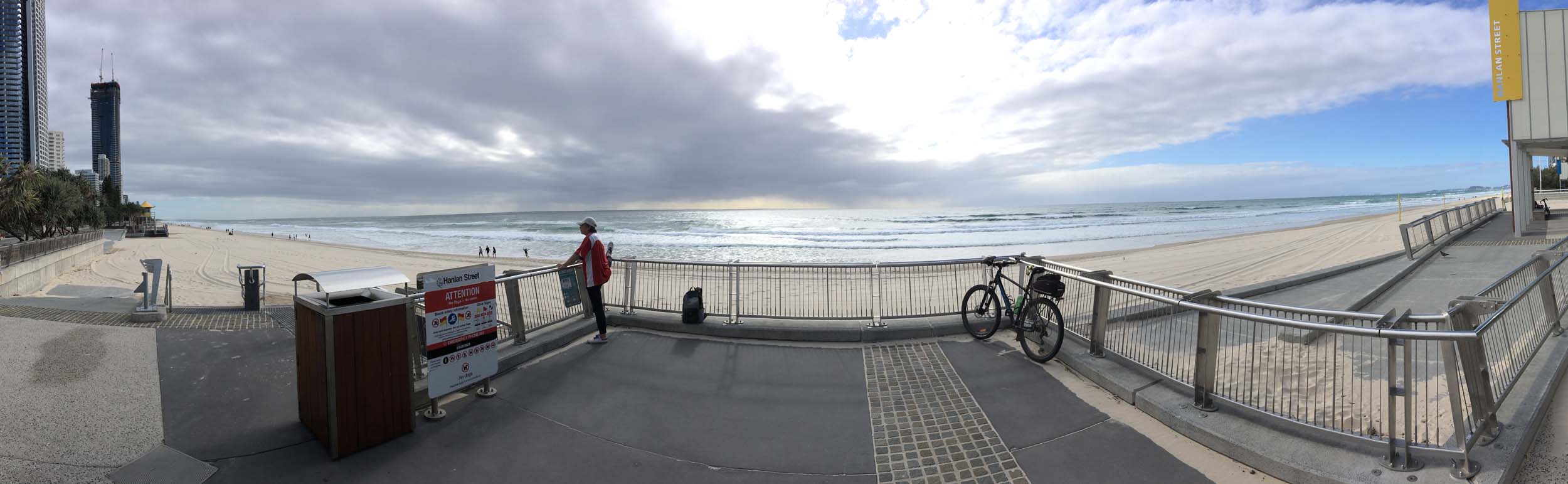 As usual, I rode Northward to my Lands End turnaround point. I continued down to MacIntosh Is, did a lap. Over the Bridge at Narrowneck then due to the number of walkers, i rode along The Esplanade to my normal spot at Surfers, still near Hanlan St. I stopped and took my weather photos. A woman was in my spot, so I photographed her as well, I headed off to the Spit along the various shared paths.