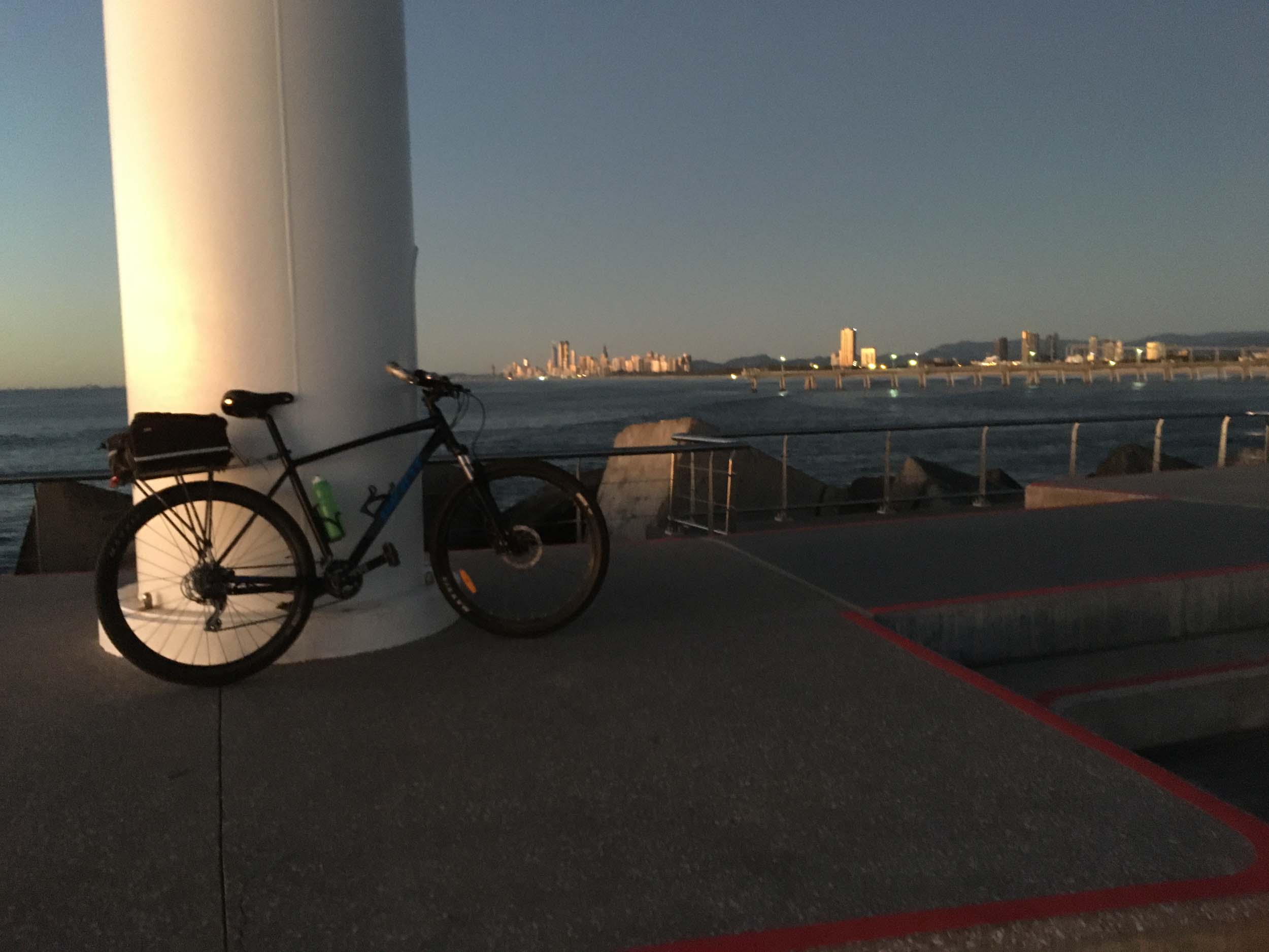 I left home at 5:54am, I woke early and decided to ride. The breeze was blowing like buggery from the South and the Broadwater had some chop.