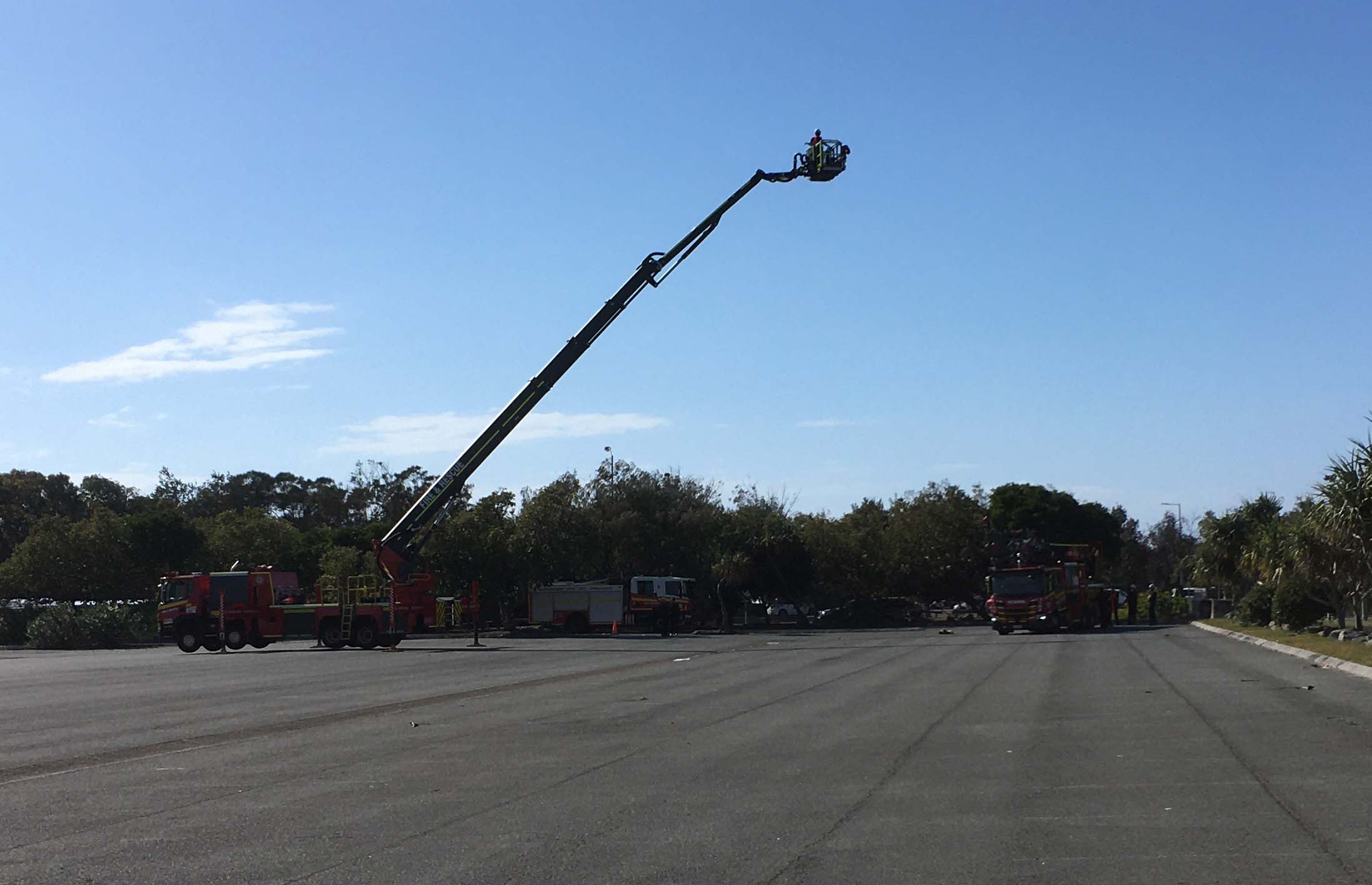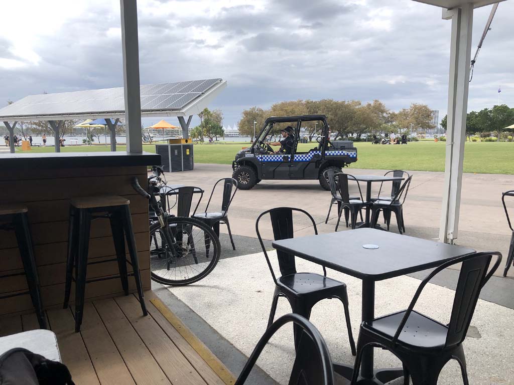 After leaving The Spit, I rode back along the new shared path. I rode through Seaworld's carpark, it was in lockdown and the carpark was about 10% full with its normal employees. The Fire Brigade were testing their ladder, so I stopped and took a photo, before continuing around Marina Mirage and then out to the end of the jetty. I rode past the Southport YC, back to Cafe Rockpool. All the table and chairs were locked away, so I bought a coffee and sat on the lawn under the shade of a tree. It was quite pleasant. As I was drinking my coffee, Mark the gardener was out walking and stopped and we chatted for a good 20 minutes.