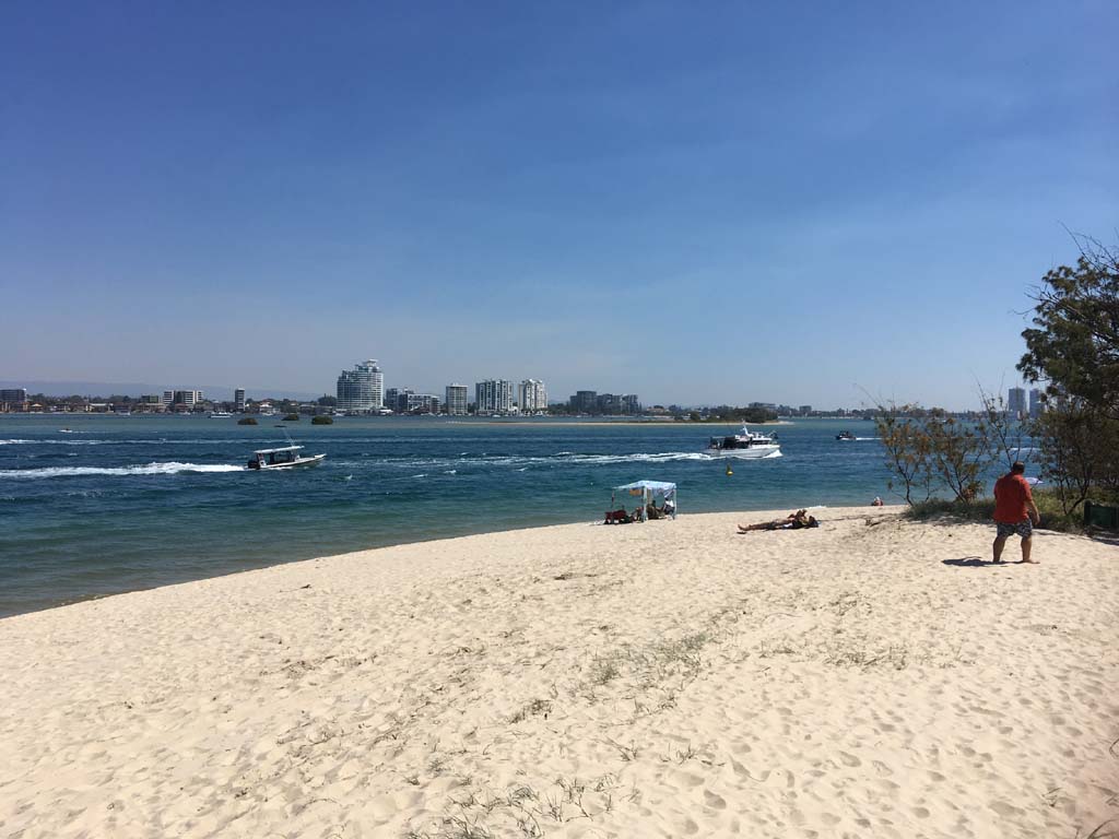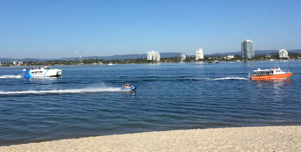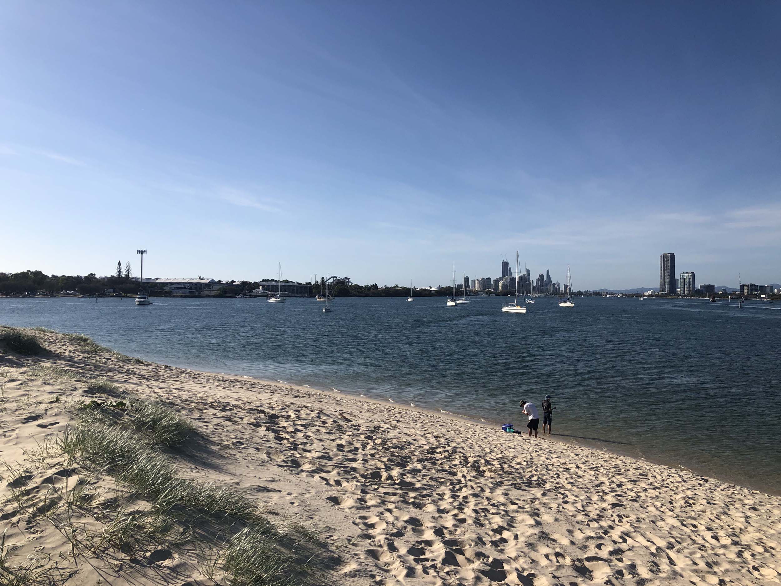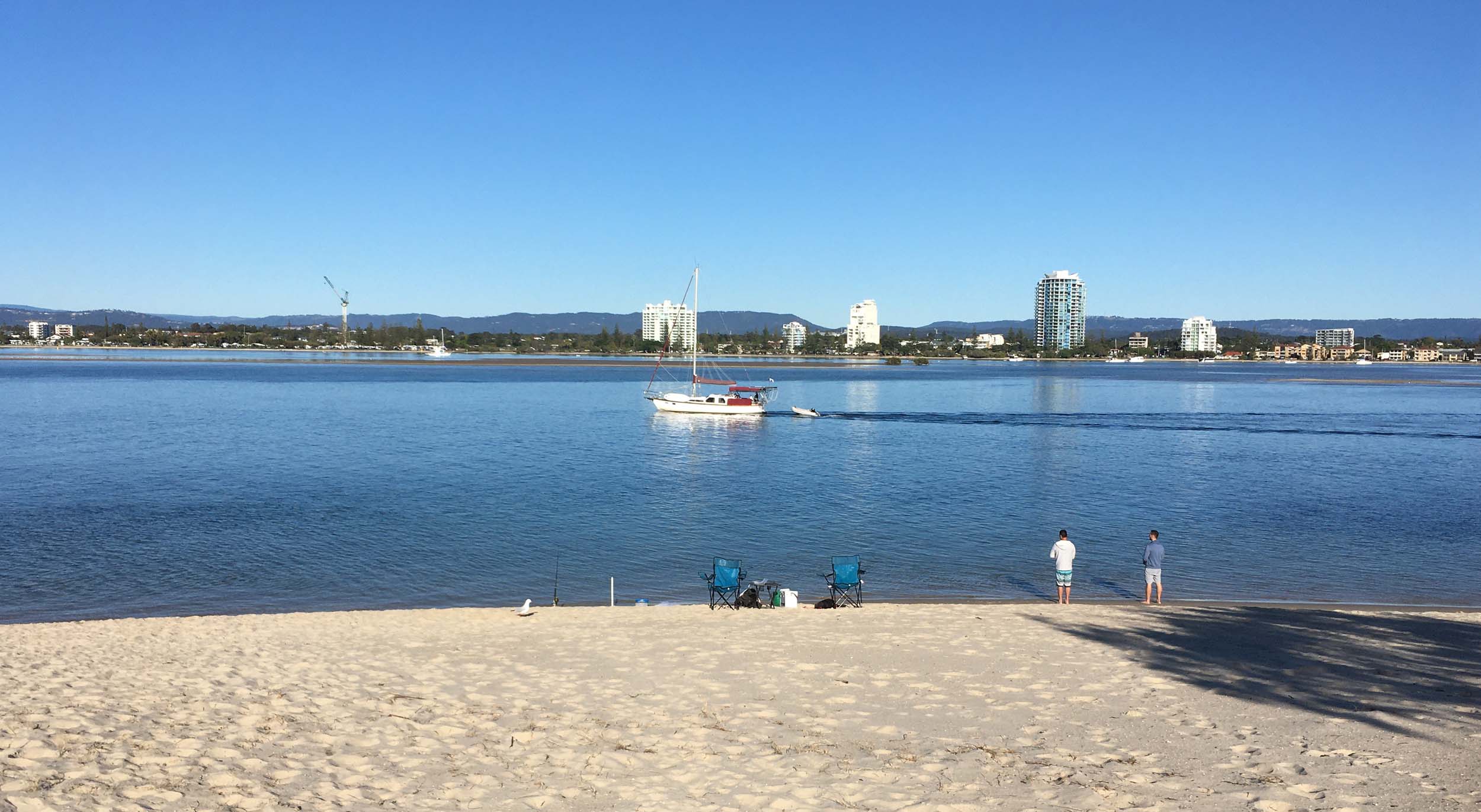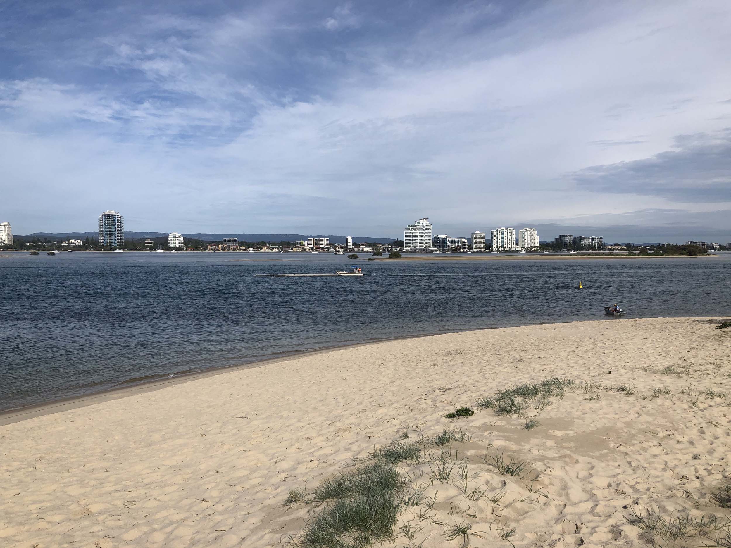 I left at 9:05 am, the breeze was light from the South and building, the Broadwater had a light chop.