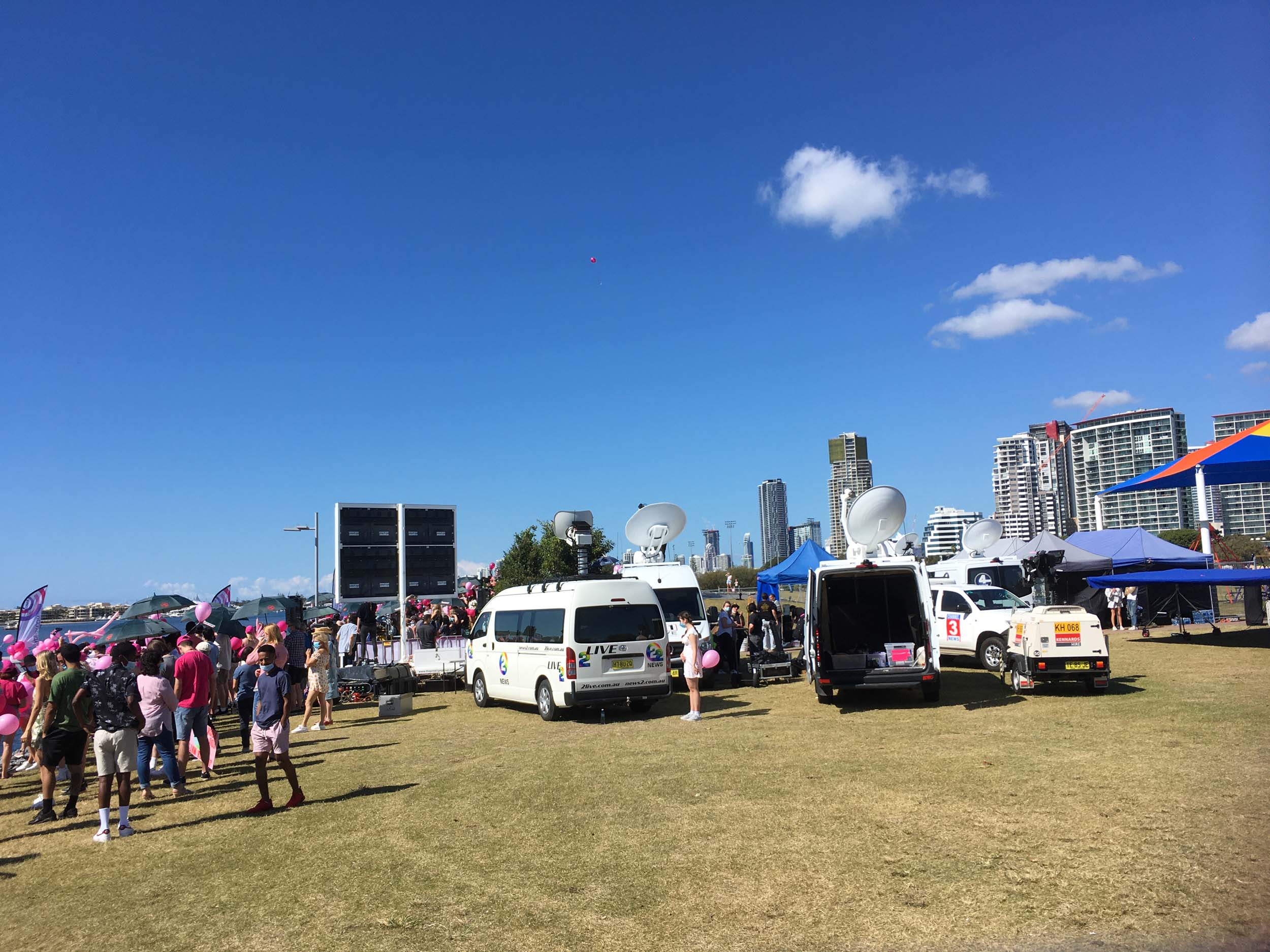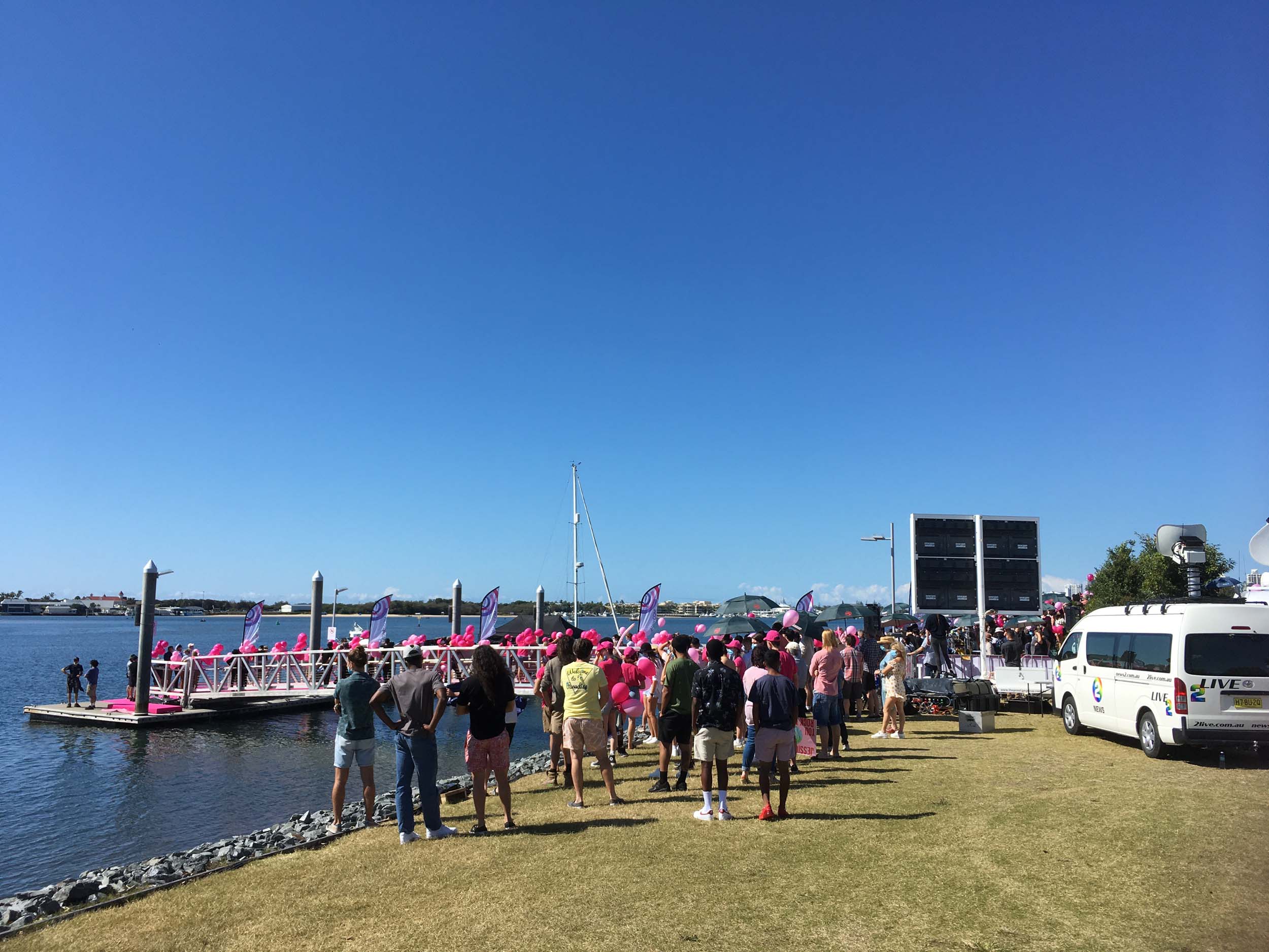 I rode through Muriel Henchman Park, then I rode along the bike path upto and through Seaworld's carpark. There were a couple of hundred cars parked at the back of the carpark. It turns out that the owners were then bused over to the Jessica Watson movie set. they were the 'crowd welcoming Jessica back to Australia'.