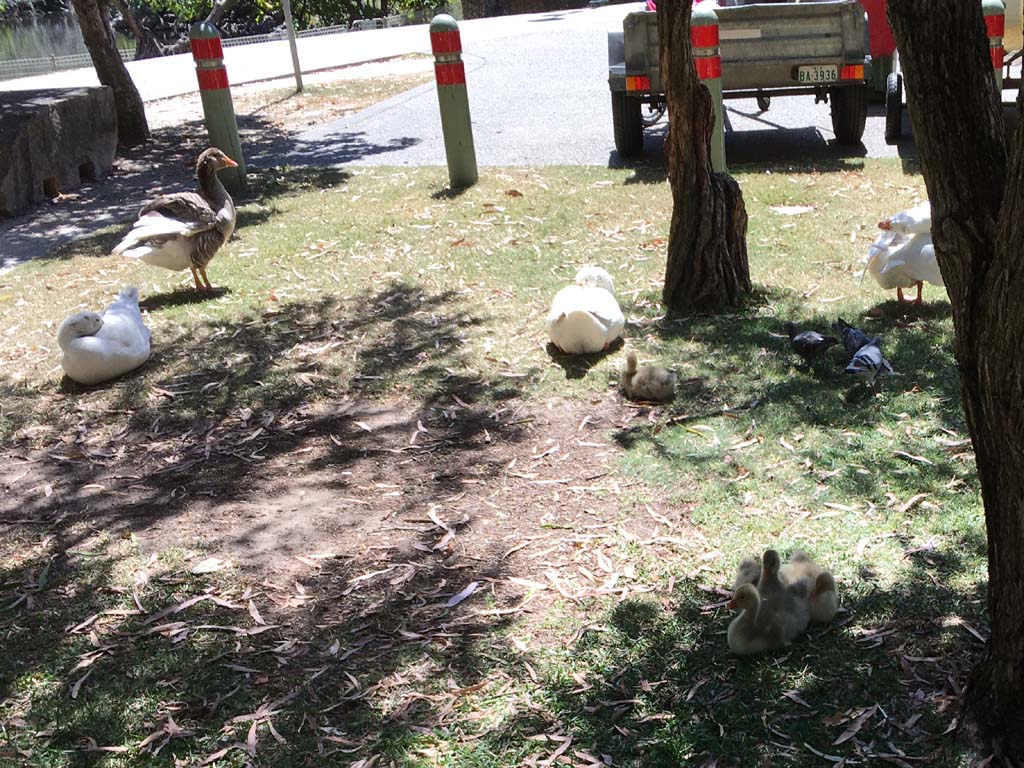 At SeaWorld, I crossed over to its carpark. The joint was jumping, SCHOOL HOLS. I rode through Seaworld's carpark. down and around Marina Mirage and then out to the end of the jetty. Crossed over Seaworld Drive back onto the Federation Walk and continued back to MacIntosh Island. Goosey Lucy and mates were all out and enjoying life to the max.