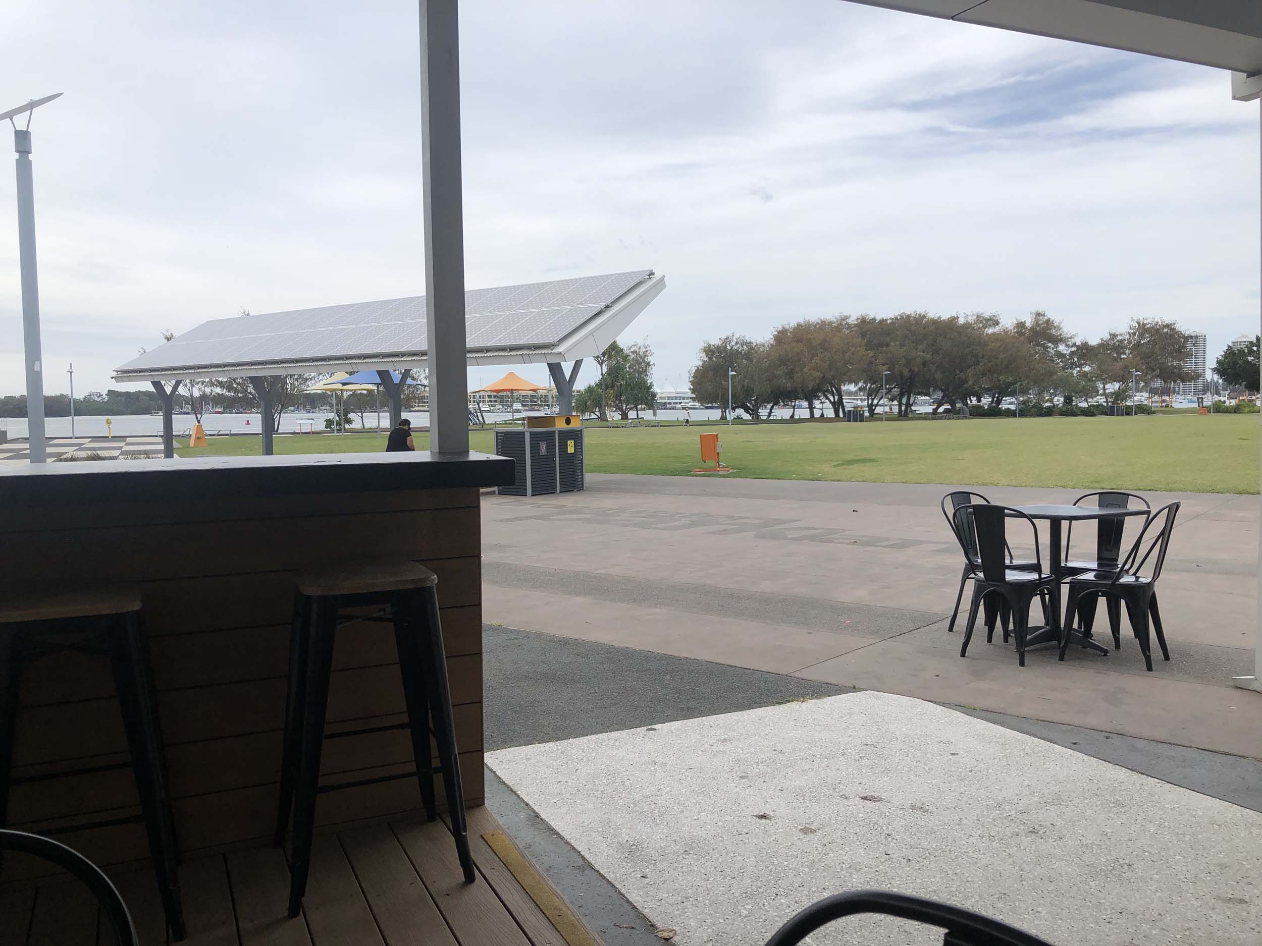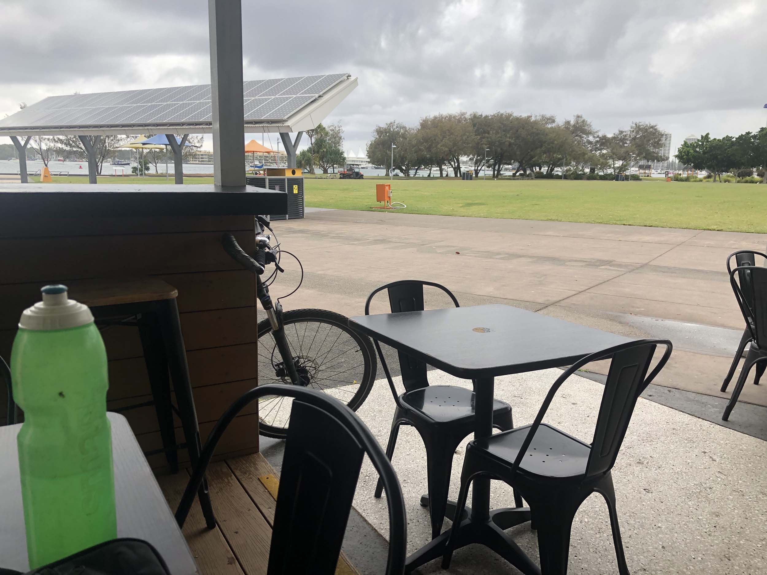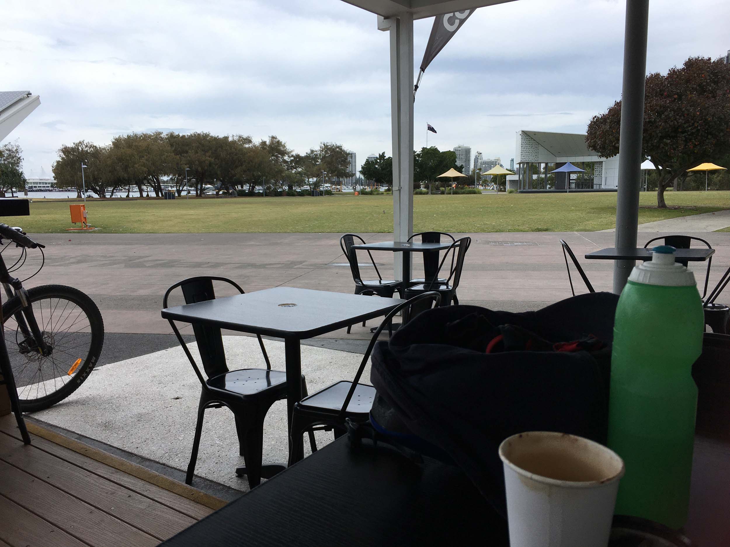 After leaving The Spit, I rode back along the new shared path. I rode through Seaworld's carpark, it was in lockdown and the carpark was about 10% full with its normal employees. Rode down and around Marina Mirage and then out to the end of the jetty. I rode past the Southport YC, back to Cafe Rockpool. All the table and chairs were locked away, so I bought a coffee and sat on the lawn under the shade of a tree. It was quite pleasant.