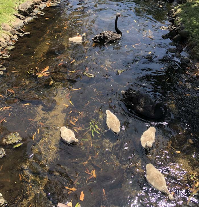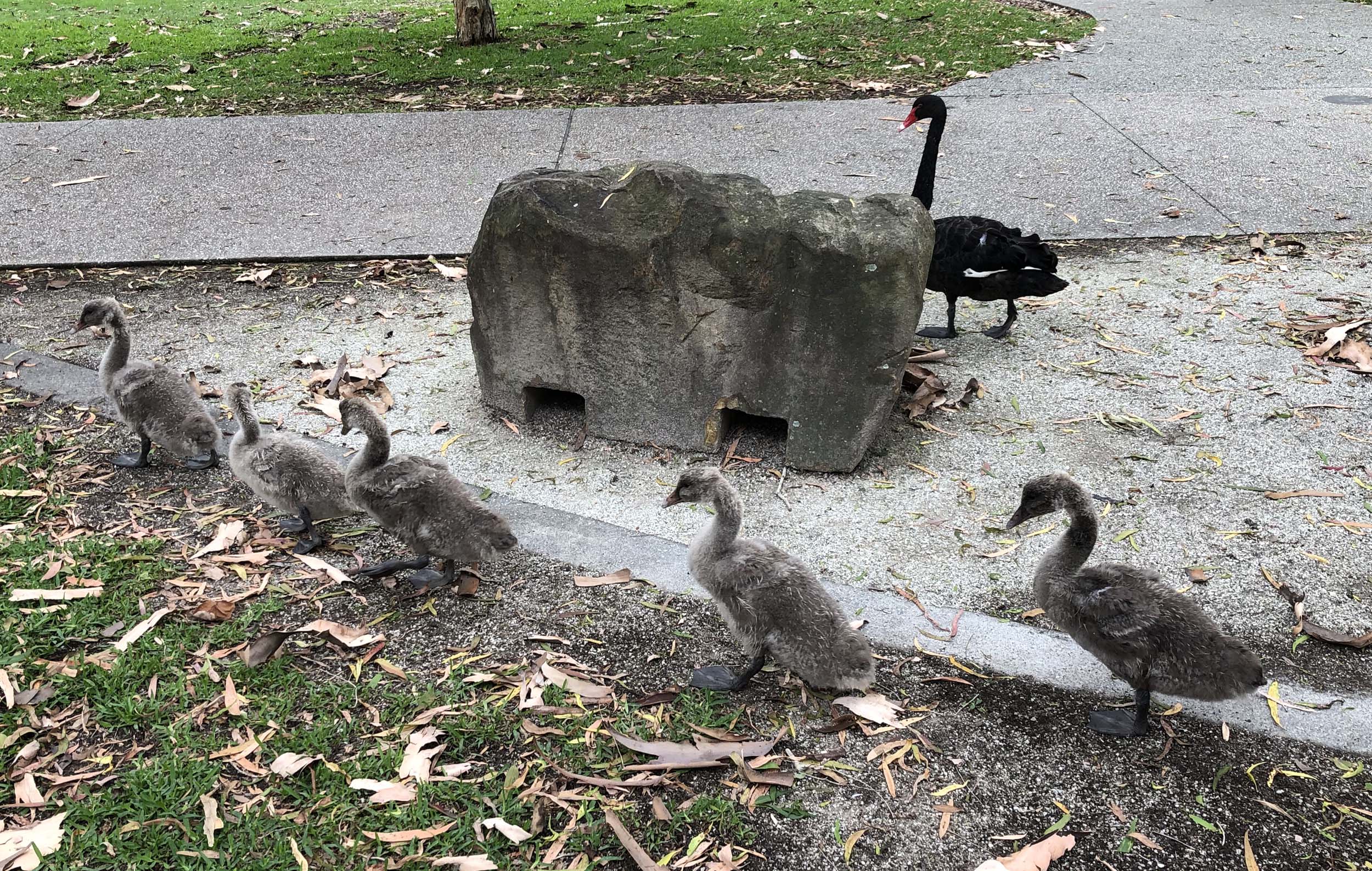 I continued homeward via a lap of 'our' caravan park, I was counting the empty sites, until I saw Momma Goose and her 5 goslings. I stopped and watched her protect them. I also forgot how many empty sites.