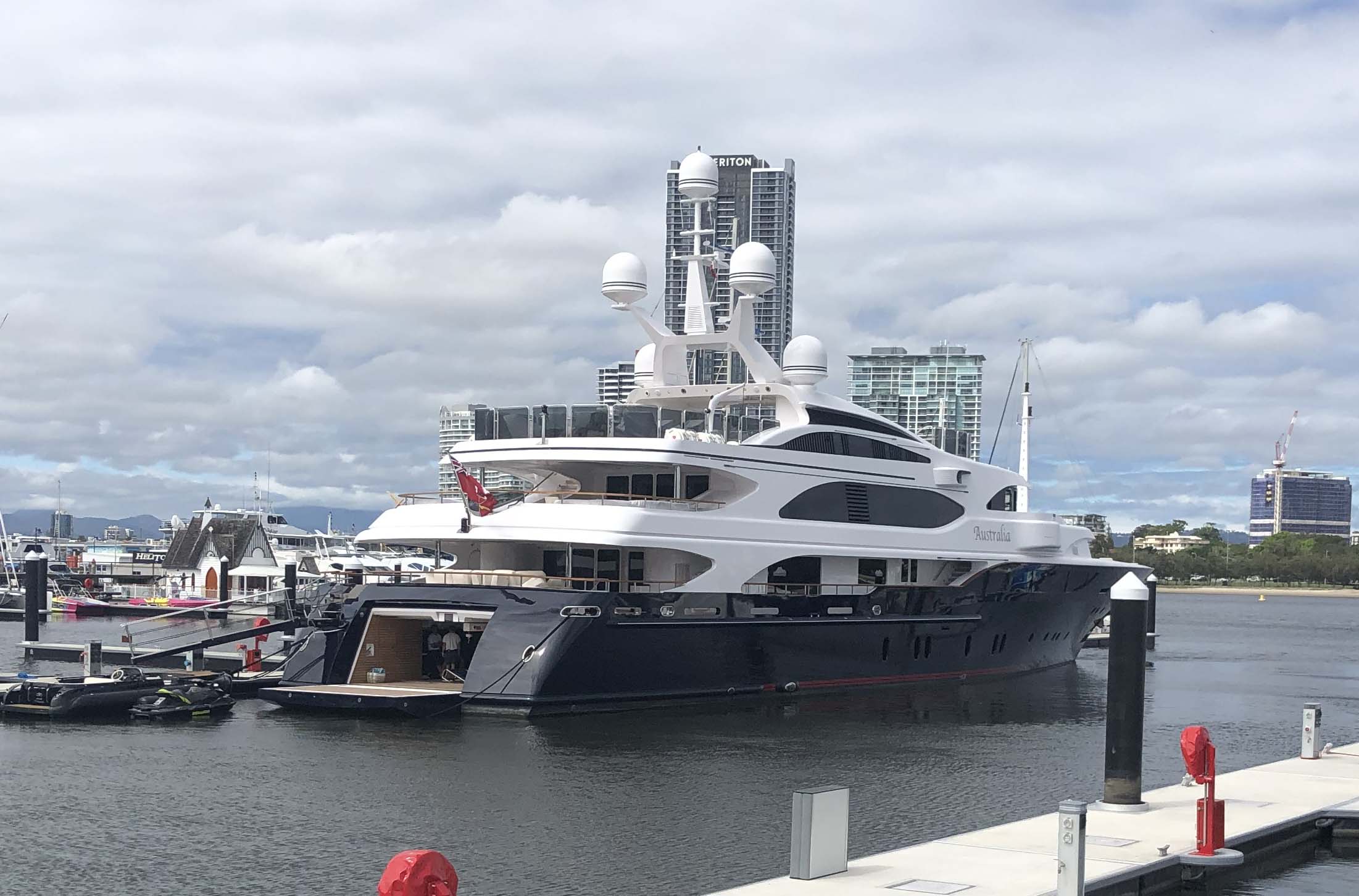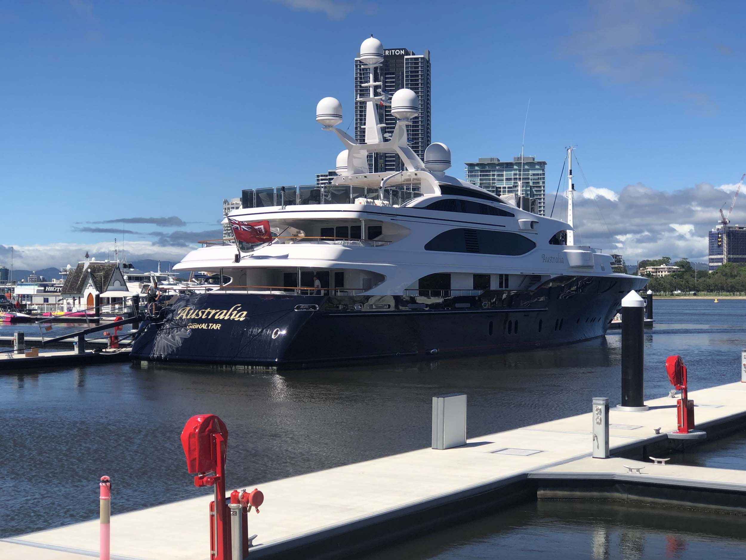 I rode around Marina Mirage and the jetty. Australia is still moored there and a crewman was washing the transom.
