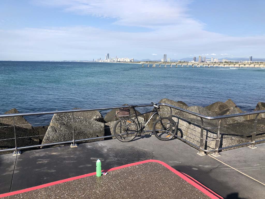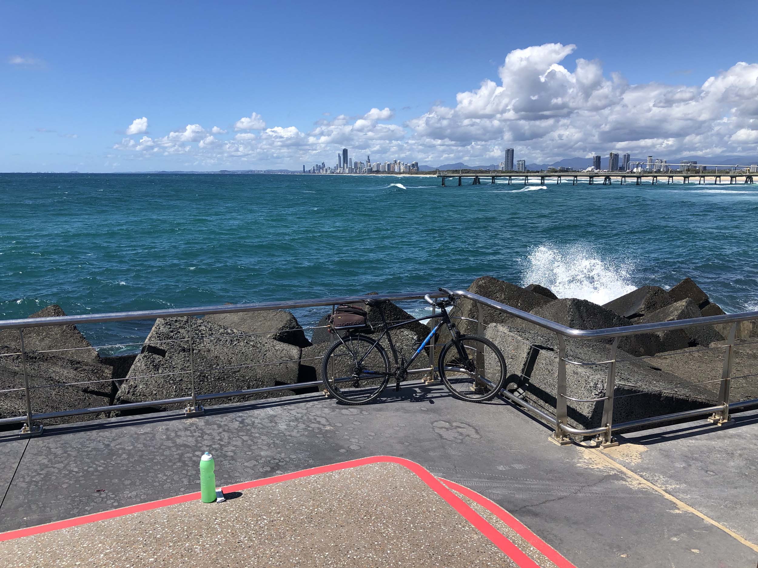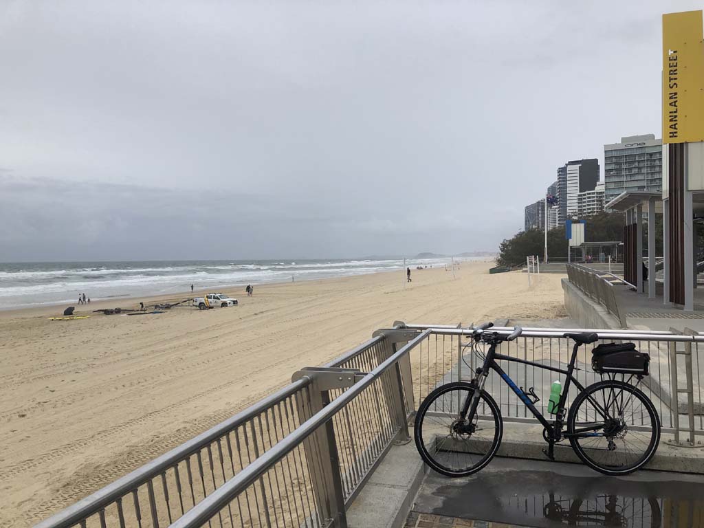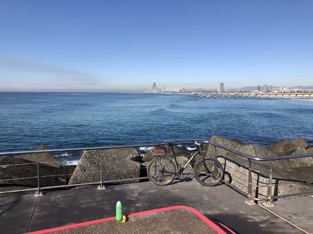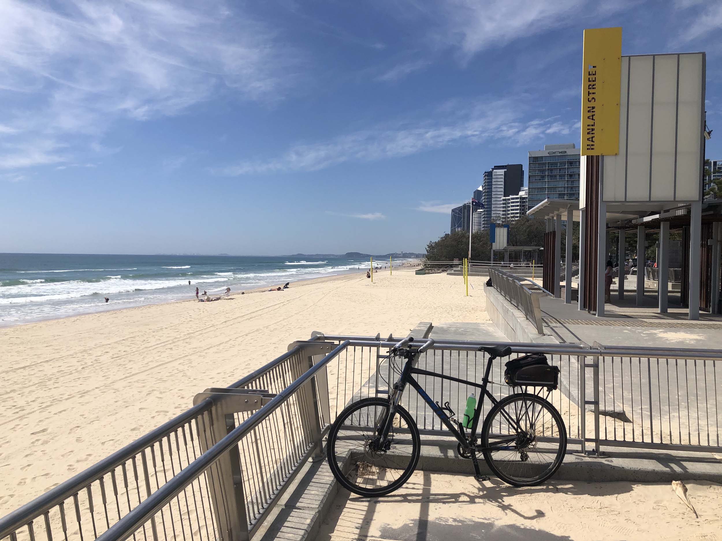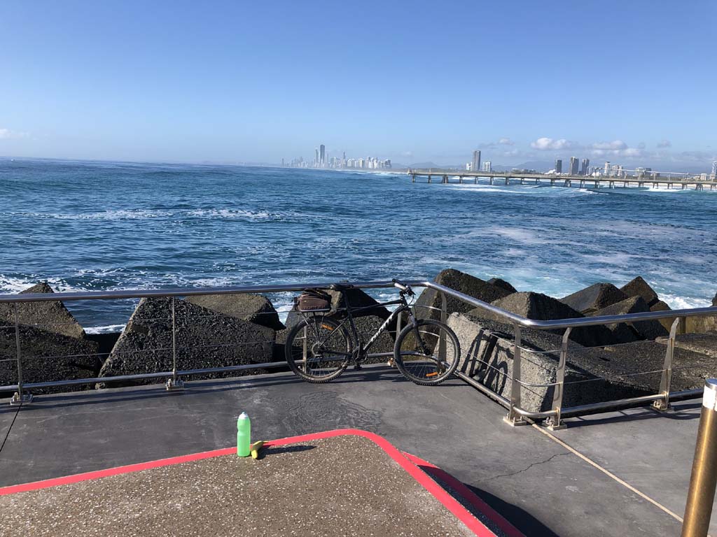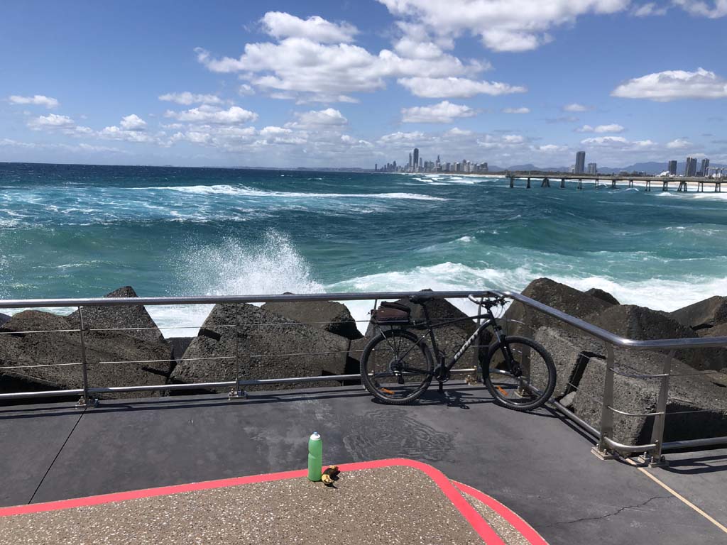 Home to Turnaround Pt down to Surfers via GC600 Park to Surfers to The Spit (both ends - twice) then back through GC600 Park back to Cafe Rockpool and finally back Home about 50+kms.