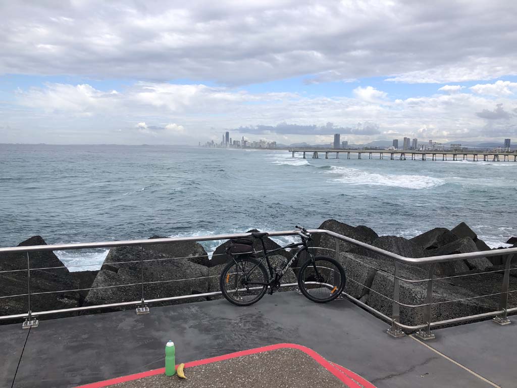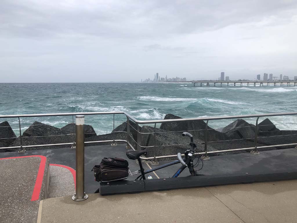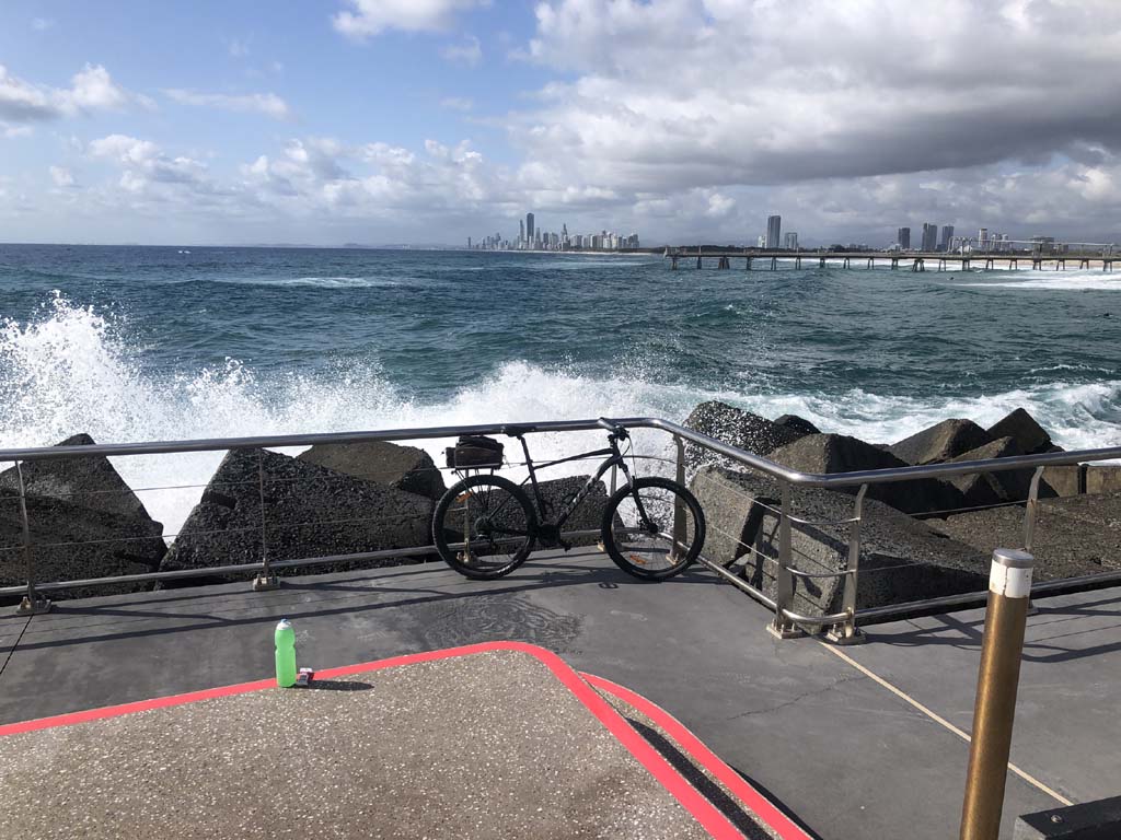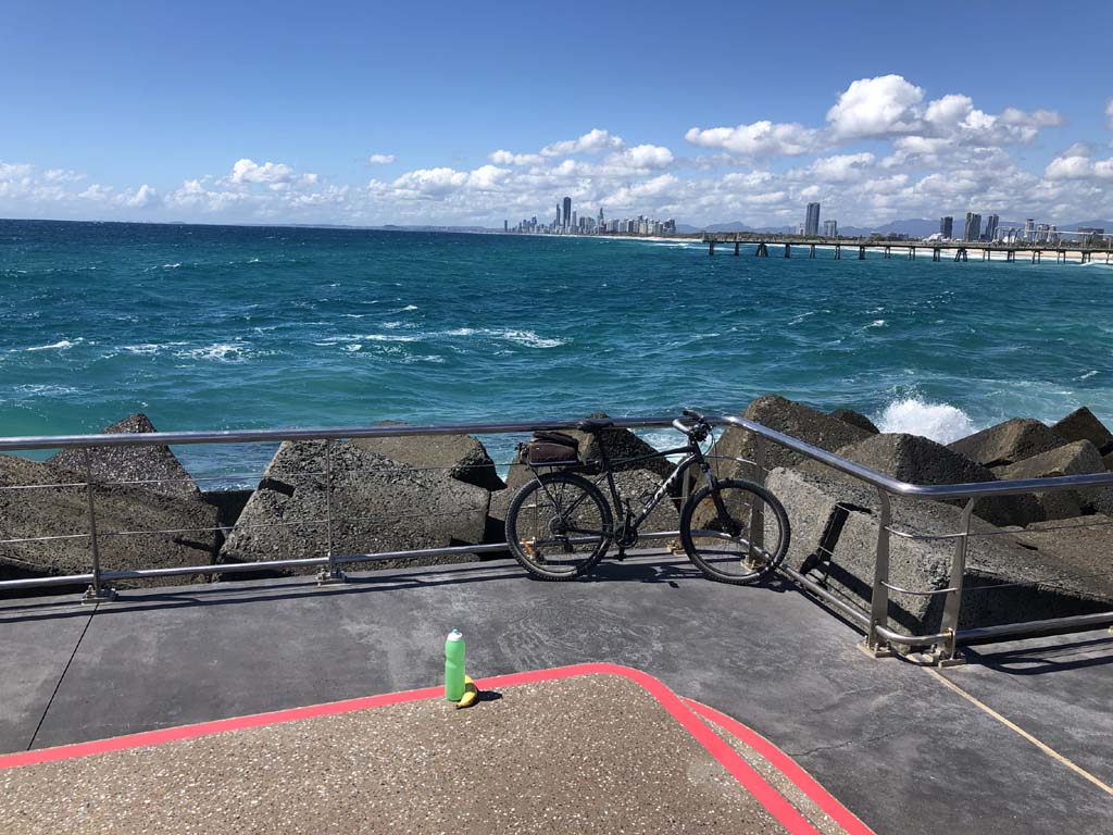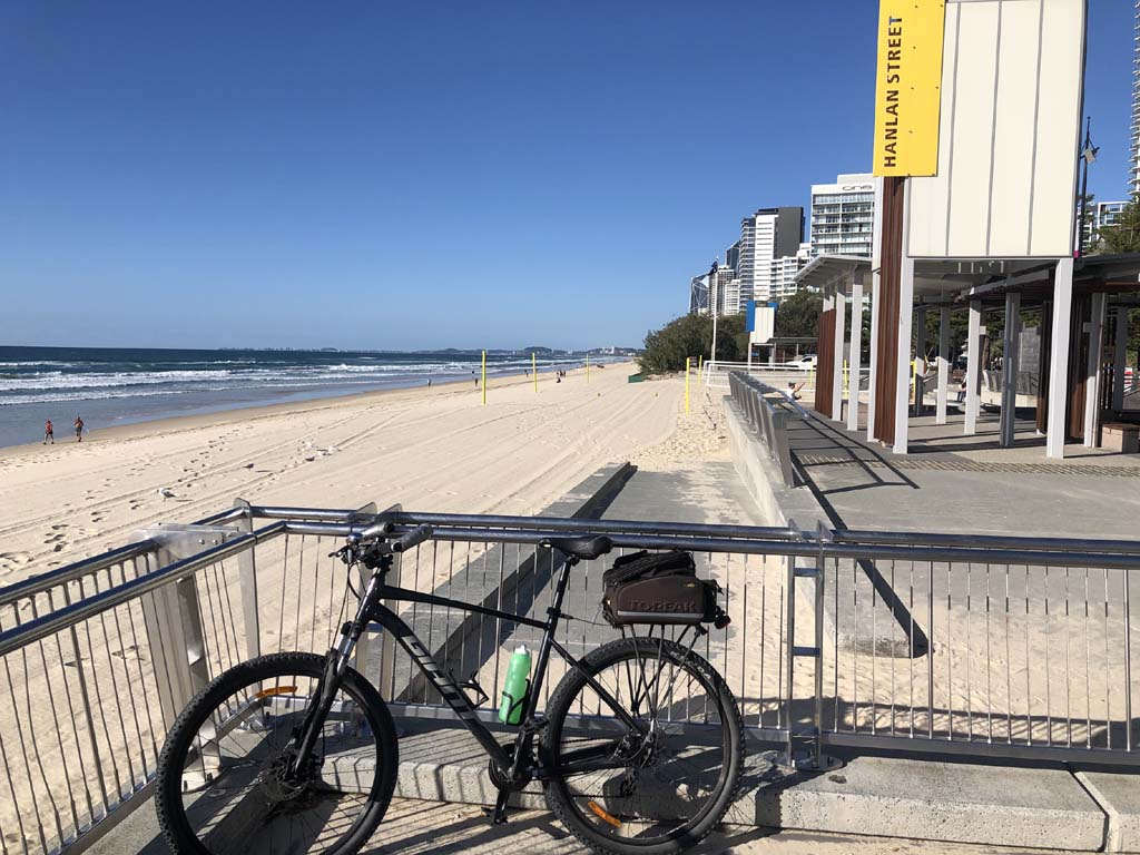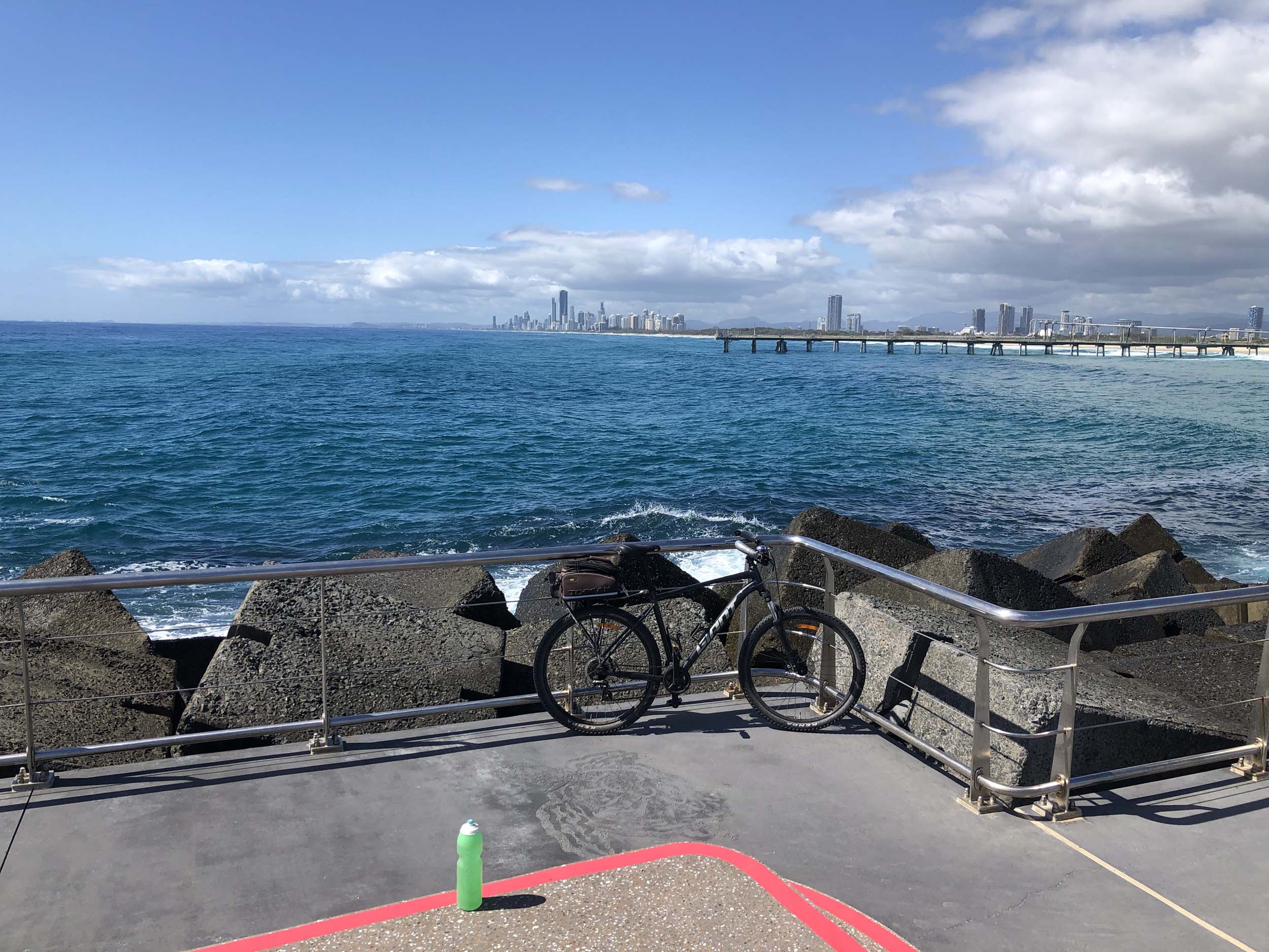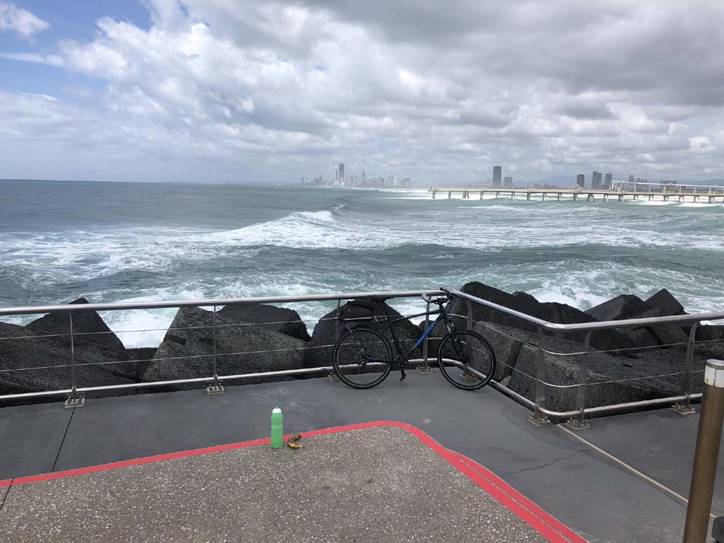 Home to Turnaround Pt down to Surfers via GC600 Park to Surfers to The Spit (both ends - twice) then back through GC600 Park back to Cafe Rockpool and finally back Home about 50+kms.