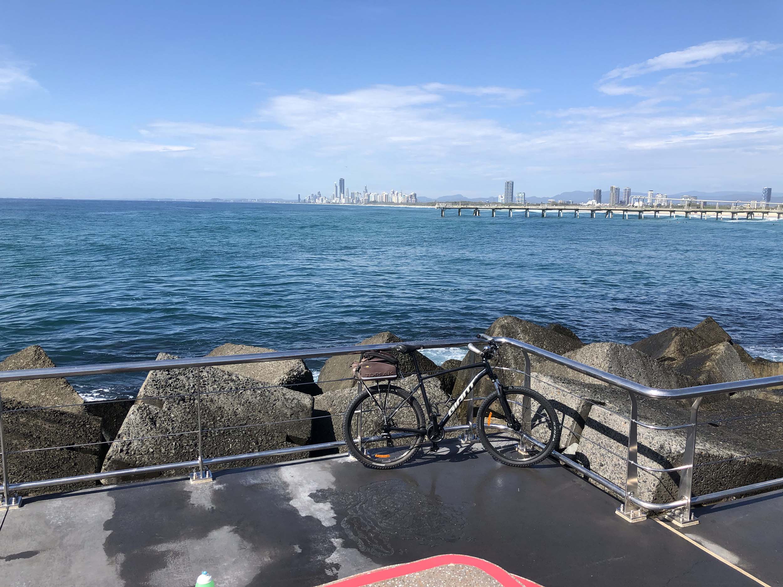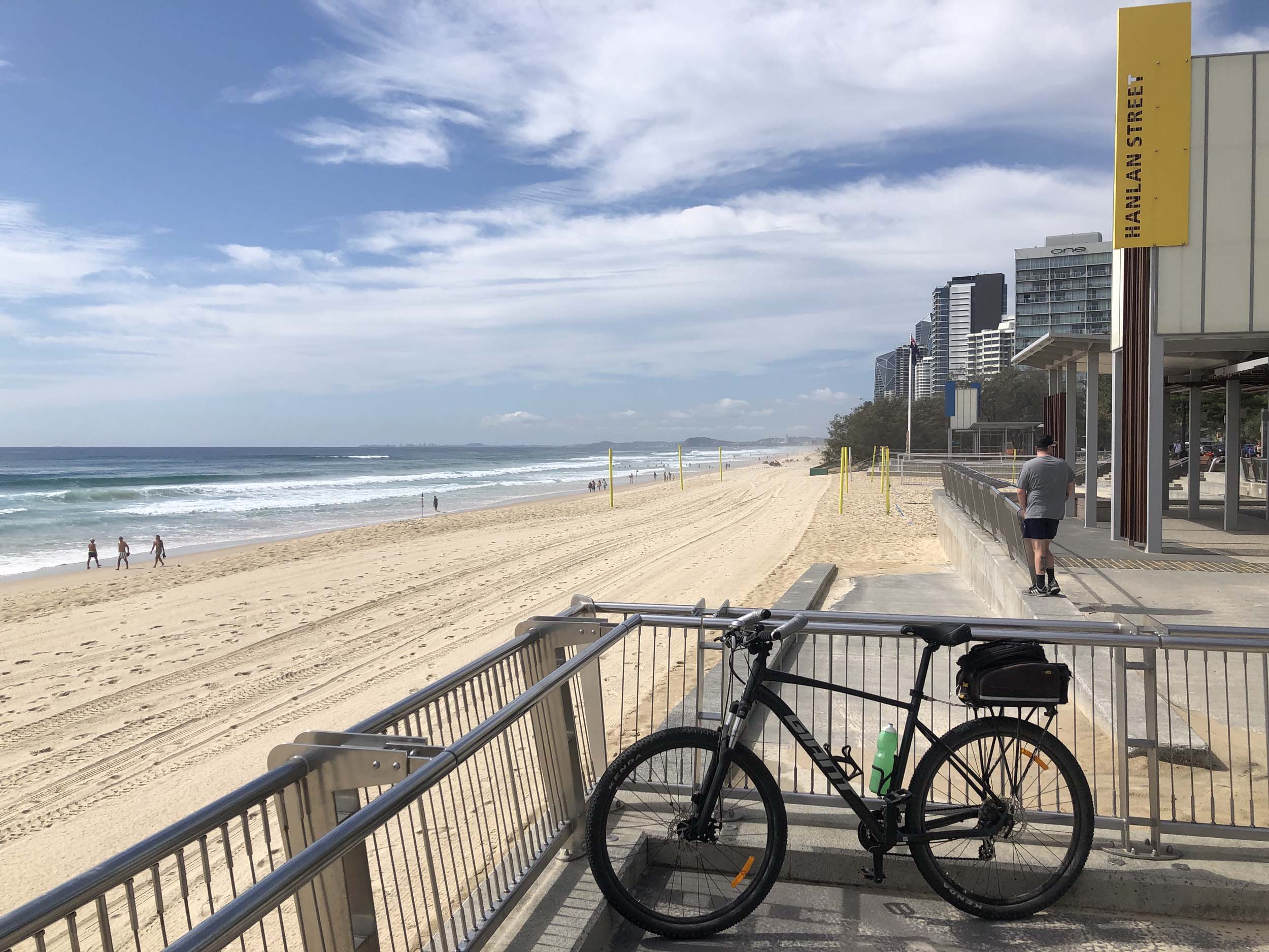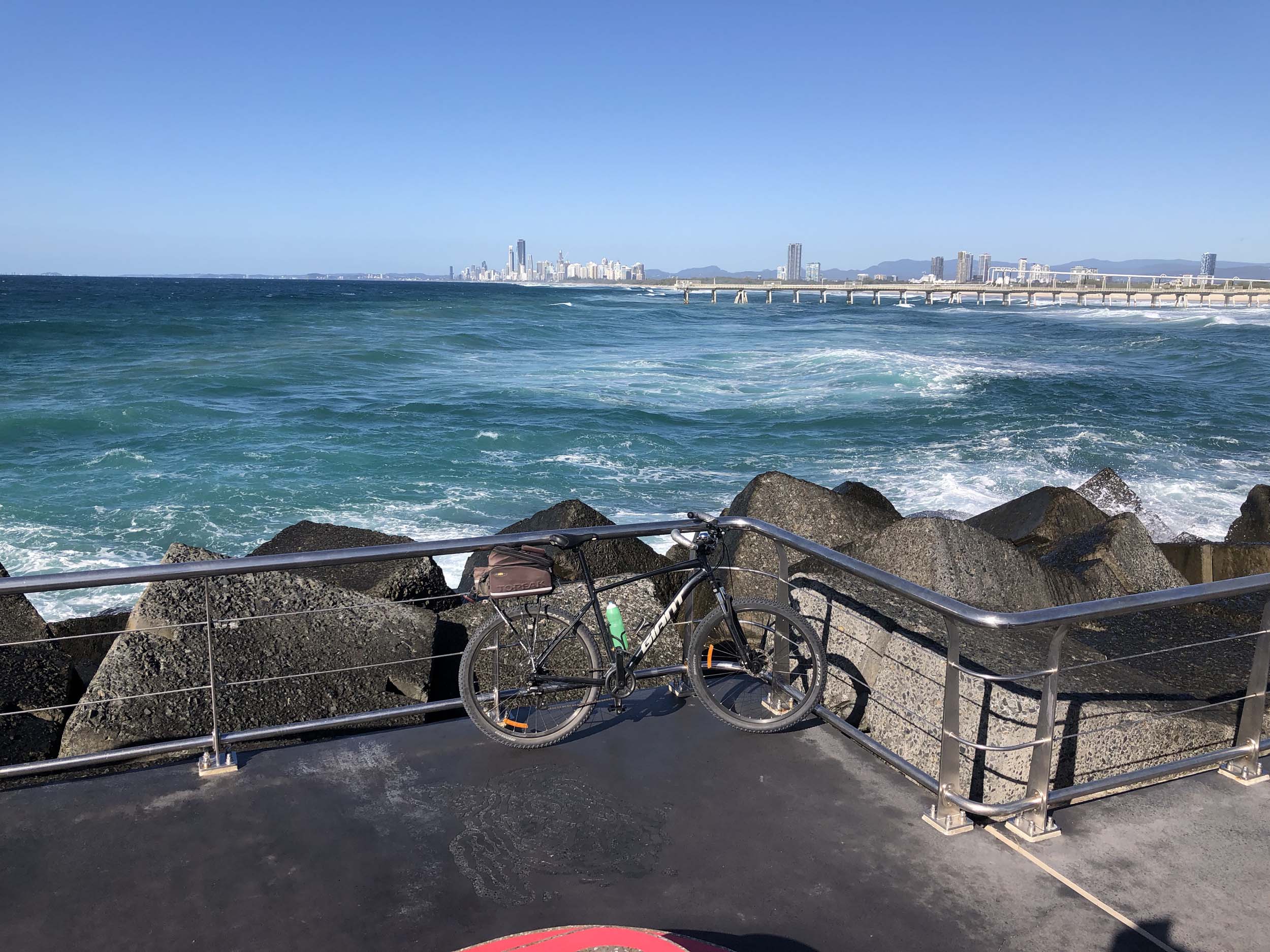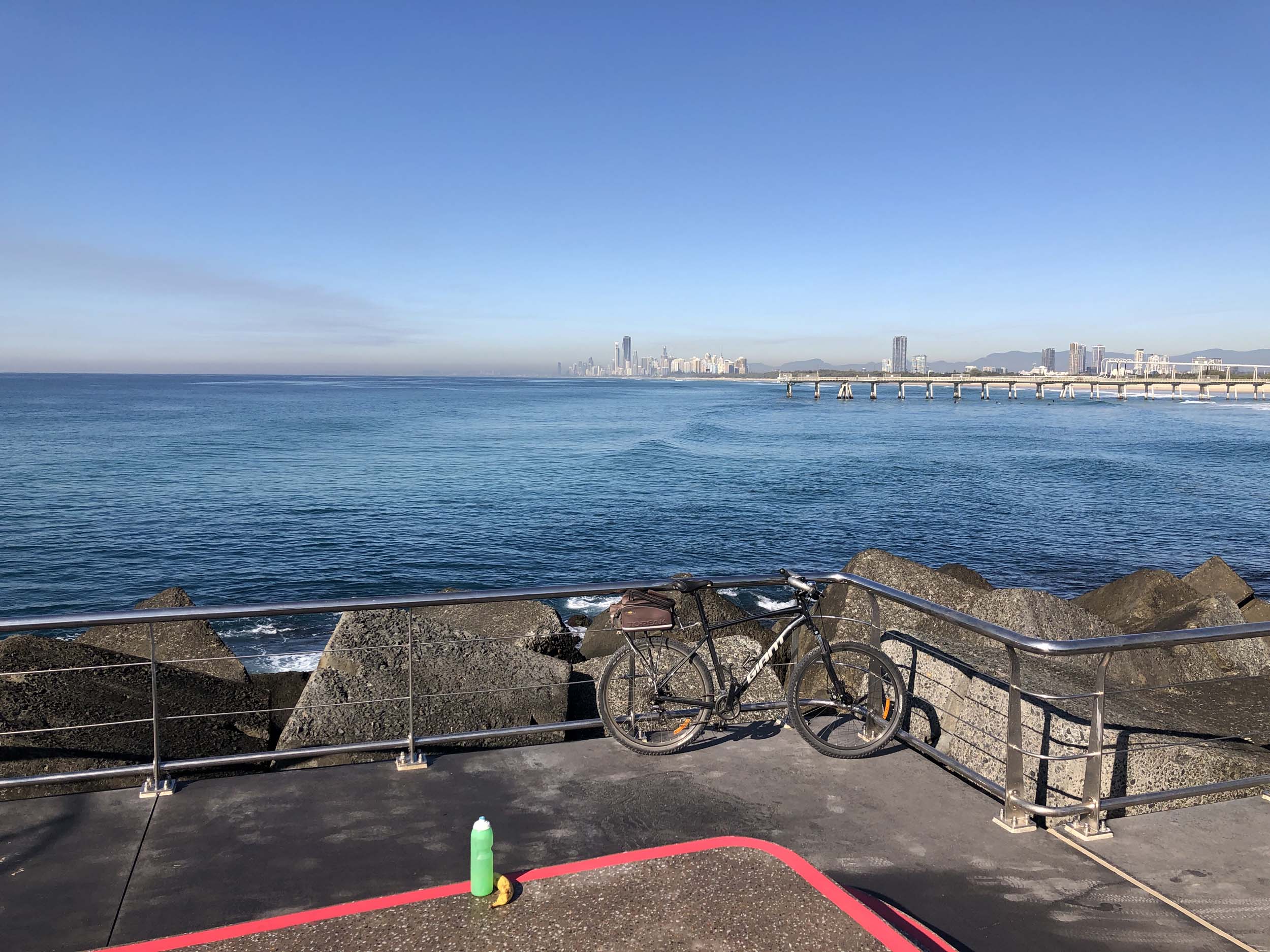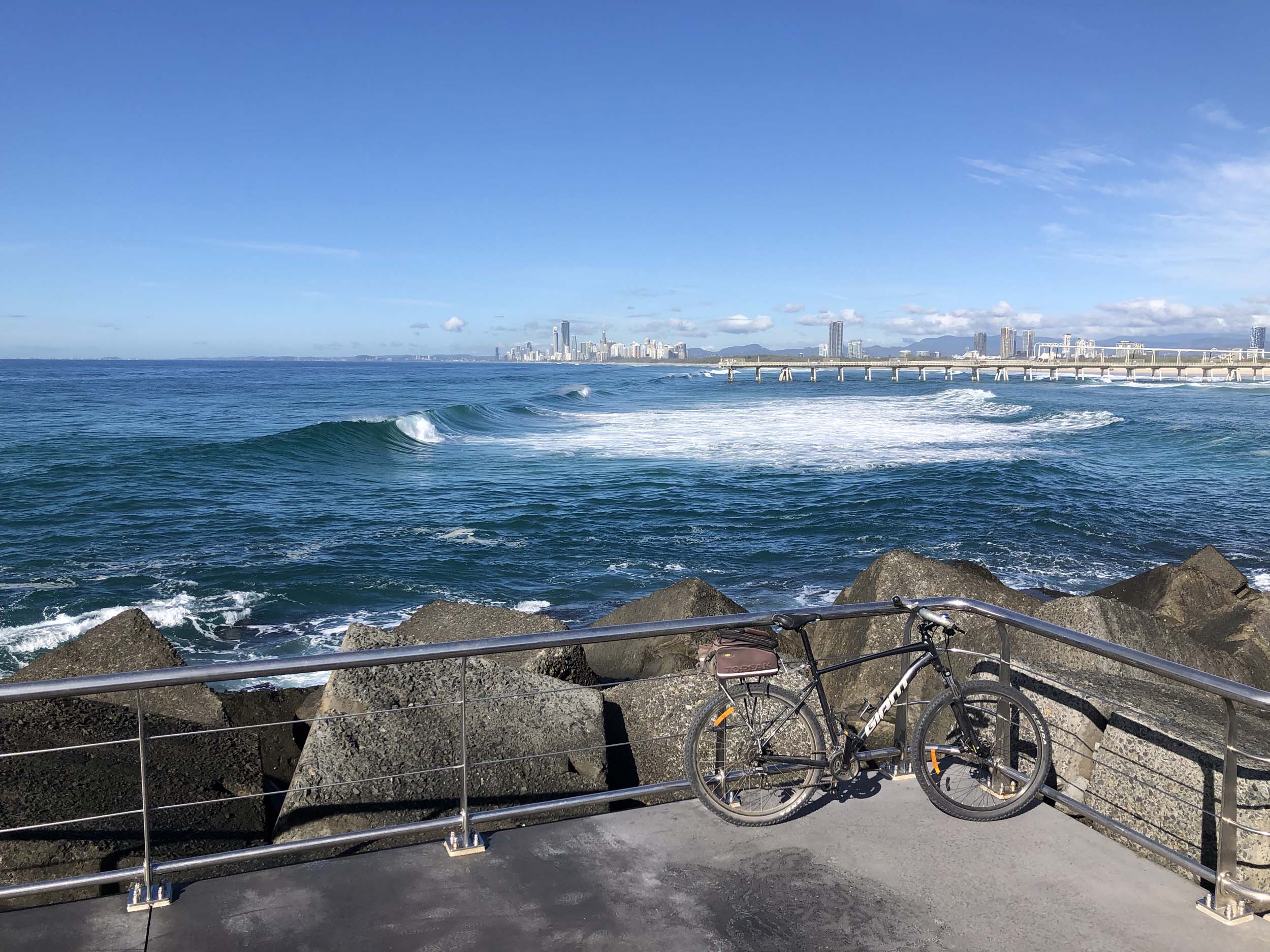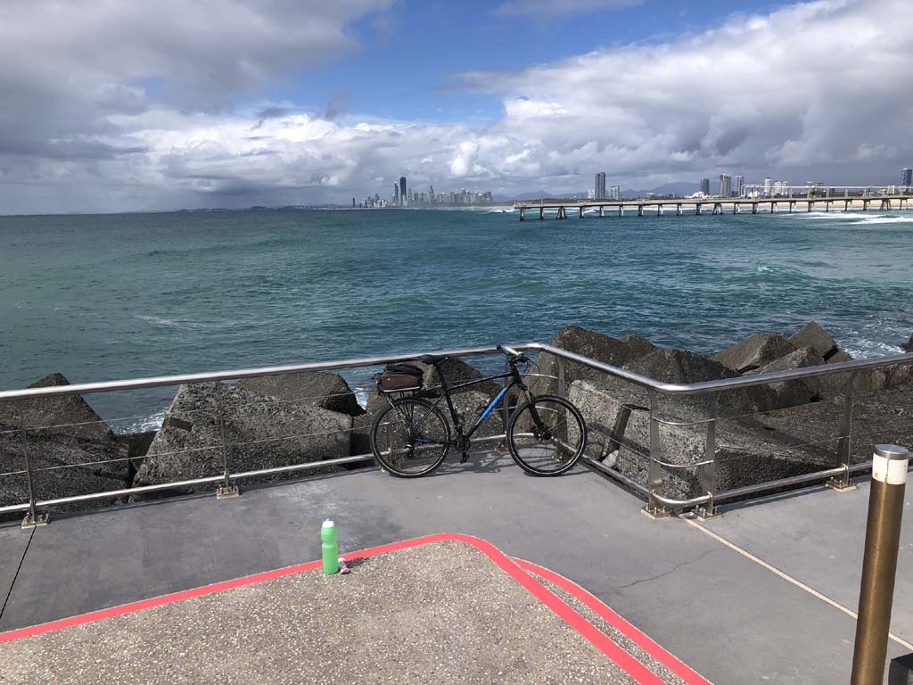 Home to Turnaround Pt down to Surfers via GC600 Park to Surfers to The Spit (both ends - twice) then back through GC600 Park back to Cafe Rockpool and finally back Home about 50+kms.