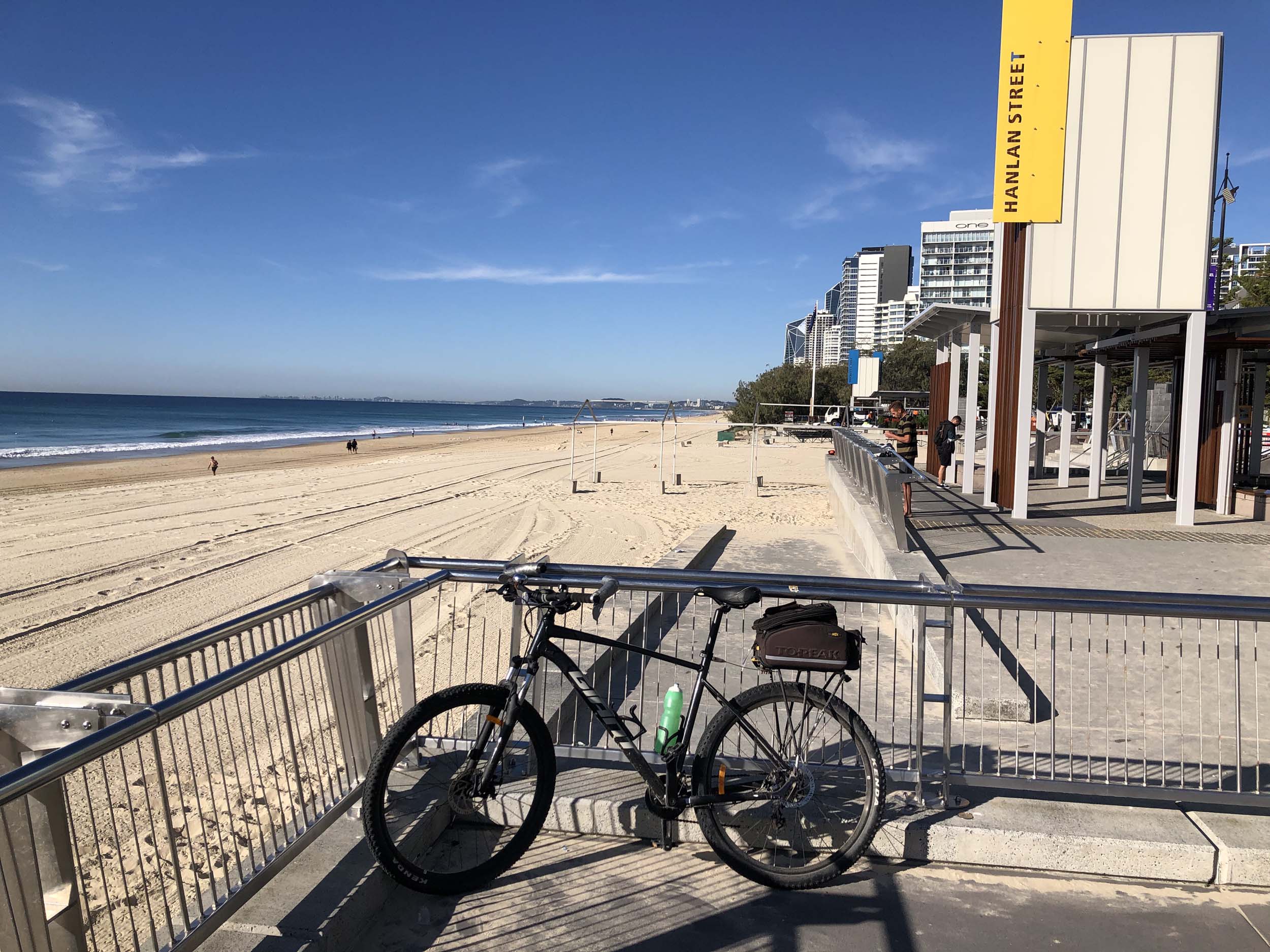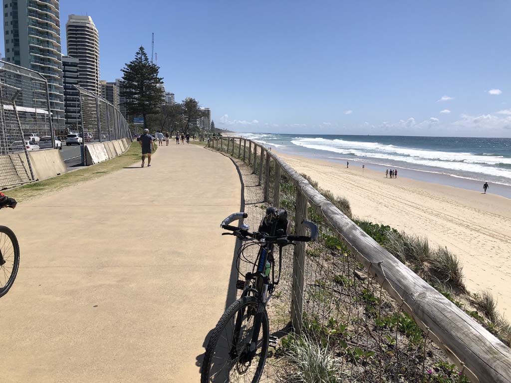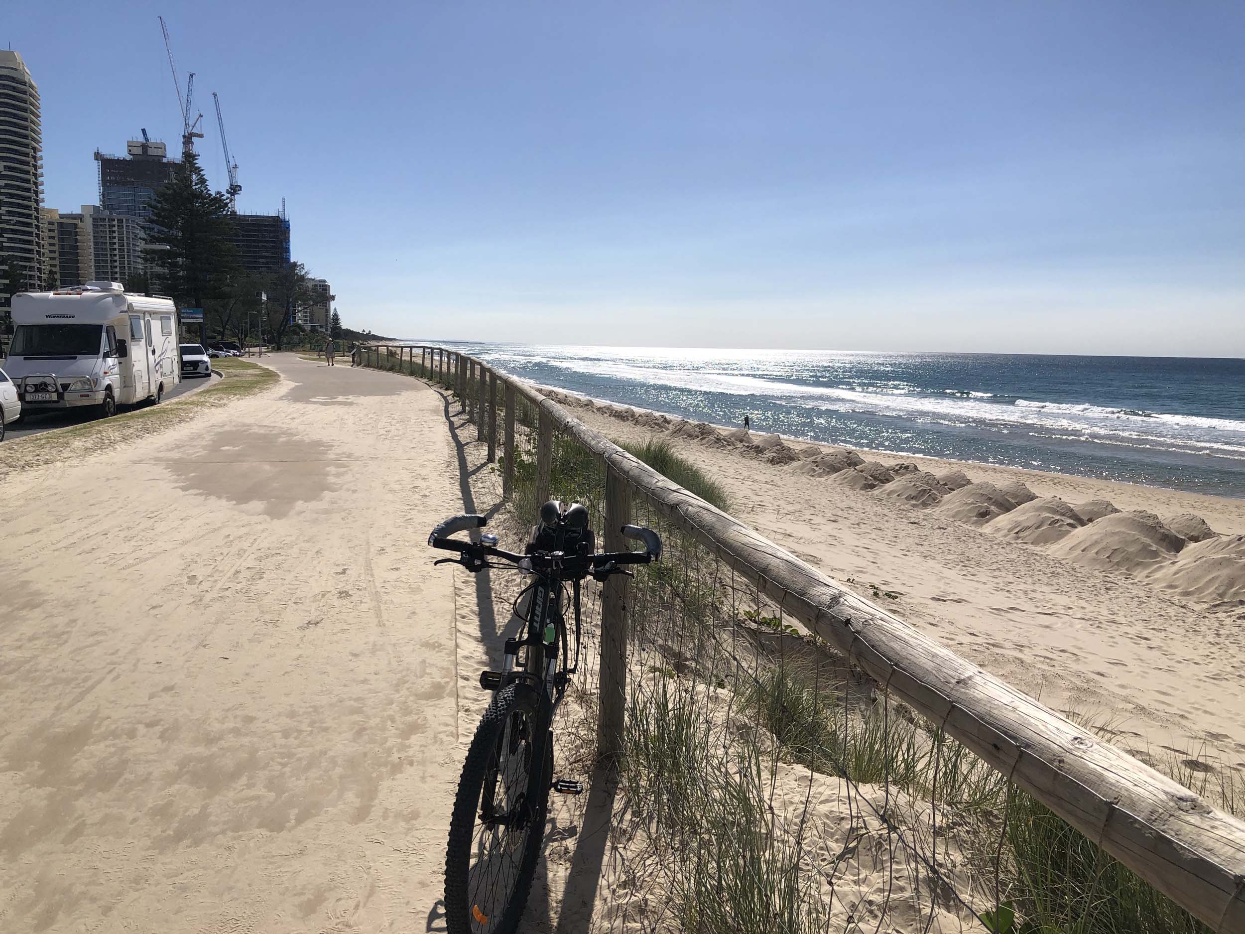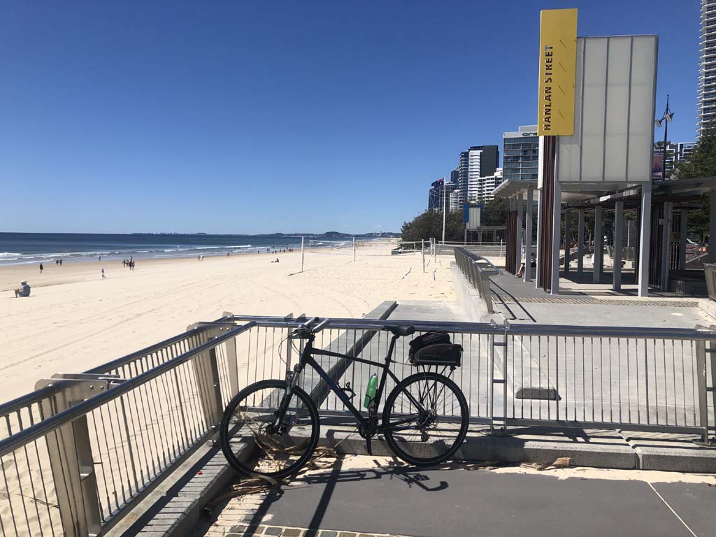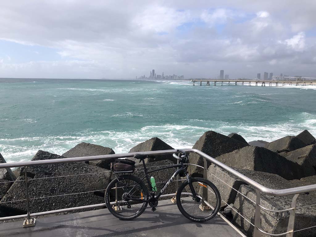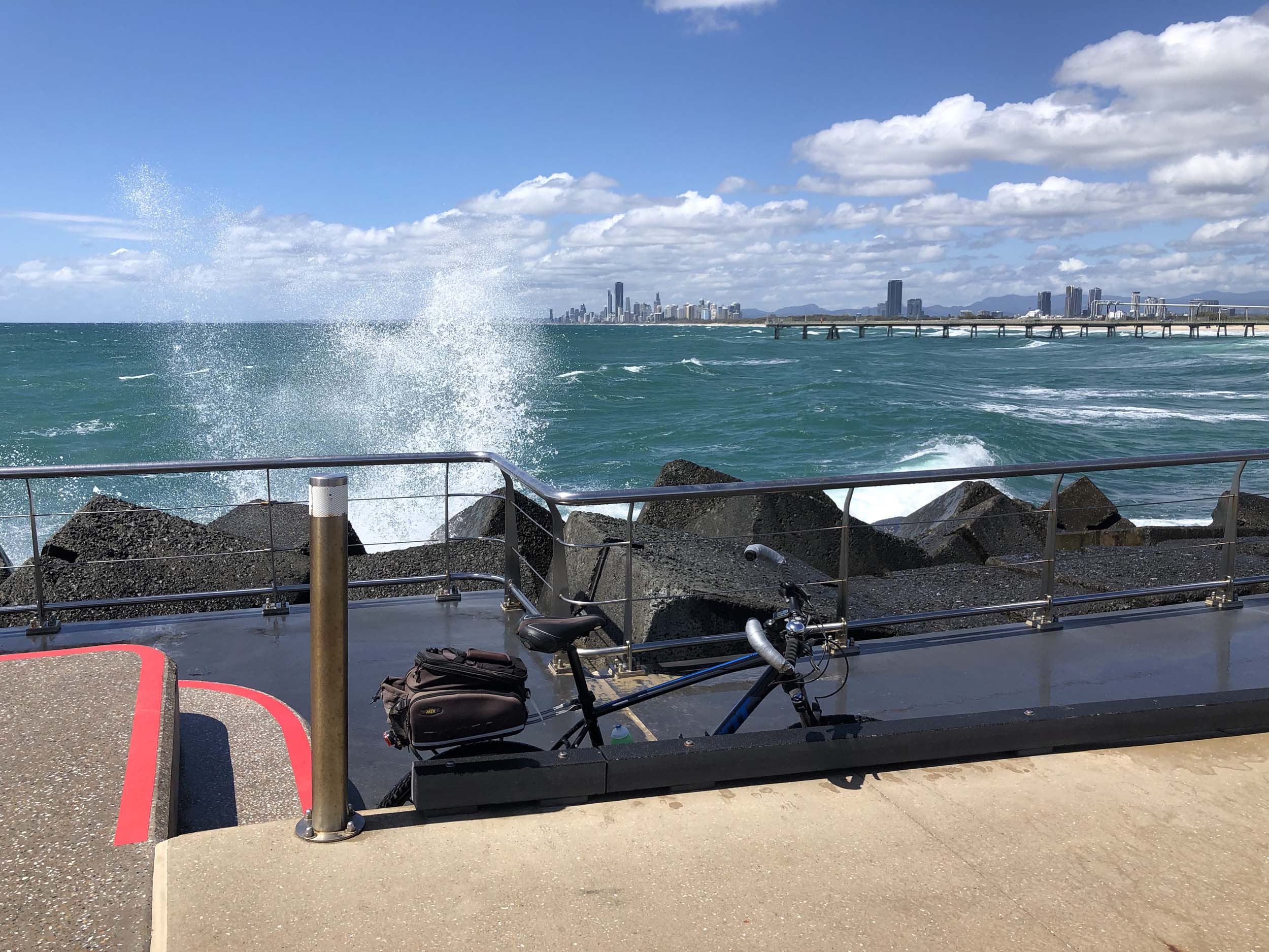 Home to Turnaround Pt down to Surfers via GC600 Park to Surfers to The Spit (both ends - twice) then back through GC600 Park back to Cafe Rockpool and finally back Home about 50+kms.