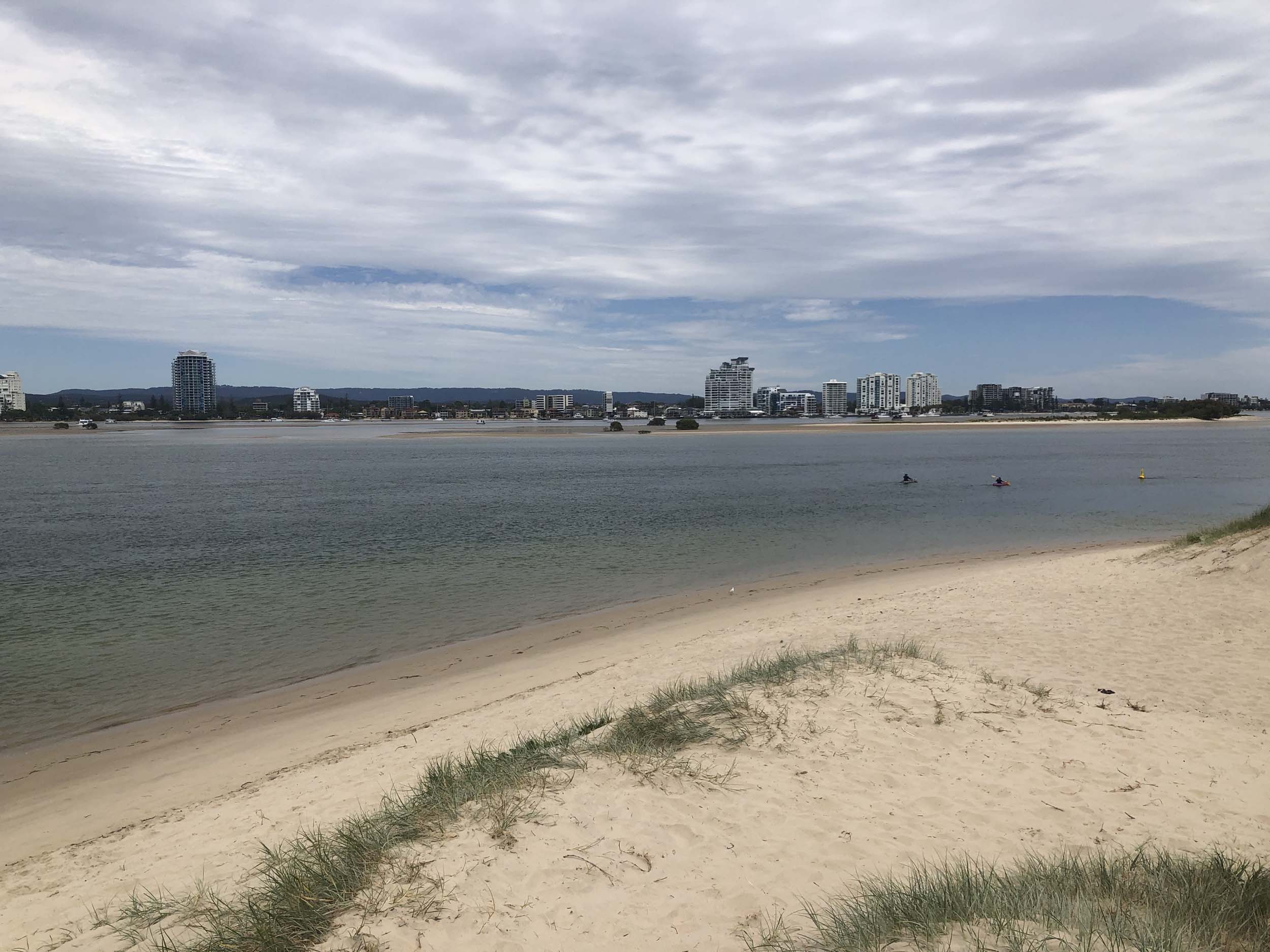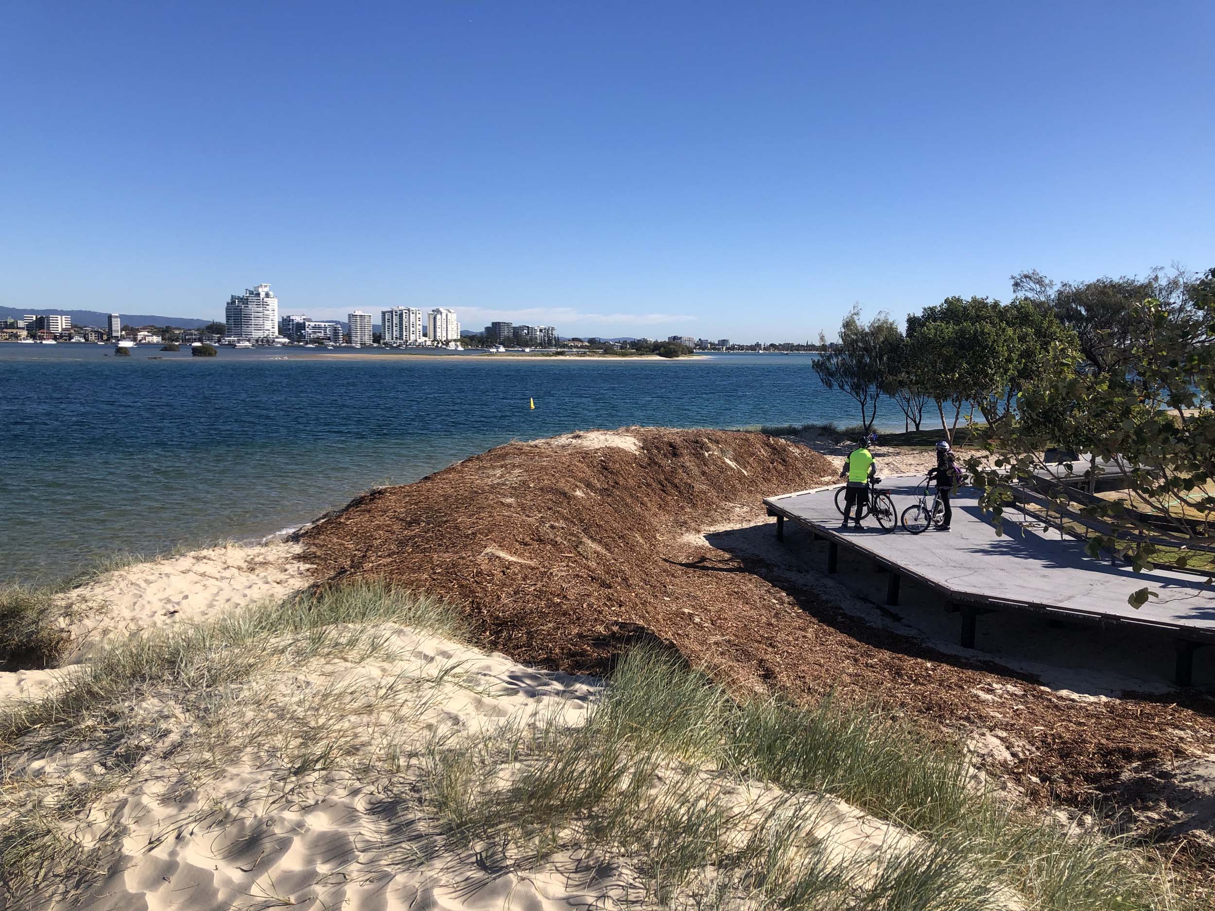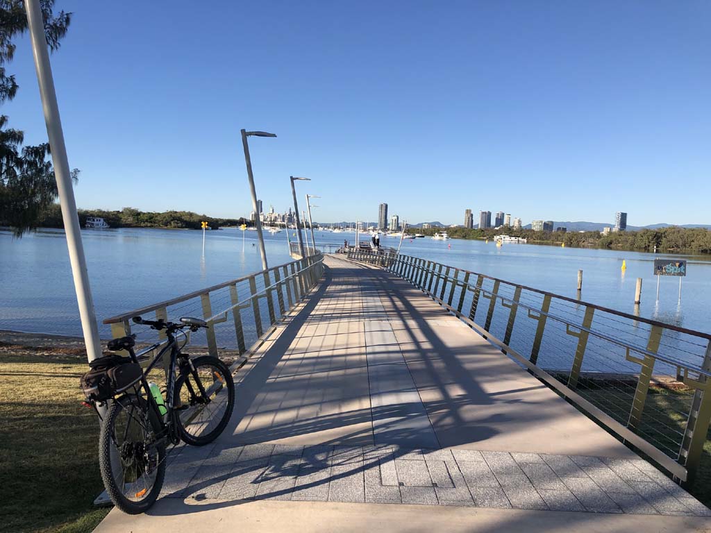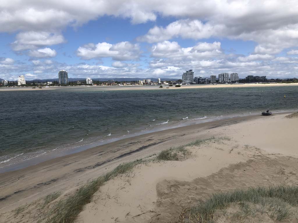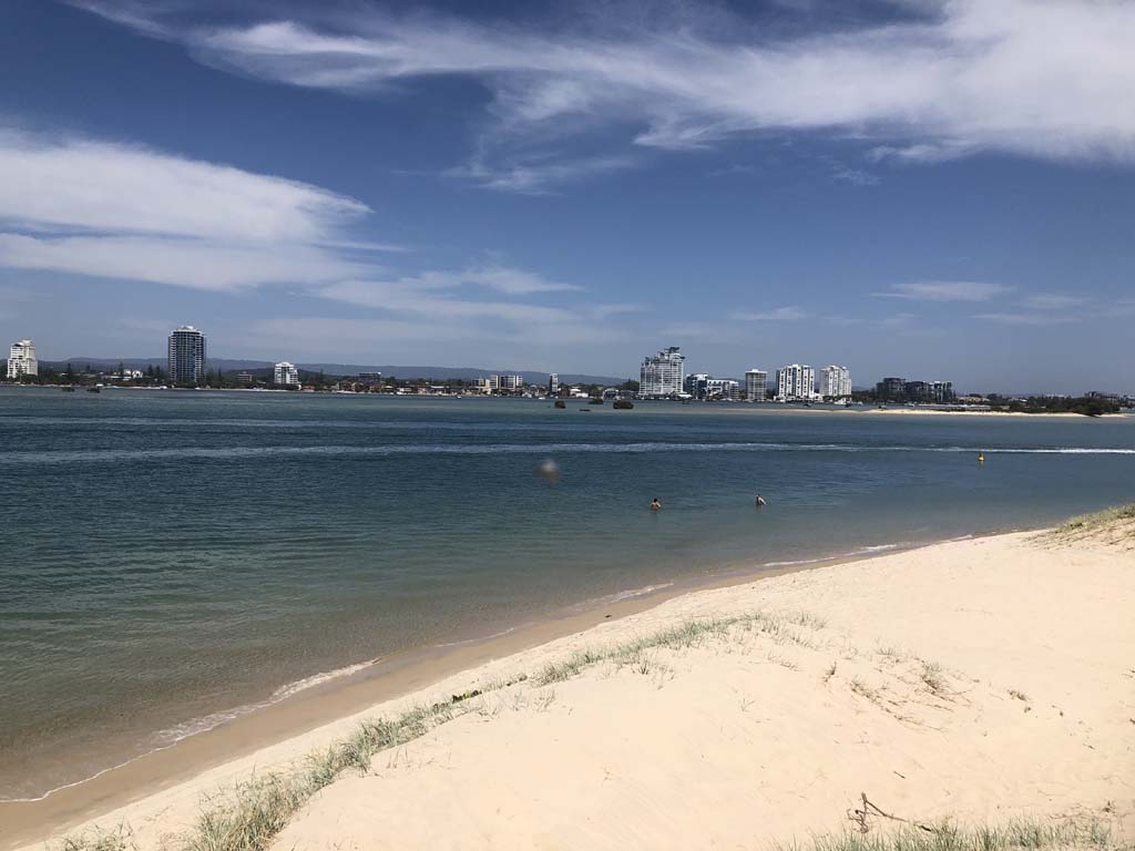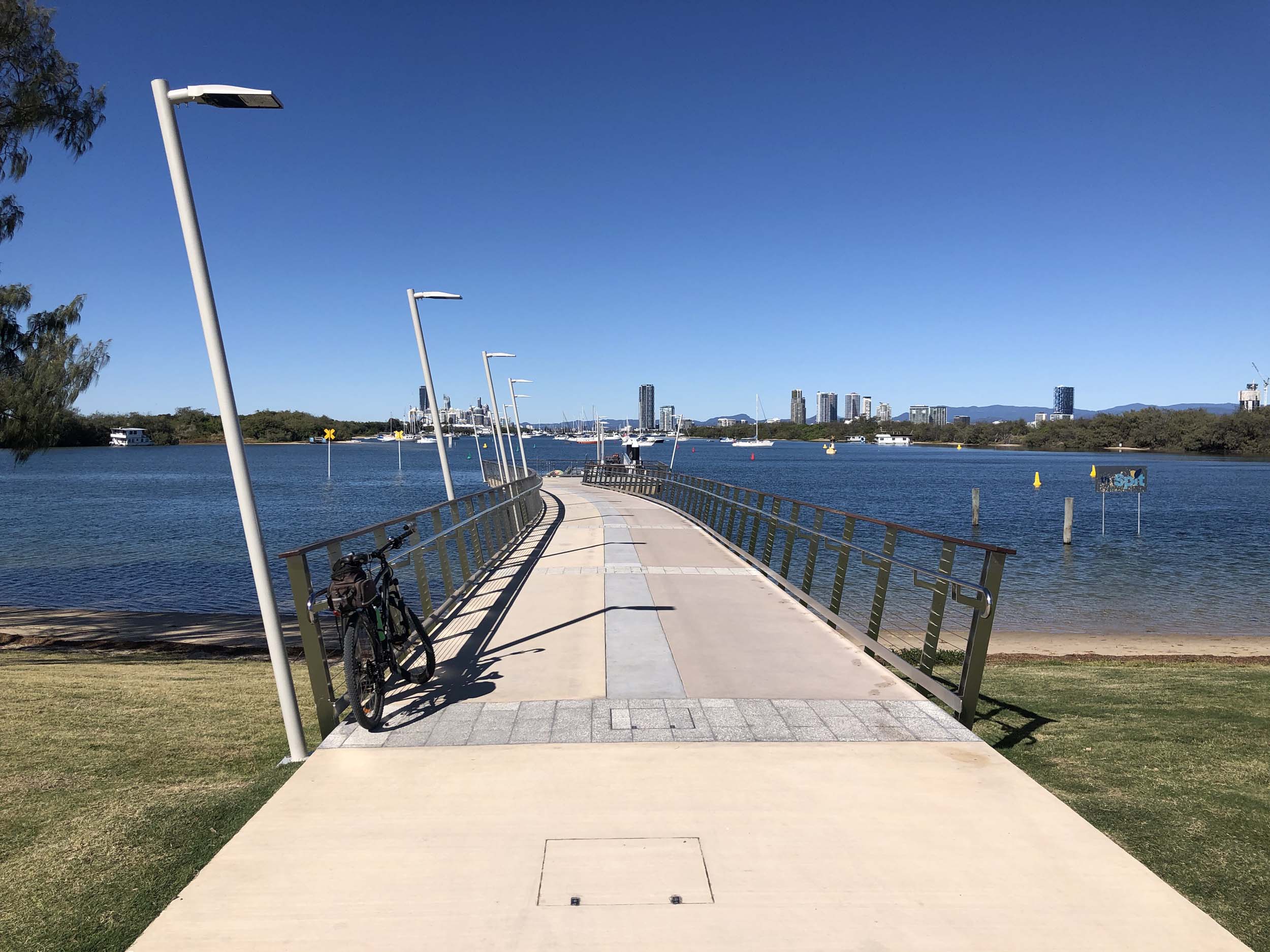 So over the Sundale Bridge, turned left and then along the Shared Path, through the Seaworld carpark, then through the Muriel Henchman Park and off to The Spit.
