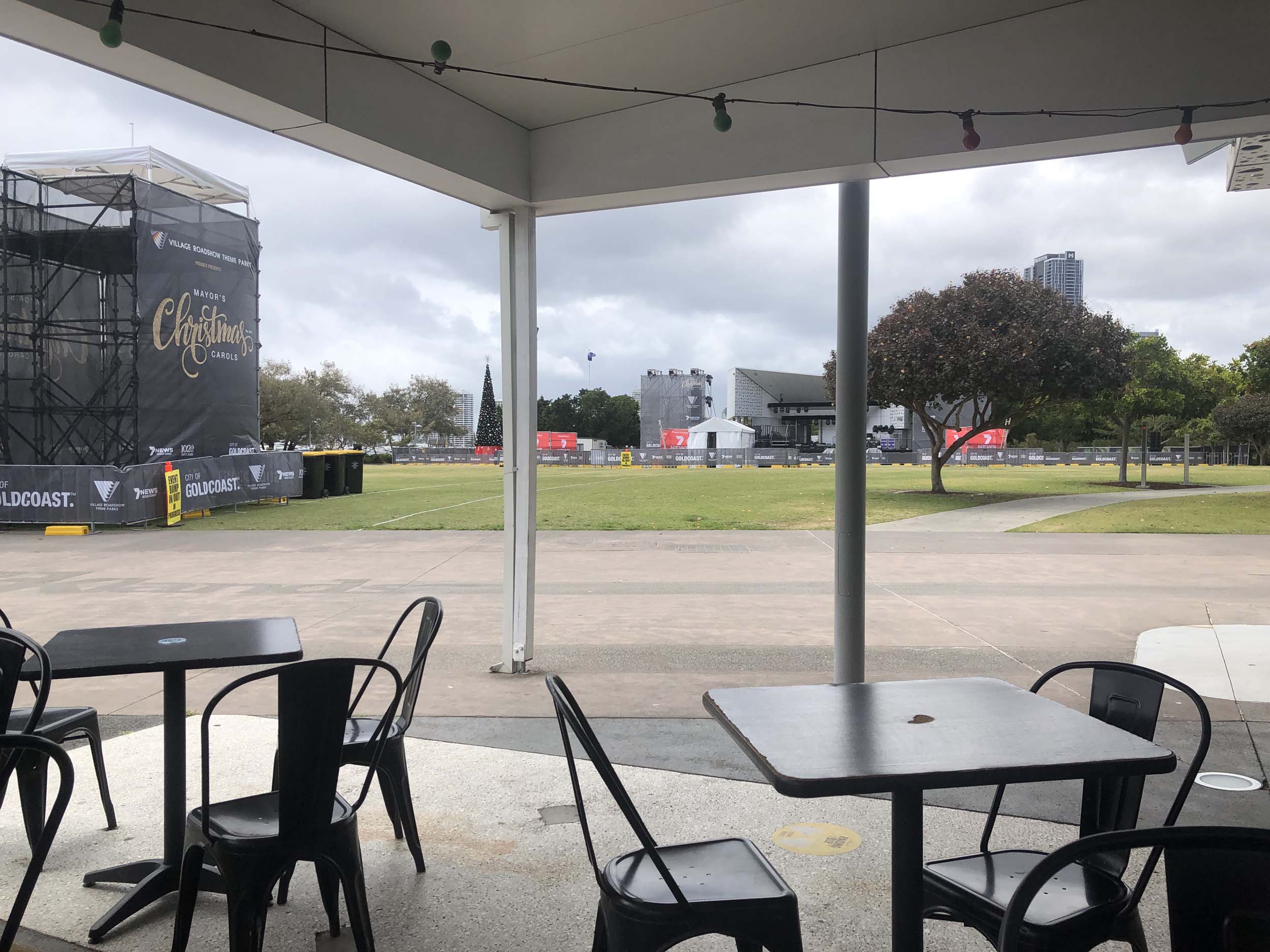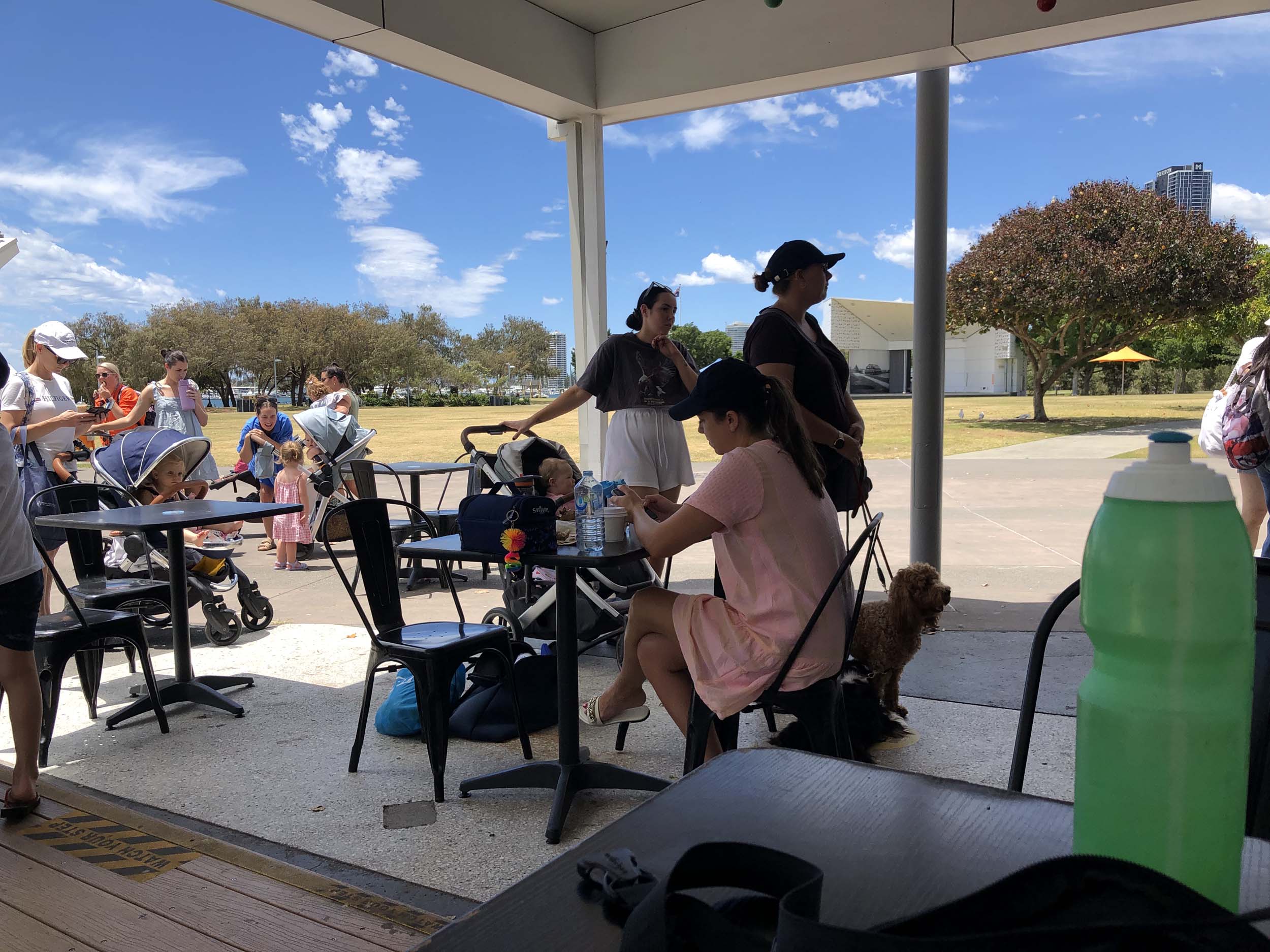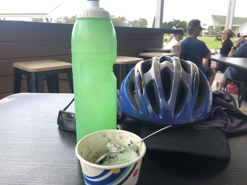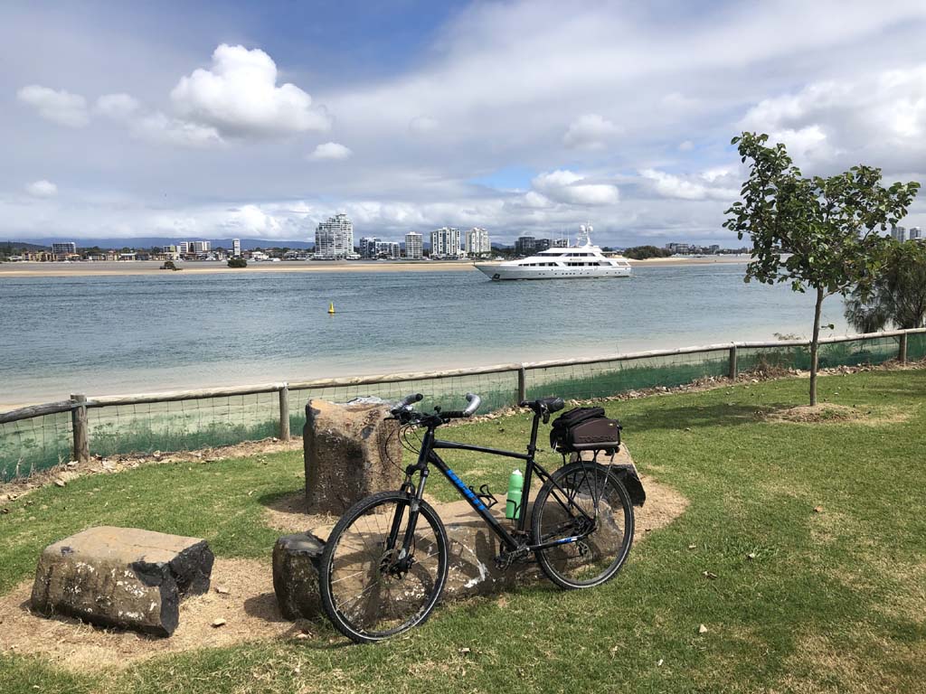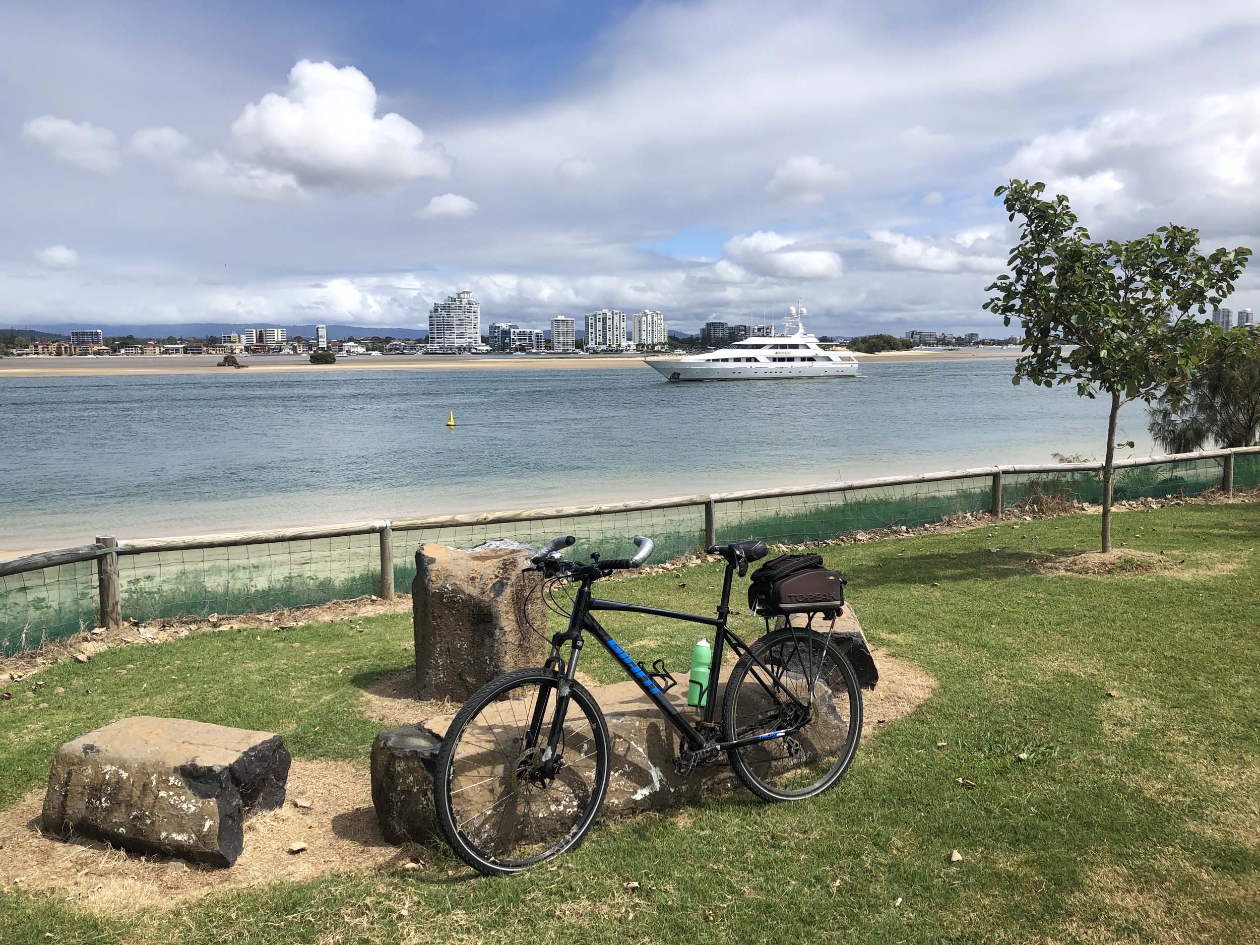 I left The Spit, and continued along the Shared Path that runs beside Seaworld Drive, rode through Muriel Henchman park, did a lap of the Seaworld carpark, then headed directly to Cafe Rockpool.
