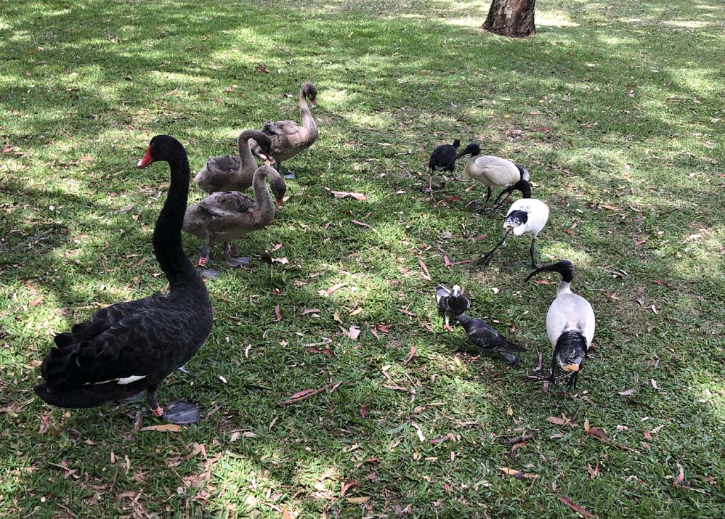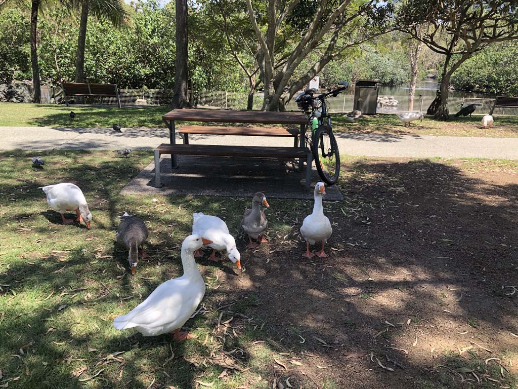I left The Spit, and continued along the Shared Path that runs beside Seaworld Drive, rode through Muriel Henchman park, did a lap of the Seaworld carpark, then rode around Marina Mirage, past Helitours which is on the jetty. Continued back to MacIntosh Island, did another lap, and took some photos of Goosey Lucy and Swanny.