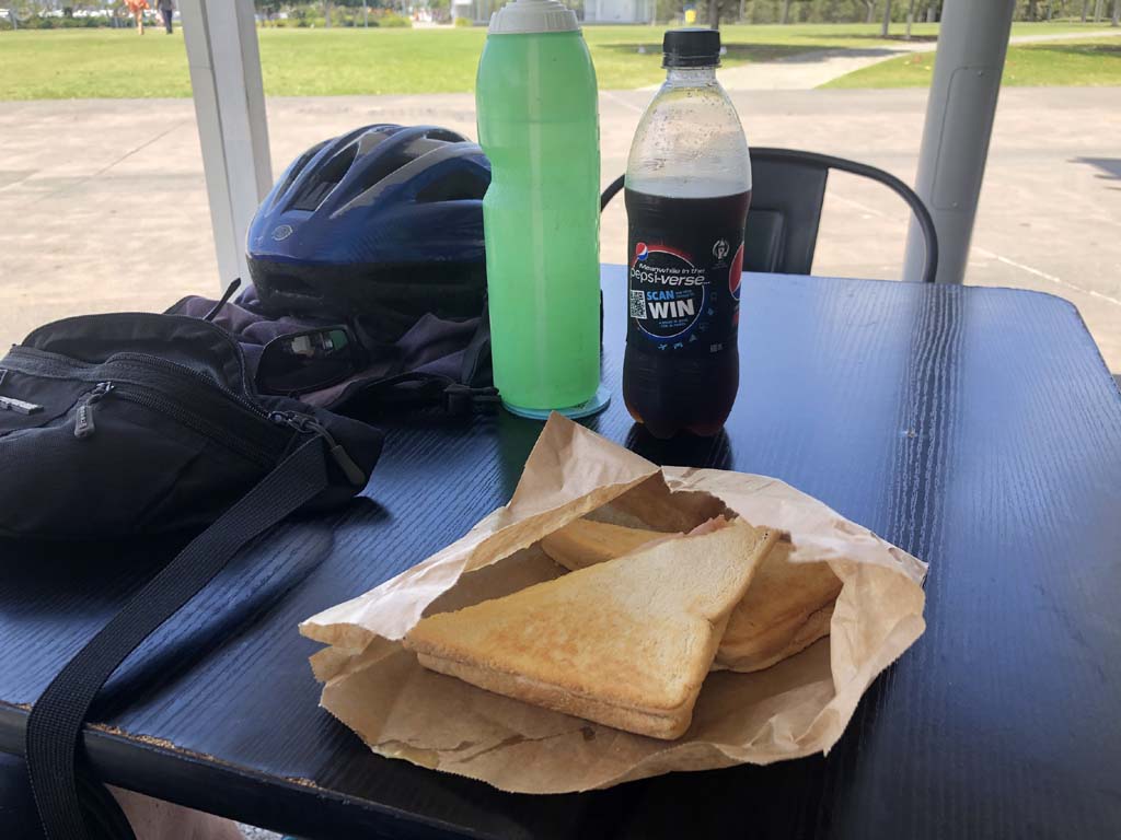 Run 3 laps of both Spits, took photos and ate my banana then headed back along the Shared path to Sundale Bridge before stopping at Cafe Rockpool. Stopped and ordered a ham and chees toastie and a Pepsi. It was YUMMA.