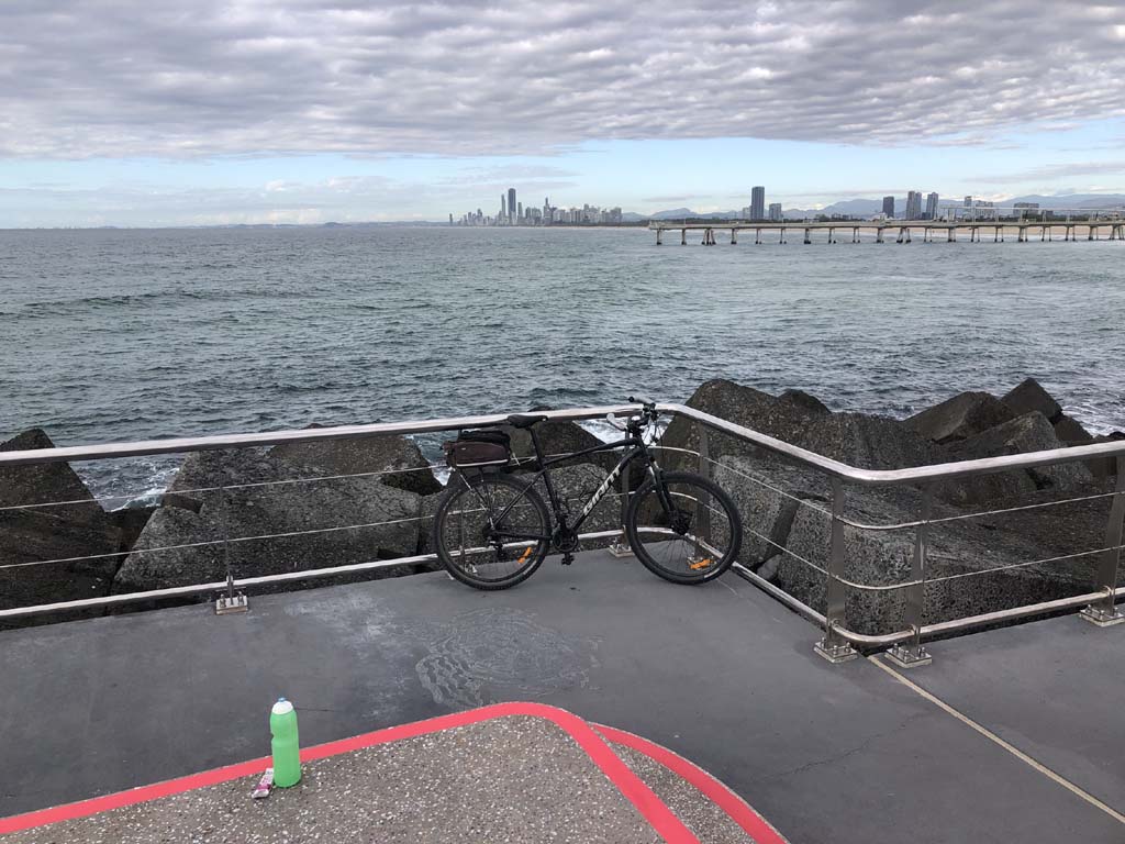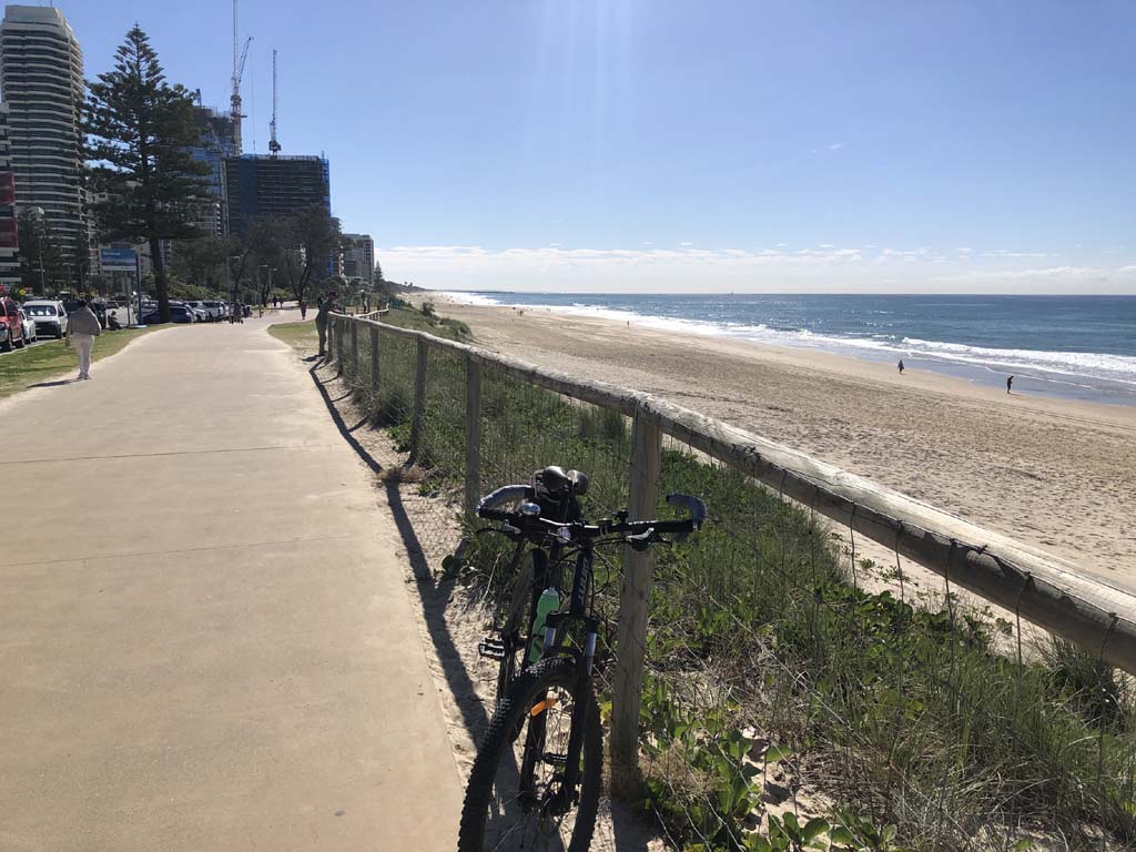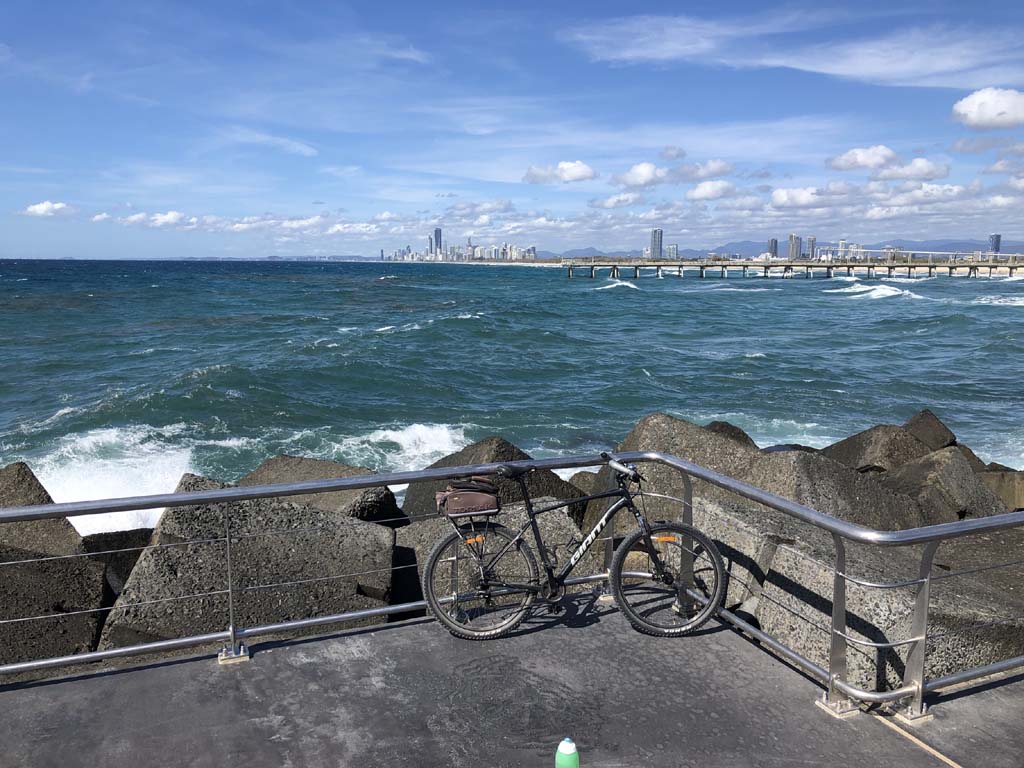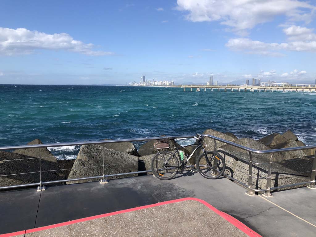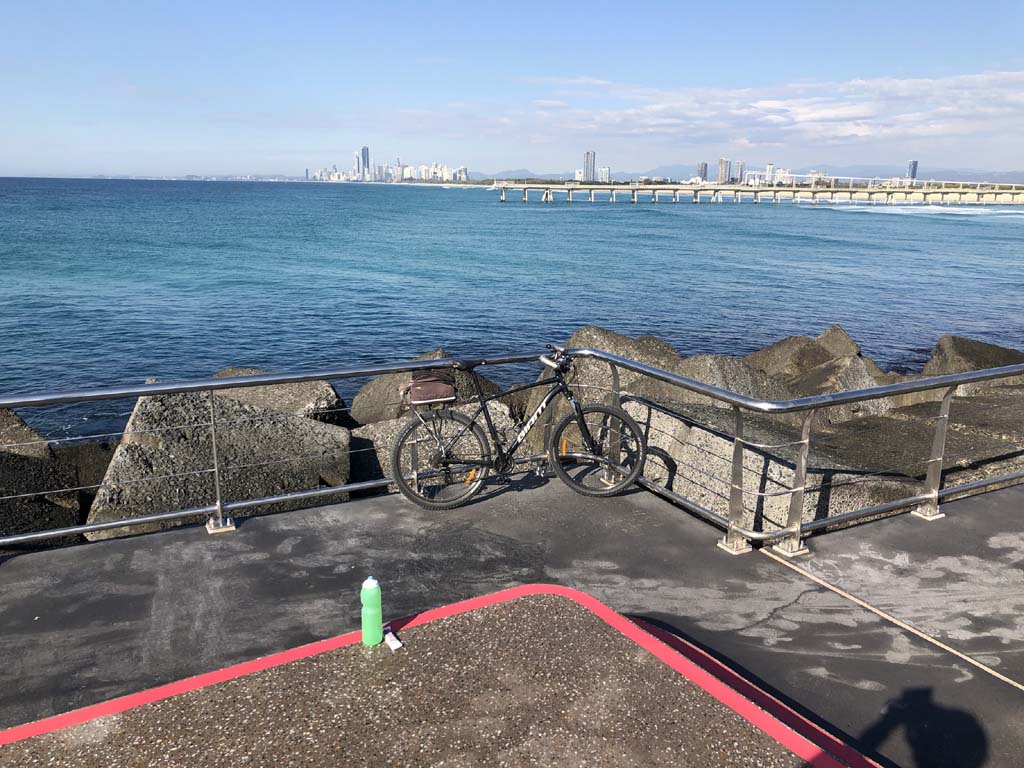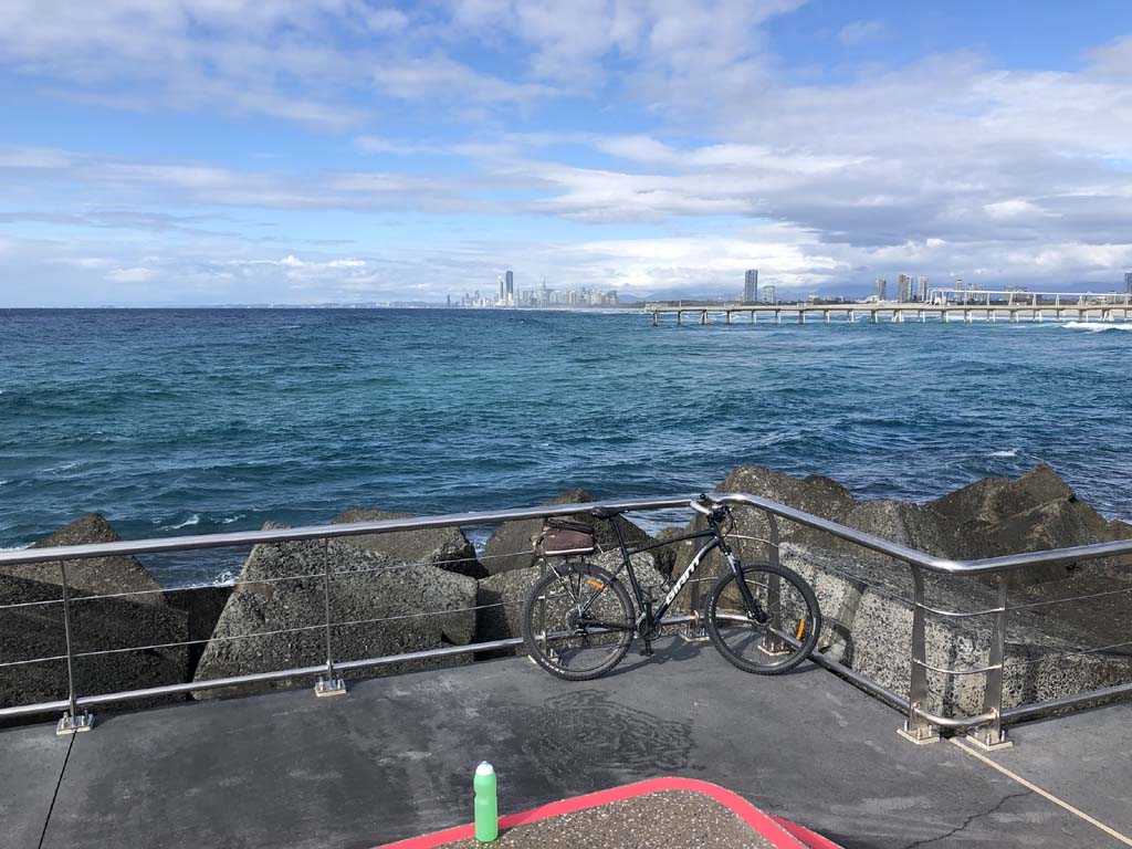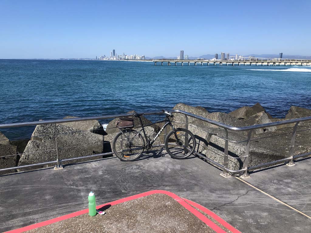 Home to Turnaround Pt down to Surfers via GC600 Park to Surfers to The Spit (both ends - twice) then back through GC600 Park back to Cafe Rockpool and finally back Home about 50+kms.