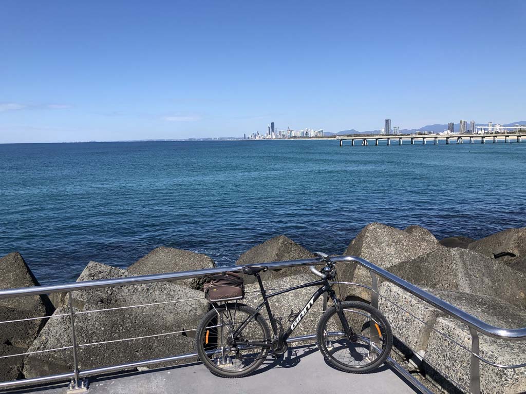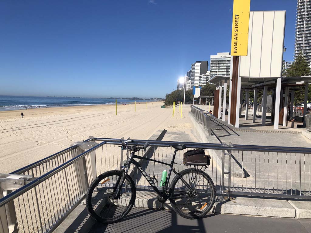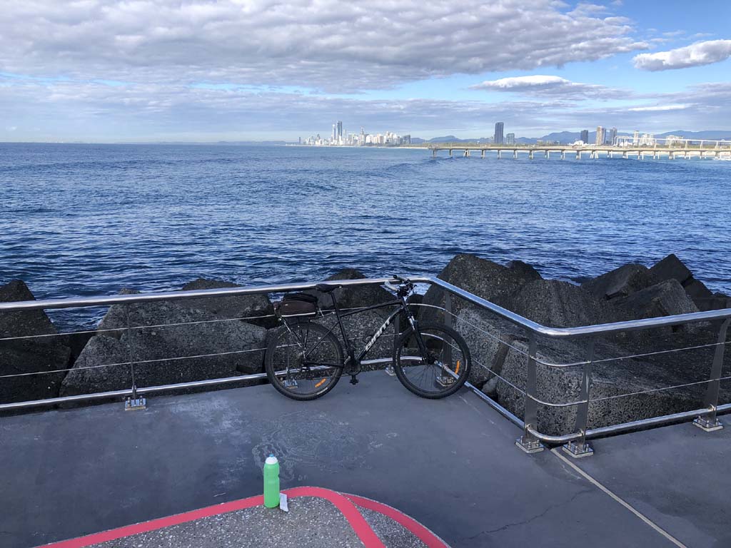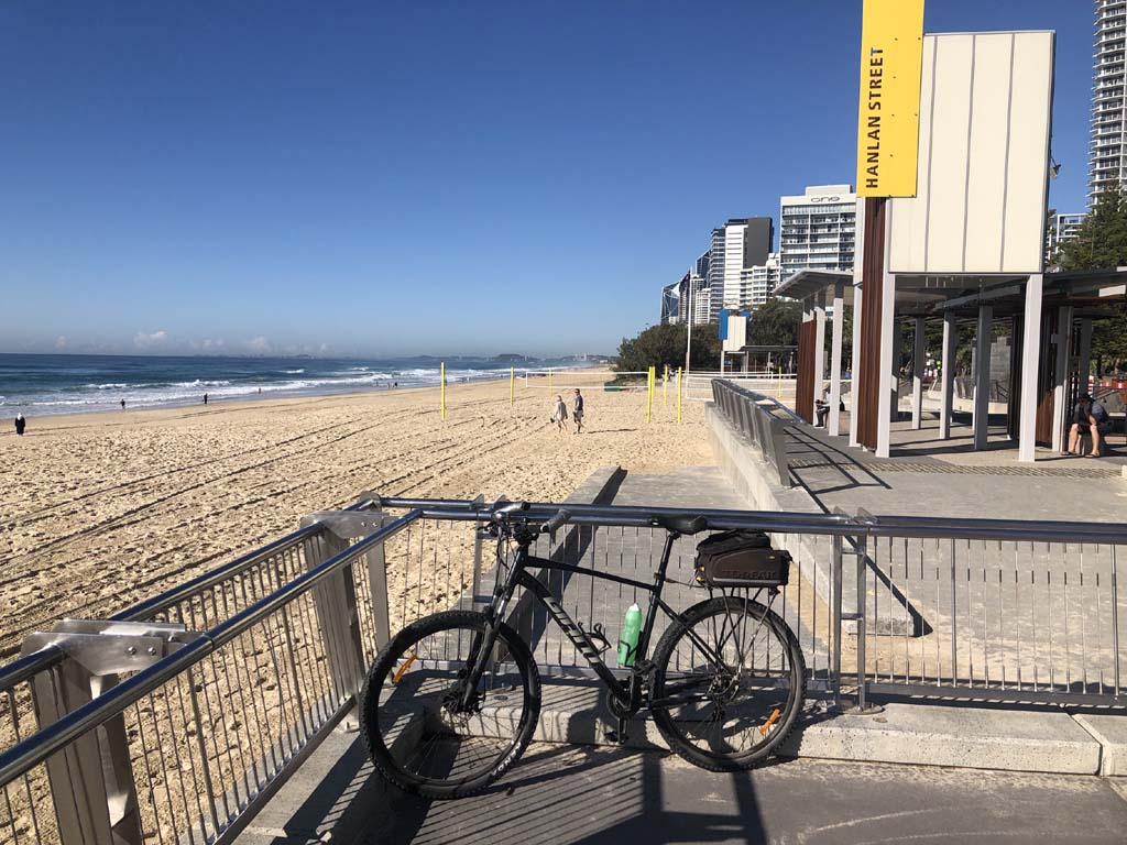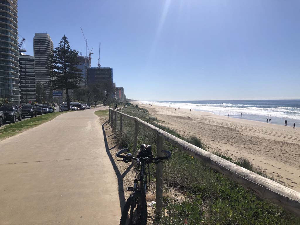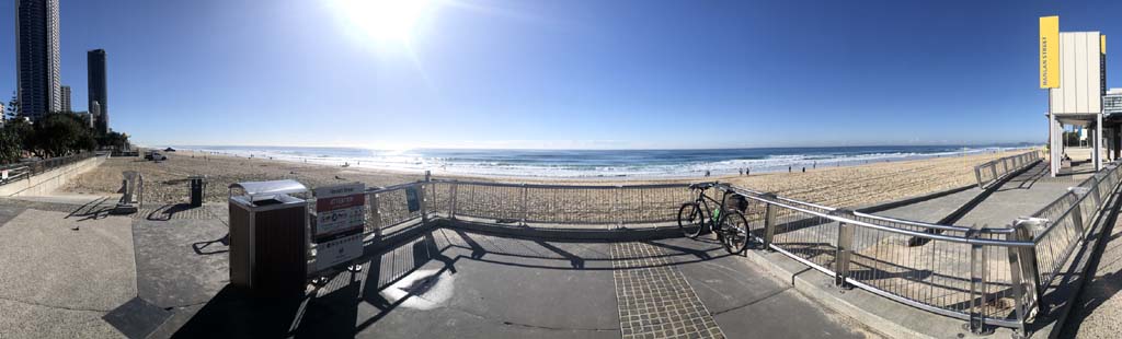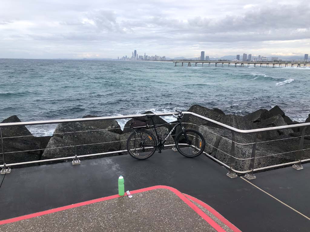 Home to Turnaround Pt down to Surfers via GC600 Park to Surfers to The Spit (both ends - twice) then back through GC600 Park back to Cafe Rockpool and finally back Home about 50+kms.