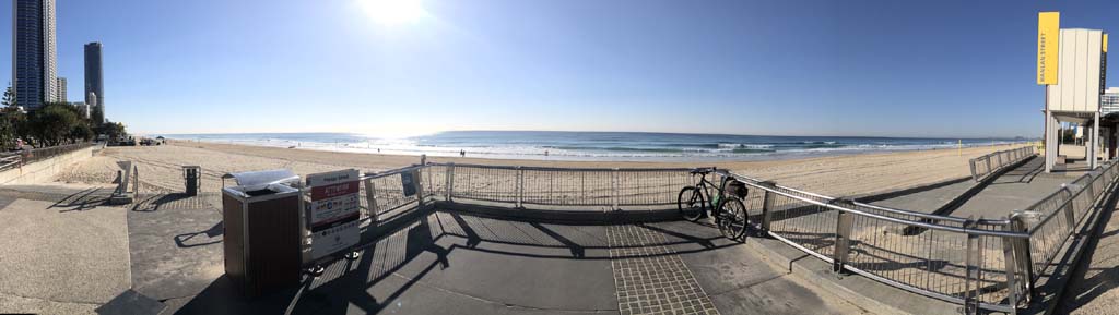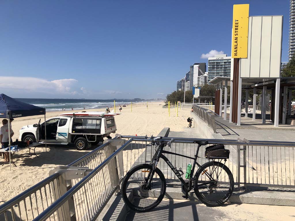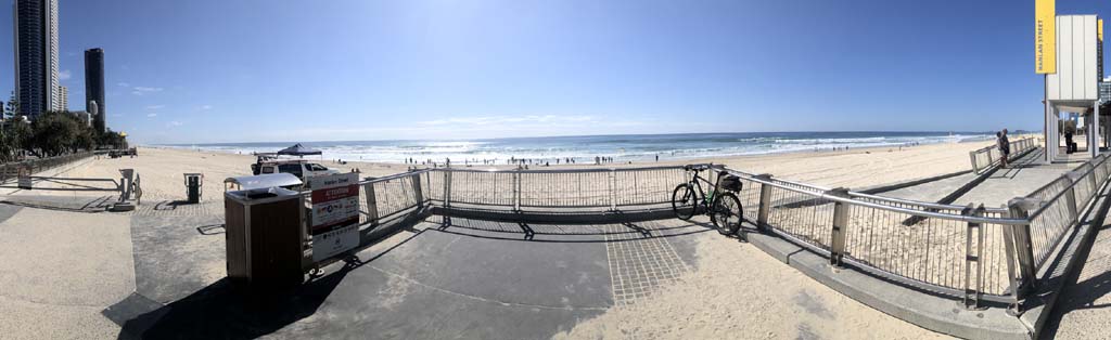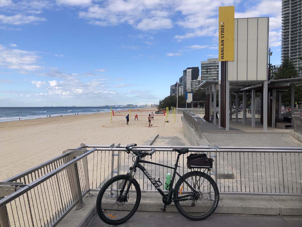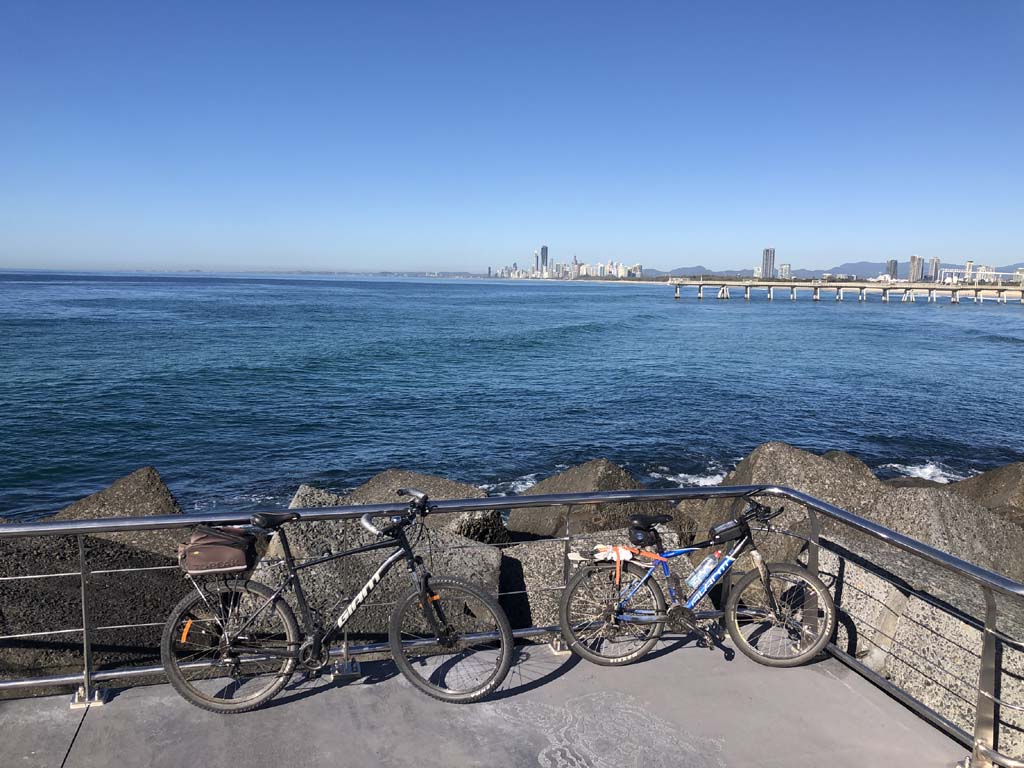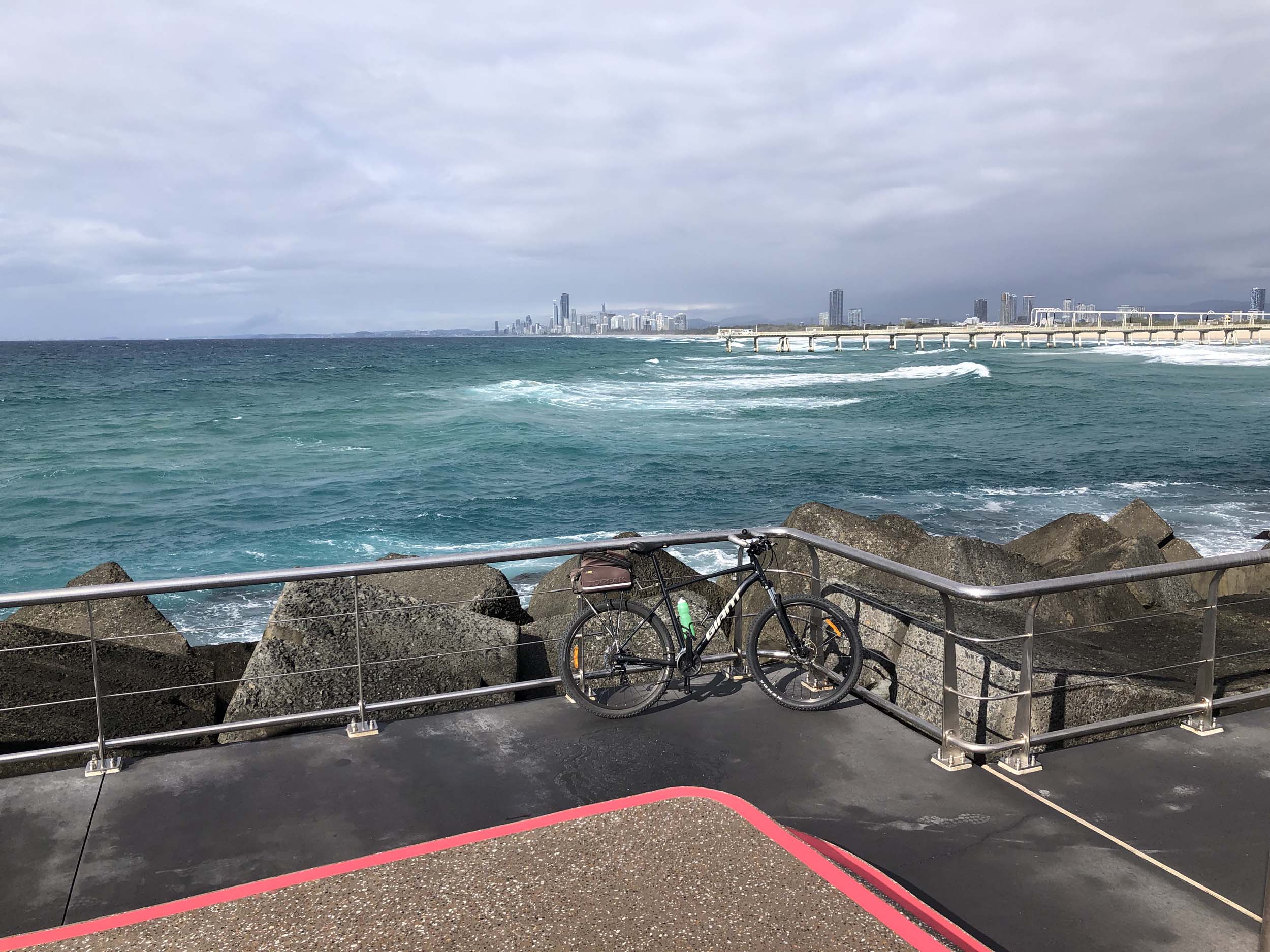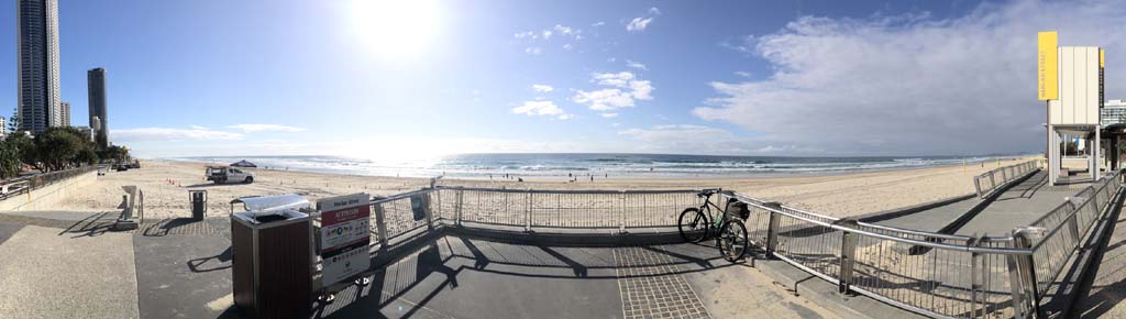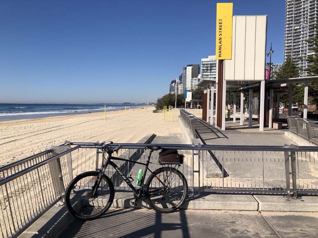 Home to Turnaround Pt down to Surfers via GC600 Park to Surfers to The Spit (both ends - twice) then back through GC600 Park back to Cafe Rockpool and finally back Home about 50+kms.