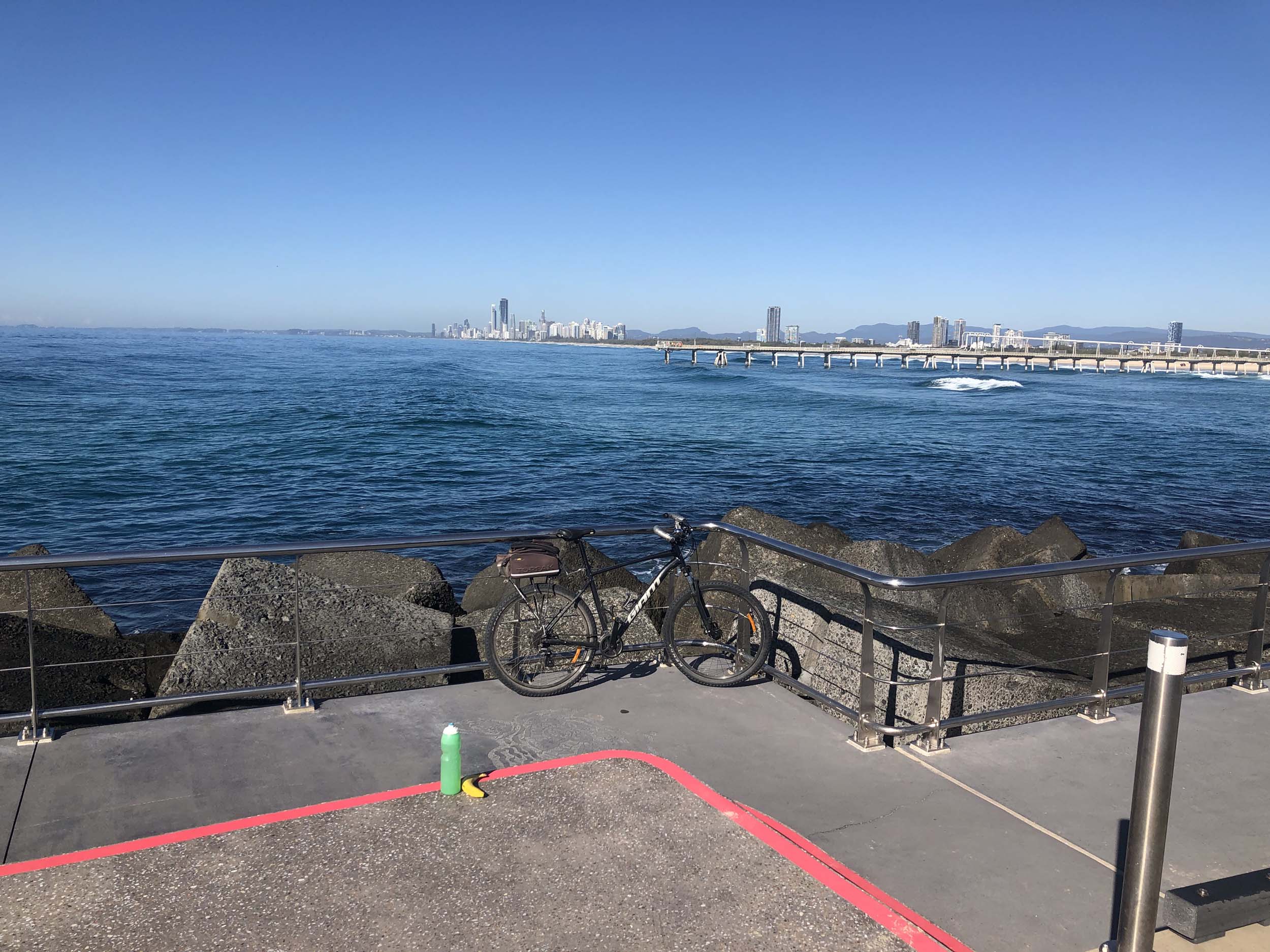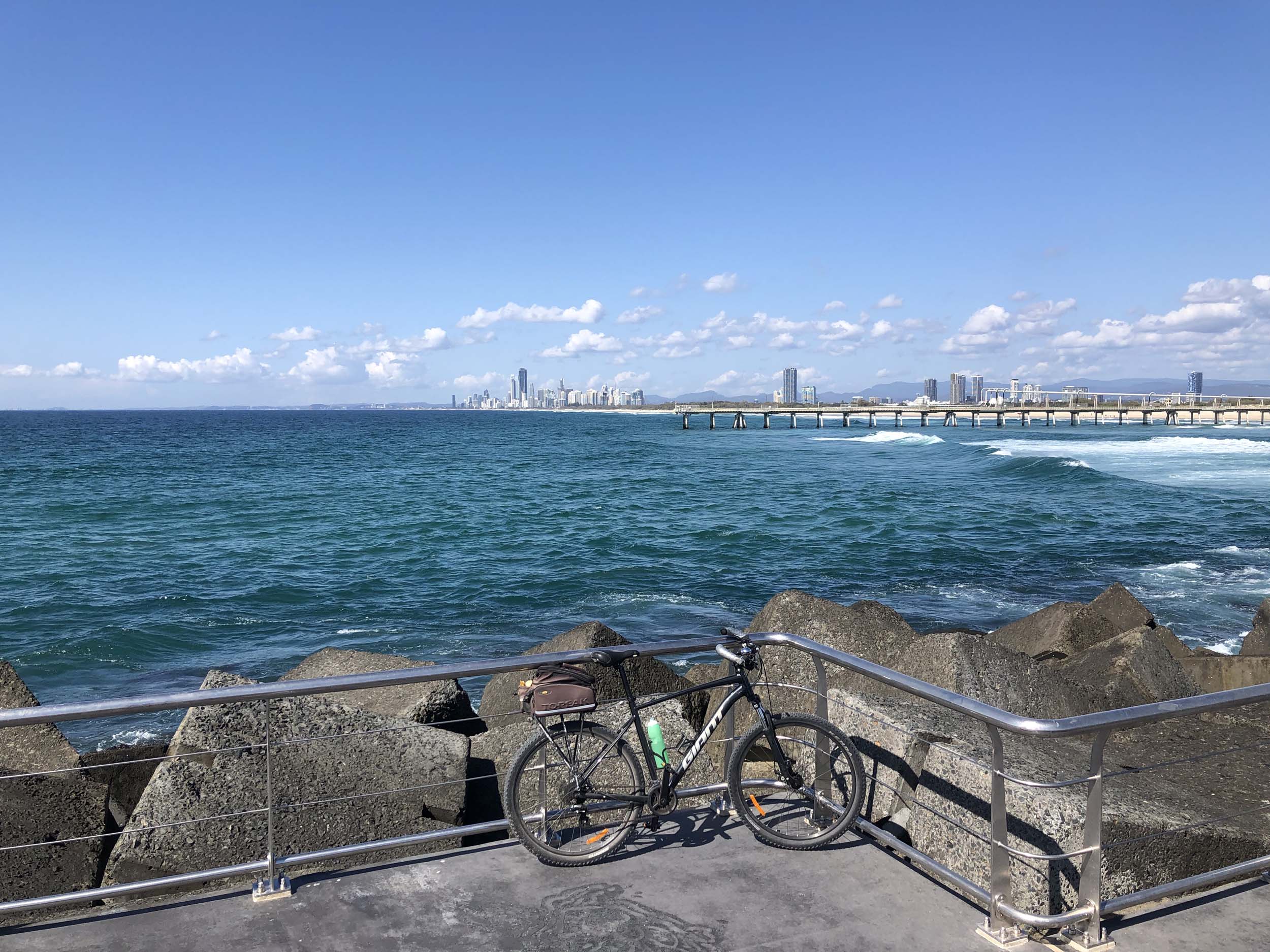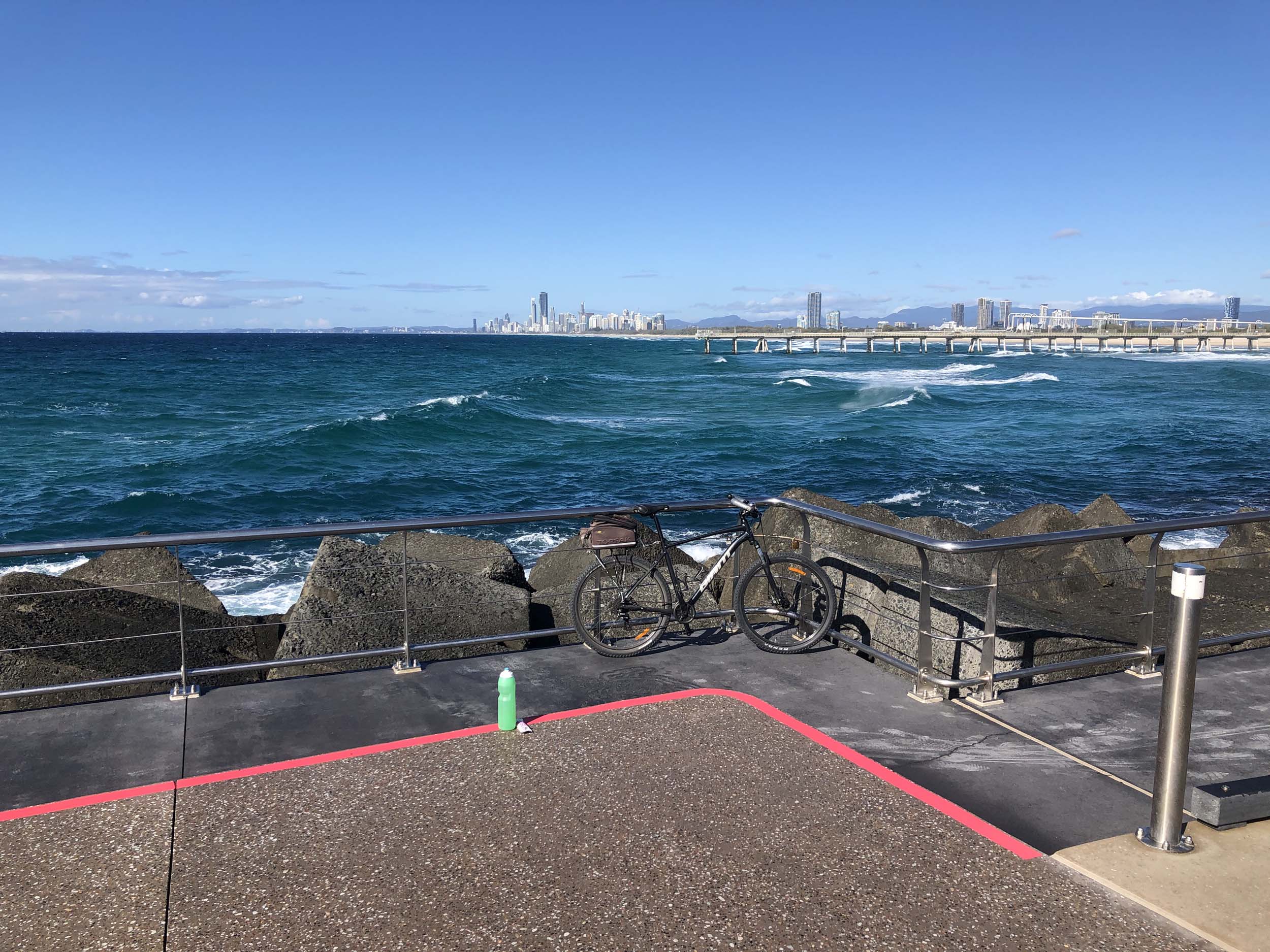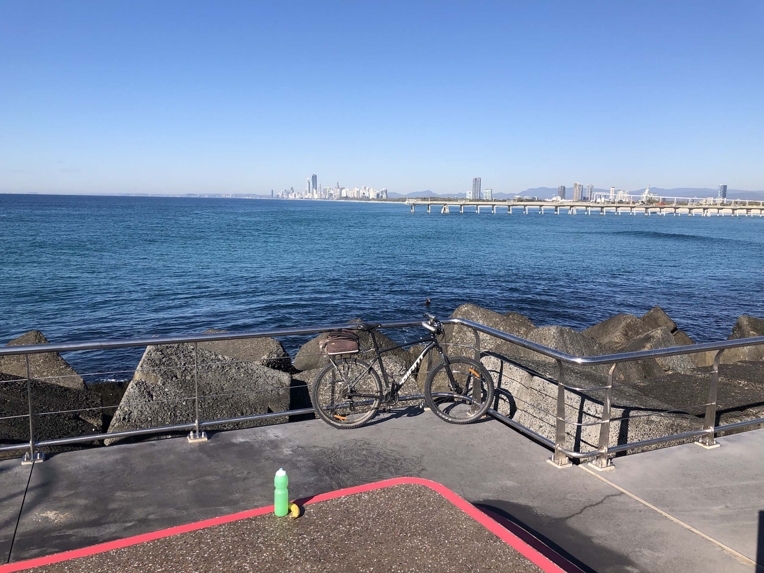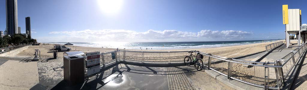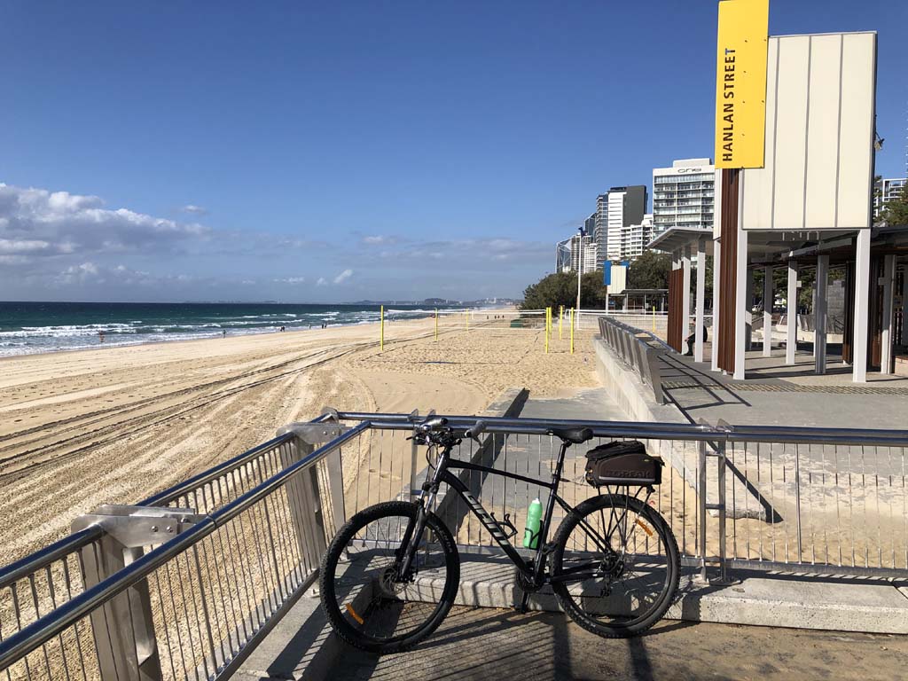 Home to Turnaround Pt down to Surfers via GC600 Park to Surfers to The Spit (both ends - twice) then back through GC600 Park back to Cafe Rockpool and finally back Home about 50+kms.