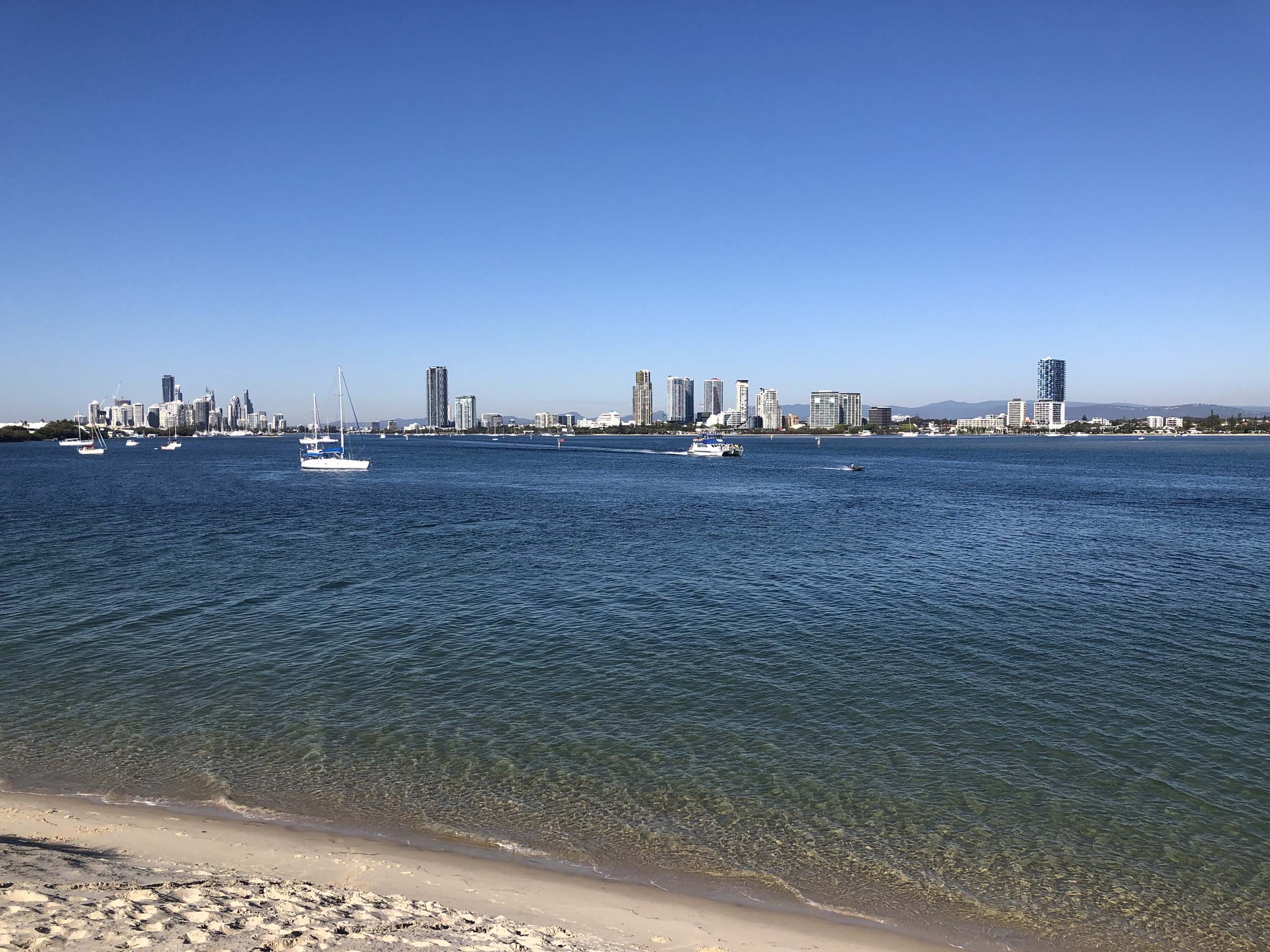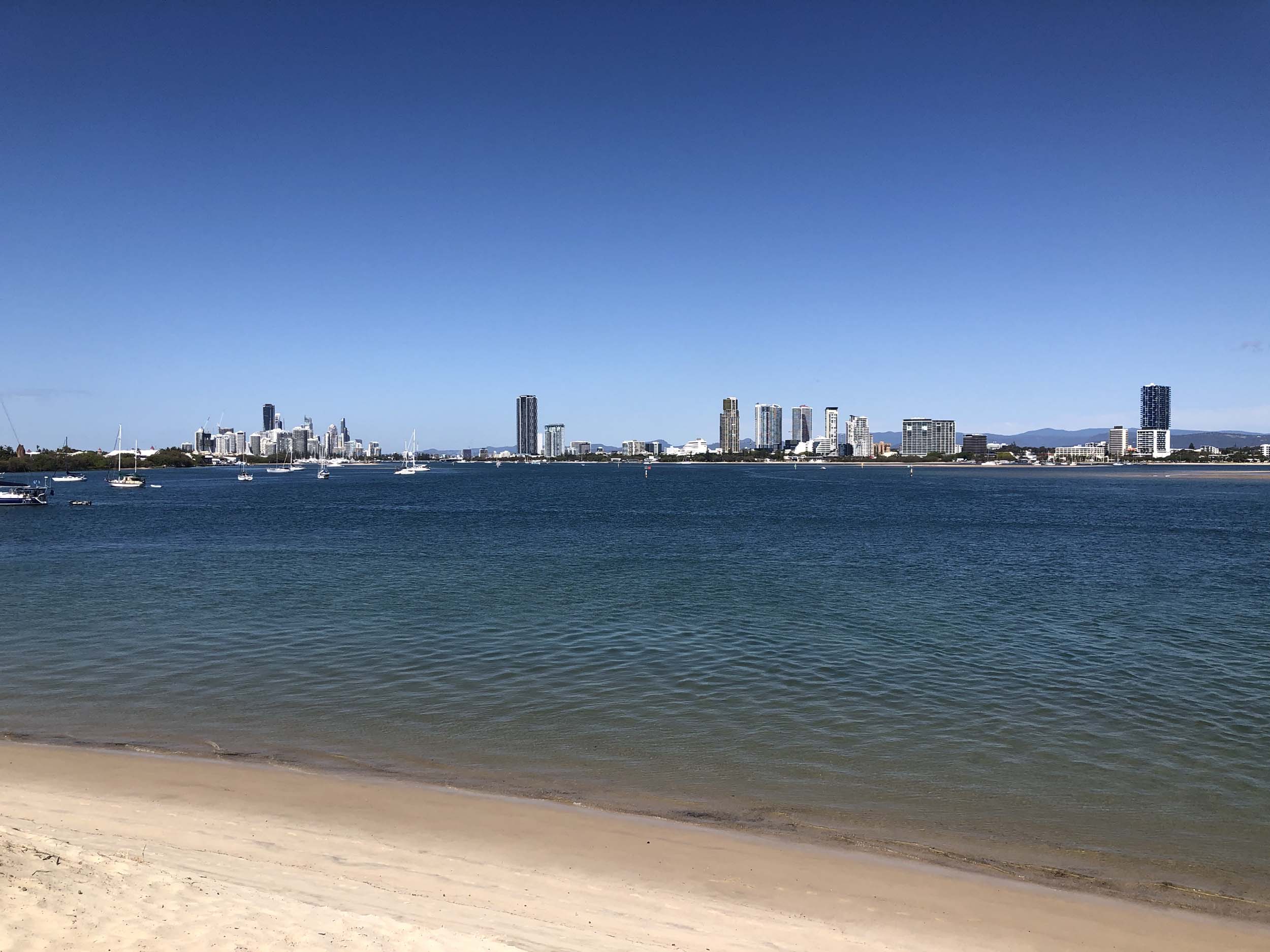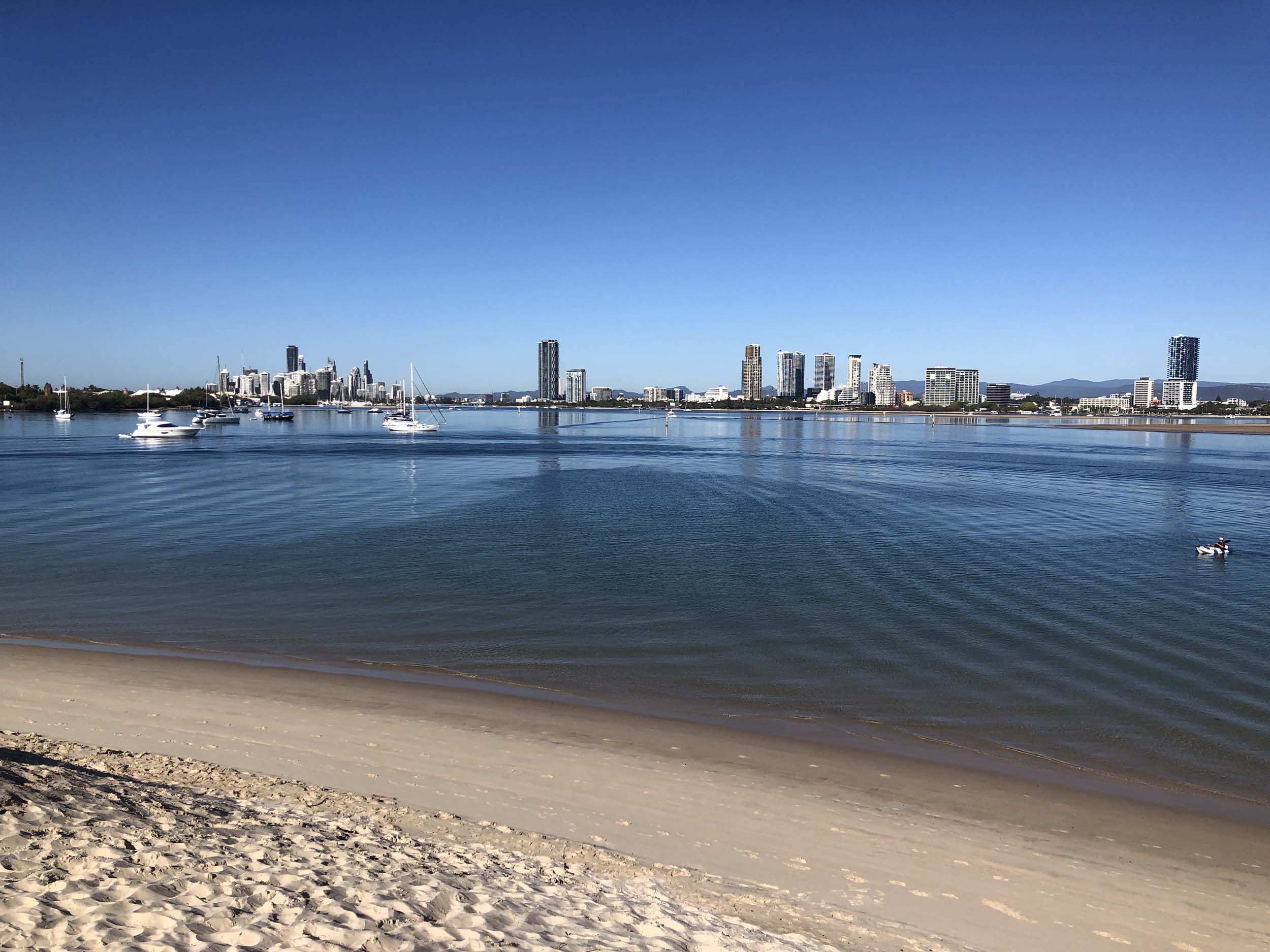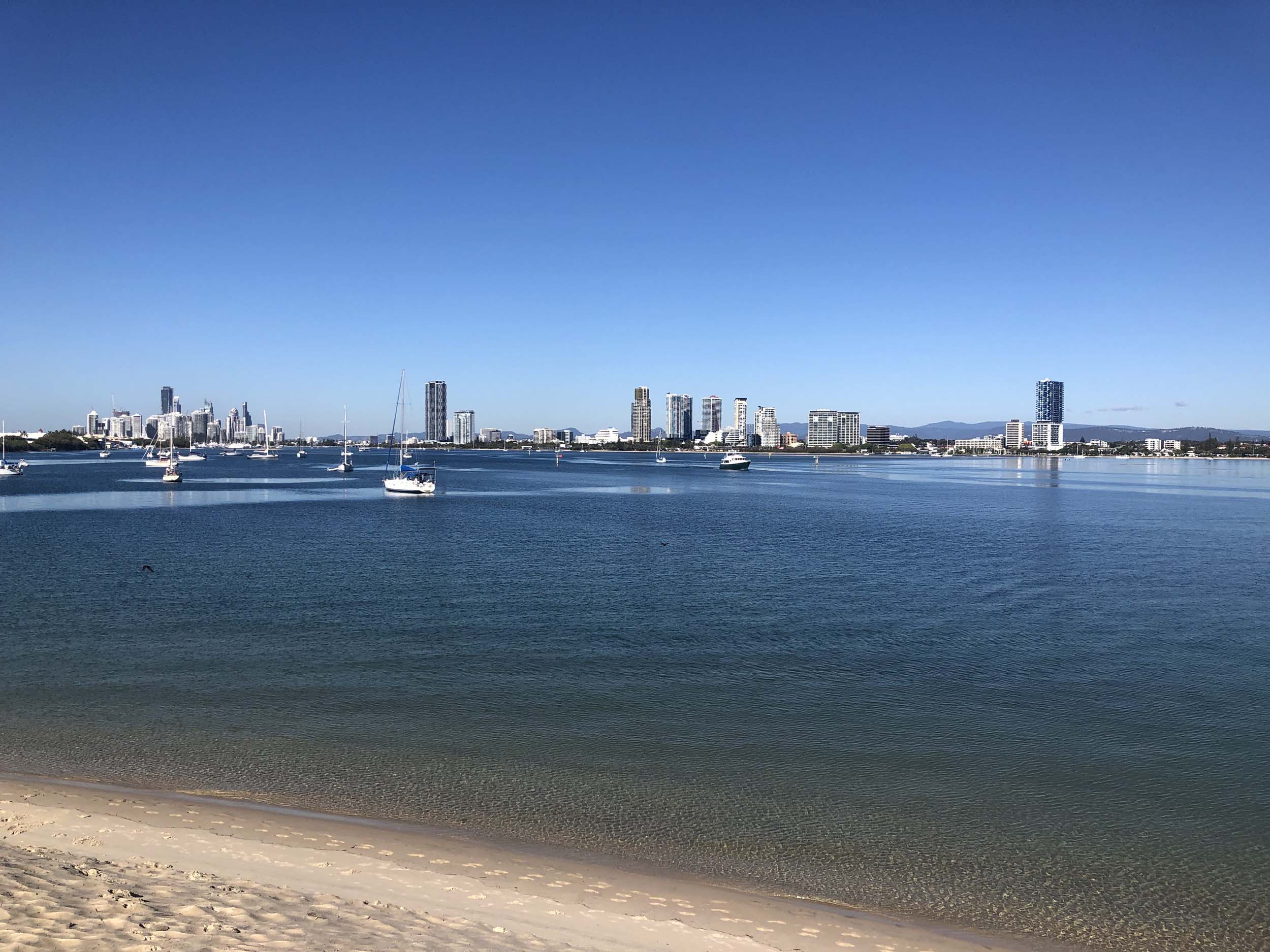 I left home at 7:56am, after going for a coffee and some shopping at Coles Lab Park. The breeze was building from the South East. The Broadwater was calm.