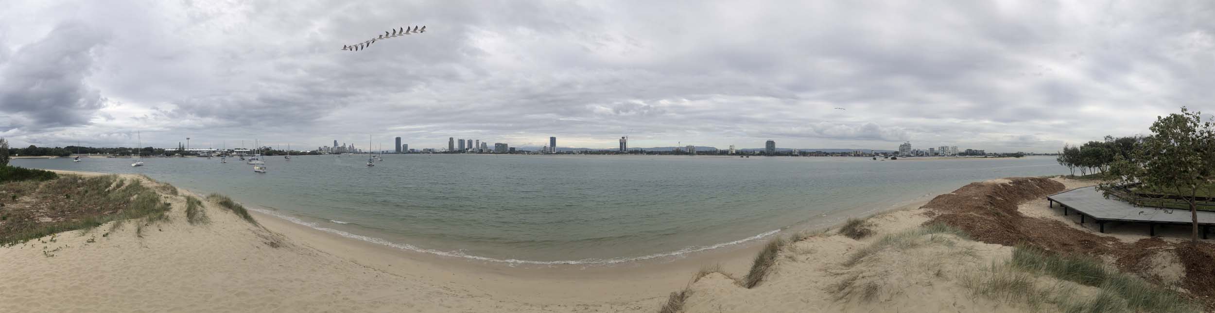 I left home about 8:18am, after going for a coffee and some shopping at Coles Lab Park. The breeze was slowing building from the East. The Broadwater was calm.