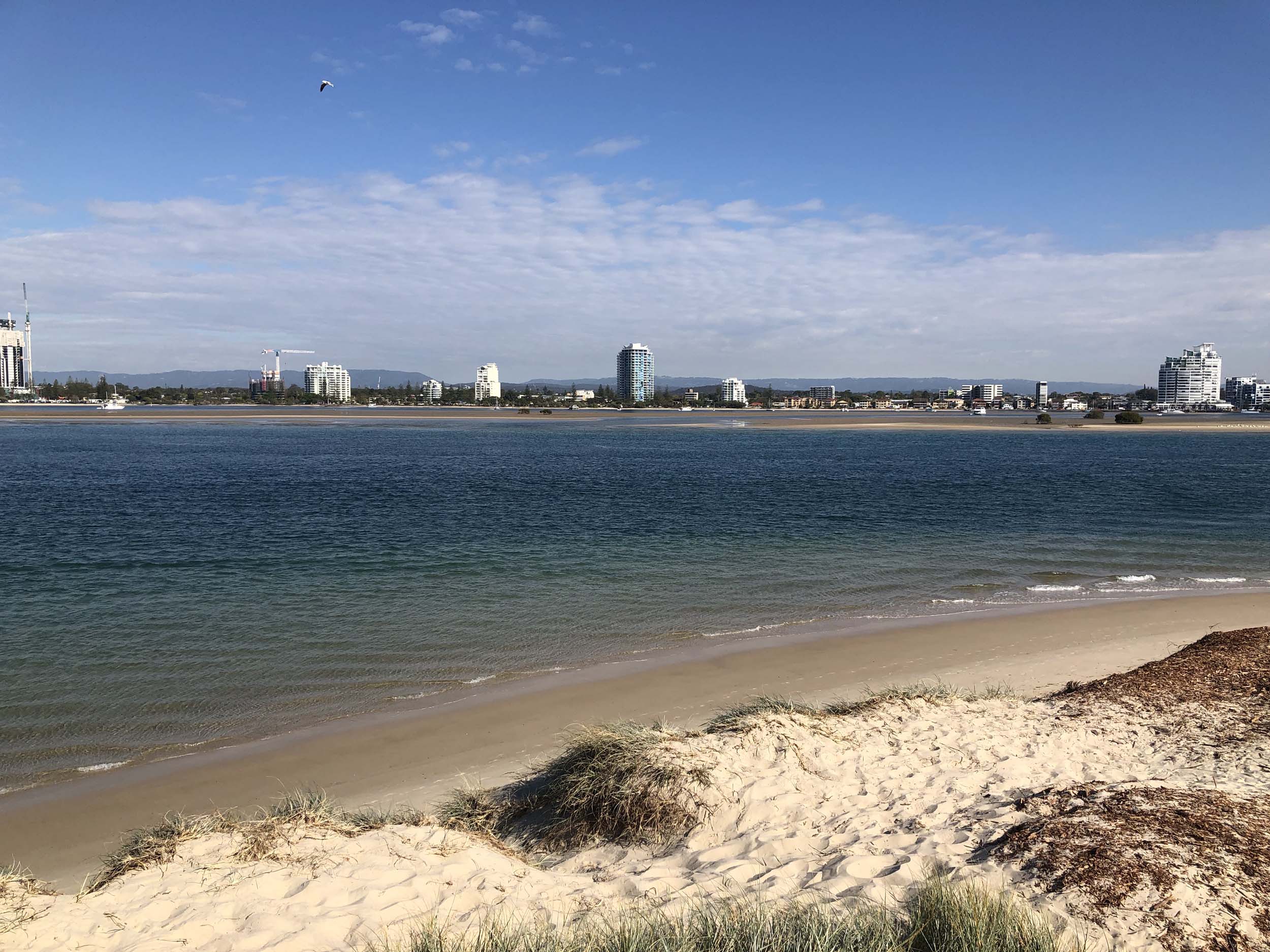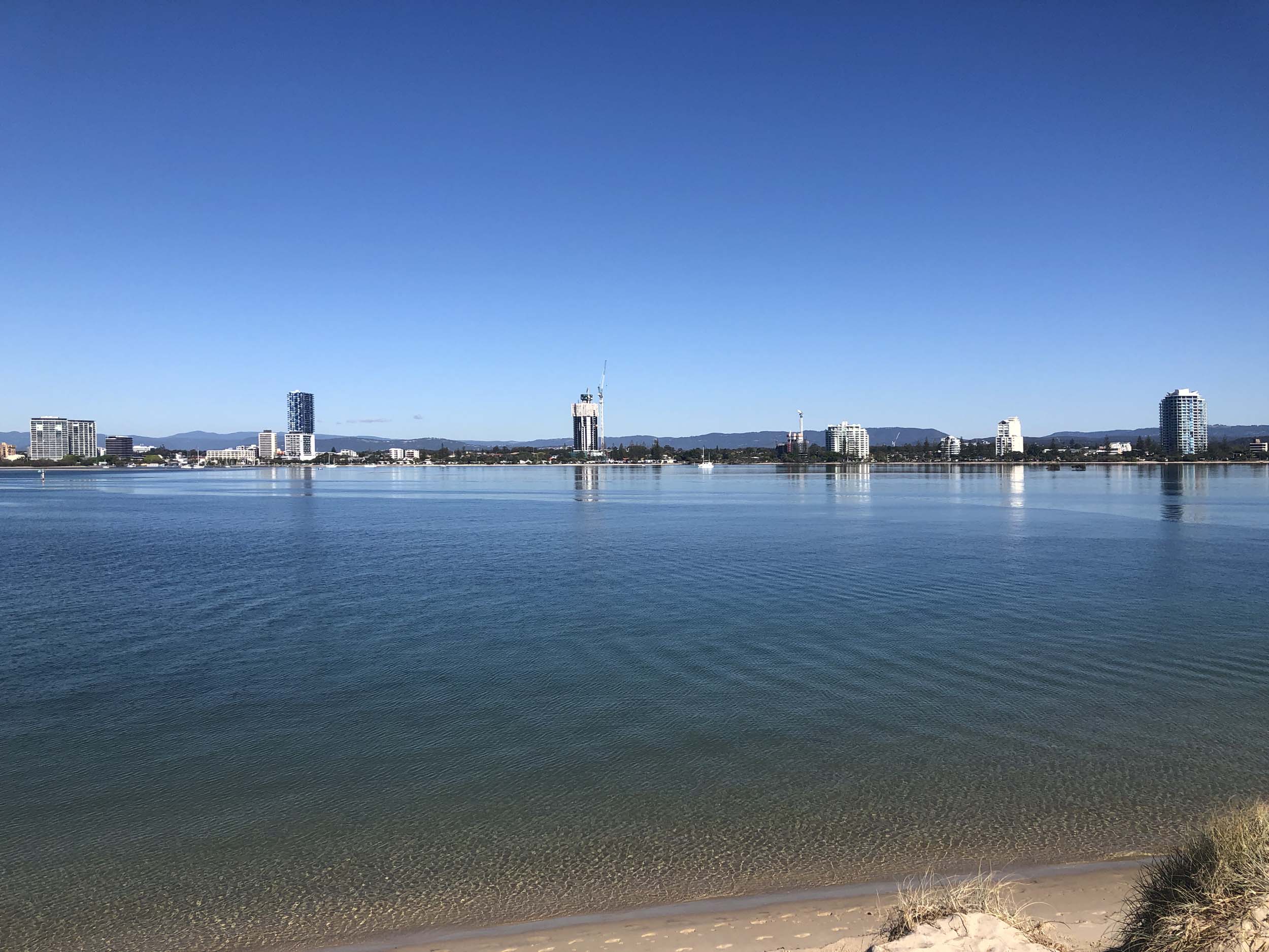 I left home at 7:47am, after going for a coffee and some shopping at Coles Lab Park. The breeze was calm and building from the South. The Broadwater was calm.