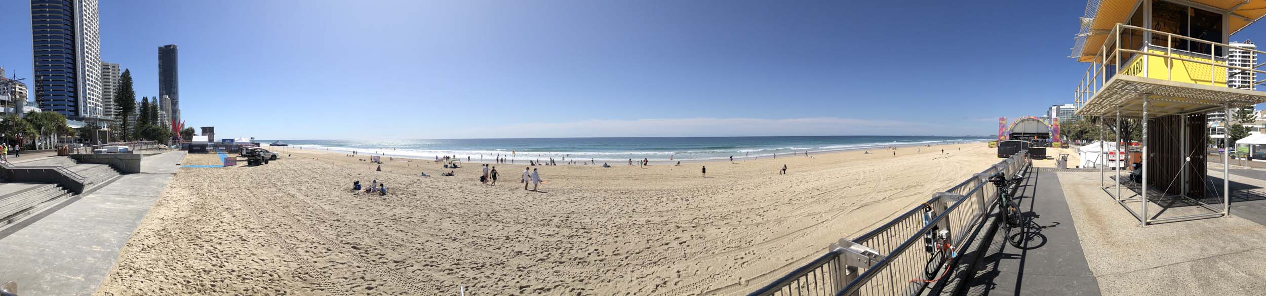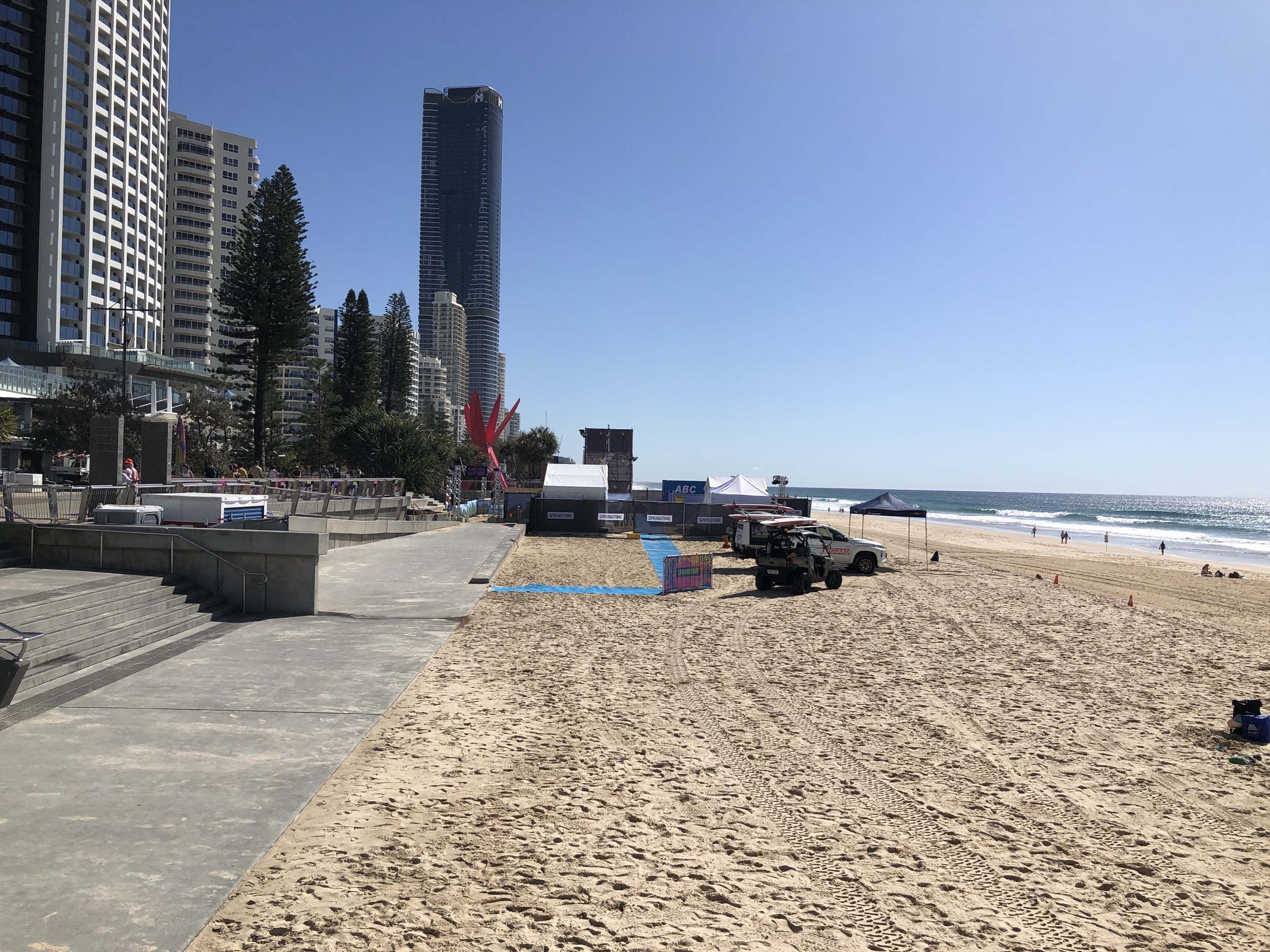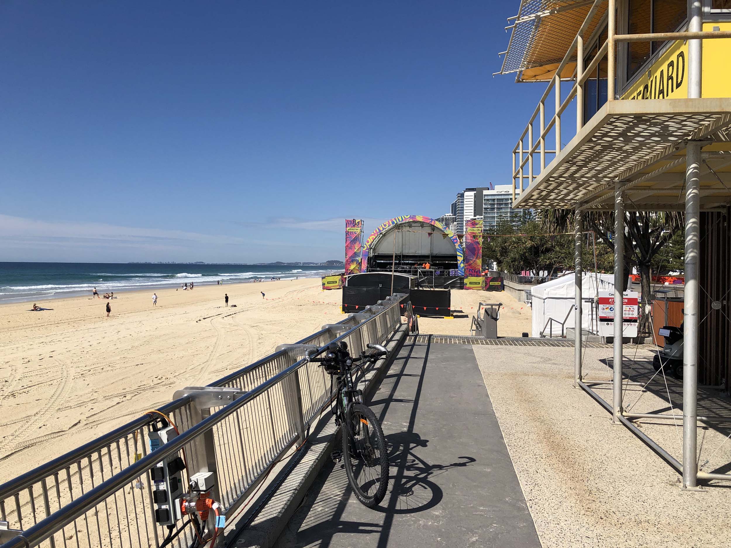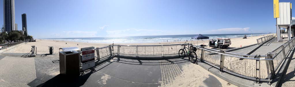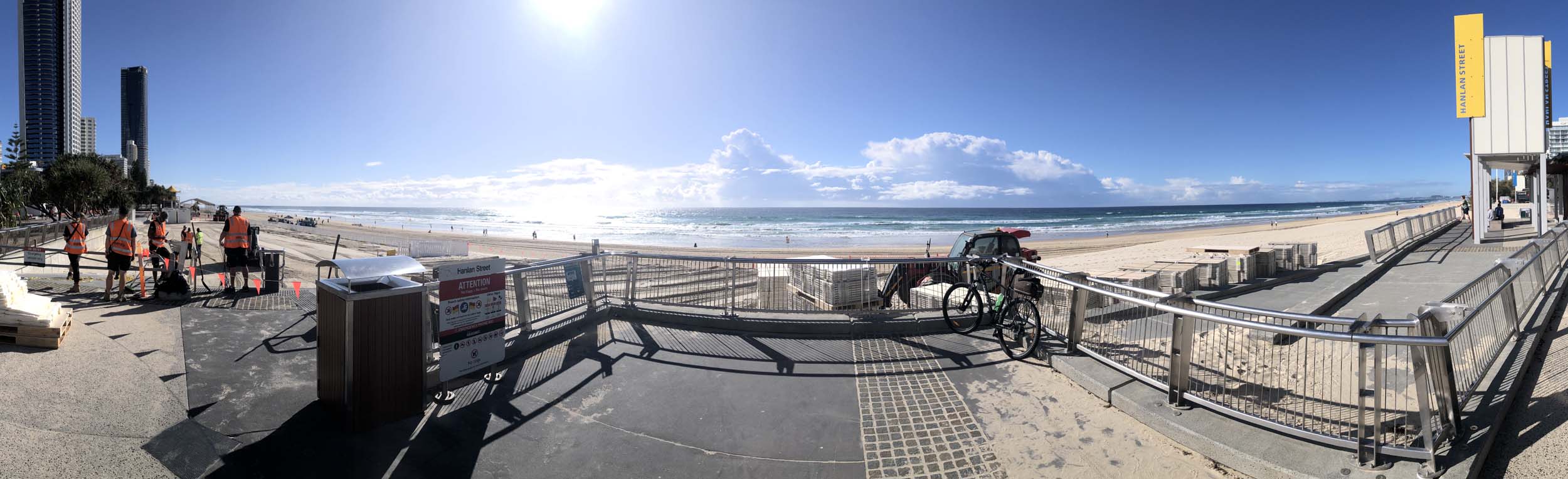 As usual, I rode Northward, to my Lands End turnaround point. Continued through the Broadwater Parklands. The Gold Coast show starts tomorrow and is located in the Parklands, naturally, there was activity everywhere. Did a lap of MacIntosh Is. Over the Bridge at Narrowneck then along the Shared Path, to Surfers, to take my weather photos. They are preparing for the Springtime Festival.