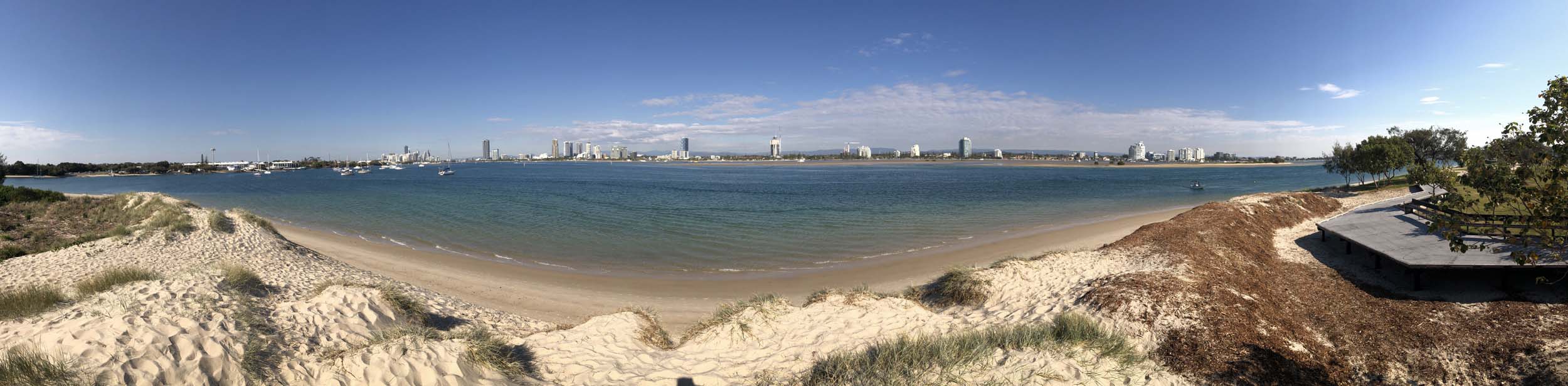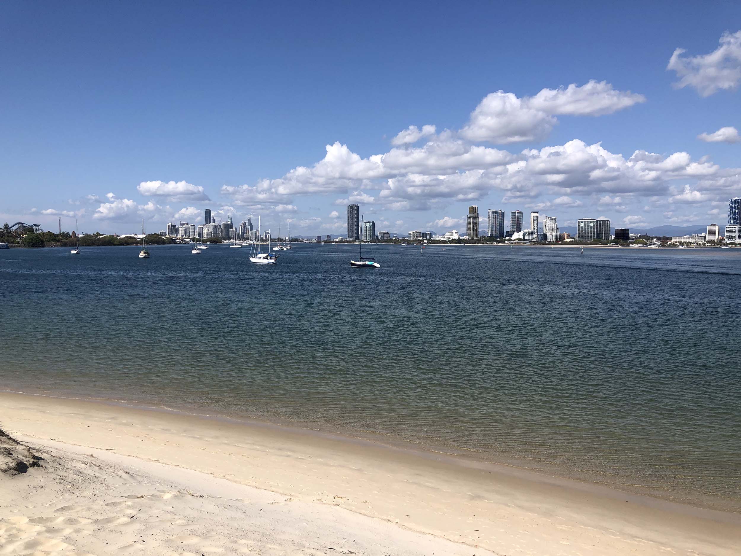 I left home about 7:43am, after going for a coffee and some shopping at Coles Lab Park. The breeze was building from the North East. The Broadwater was calm.